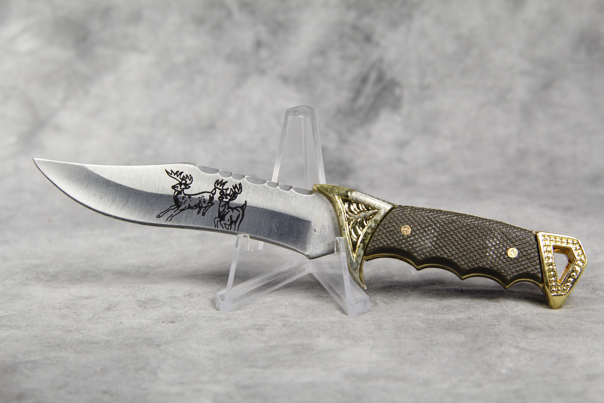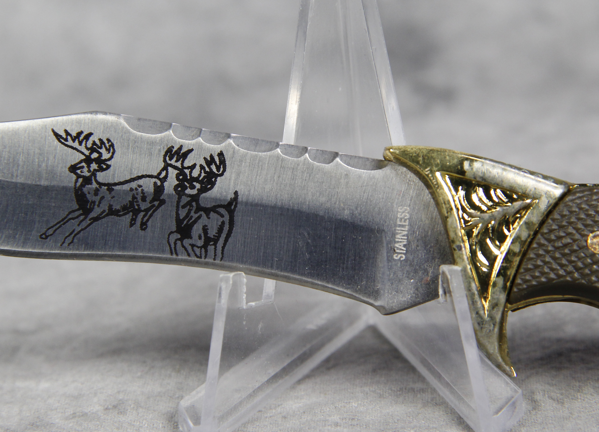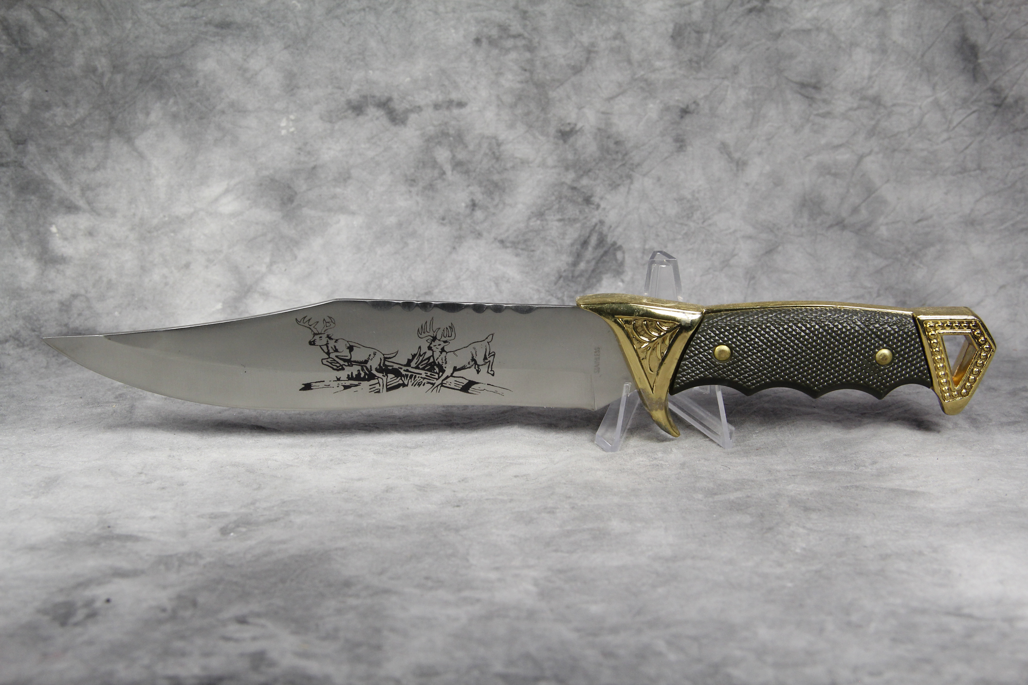 March 15, 2026 - Set of 2 Fixed Blade Hunting Knives. 11-1/2 inches long and 6-1/4 inches long. Made in China. Stainless steel blades both etched with images of Elk. "CHINA" and "STAINLESS" tang stamps. Black rubber handles. With original box and rubber-lined black nylon sheath.