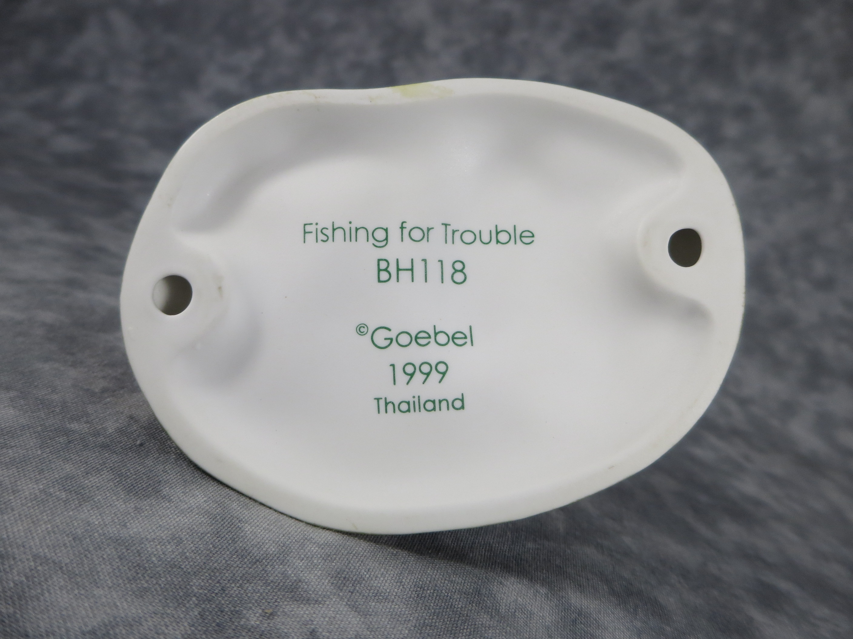 October 28, 2025 - 4-1/8 inches tall. Base is imprinted 'Fishing for Trouble' and BH 118 with the Goebel 1999 trademark all in green.