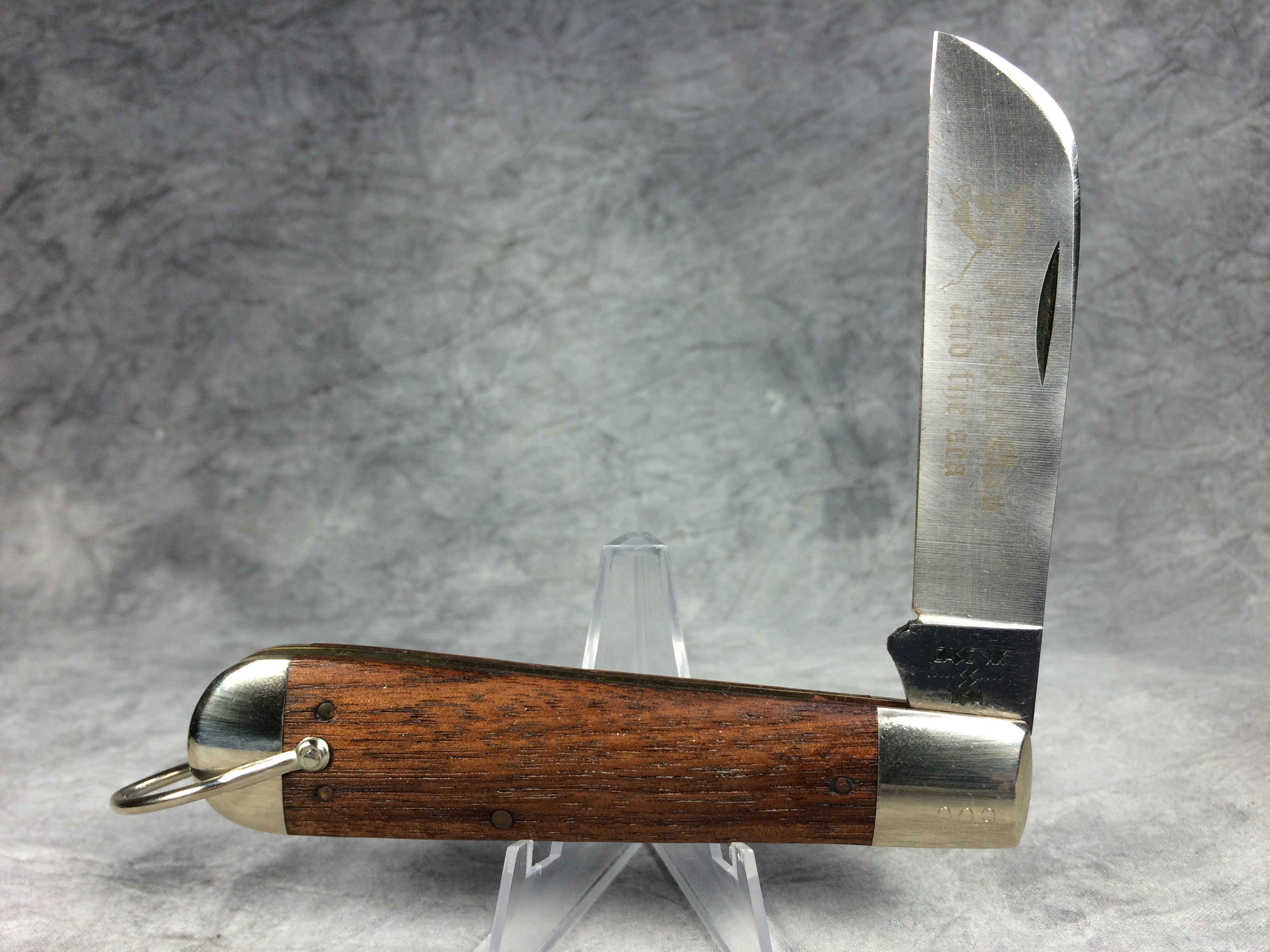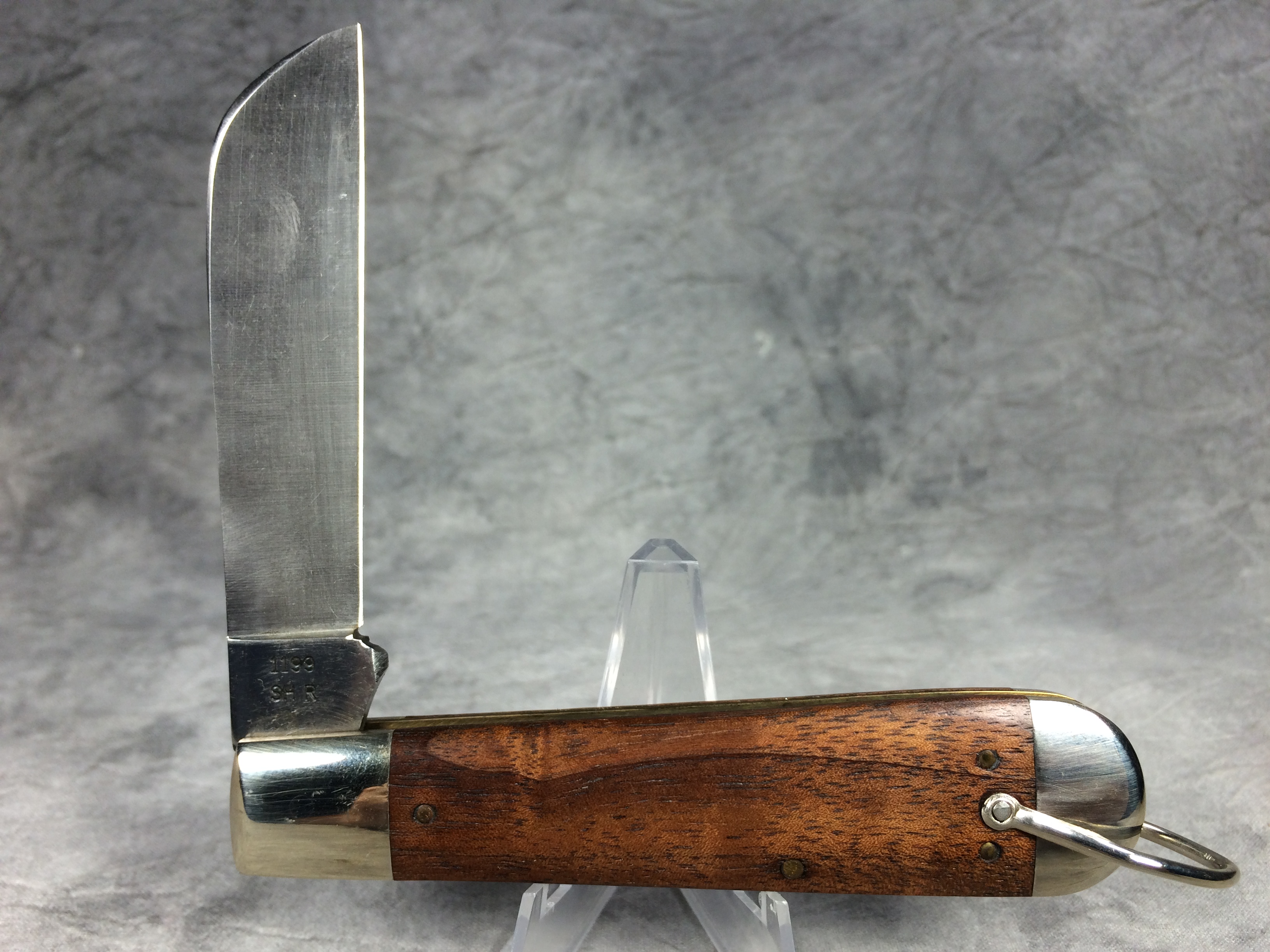 The second knife is a 1981 single blade whaler pocket knife, model 1199 SH R: 4-1/8 inches closed. 7-1/4 inches open. Made in USA. "CASE XX *****SS**** USA" (9 dot with lightning bolt S) and "1199 SH R" tang stamps. Stainless steel blade etched "The Old Man and the Sea" with image of a captain. Wood handle. Nickel Silver bolsters. Front bolster etched with serial number "009". Brass liner.