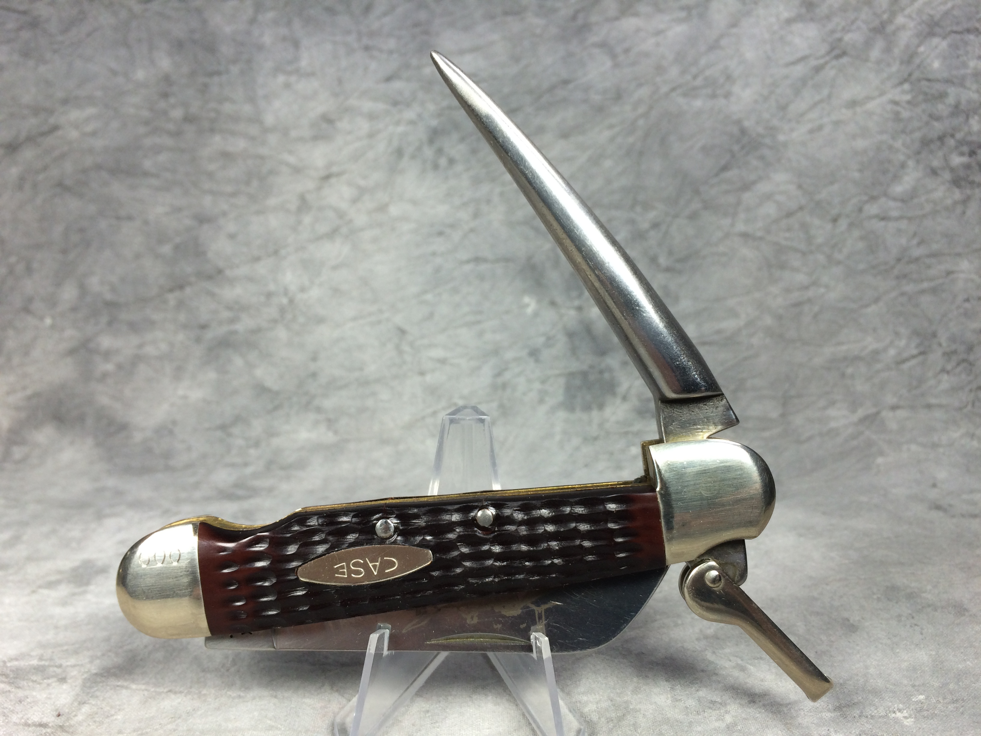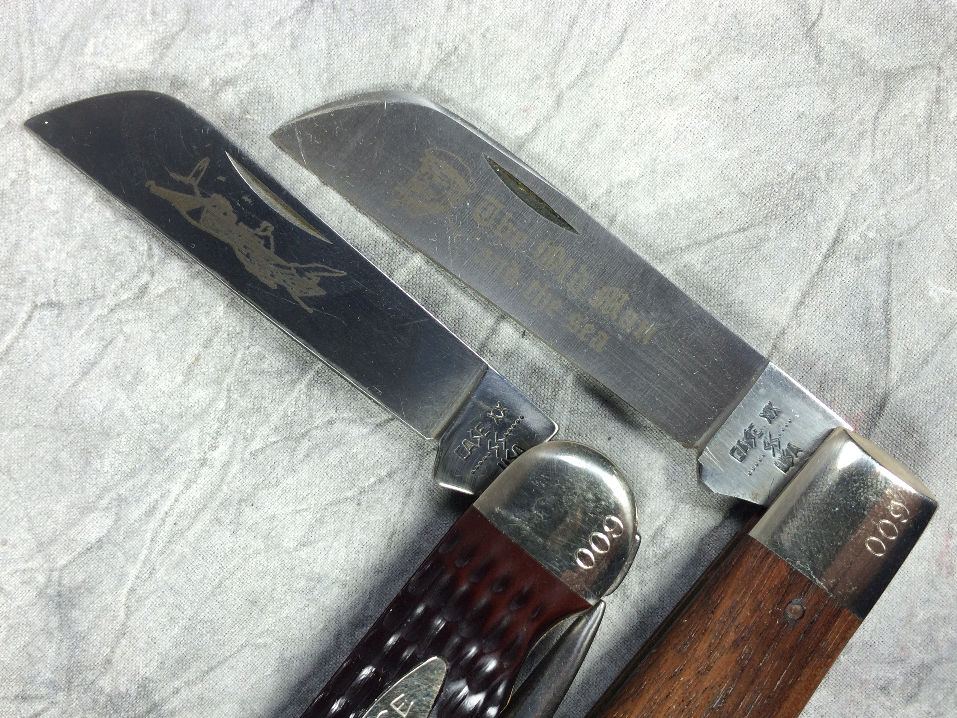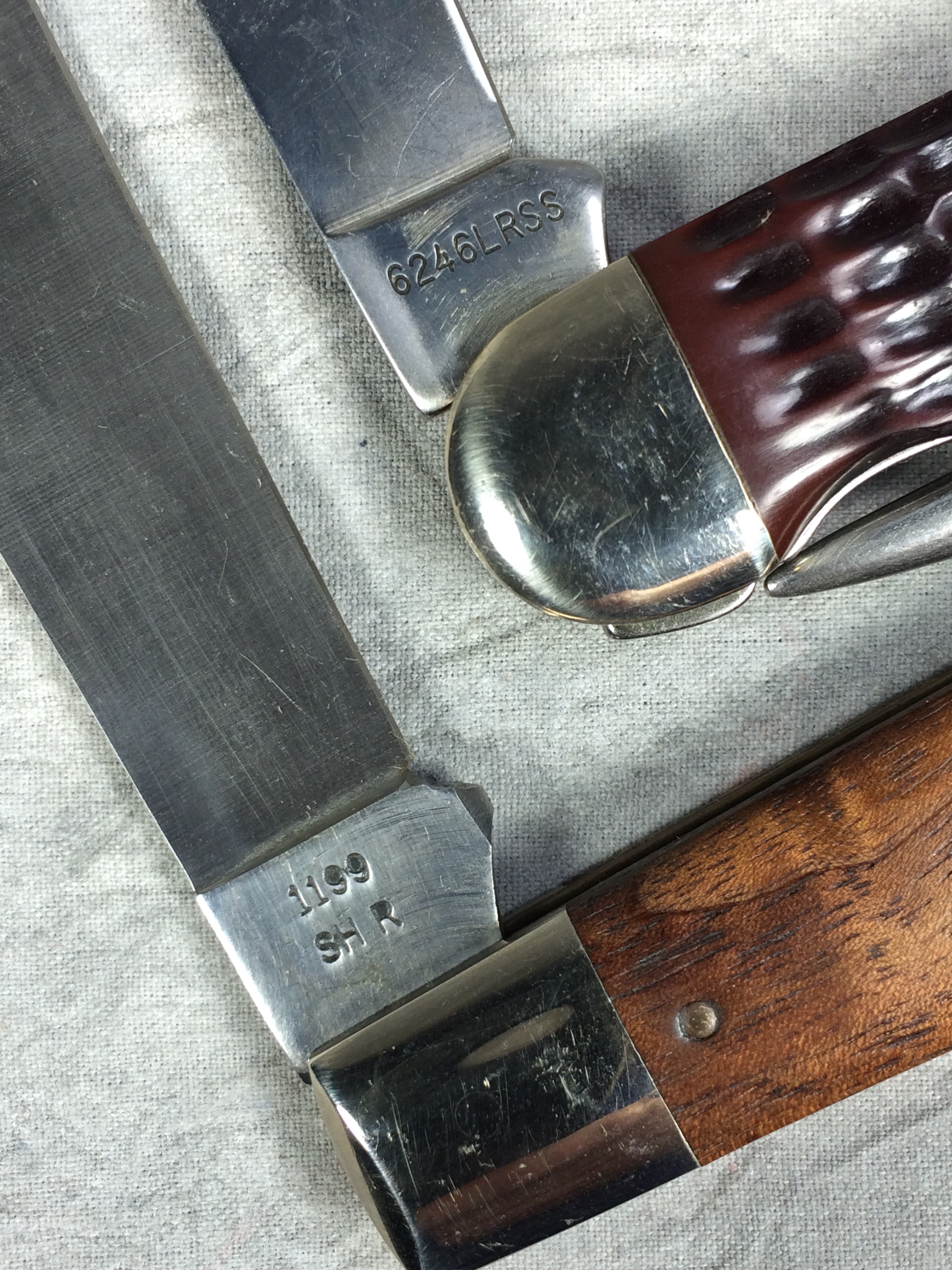 The first knife is a 1980 single blade rigger or sailor's pocket knife, model 6246LRSS: 4-1/2 inches closed. 7-3/8 inches open. Made in USA. "CASE XX *****SS***** USA" (10 dot) and "6246LRSS" tang stamps. Stainless steel blade etched with nautical image. Brown jigged delrin handle. Nickel Silver bolsters. Front bolster etched with serial number "009". Brass liner.