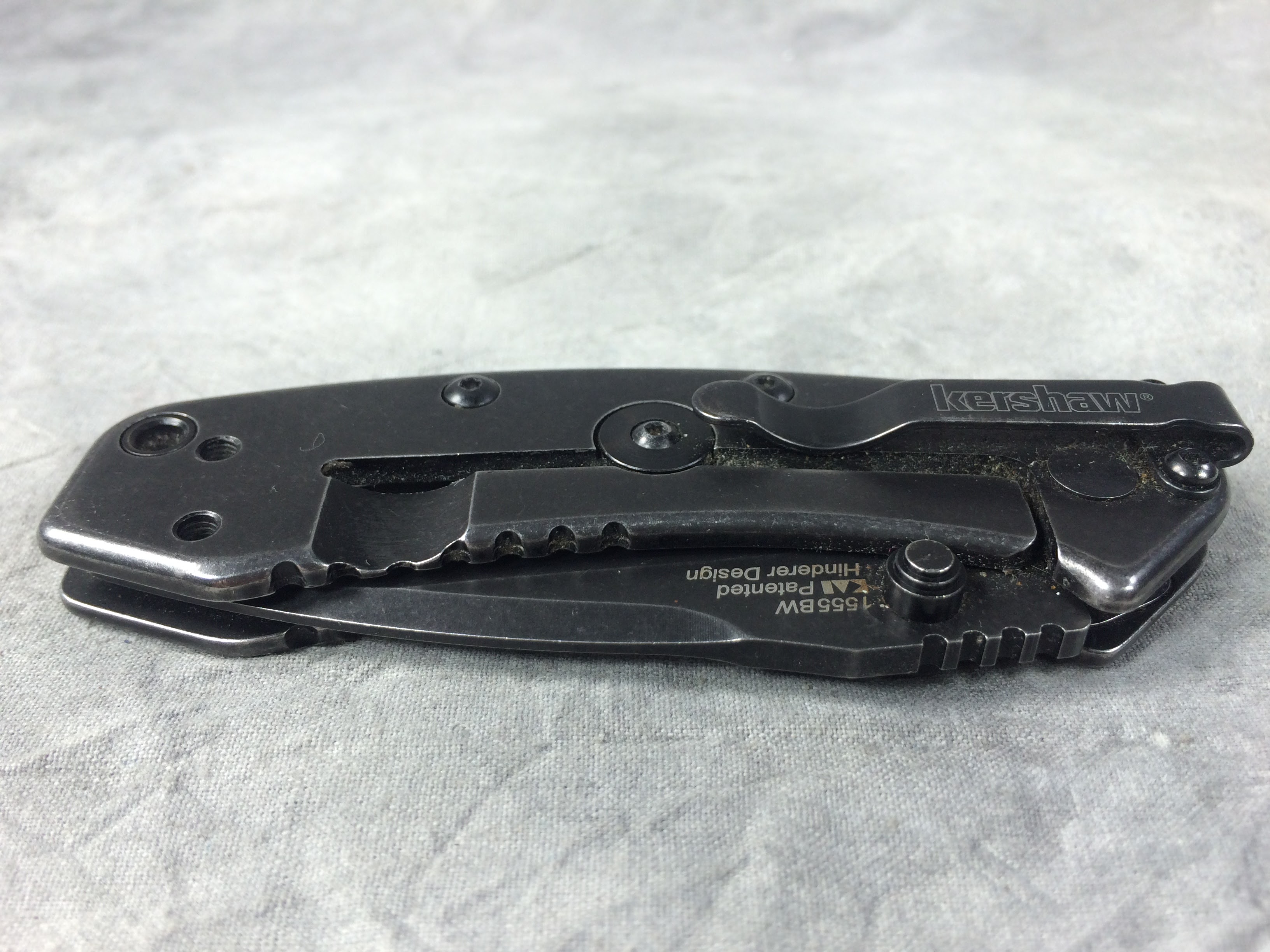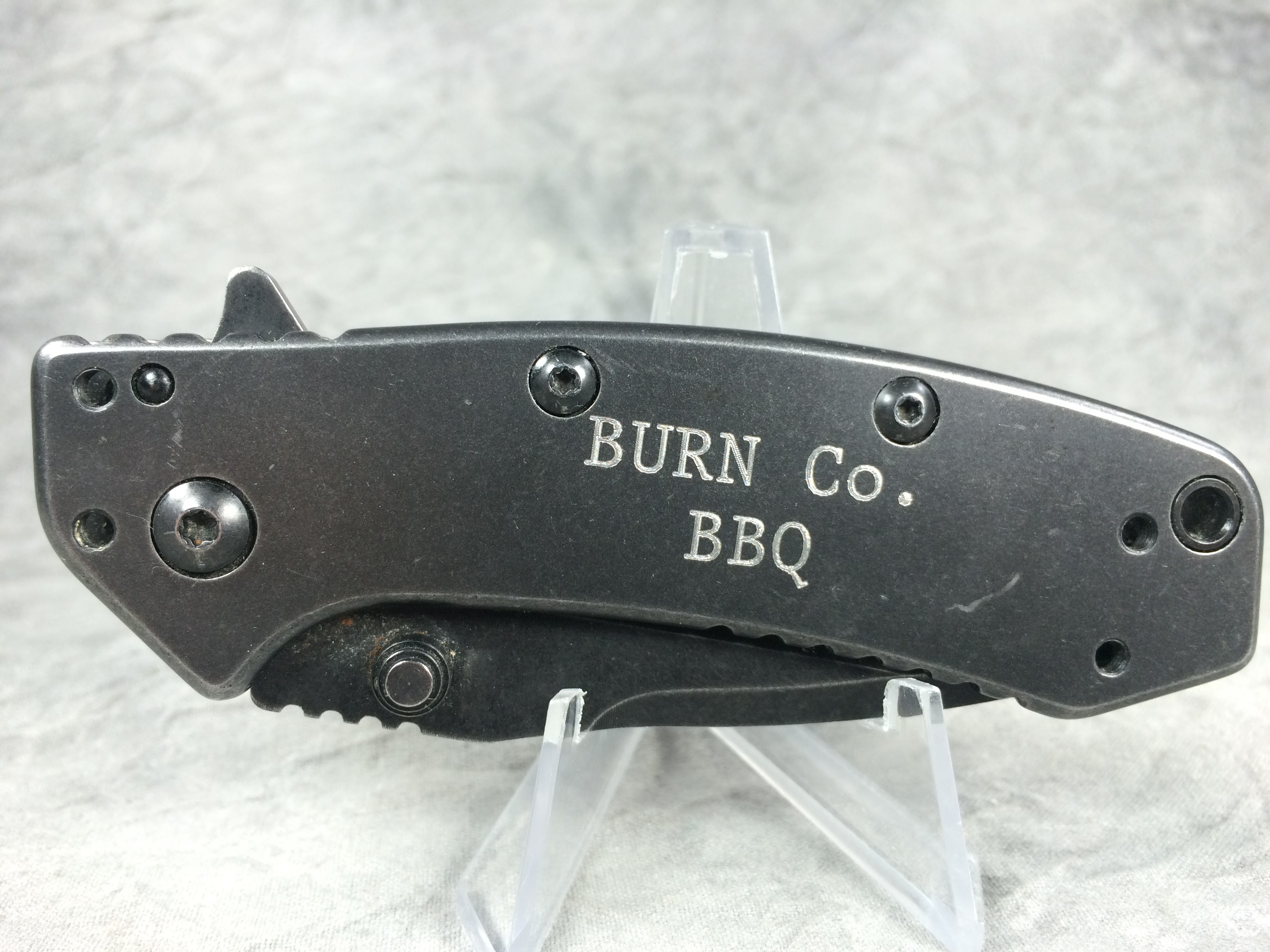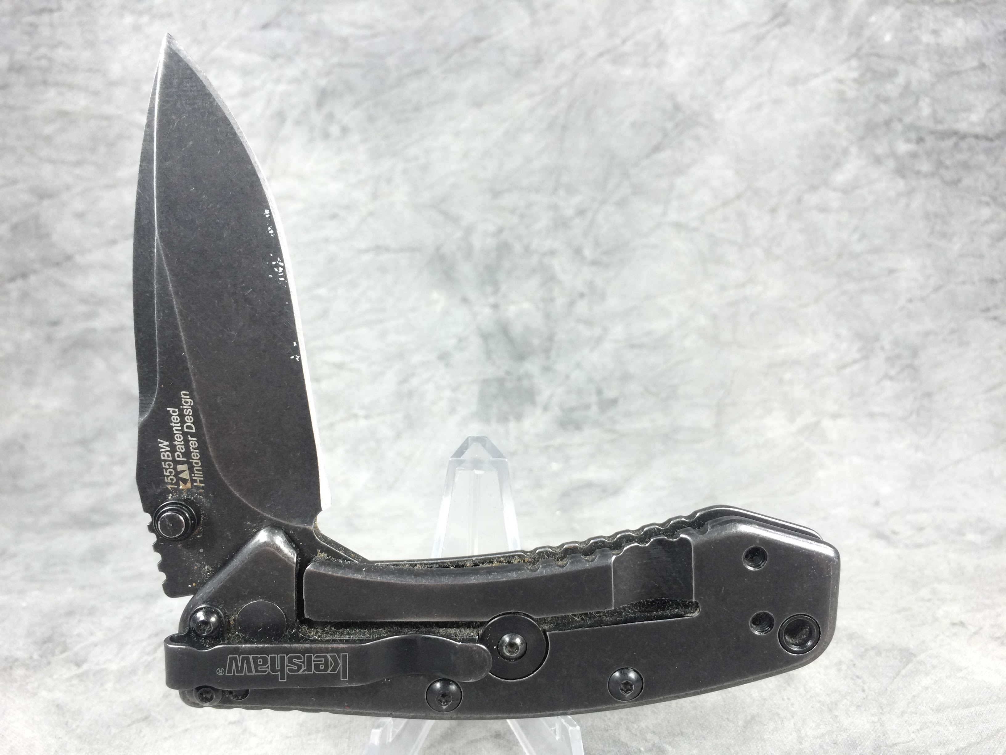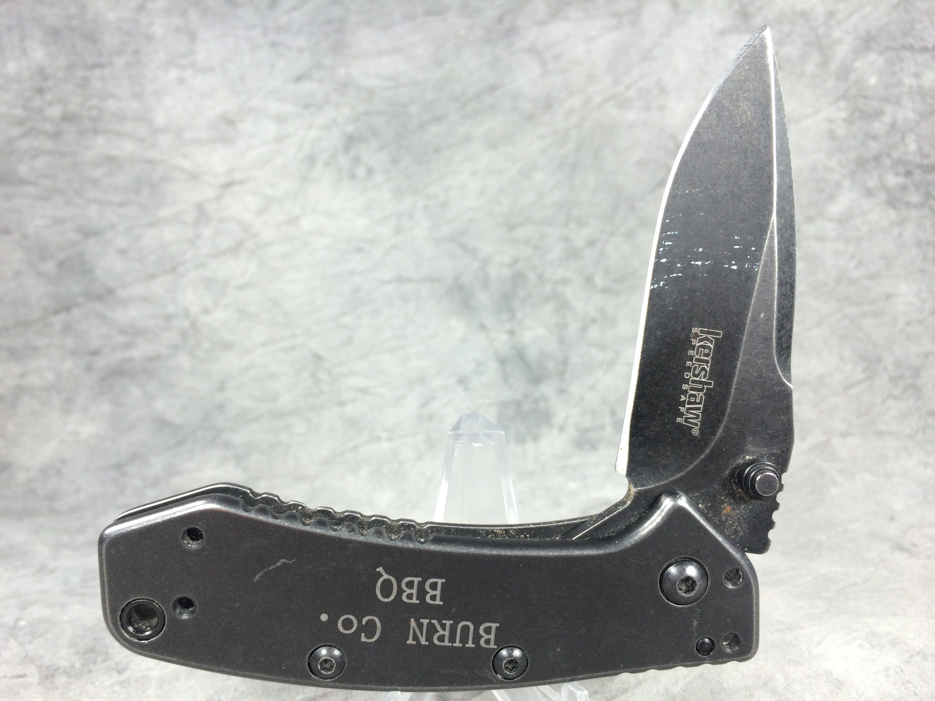 December 04, 2025 - Classic Rick Hinderer design. Opens quickly with SpeedSafe assisted opening. Built-in Flipper and thumbstud. Sturdy framelock with lockbar stabilization ensures a solid lockup. 3-7/8 inches closed. 6-1/2 inches open. Handle etched "BURN Co. BBQ". "CHINA" tang stamp. Blade etched "kershaw SPEEDSAFE" and "1555BW KAI Patented Hinderer Design". Tip up or tip down pocket clip etched "kershaw".