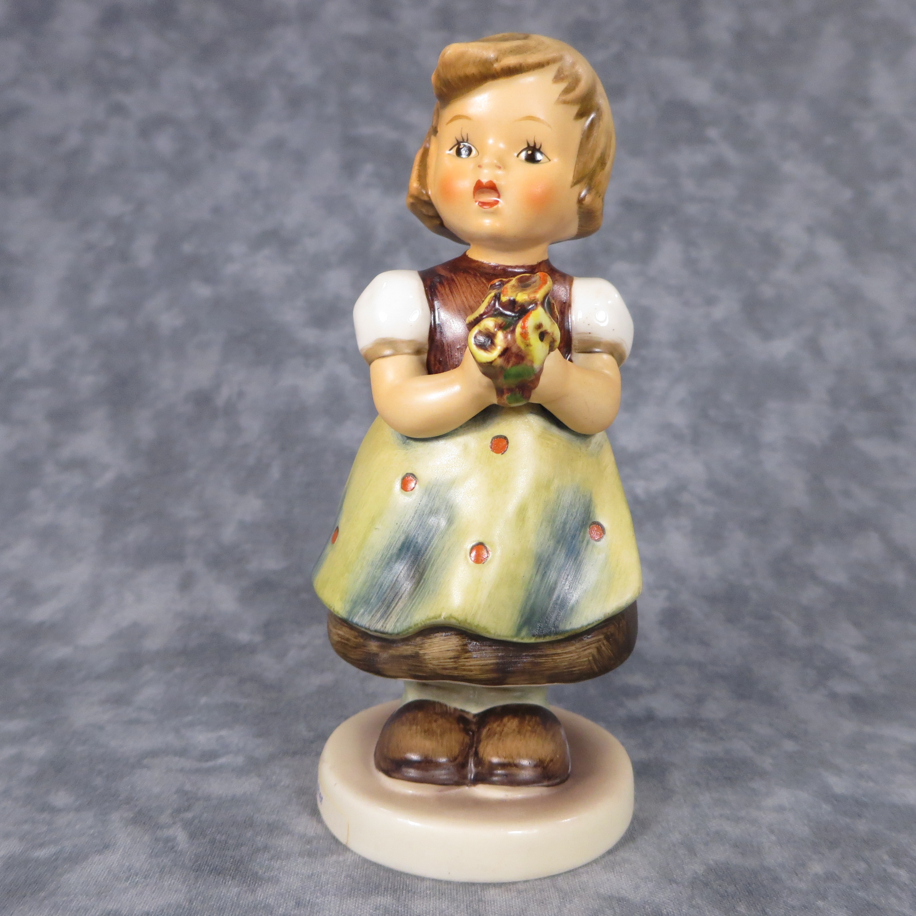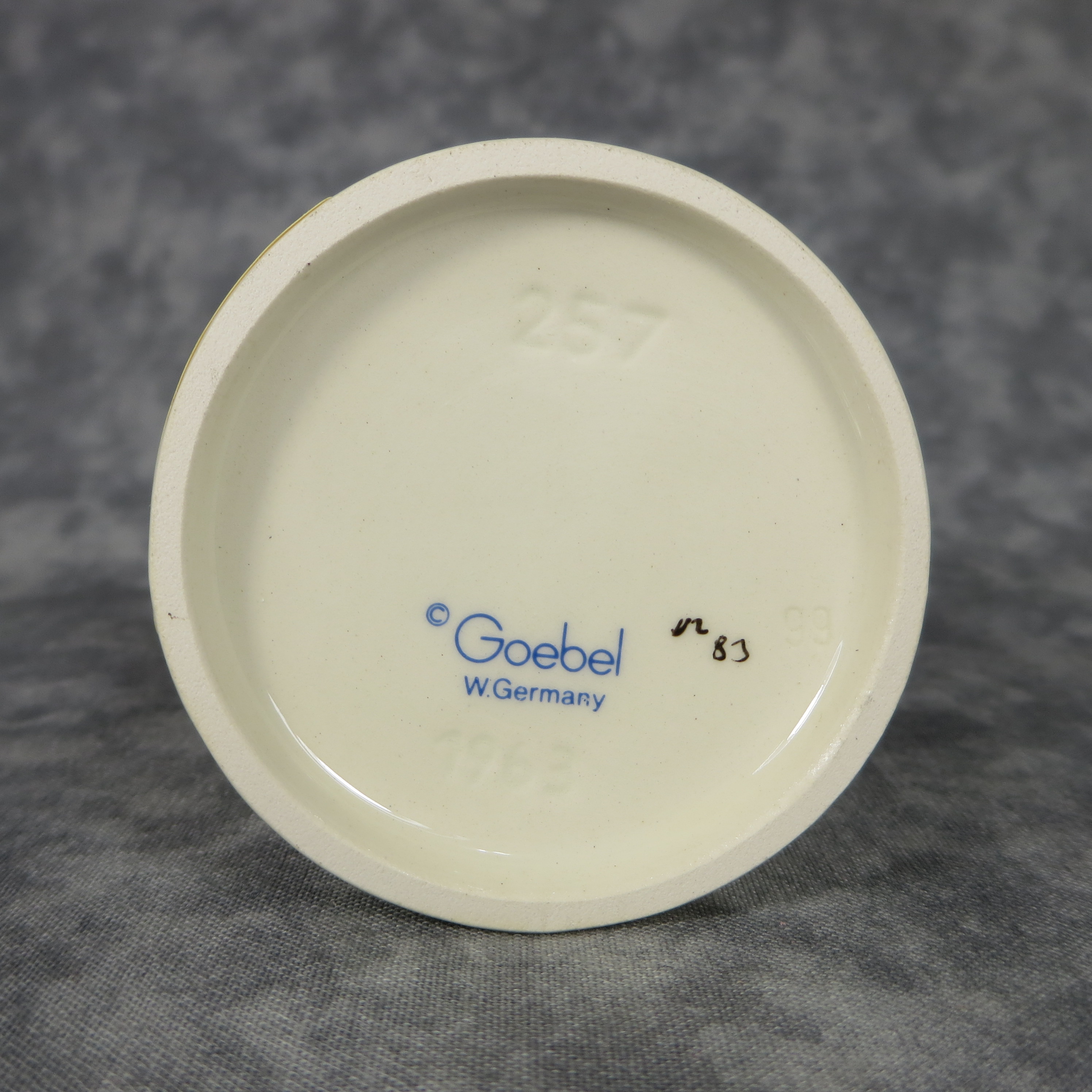 February 03, 2026 - 5 inches tall. Base is incised 257 and 1963. Goebel TMK 6 trademark imprinted in blue on bottom of base. Painter hand-initialed and dated in black ink on bottom of base.