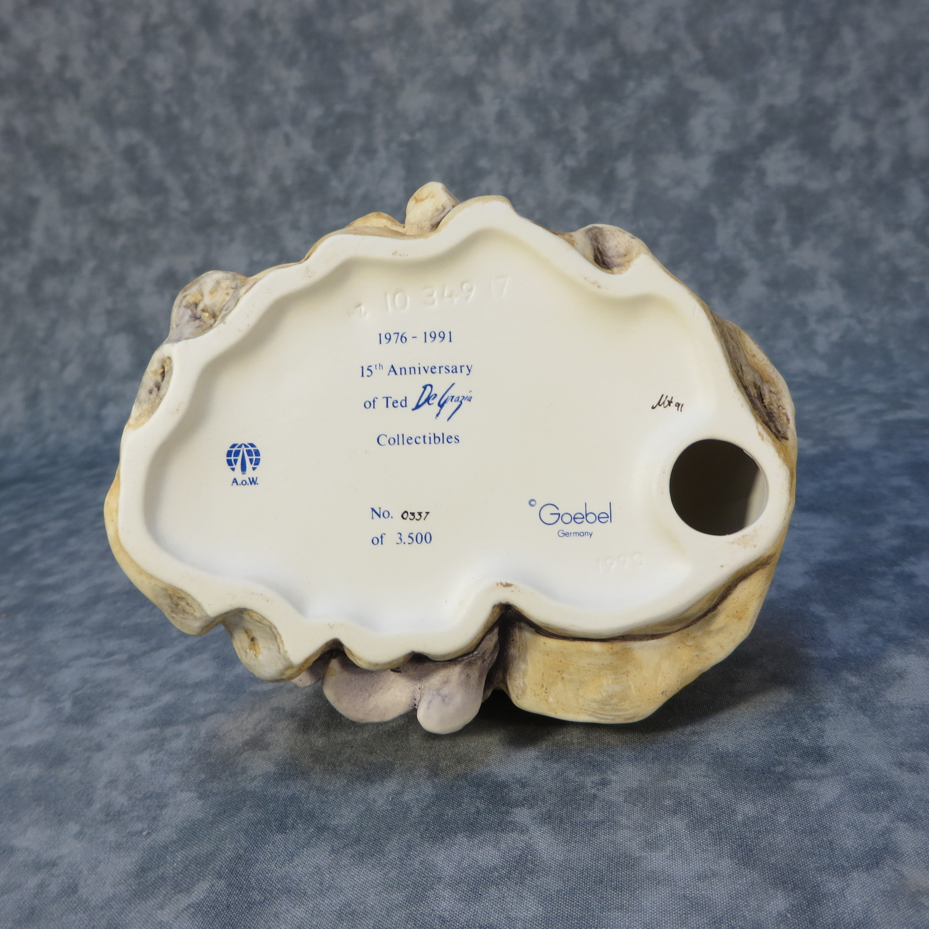 October 28, 2025 - 6-1/2 inches tall, 5-1/2 inches wide, 4-1/2 inches deep. Base is incised 10 349 17 and 1990. Goebel TMK 6 trademark, 1976-1991 / 15th Anniversary / of Ted DeGrazia / in Collectables' and 'No. xxxx of 3.500' imprinted in blue on bottom of base. Painter hand-initialed and dated in black ink on bottom of base.