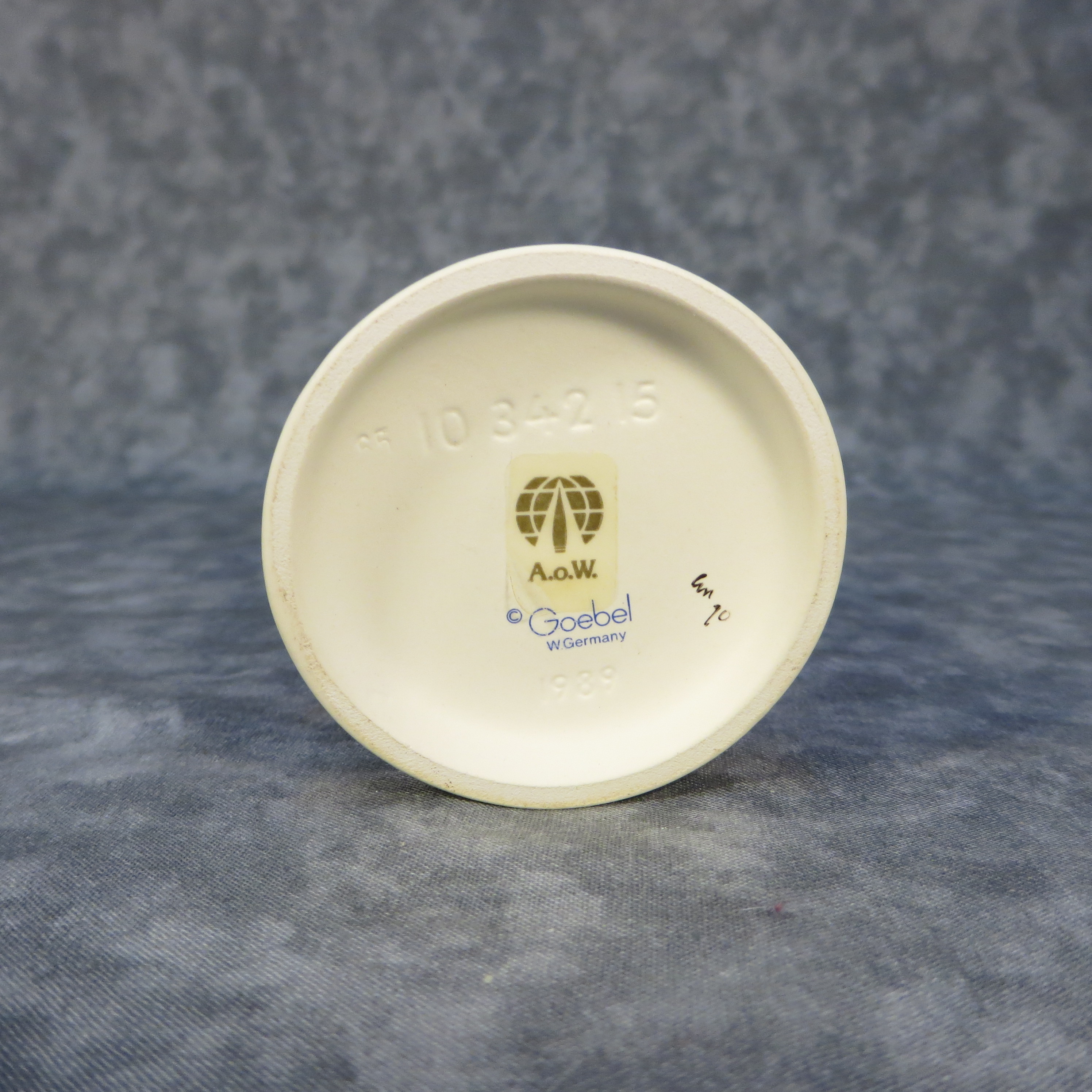 October 28, 2025 - 6 inches tall. Base is incised 10 342 15 and 1989. Goebel TMK 6 trademark imprinted in blue on bottom of base. Painter hand-initialed and dated in black ink on bottom of base.