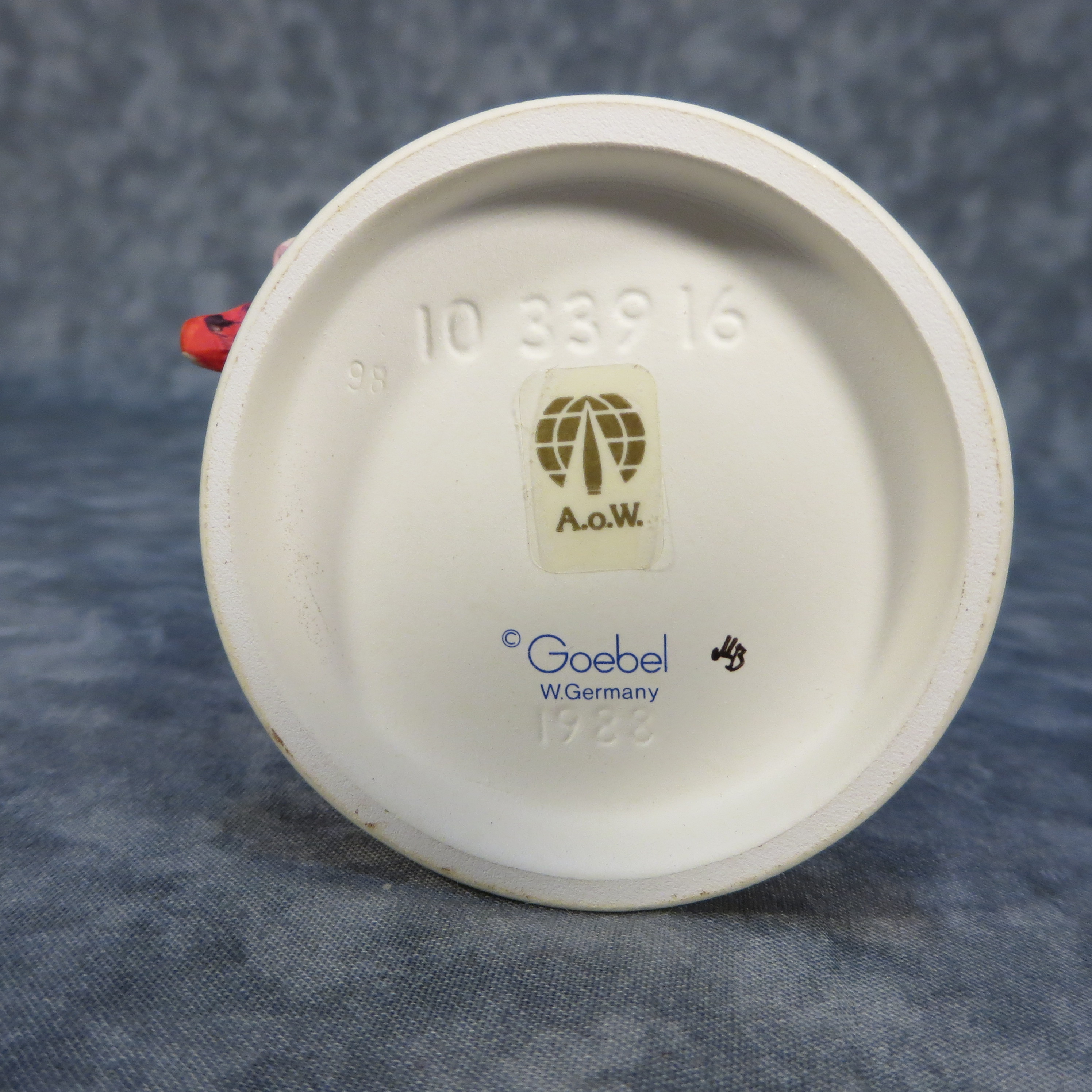 February 03, 2026 - 6-1/2 inches tall. Base is incised 10 339 16 and 1986. Goebel TMK 6 trademark imprinted in blue on bottom of base. Painter hand-initialed and dated in black ink on bottom of base.