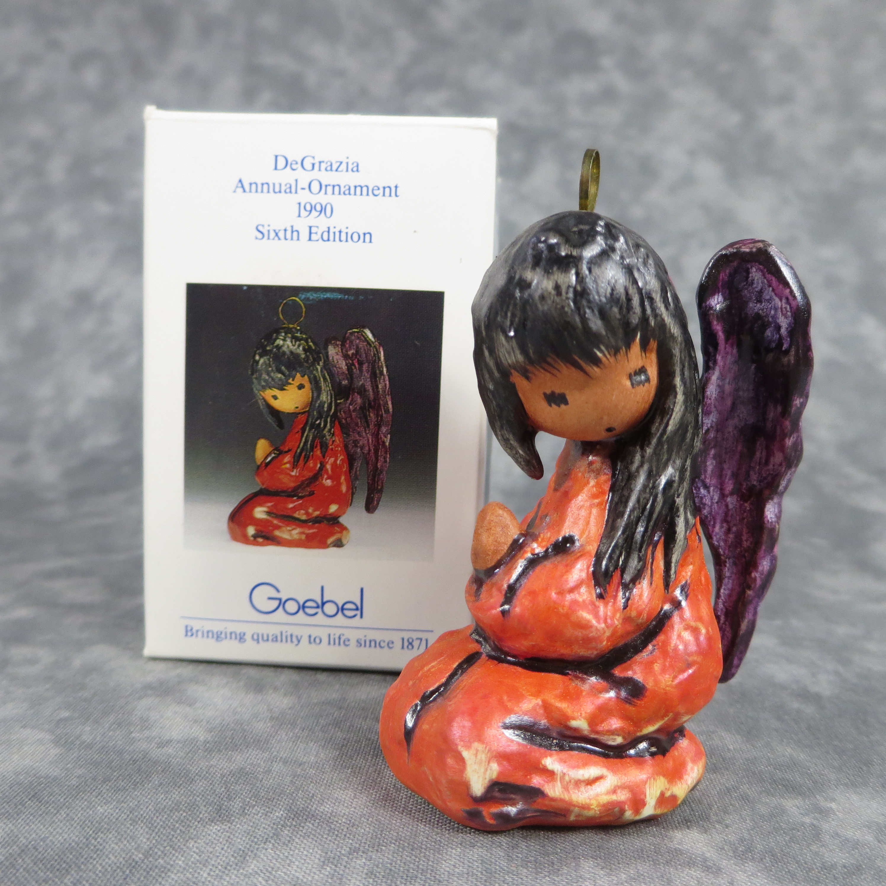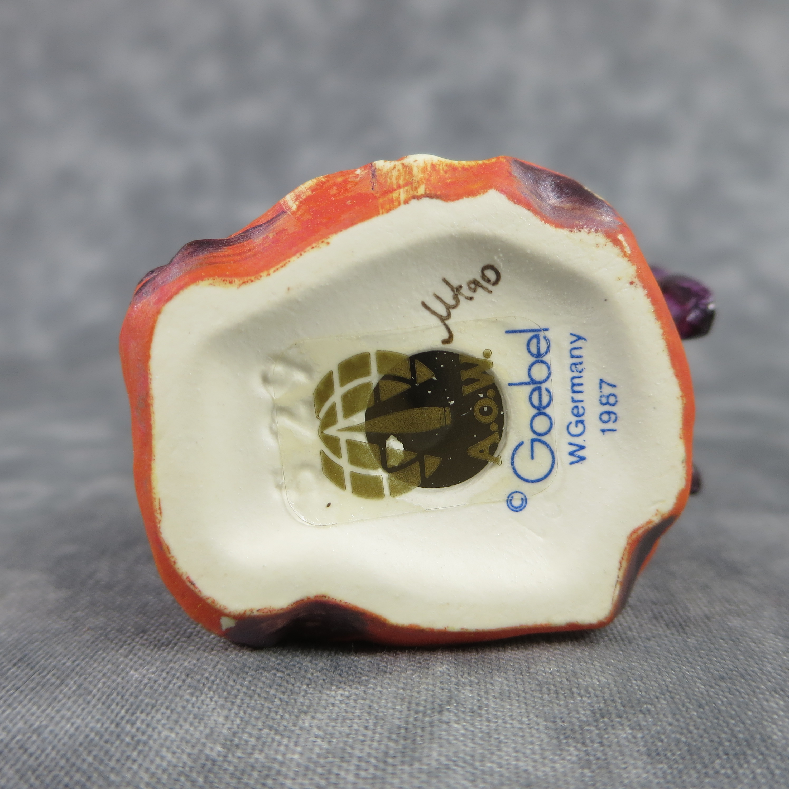 February 03, 2026 - 2-1/2 inches tall. Goebel TMK 6 trademark imprinted in blue on bottom. Painter hand-initialed and dated in black ink on bottom.