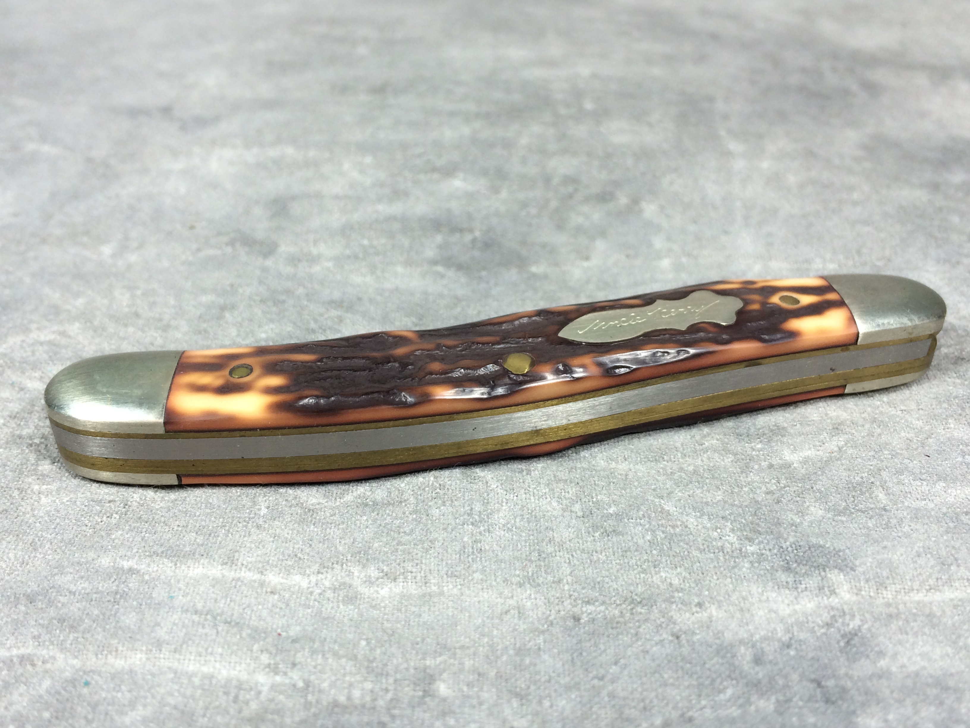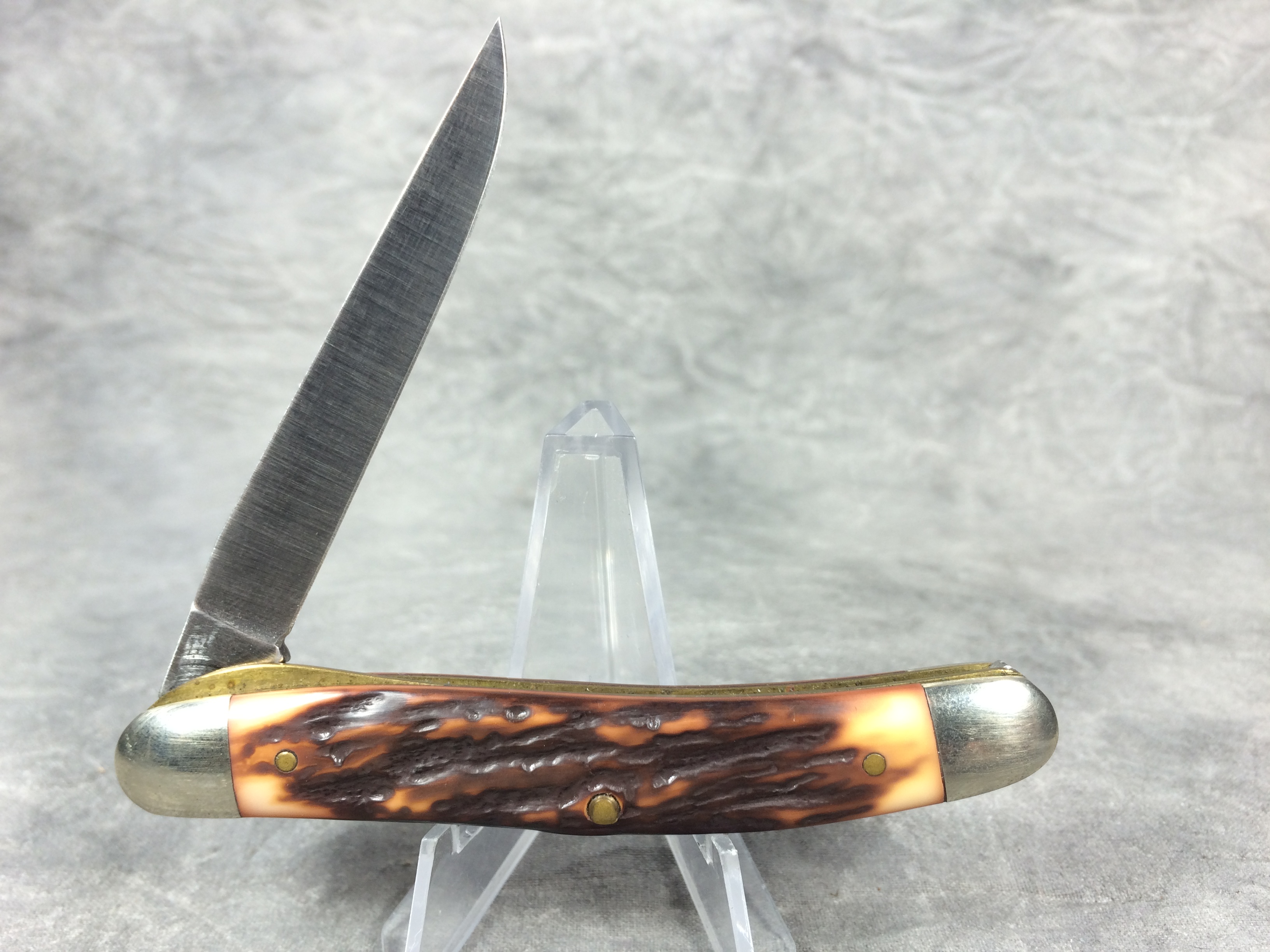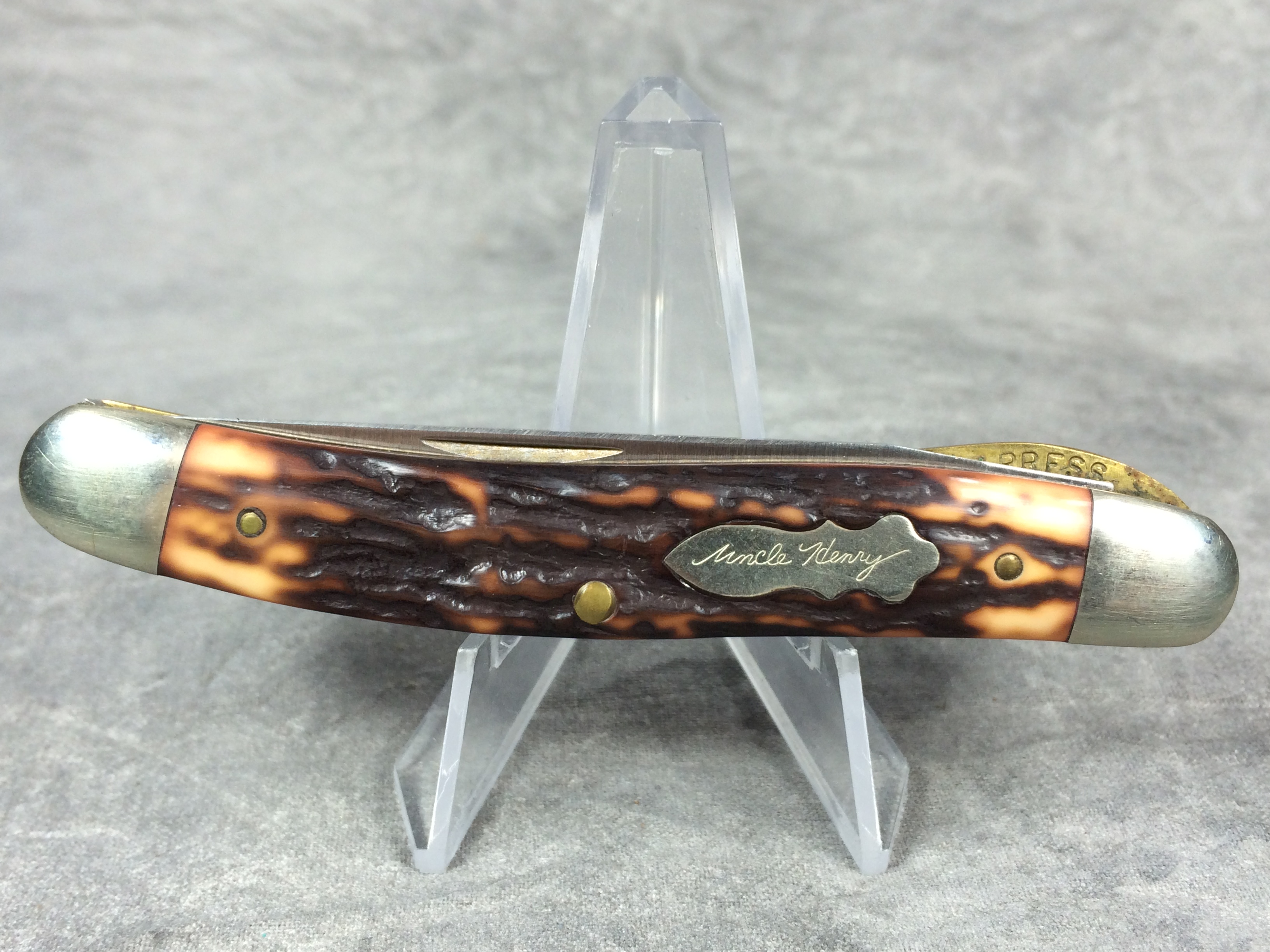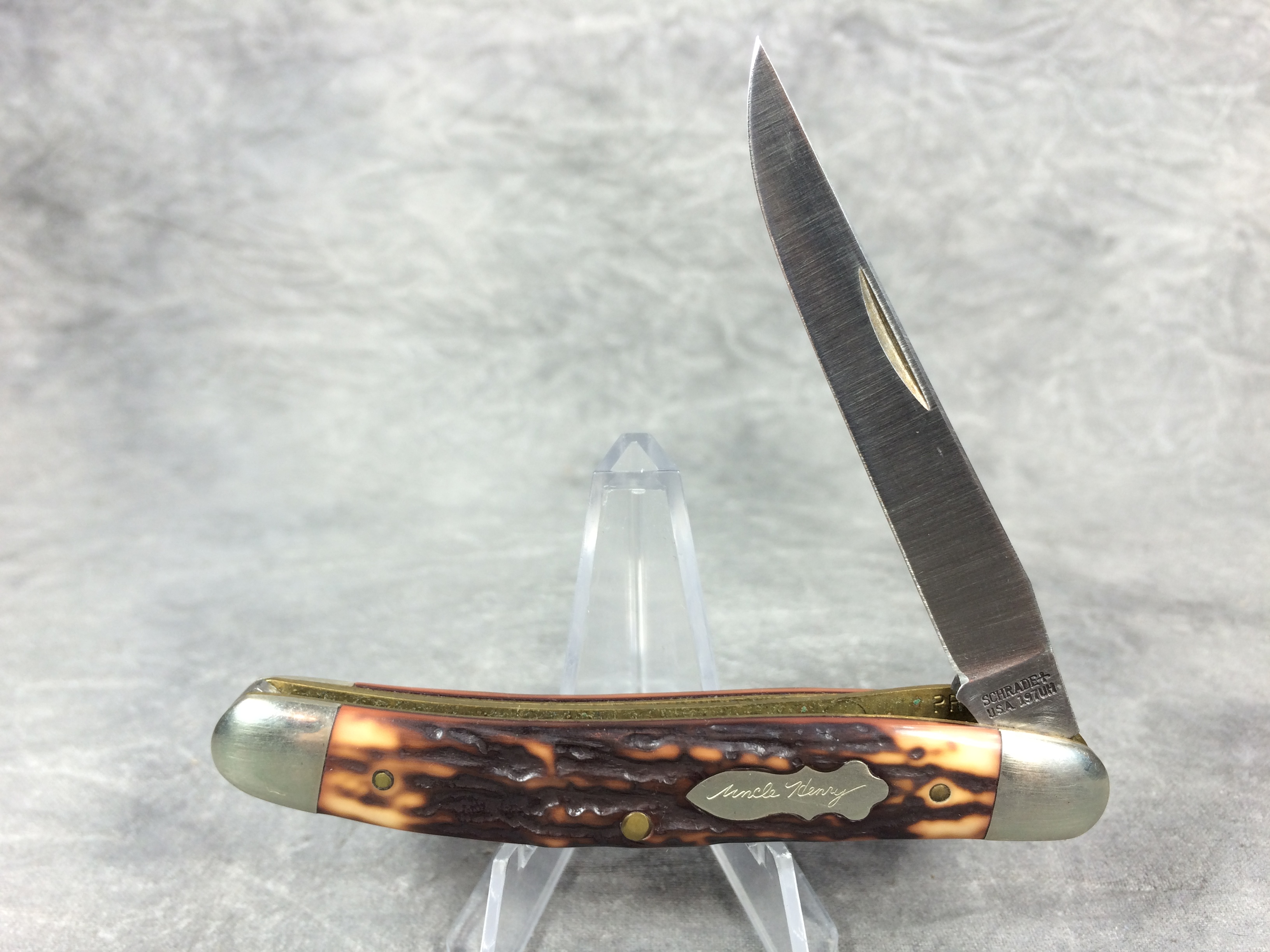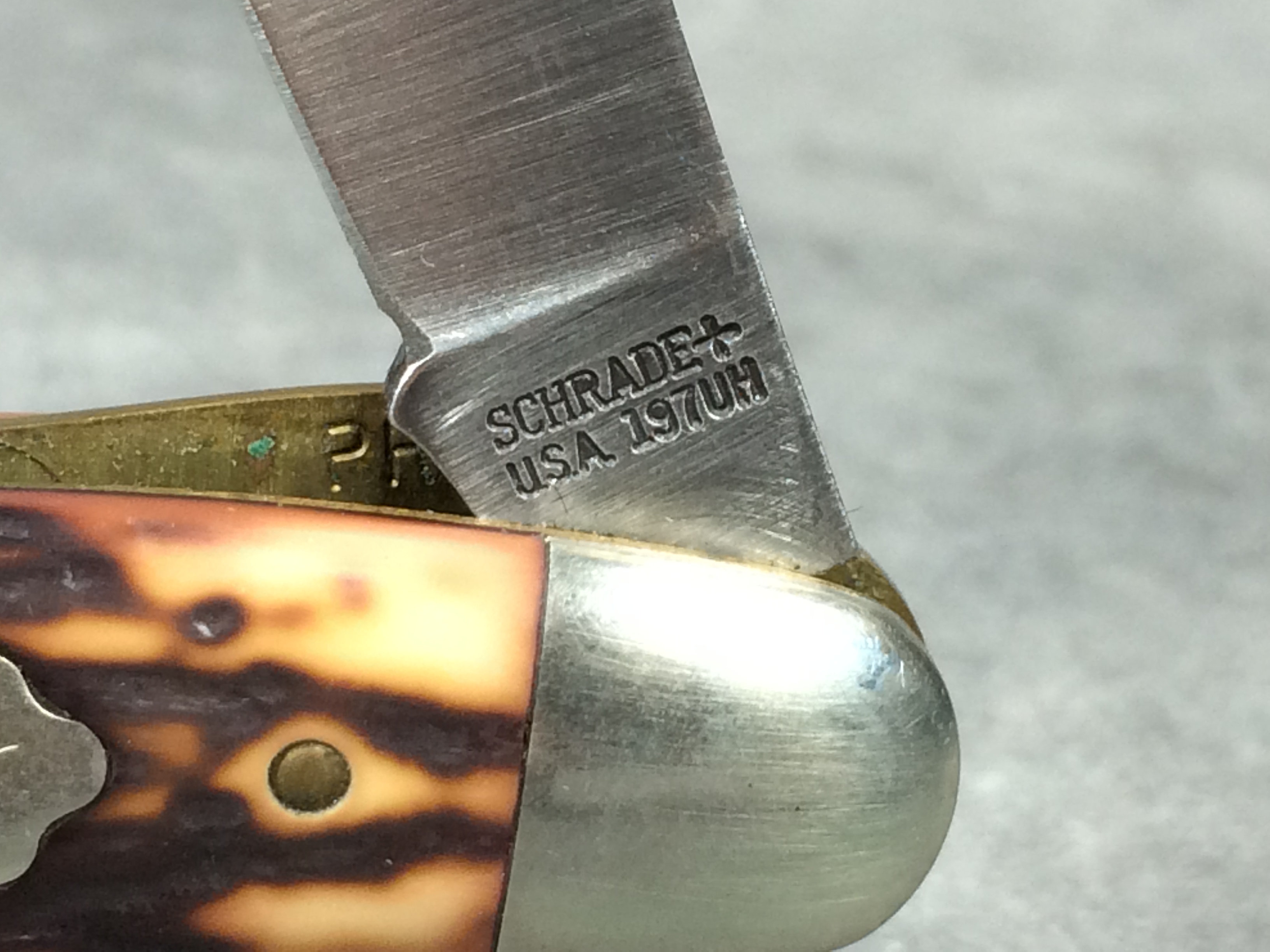 April 05, 2026 - 3-1/2 inches closed. 6-3/8 inches open. "SCHRADE+ U.S.A. 197UH" tang stamp. "Uncle Henry" Bomb shield. Stainless Steel blade. Staglon handle. Nickel Silver bolsters. Brass liner.