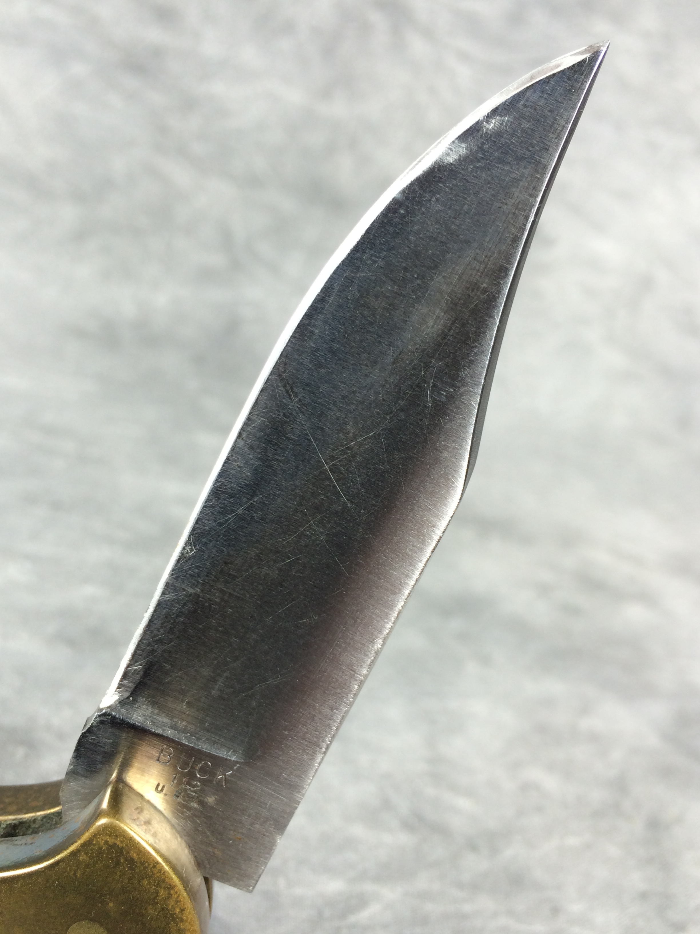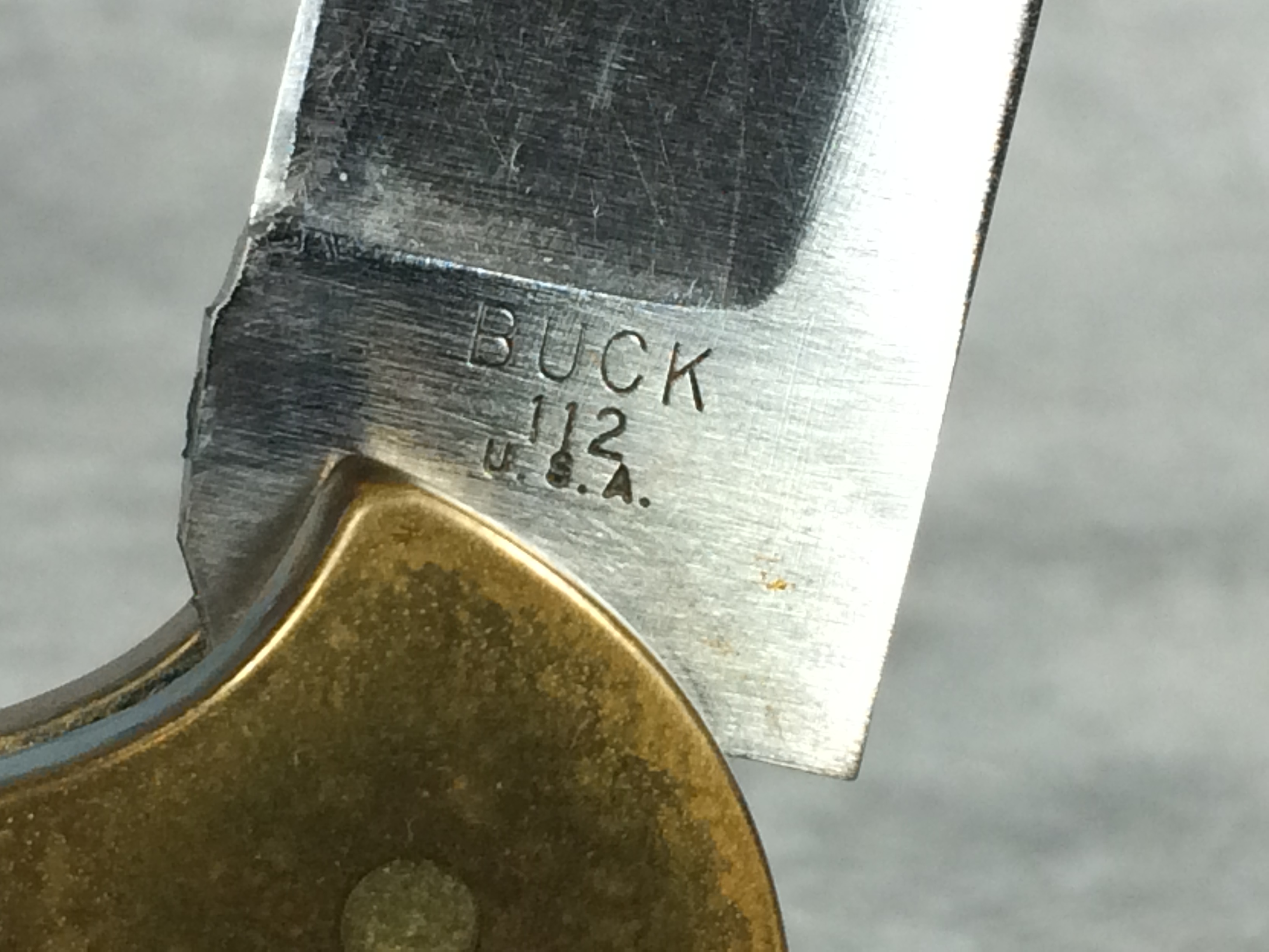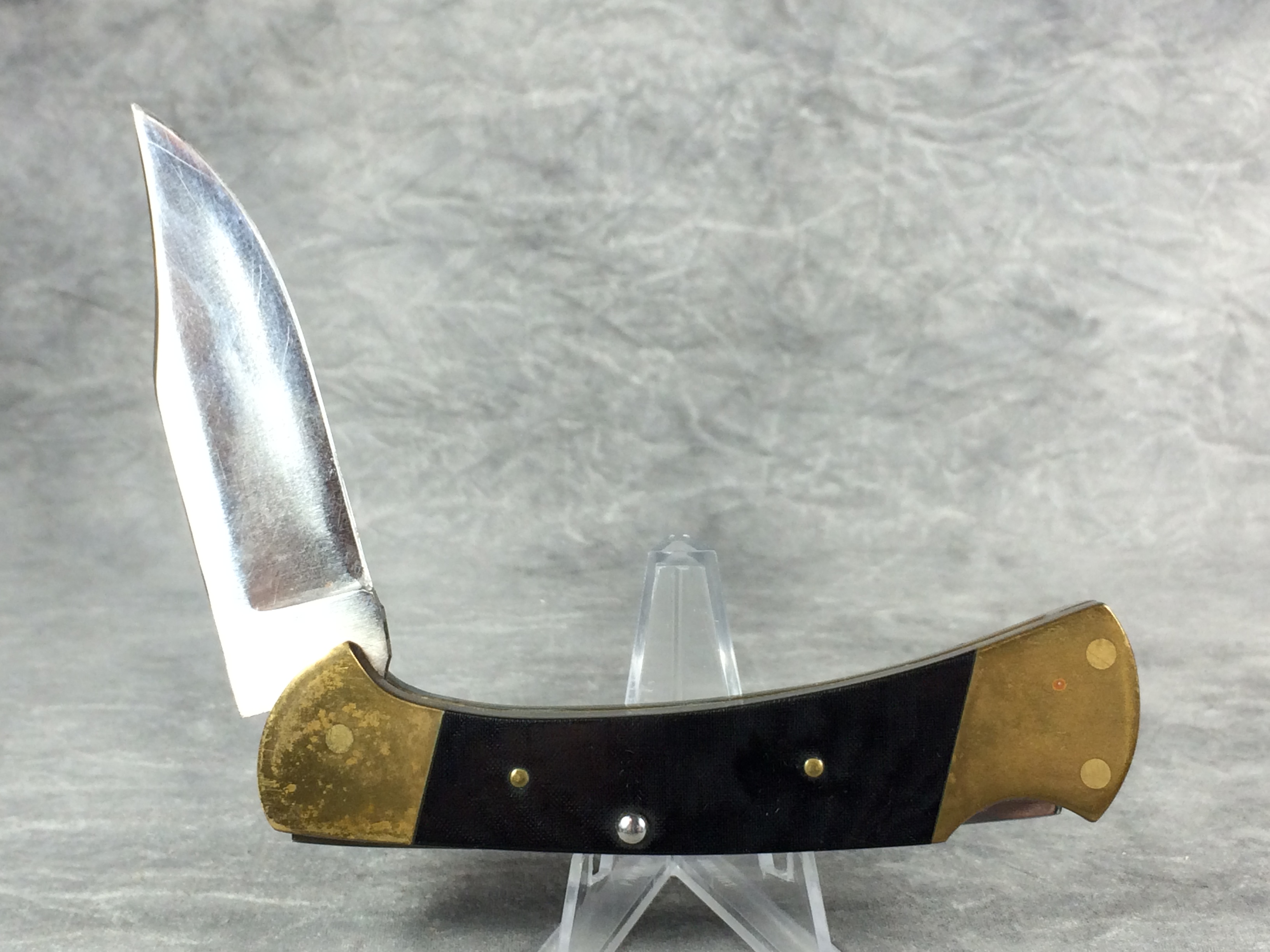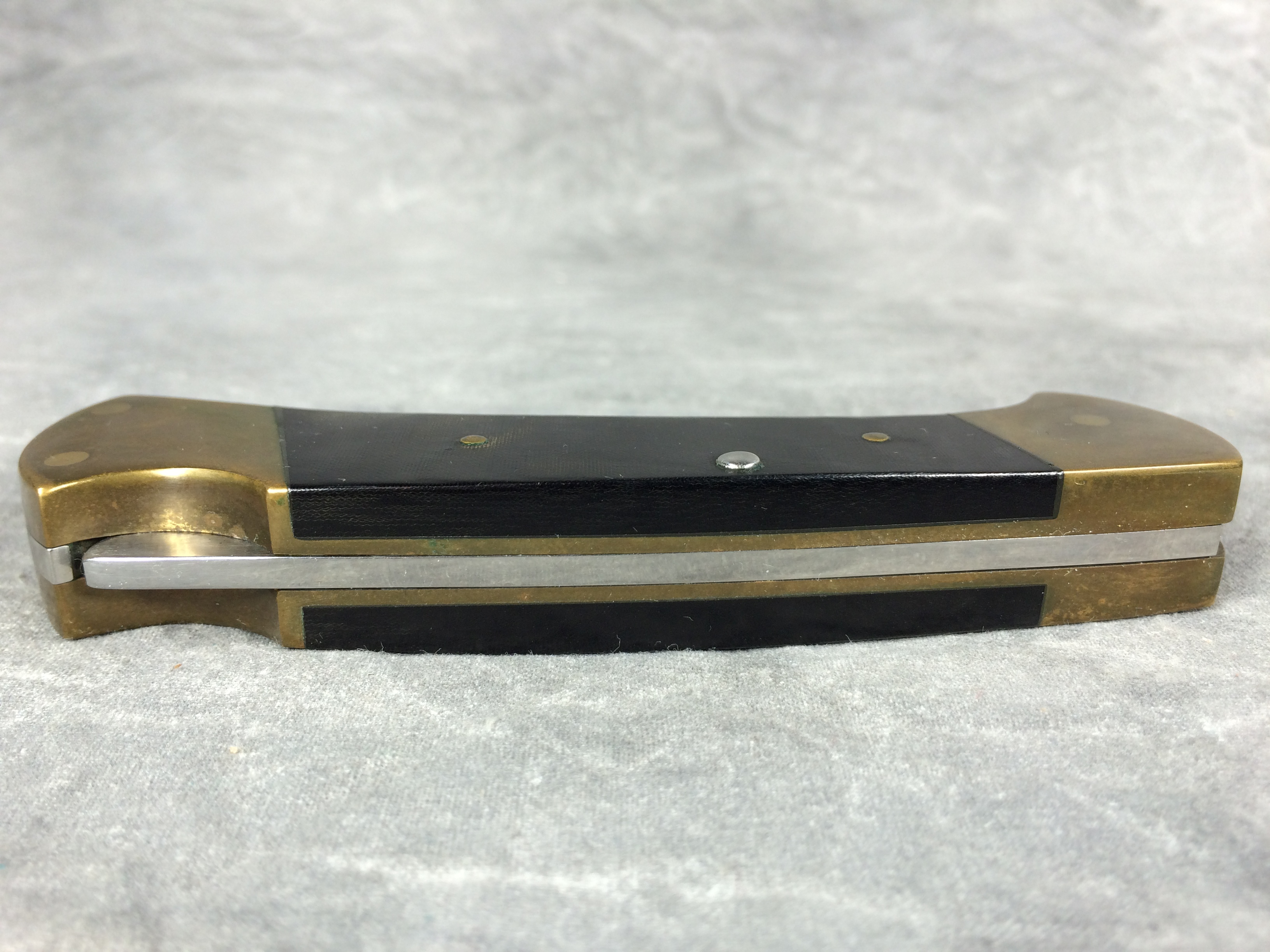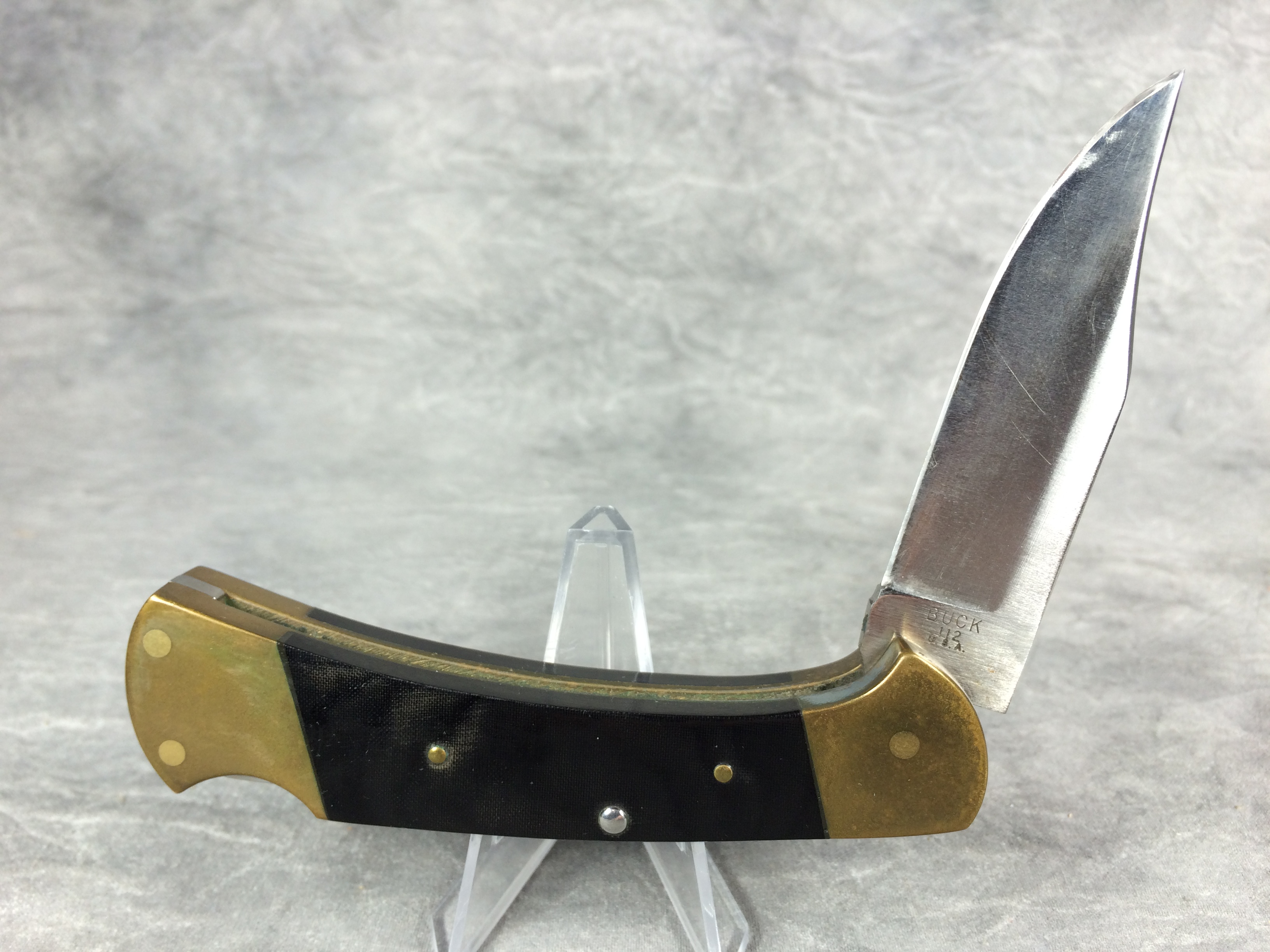 April 05, 2026 - 4-1/4 inches closed. 7-1/8 inches open. Made in USA. "BUCK 112 U.S.A." tang stamp. Stainless Steel blade. Black micarta handle. Brass bolsters and liner. With original box and paperwork.