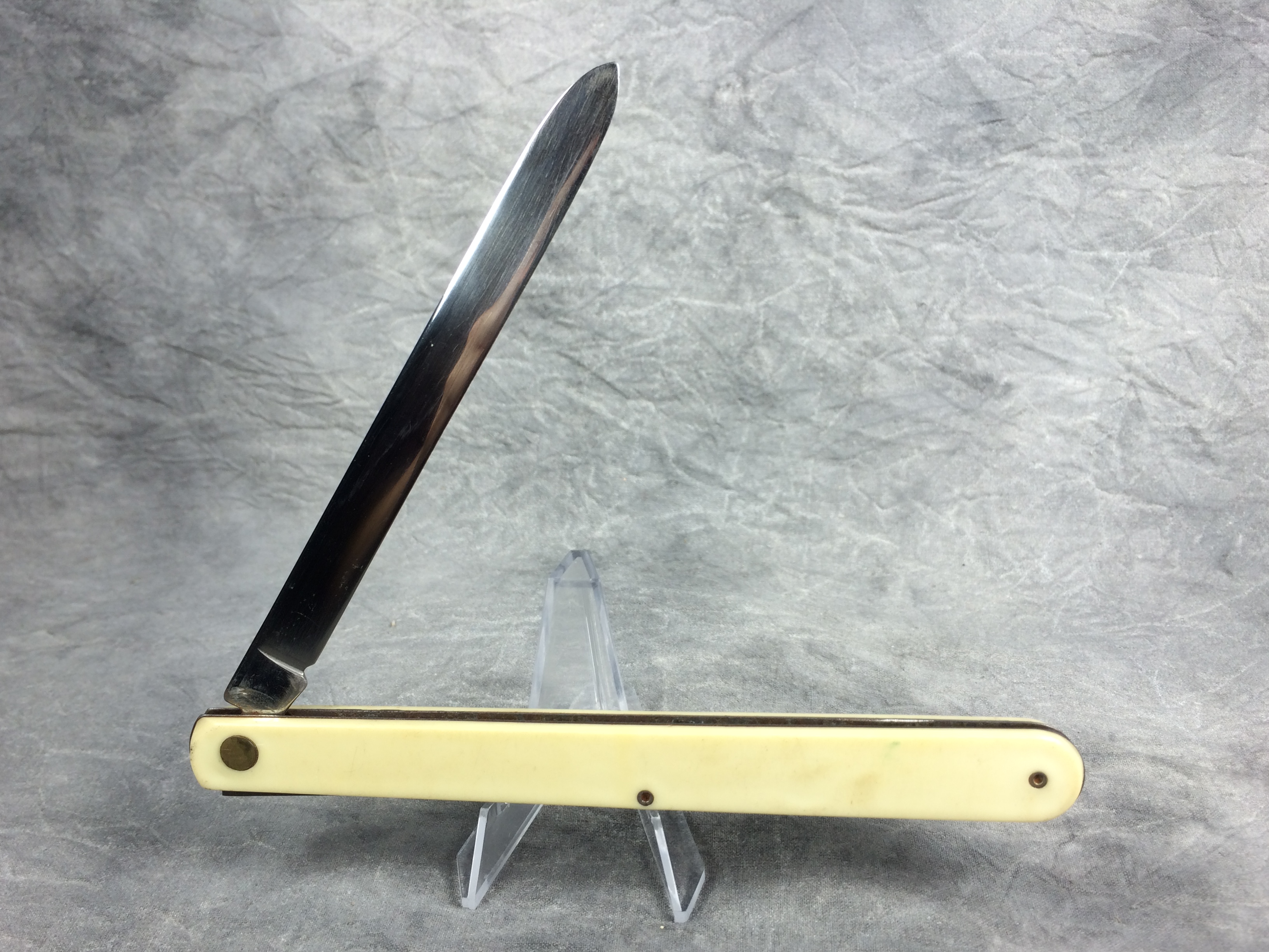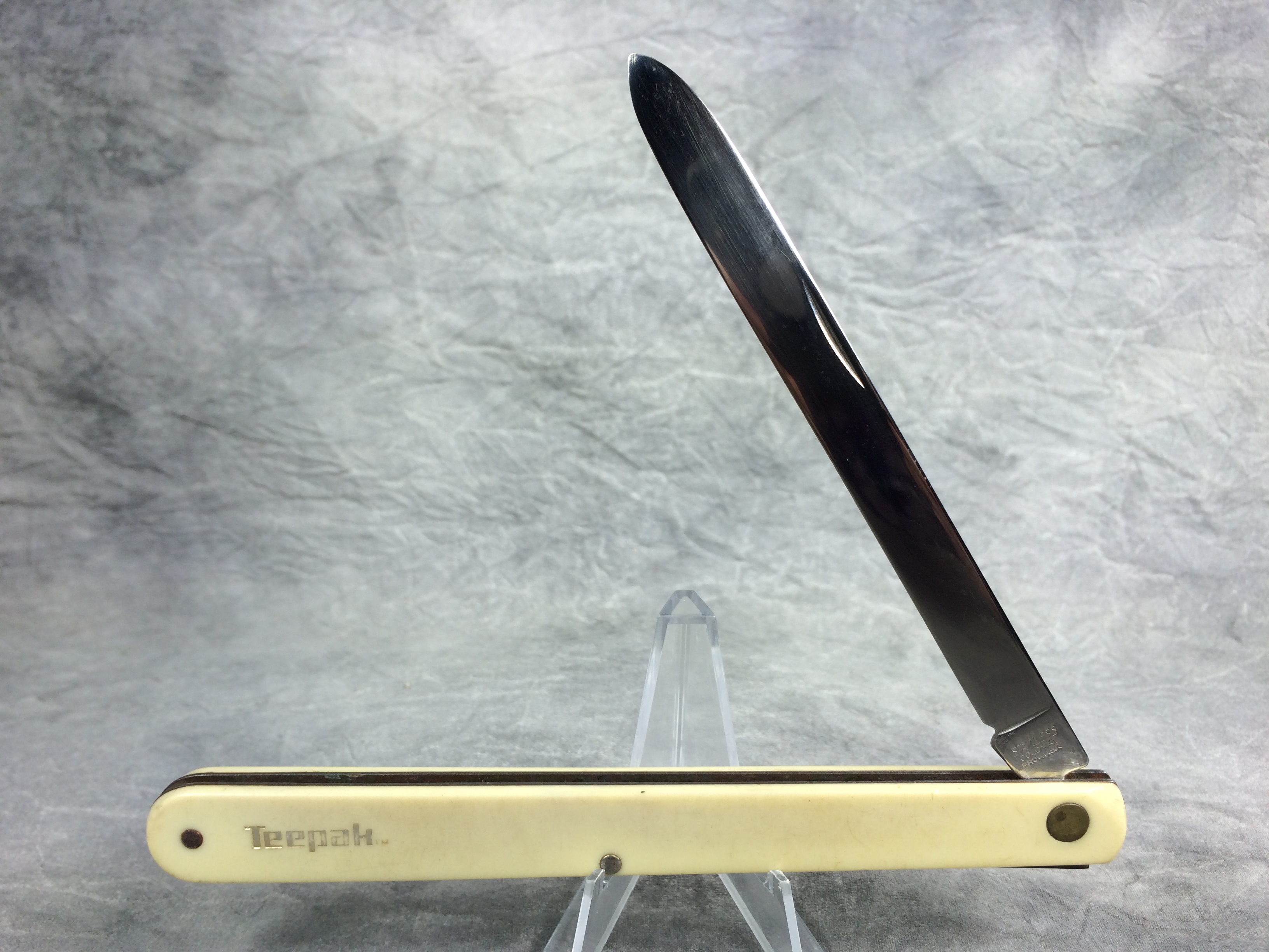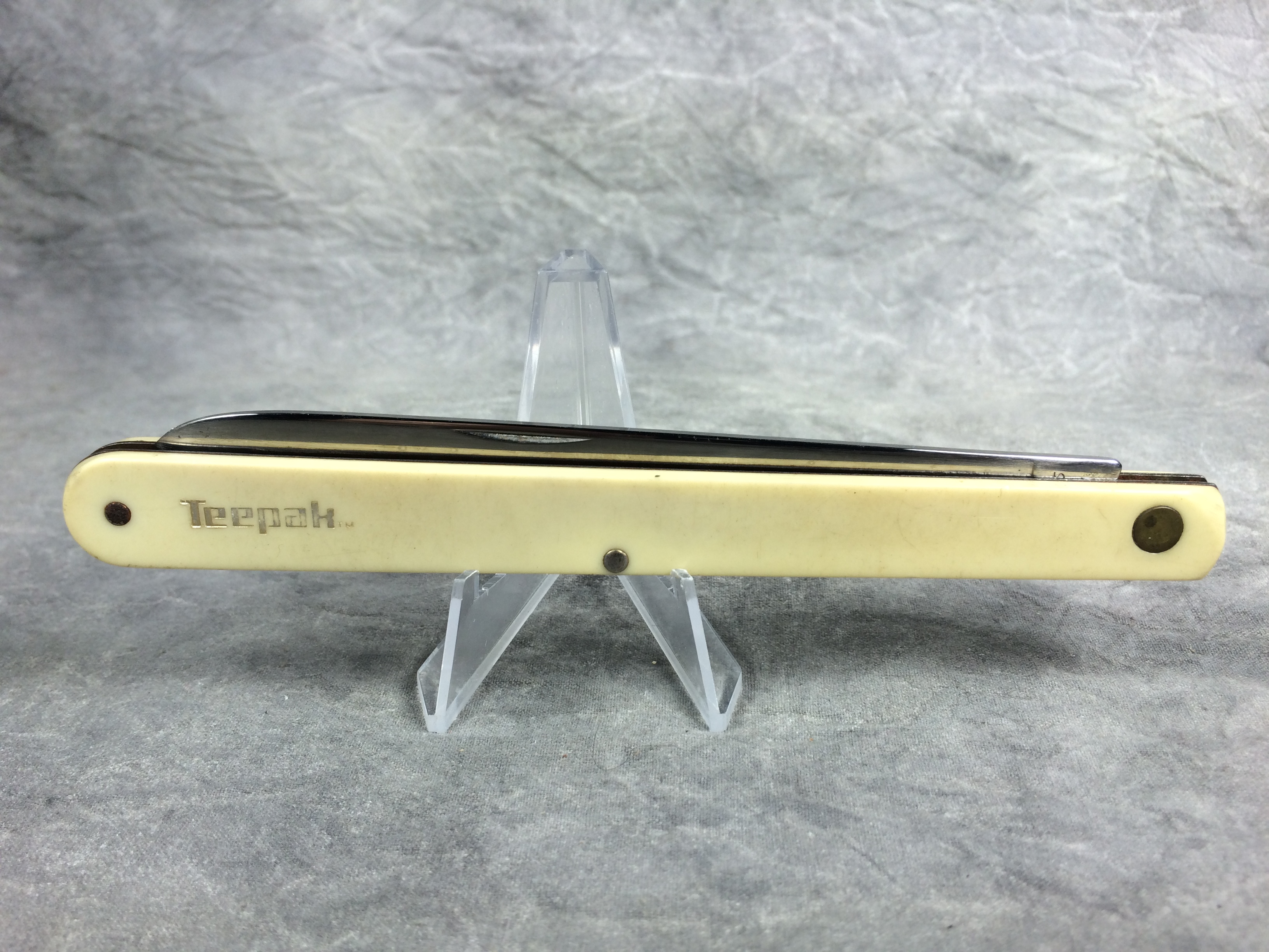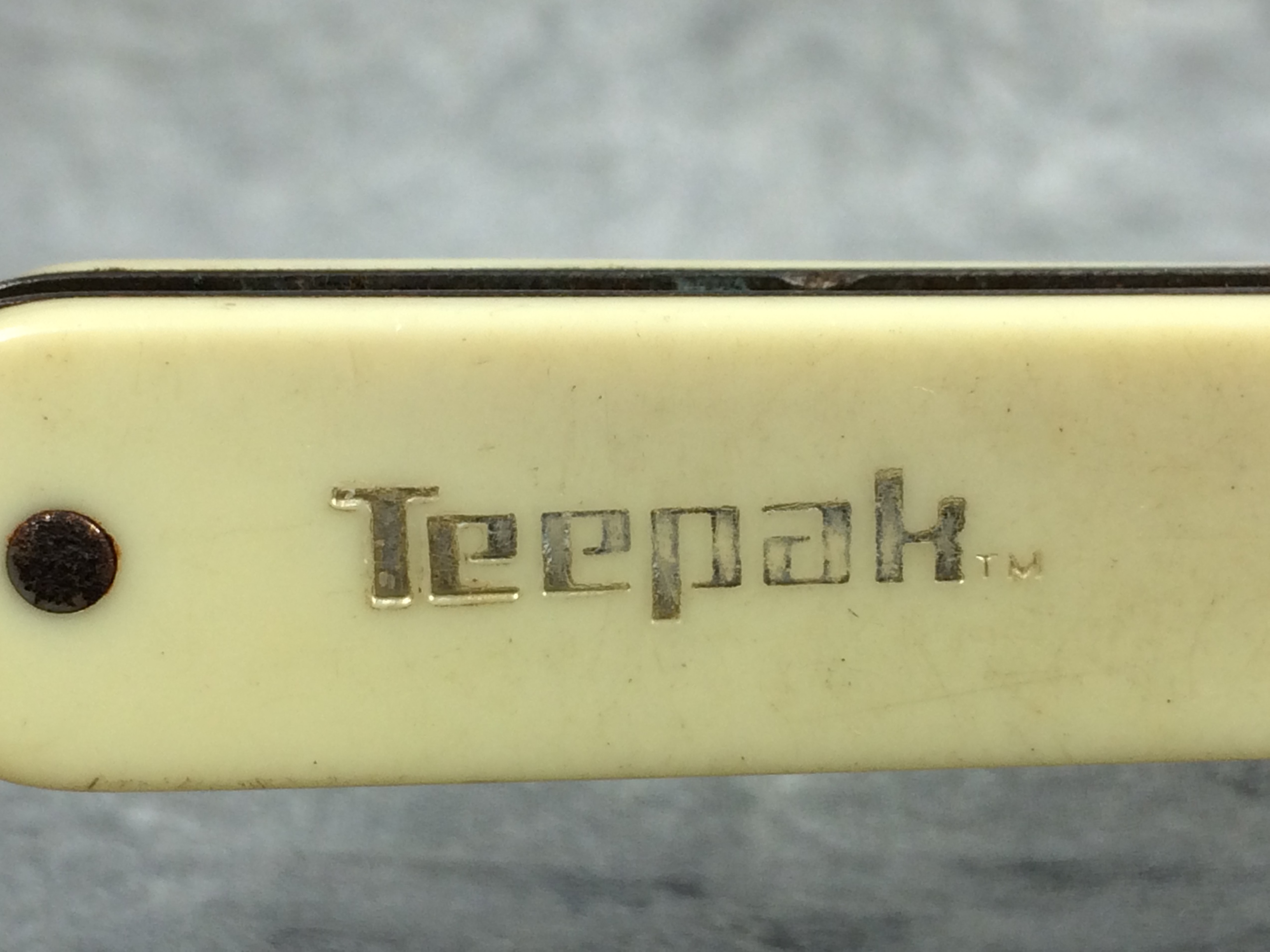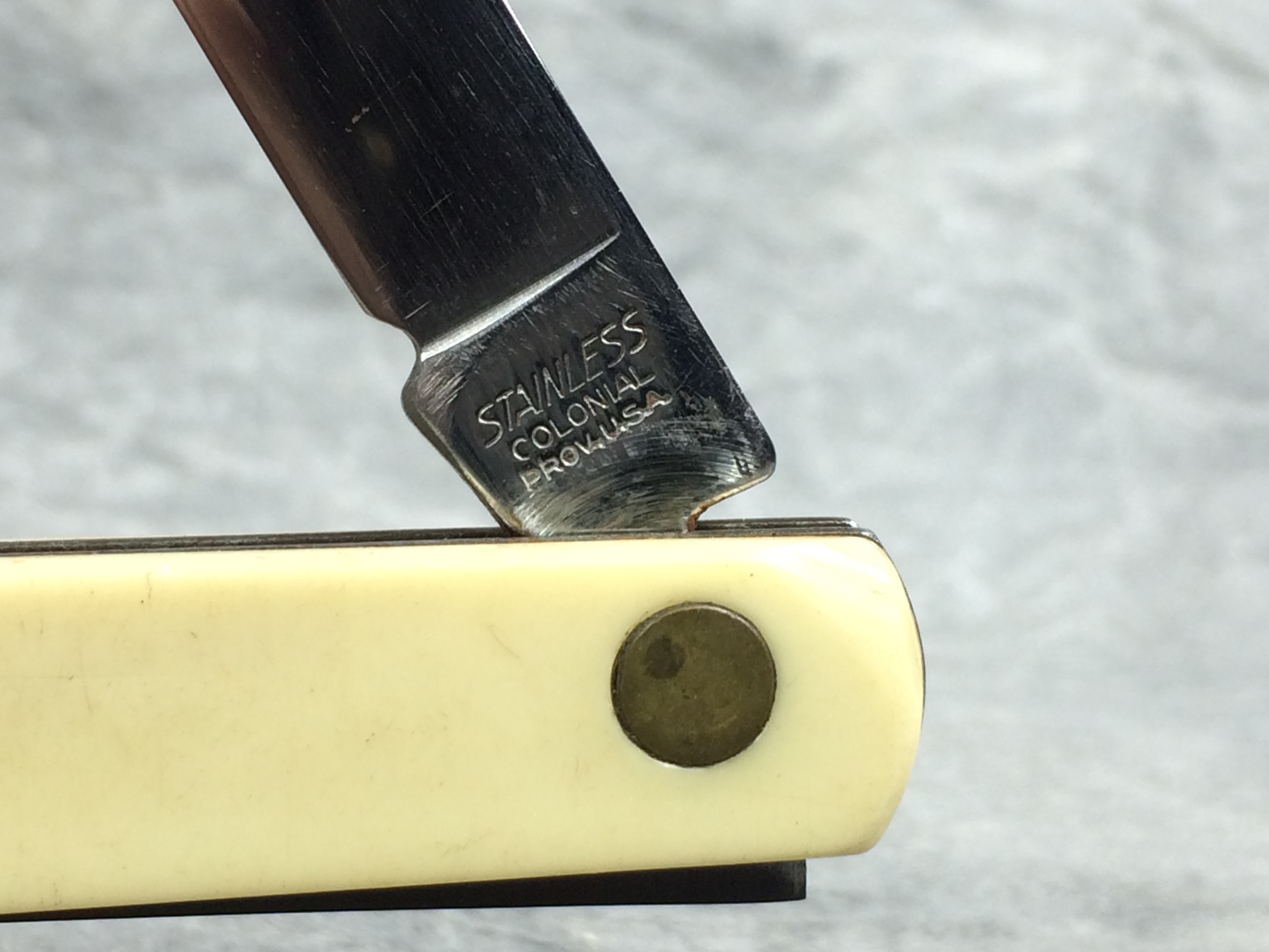 October 26, 2025 - Single-Blade Melon Tester Knife. 5-3/4 inches closed. 10-1/2 inches open. "STAINLESS COLONIAL PROV. U.S.A." tang stamp. Yellow composite handle etched "Teepak TM".