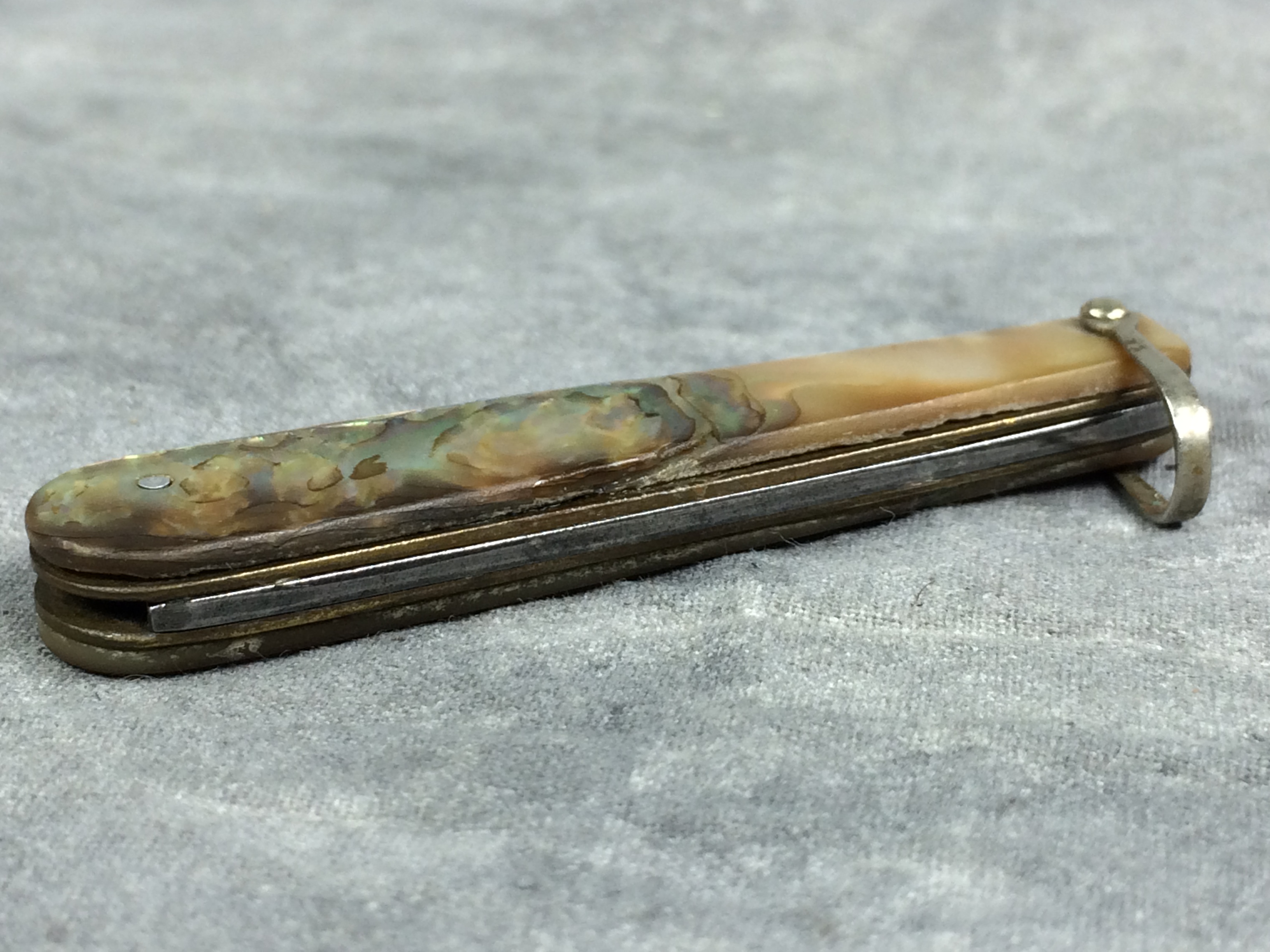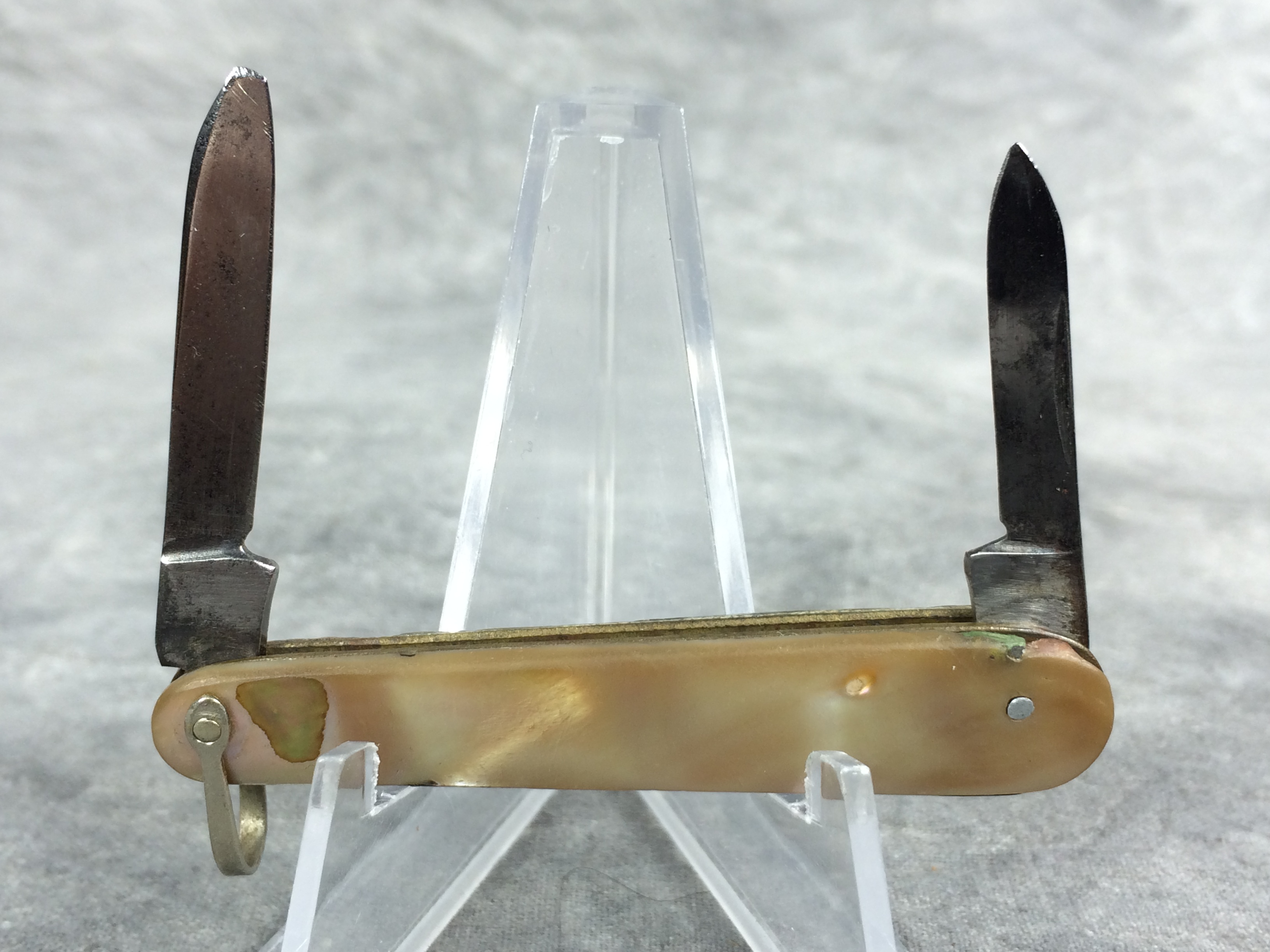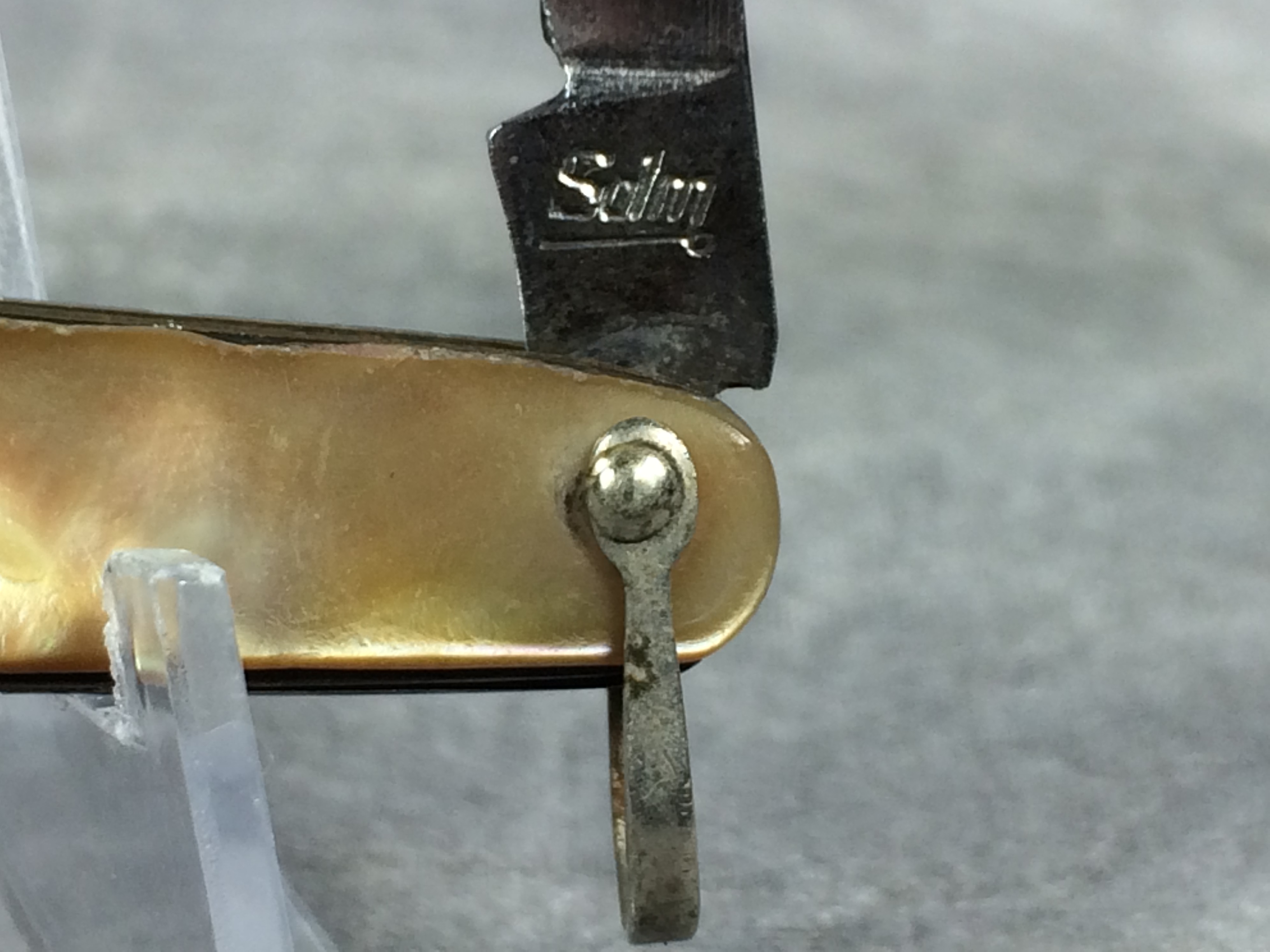 January 14, 2026 - 2-Blade Pen Knife. 2-1/4 inches closed. 3-1/2 inches open.  "Salm" tang stamp. Pearl handle. Brass liner.