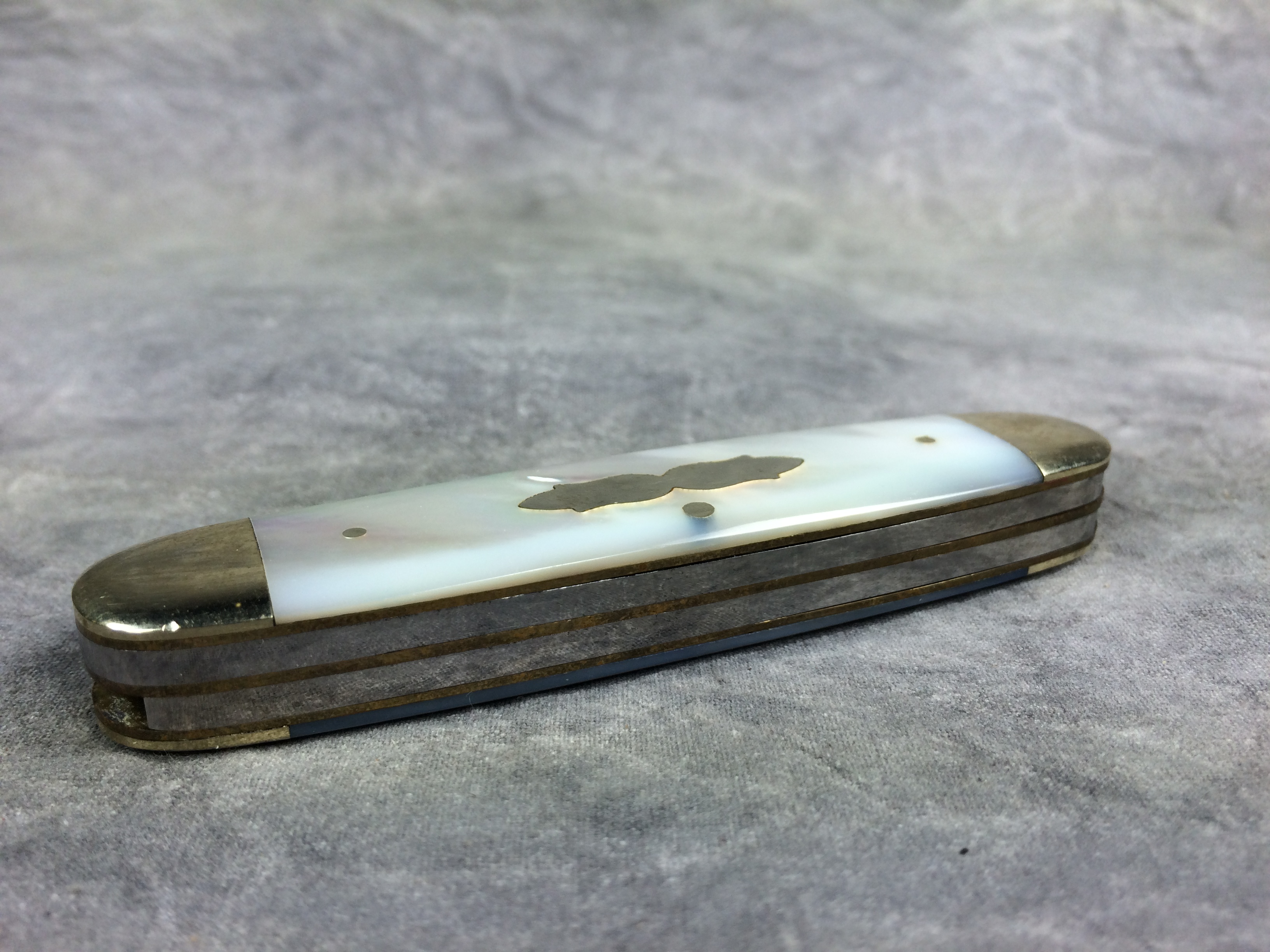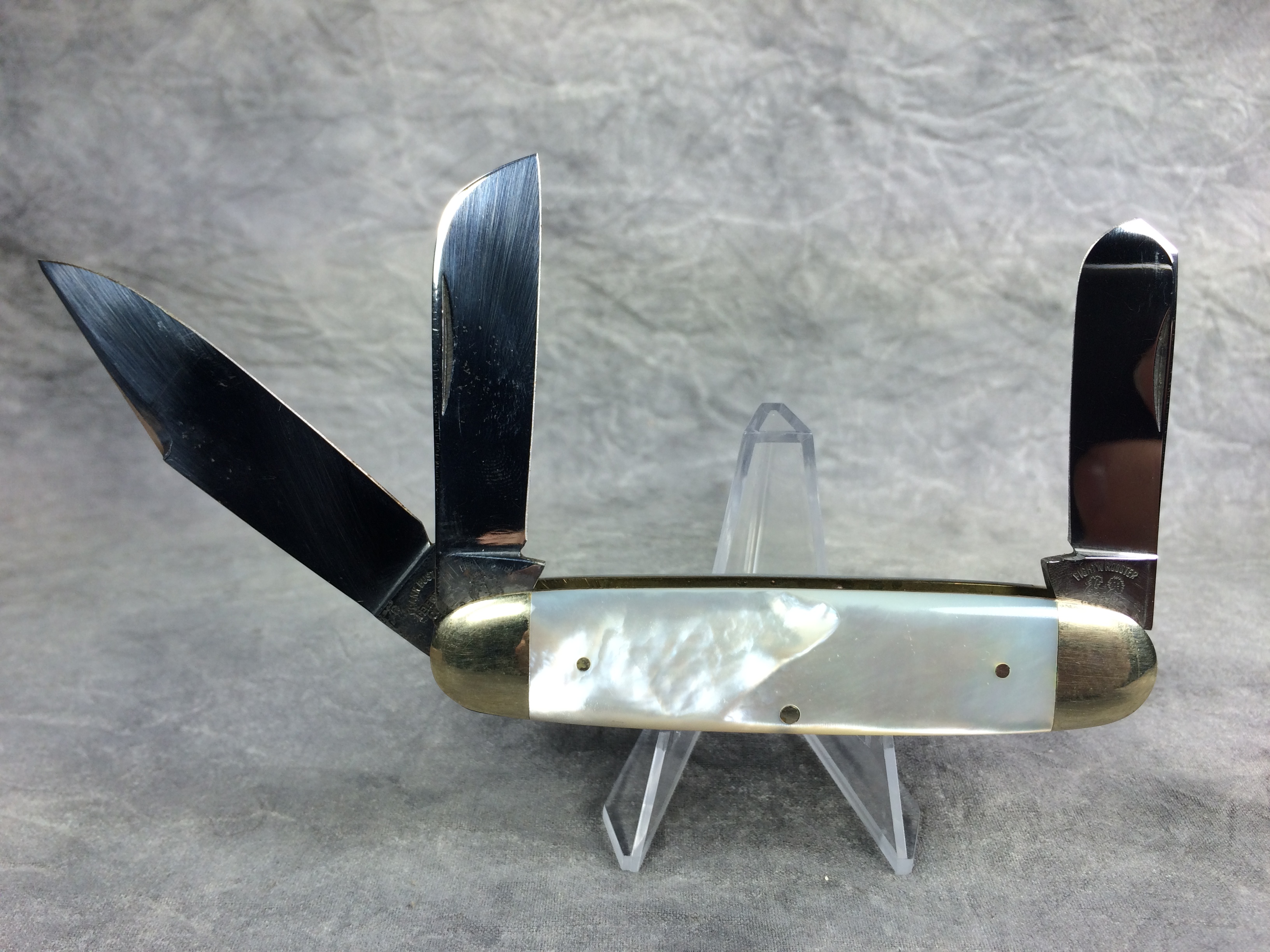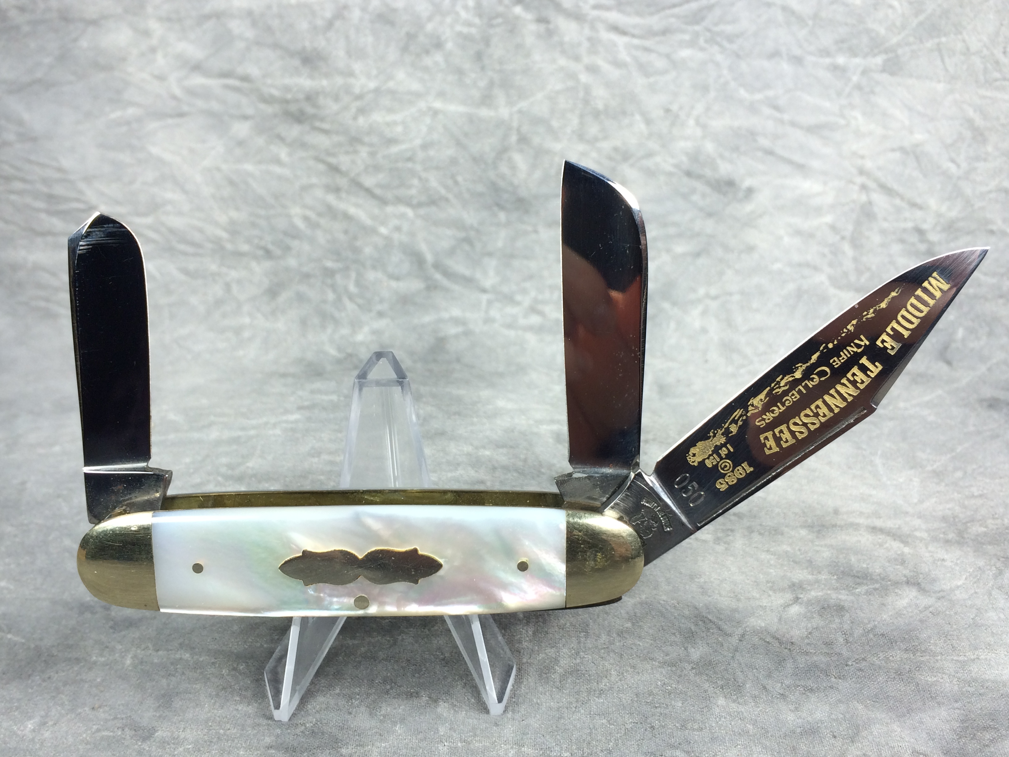 March 15, 2026 - 3-Blade Equal-End Cattle Knife. 3-1/2 inches closed. 6-1/8 inches open. Made in Germany. "FIGHT'N ROOSTER" over Fight'n Rooster logo over "SOLINGEN" and "FRANK BUSTER CELEBRATED CUTLERY GERMANY" tang stamps. Master blade etched "MIDDLE TENNESSEE KNIFE COLLECTORS  1985 (C) 1 of 150" and serial #. Mother of Pearl handle. Nickel Silver bolsters. Brass liner.