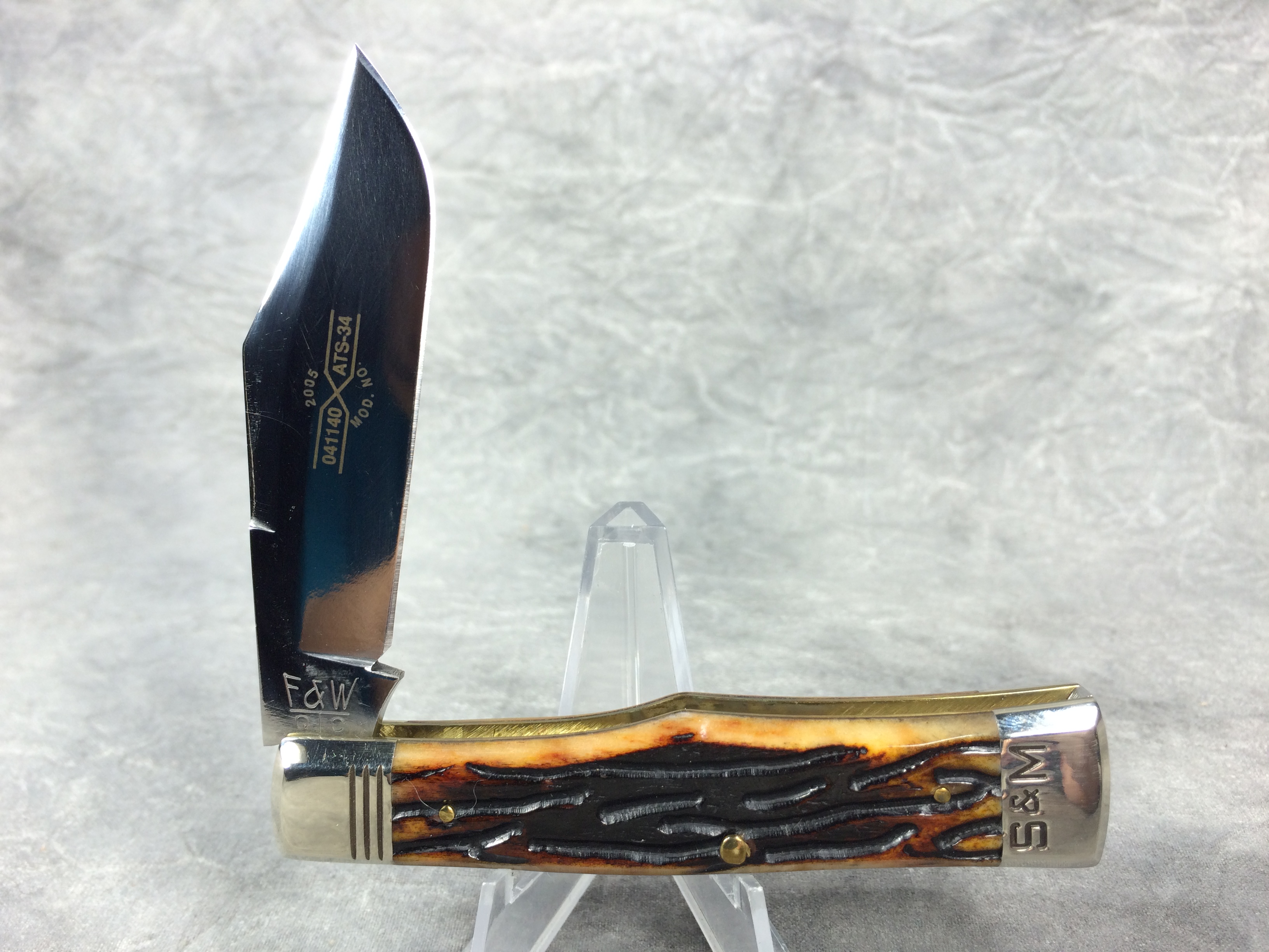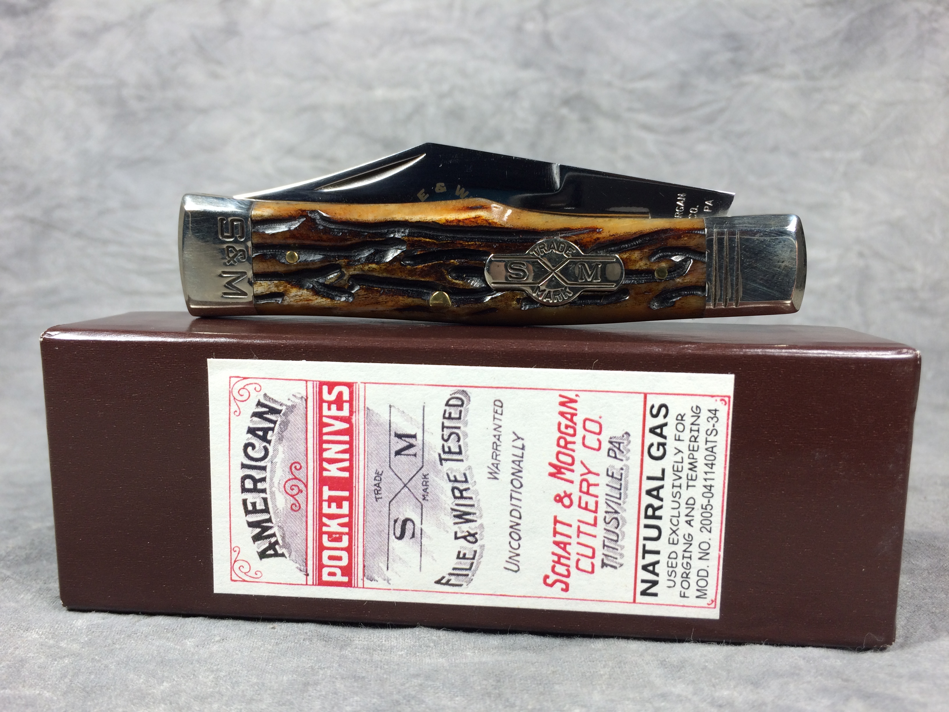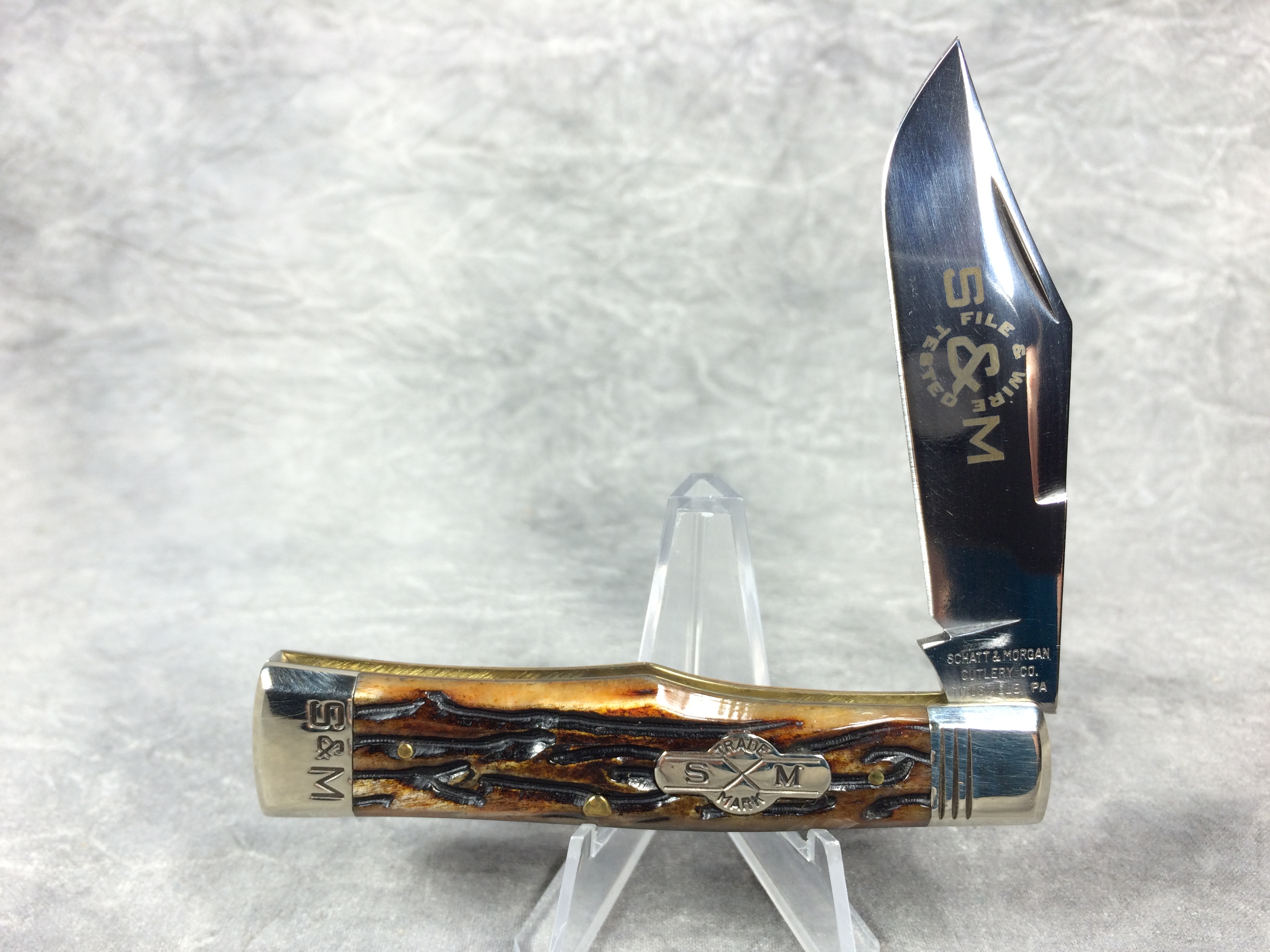 February 23, 2026 - Single-Blade Gunstock Knife. Made in USA by Queen Cutlery. File & Wire Tested Series 3. 3-1/2 inches closed. 6-3/8 inches open. "SCHATT & MORGAN CUTLERY CO. TITUSVILLE PA." and "F & W QC" tang stamps. Blade etched S & M FILE & WIRE TESTED" and "2005  041140 X ATS-34 MOD. NO.". Worm groove bone handle. Nickel Silver bolsters engraved "S & M". Brass liner. With original box.