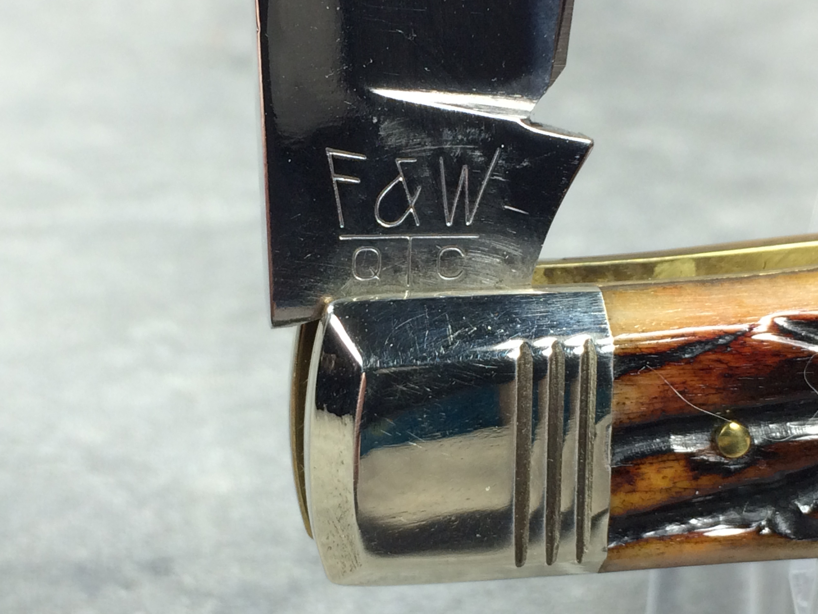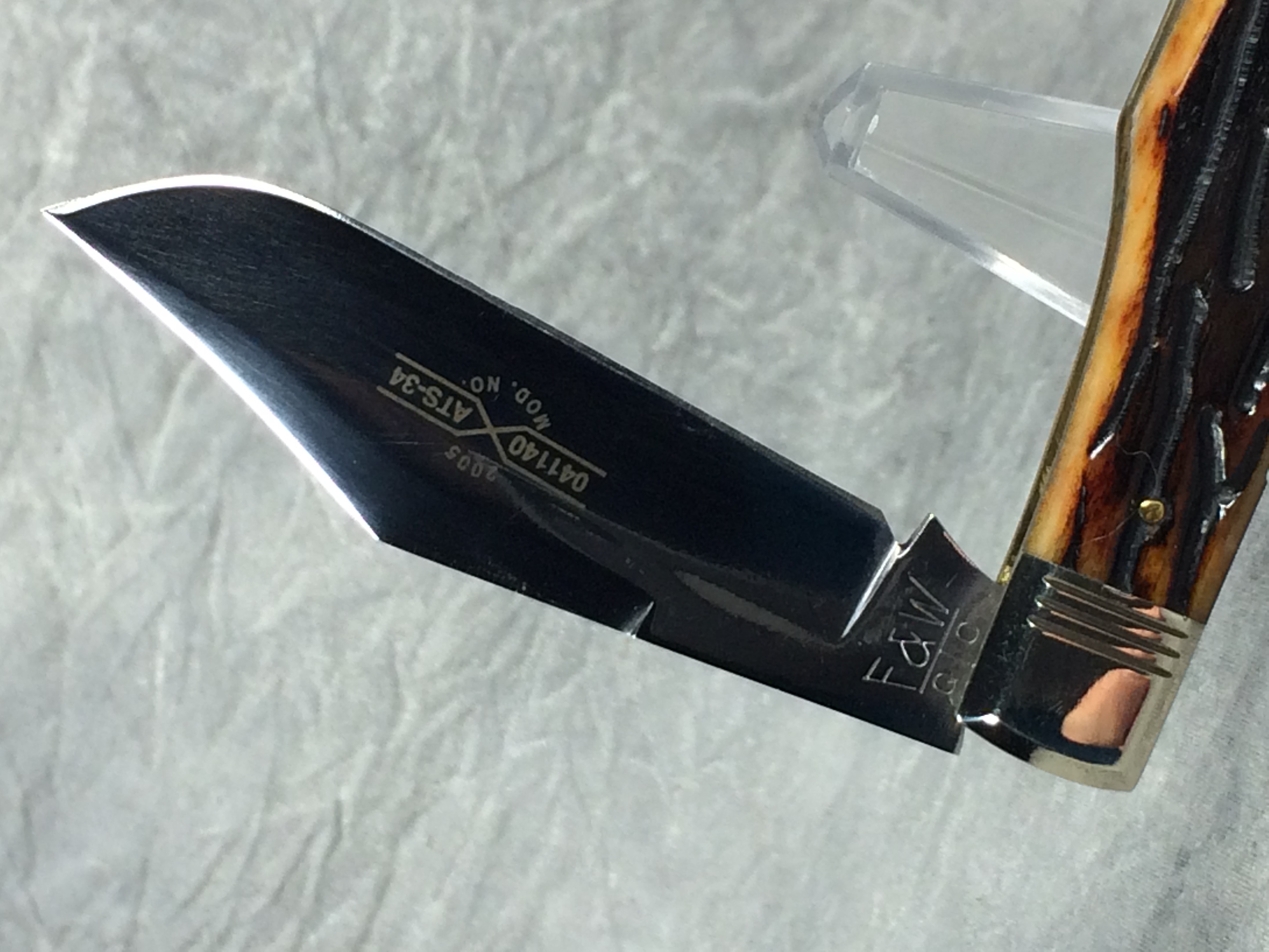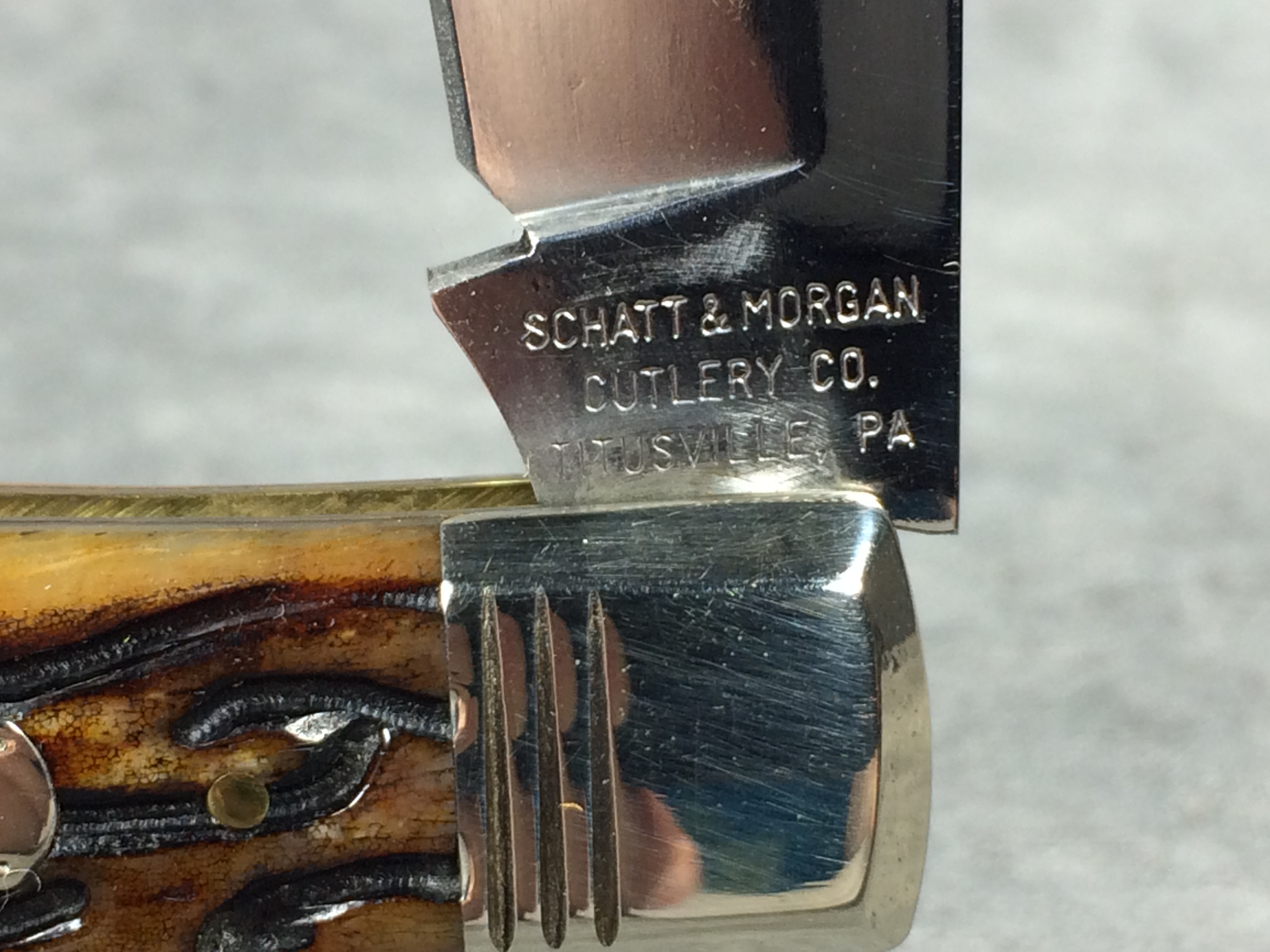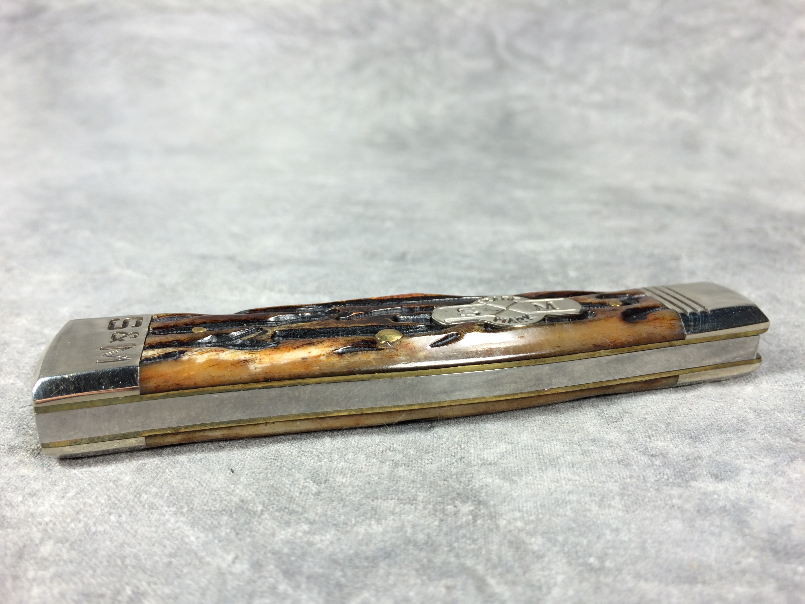 February 23, 2026 - Single-Blade Gunstock Knife. Made in USA by Queen Cutlery. File & Wire Tested Series 3. 3-1/2 inches closed. 6-3/8 inches open. "SCHATT & MORGAN CUTLERY CO. TITUSVILLE PA." and "F & W QC" tang stamps. Blade etched S & M FILE & WIRE TESTED" and "2005  041140 X ATS-34 MOD. NO.". Worm groove bone handle. Nickel Silver bolsters engraved "S & M". Brass liner. With original box.