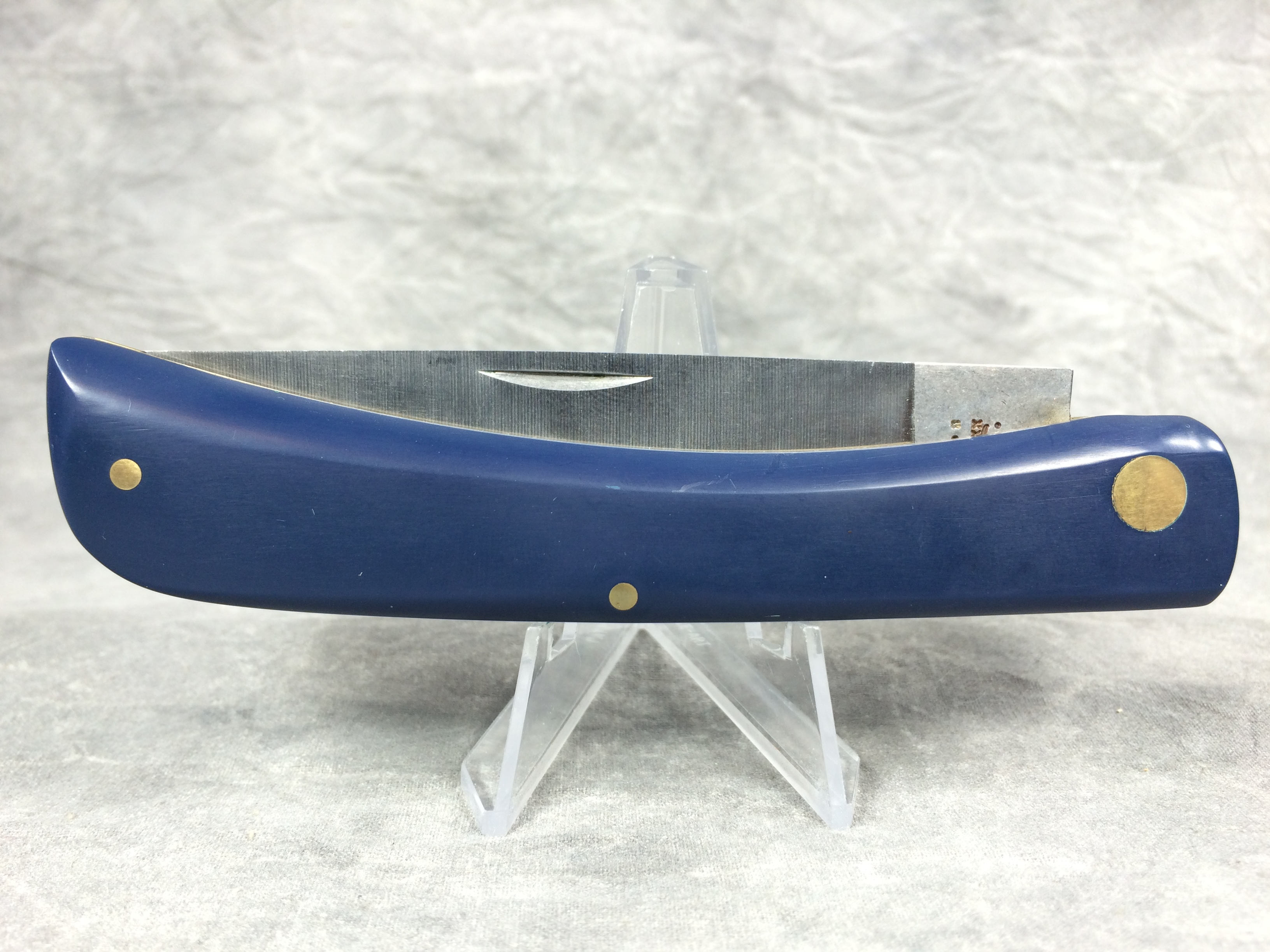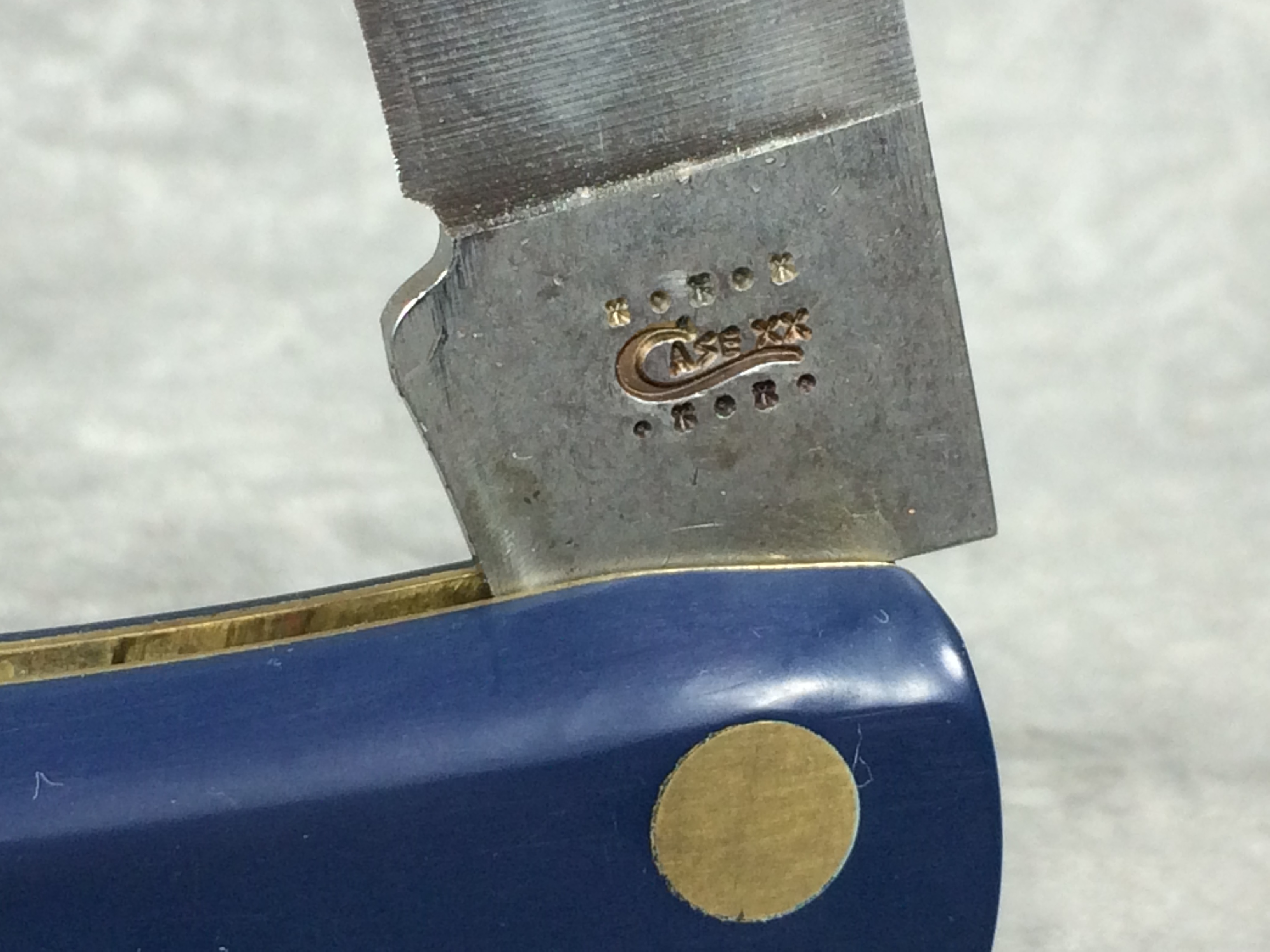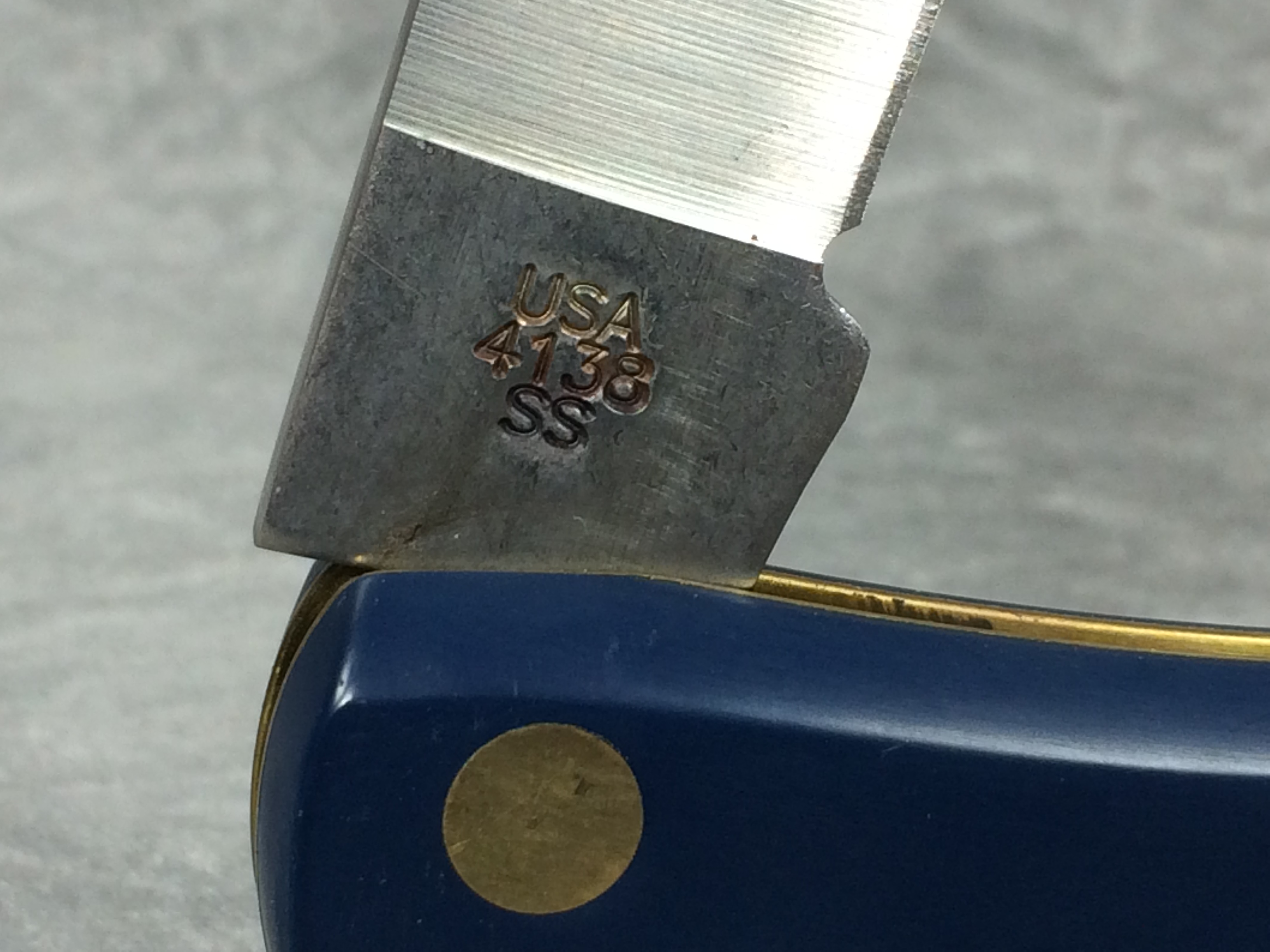 October 26, 2025 - 4-5/8 inches closed. 8-1/4 inches open. Made in USA. "  x*x*x  Case XX  *x*x*  " (with lightning bolt S) and "USA 4138 SS" tang stamps. Stainless steel blade. Navy blue composite handle. Brass liner and pins.