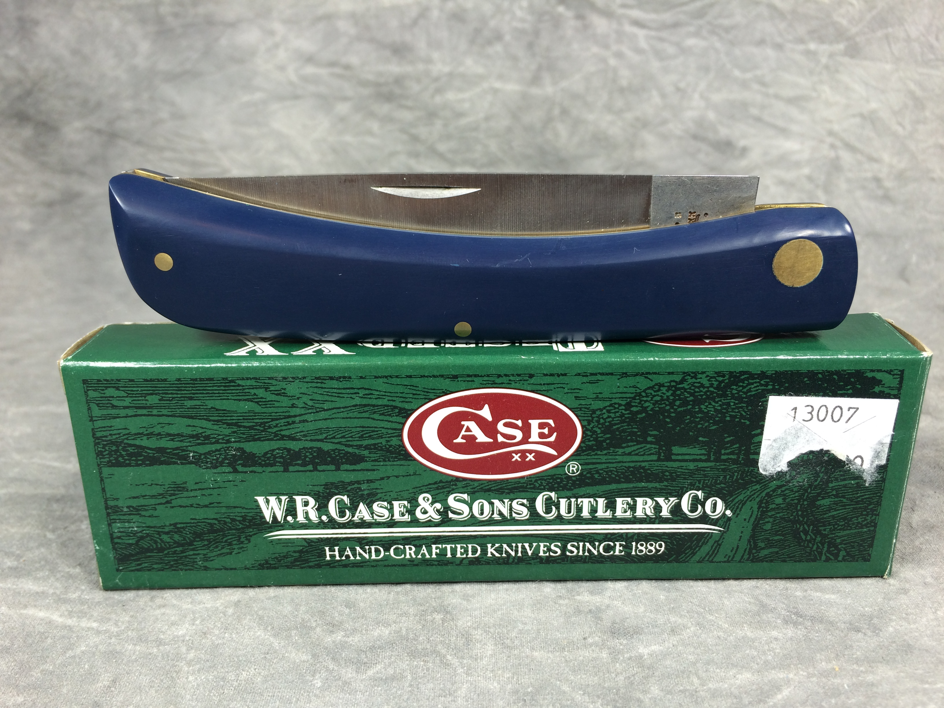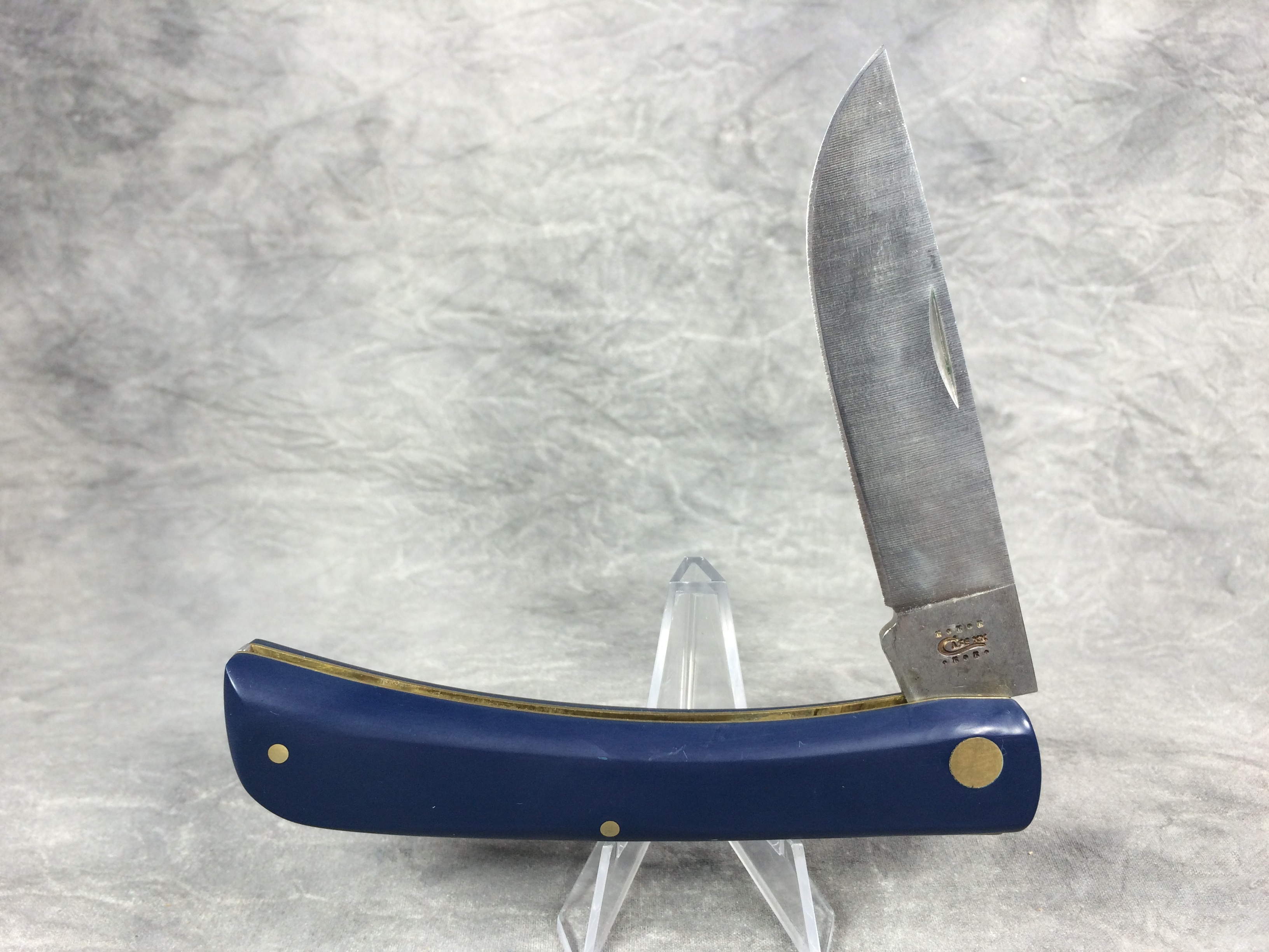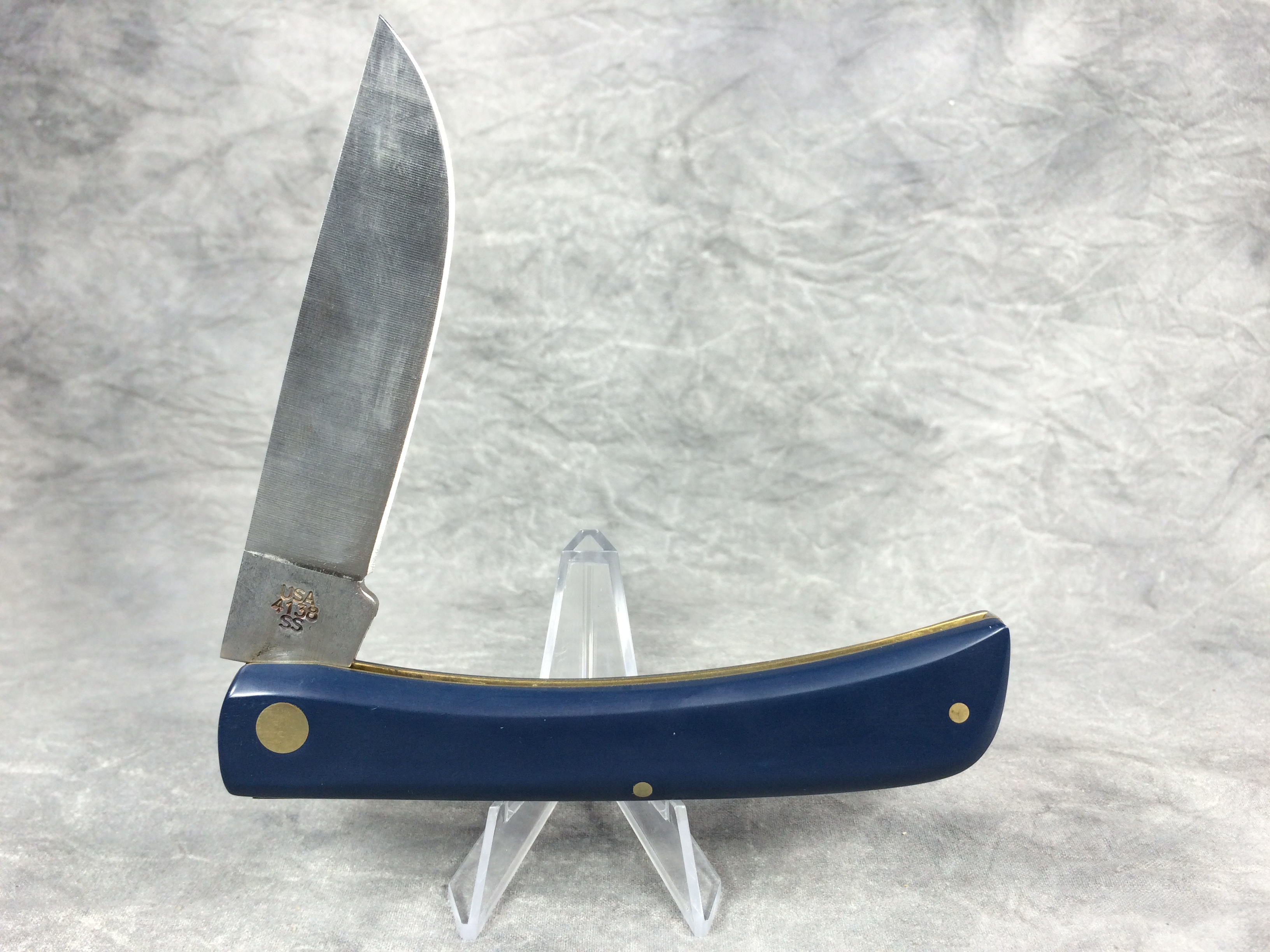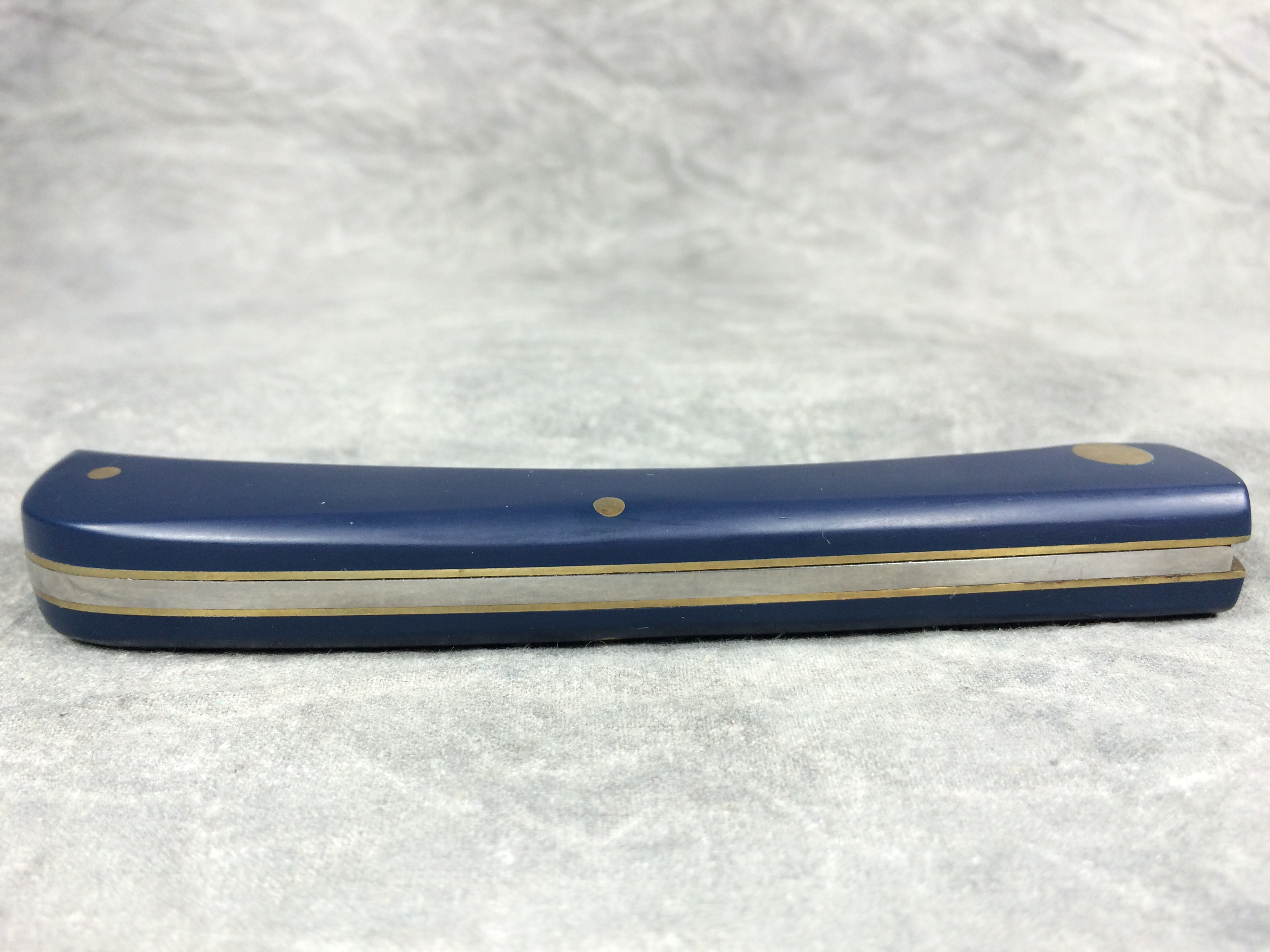 October 26, 2025 - 4-5/8 inches closed. 8-1/4 inches open. Made in USA. "  x*x*x  Case XX  *x*x*  " (with lightning bolt S) and "USA 4138 SS" tang stamps. Stainless steel blade. Navy blue composite handle. Brass liner and pins.