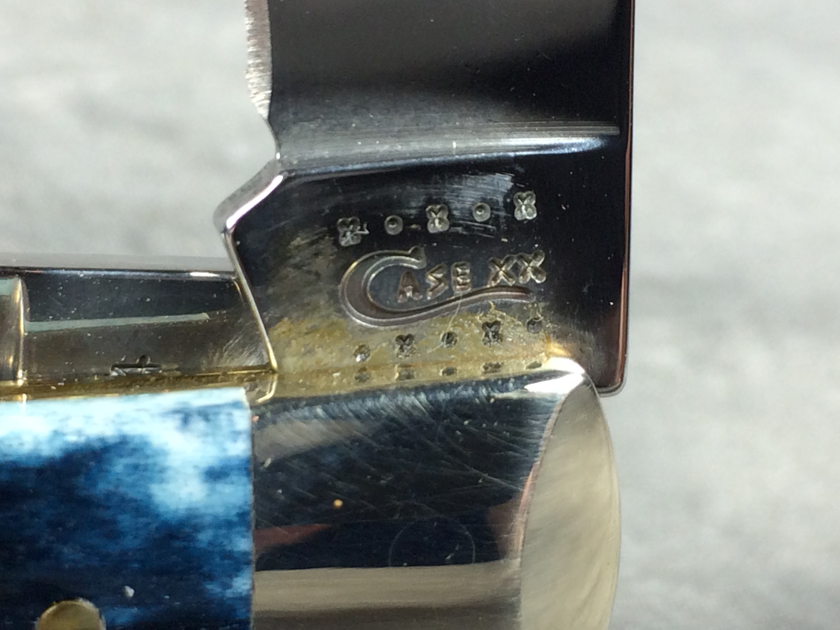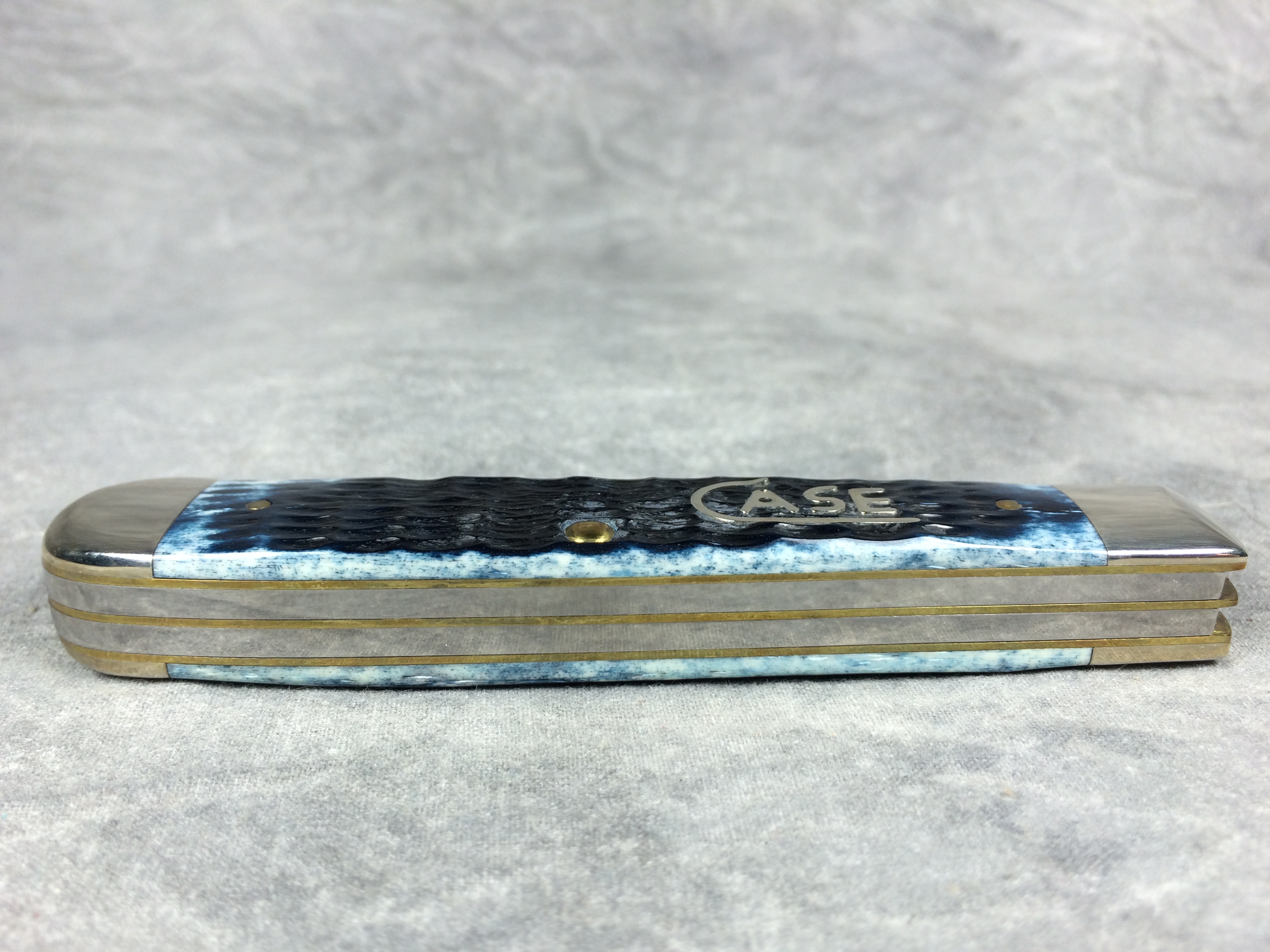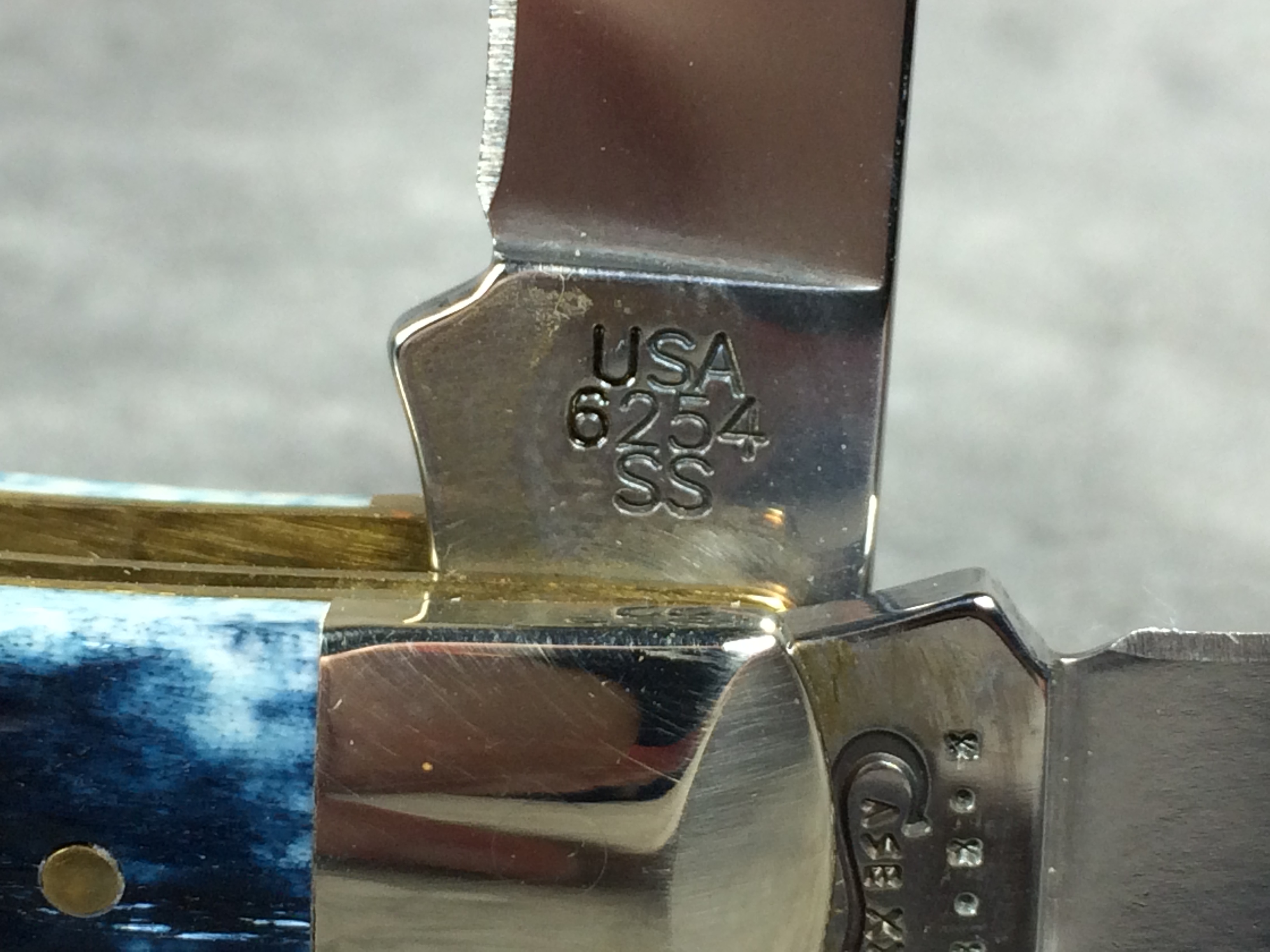 December 24, 2025 - 4-1/8 inches closed. 7-3/8 inches open. Made in USA. "  x*x*x  Case XX  *x*x*  " (with lightning bolt S) and "USA 6254 SS" tang stamps. Silver script "CASE" letter shield. Stainless Steel blades. Blue jigged bone handles. Nickel Silver bolsters. Brass liner. With box (dated 12/14/09) and paperwork.