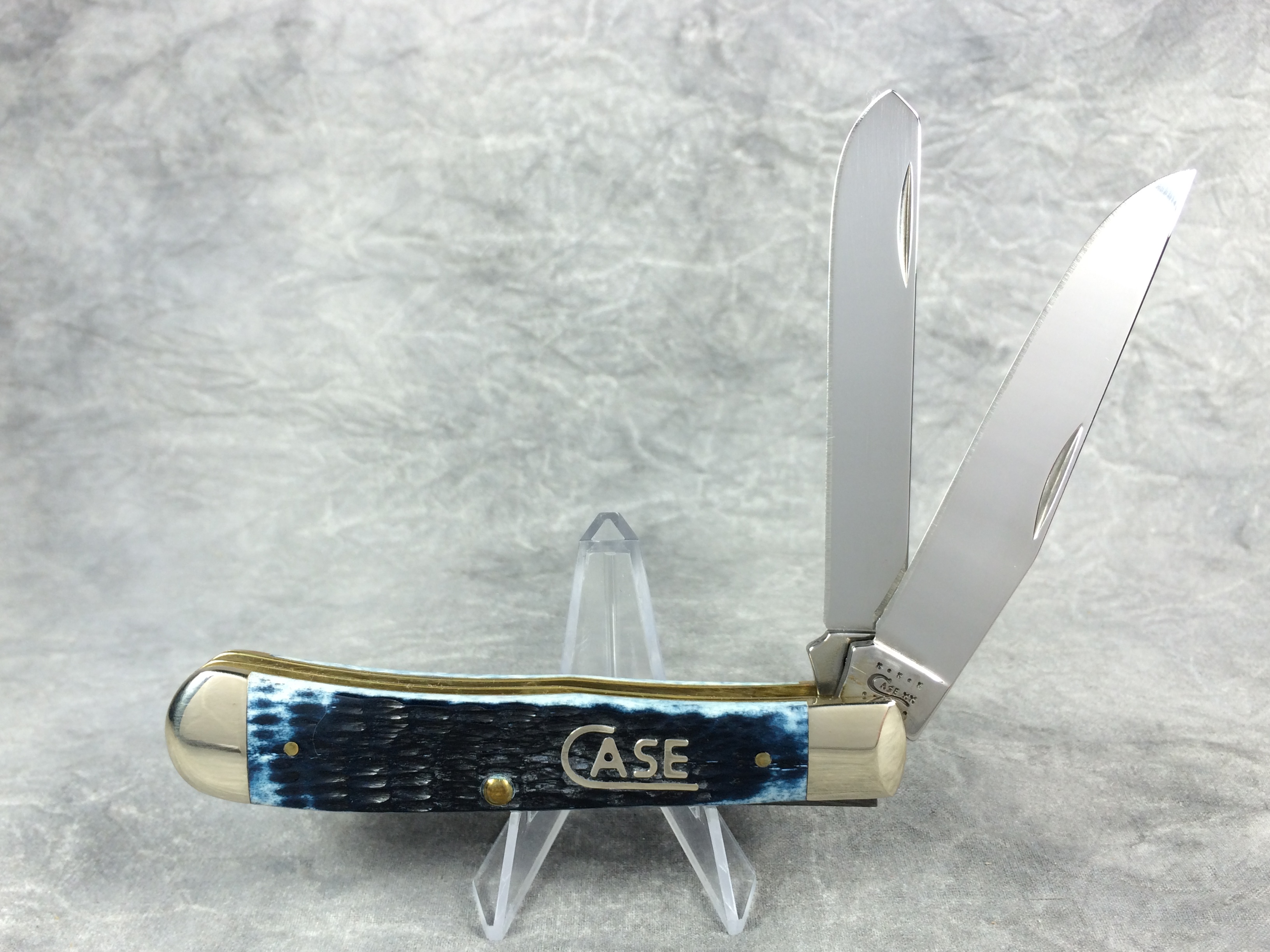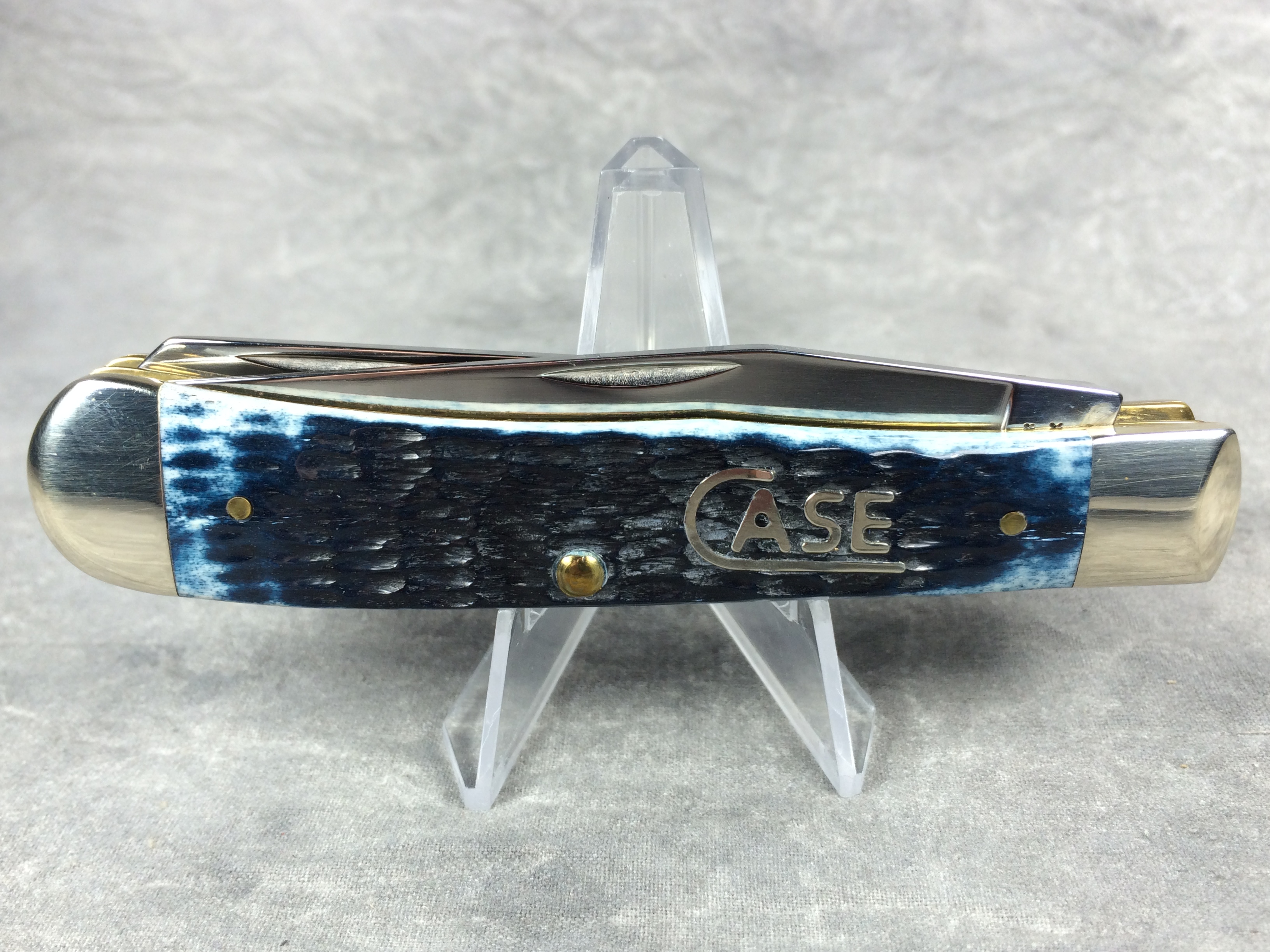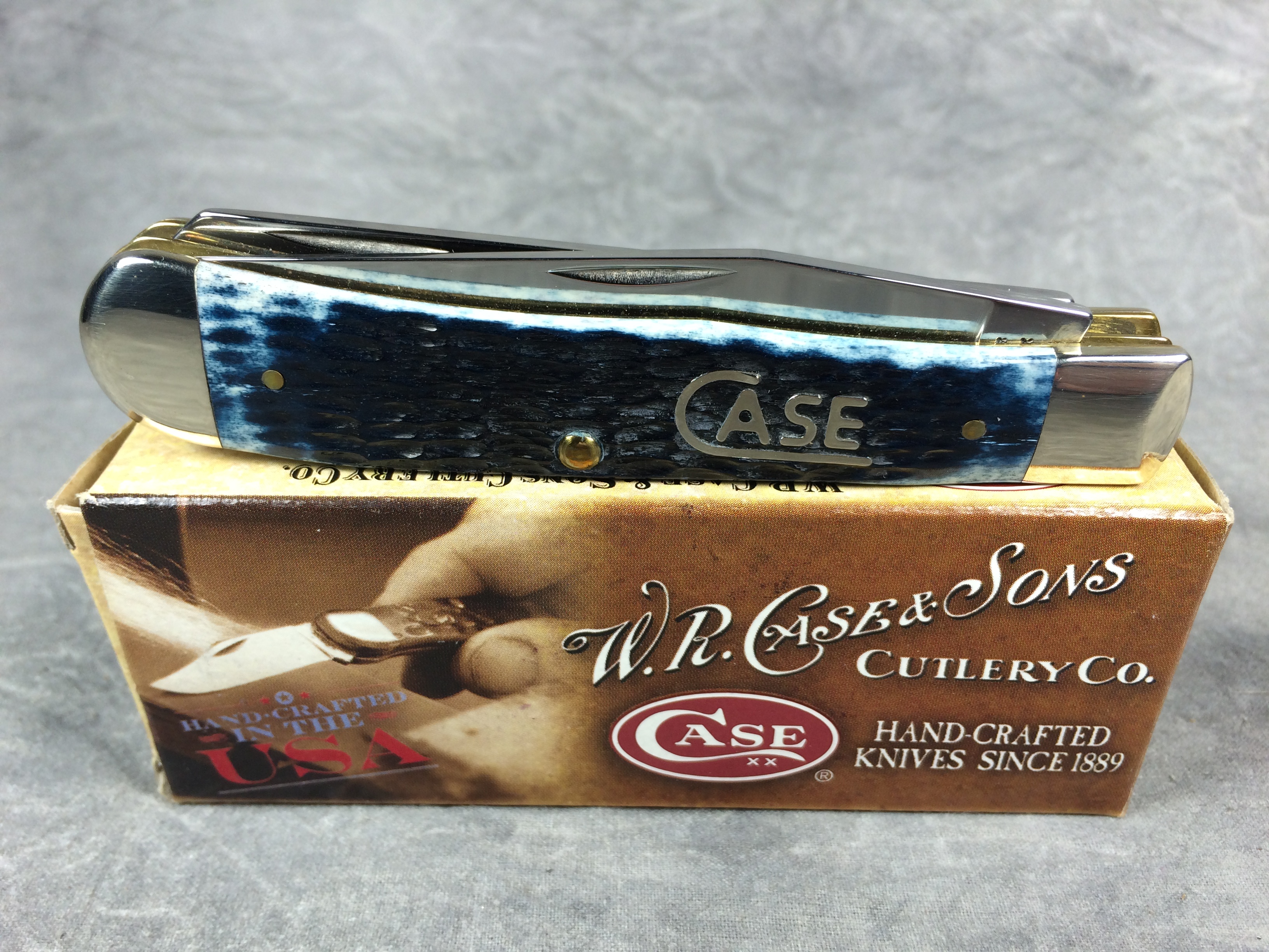 December 24, 2025 - 4-1/8 inches closed. 7-3/8 inches open. Made in USA. "  x*x*x  Case XX  *x*x*  " (with lightning bolt S) and "USA 6254 SS" tang stamps. Silver script "CASE" letter shield. Stainless Steel blades. Blue jigged bone handles. Nickel Silver bolsters. Brass liner. With box (dated 12/14/09) and paperwork.