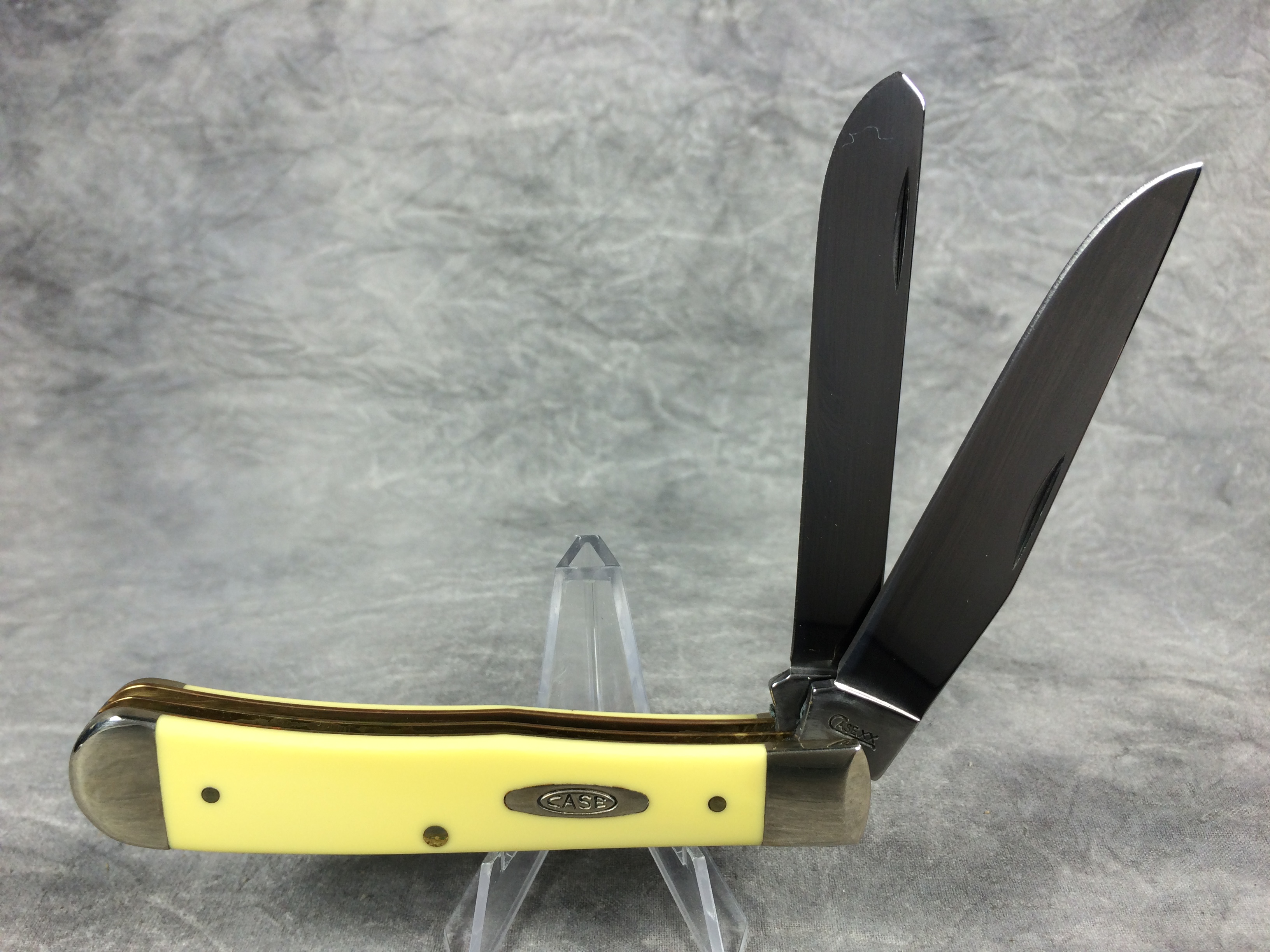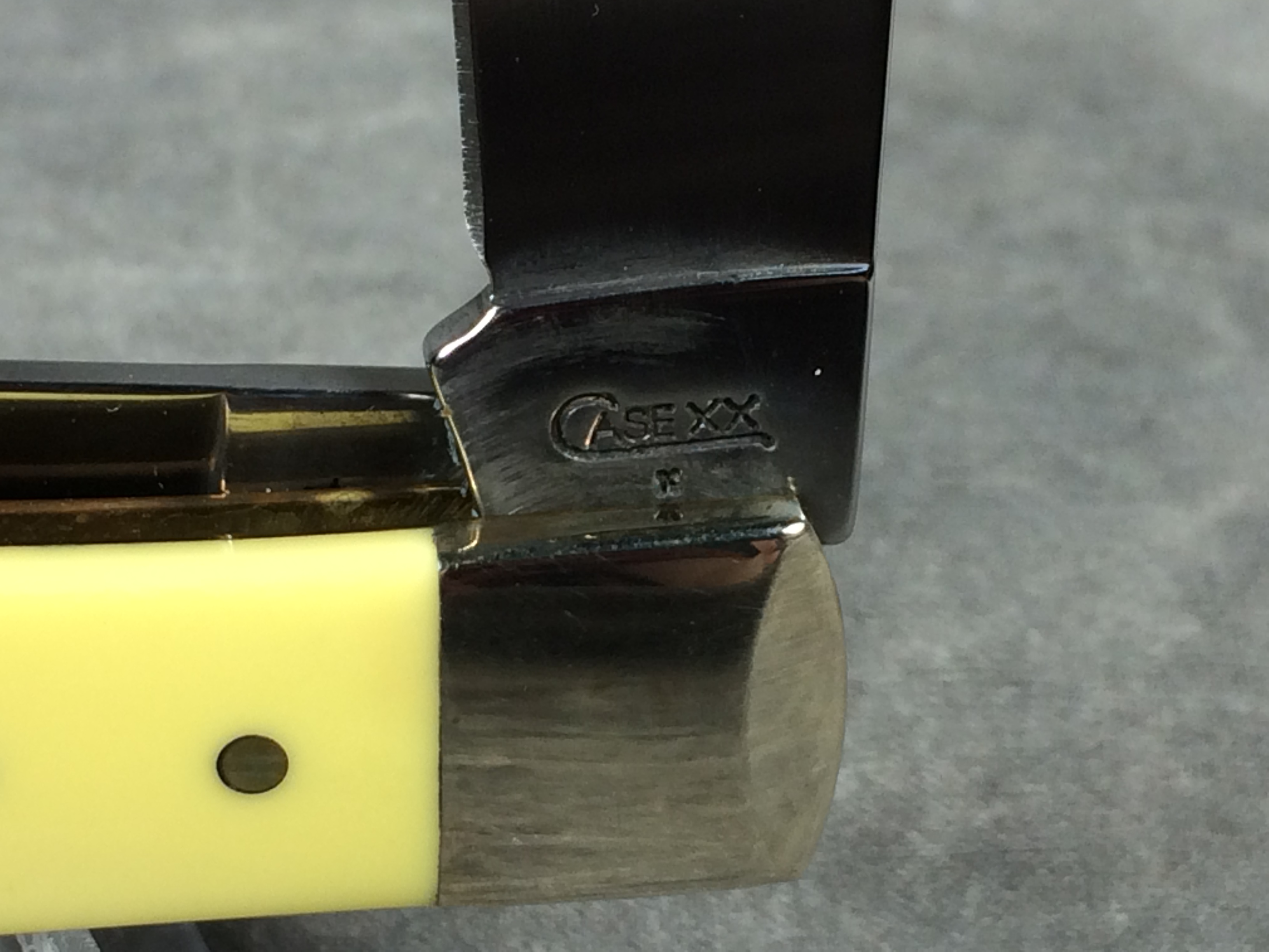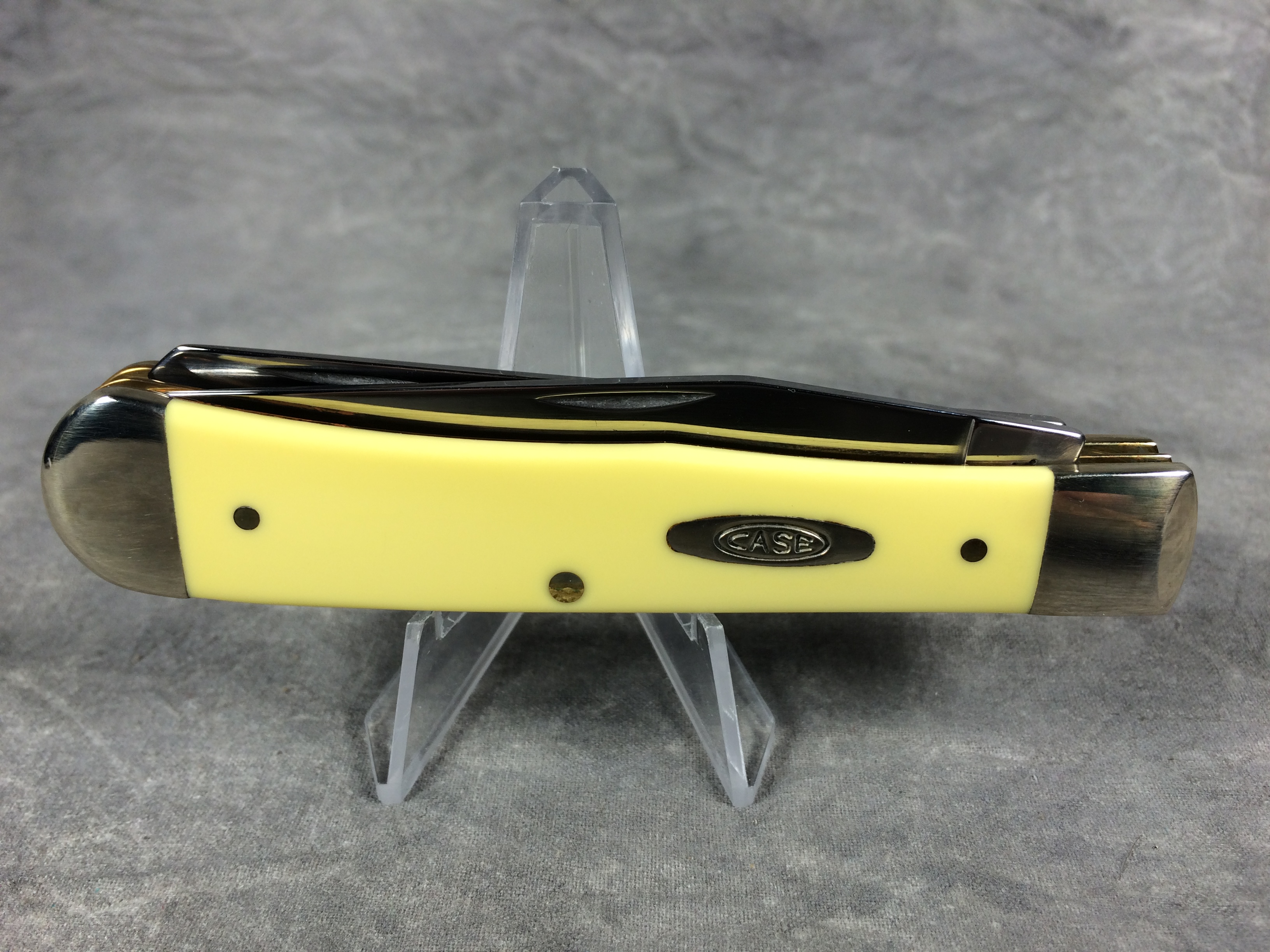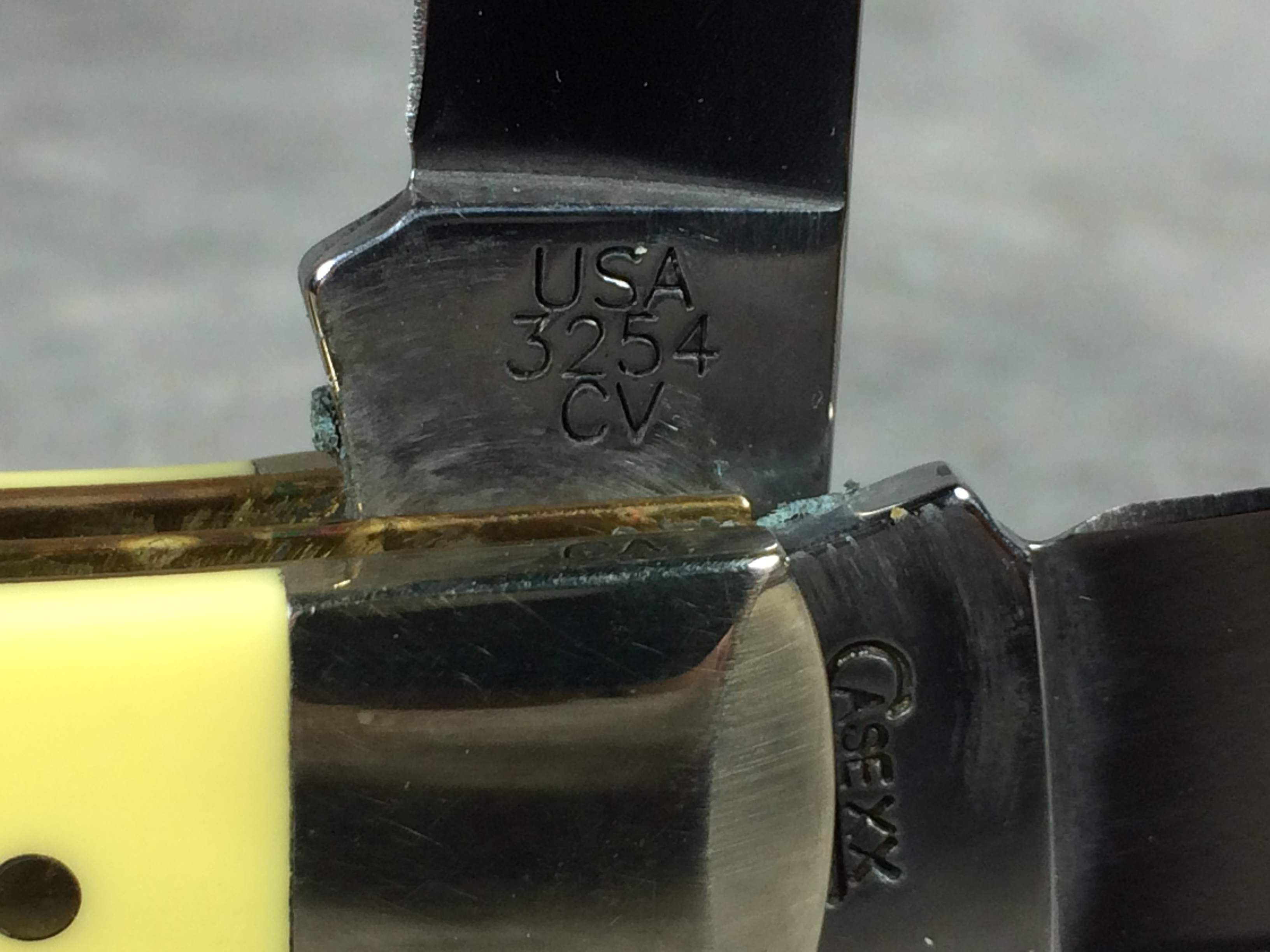 December 04, 2025 - 4-1/8 inches closed. 7-3/8 inches open. Made in USA. "     Case XX    x   " and "USA 3254 CV" tang stamps. Double oval "open C" CASE shield. Chrome vanadium blades. Yellow composite handle. Nickel Silver bolsters. Brass liner.