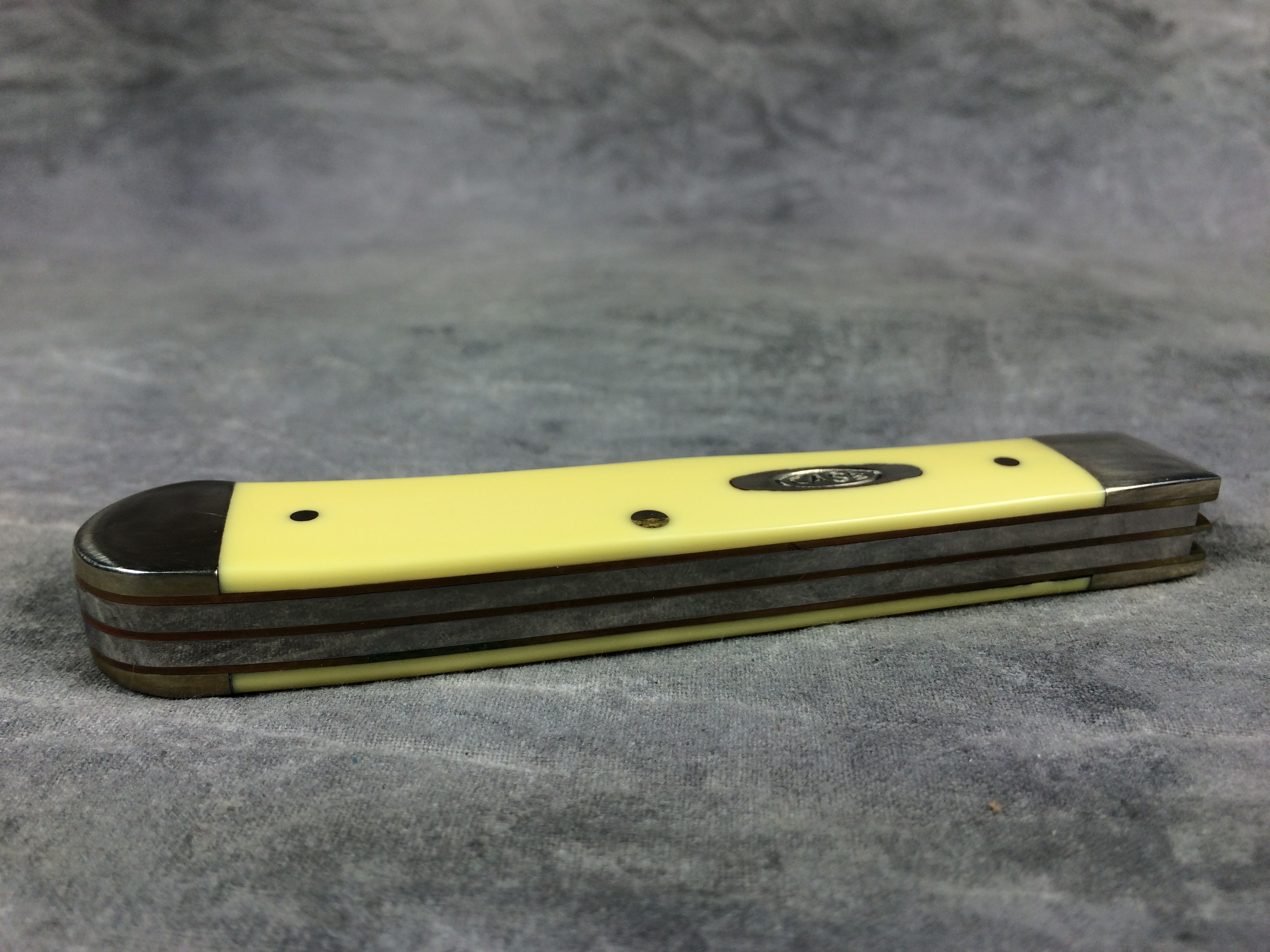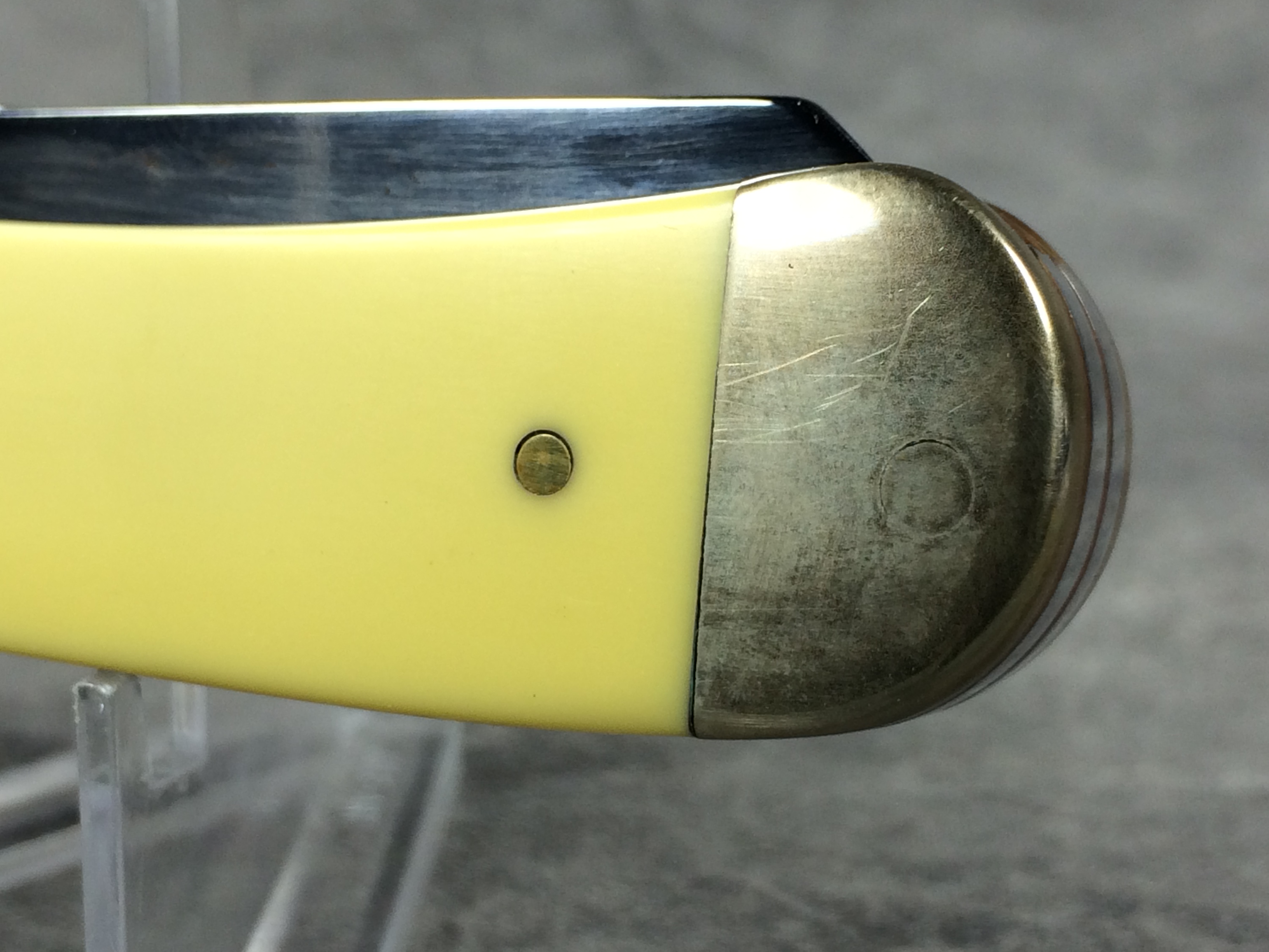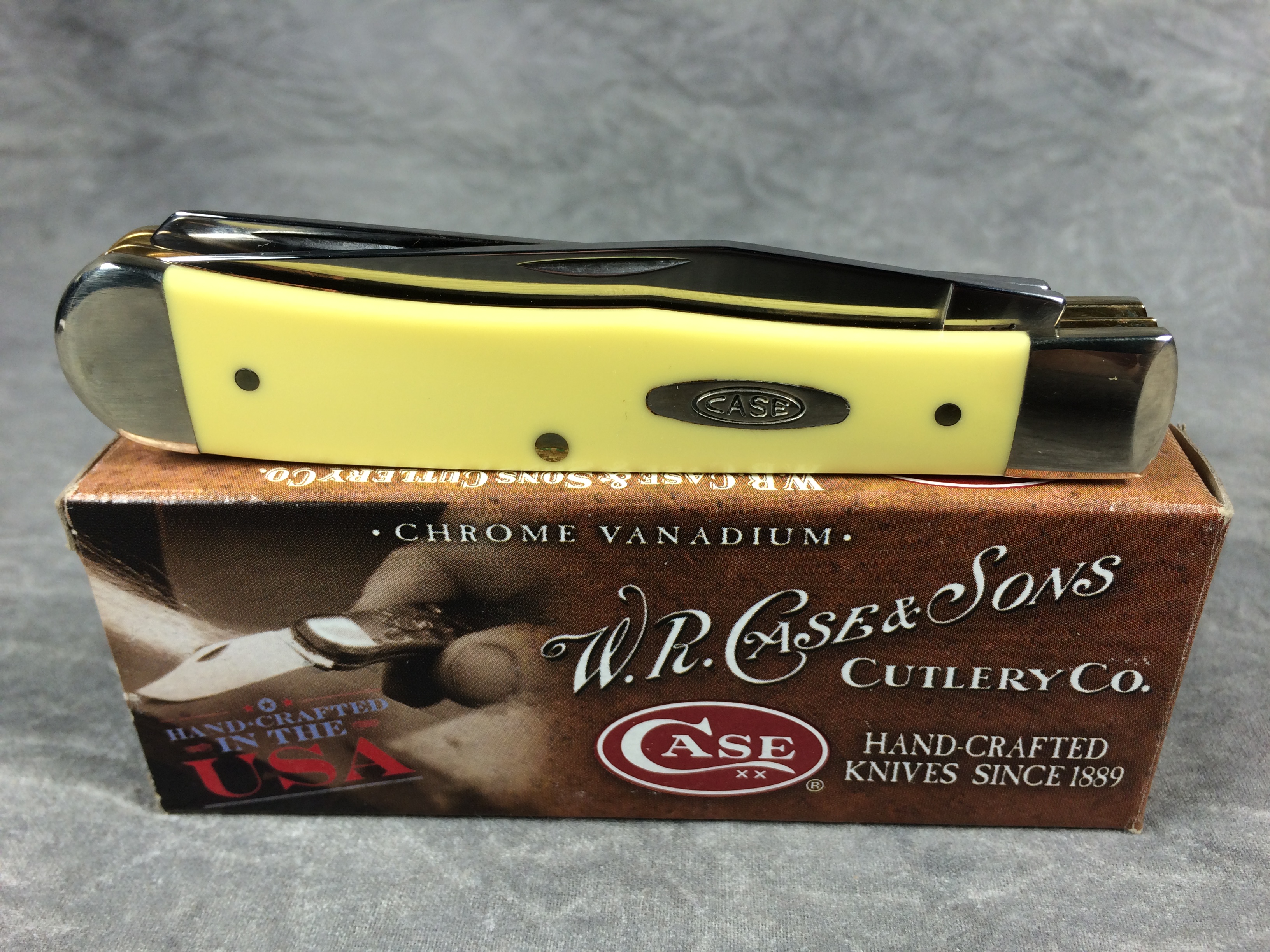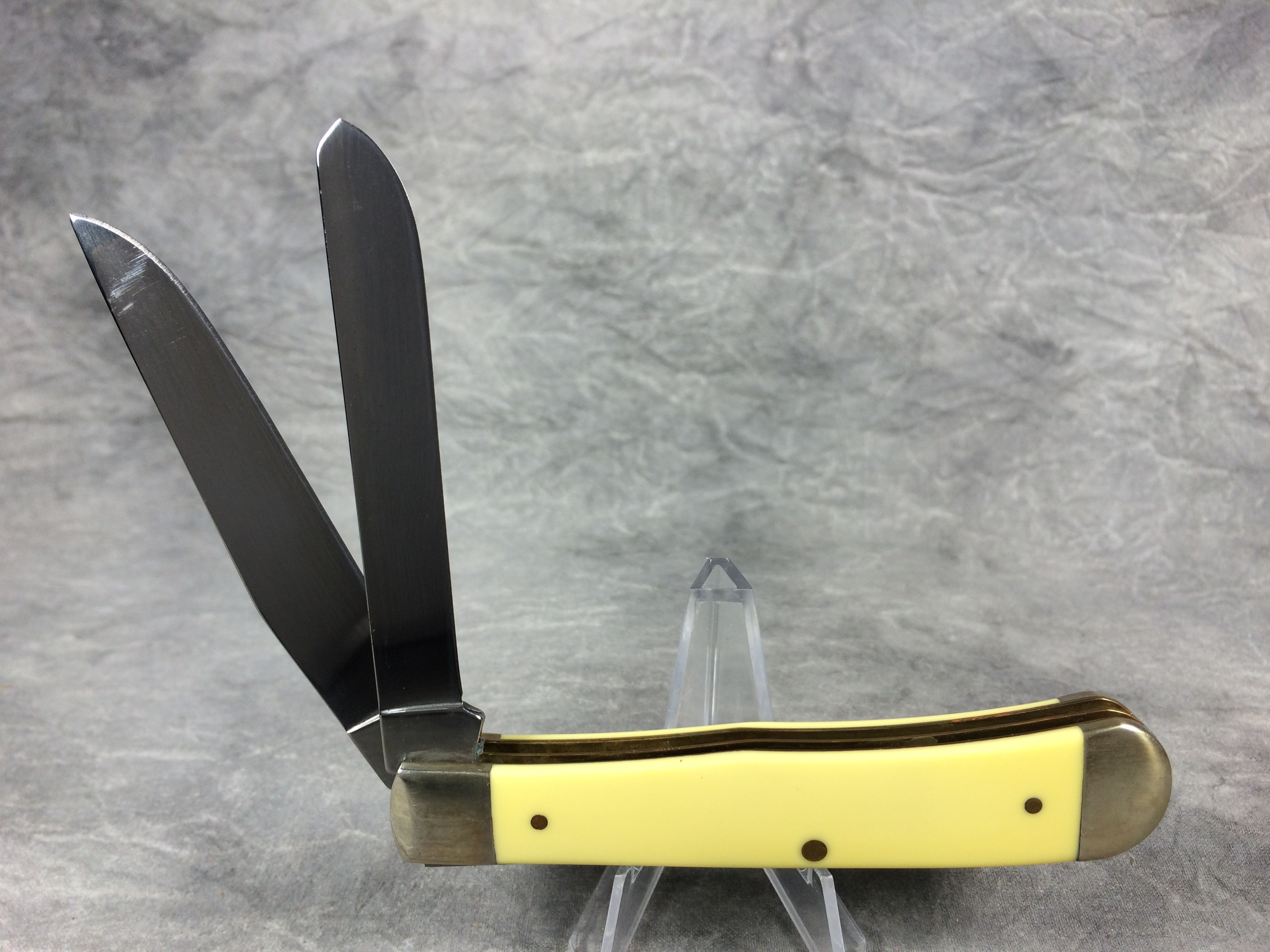 December 04, 2025 - 4-1/8 inches closed. 7-3/8 inches open. Made in USA. "     Case XX    x   " and "USA 3254 CV" tang stamps. Double oval "open C" CASE shield. Chrome vanadium blades. Yellow composite handle. Nickel Silver bolsters. Brass liner.