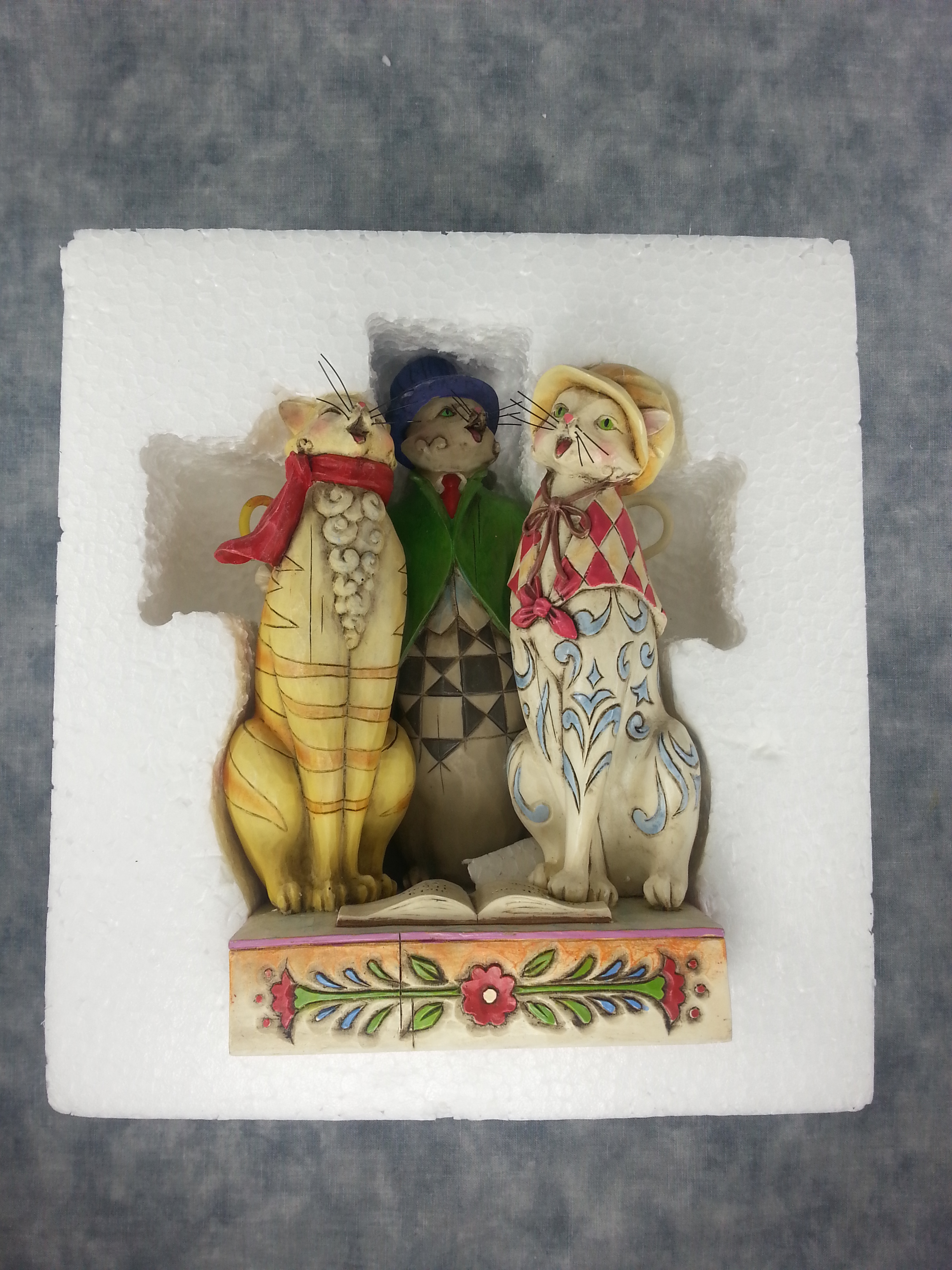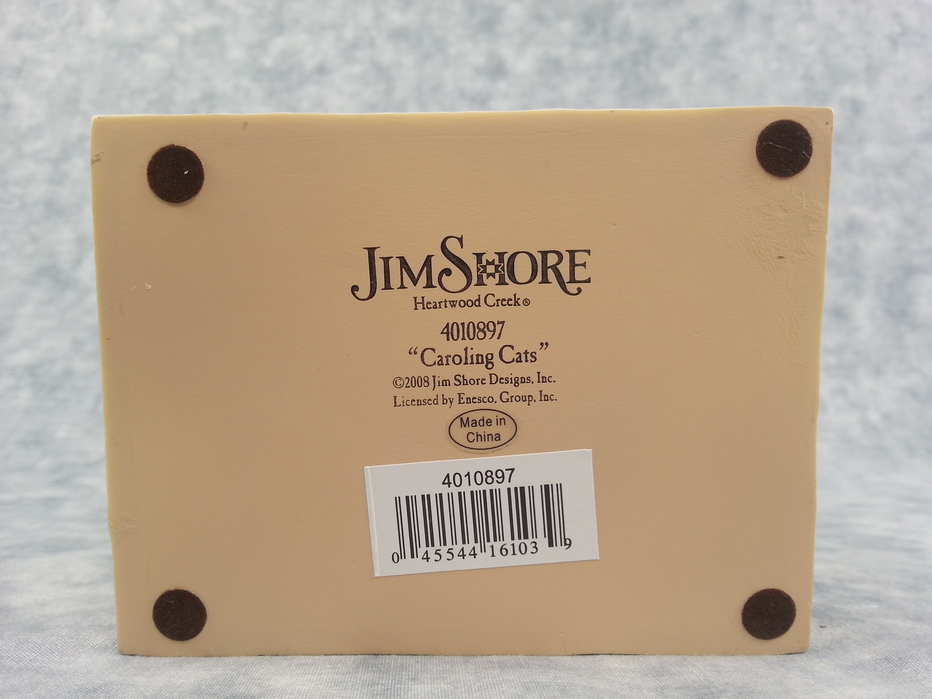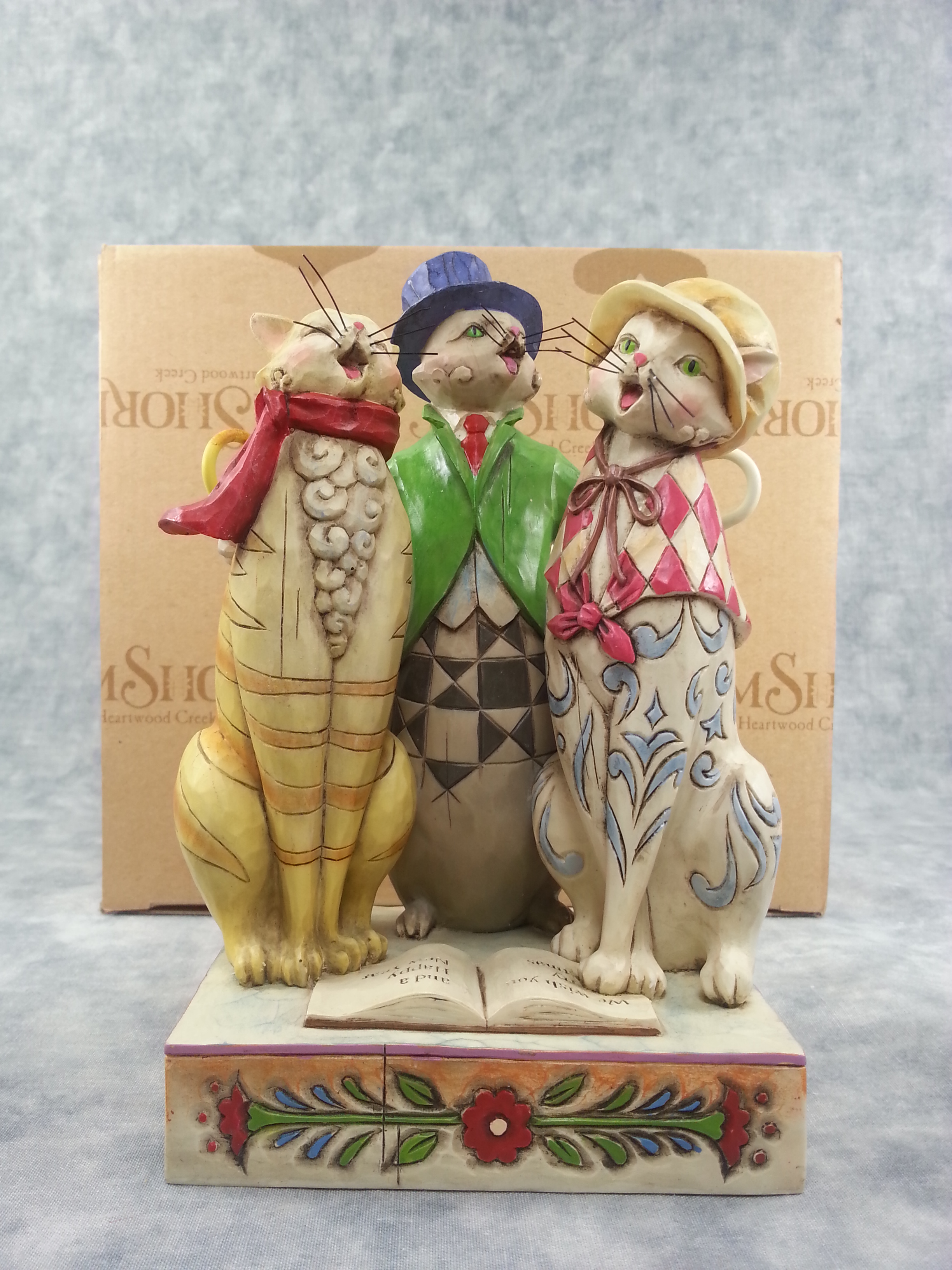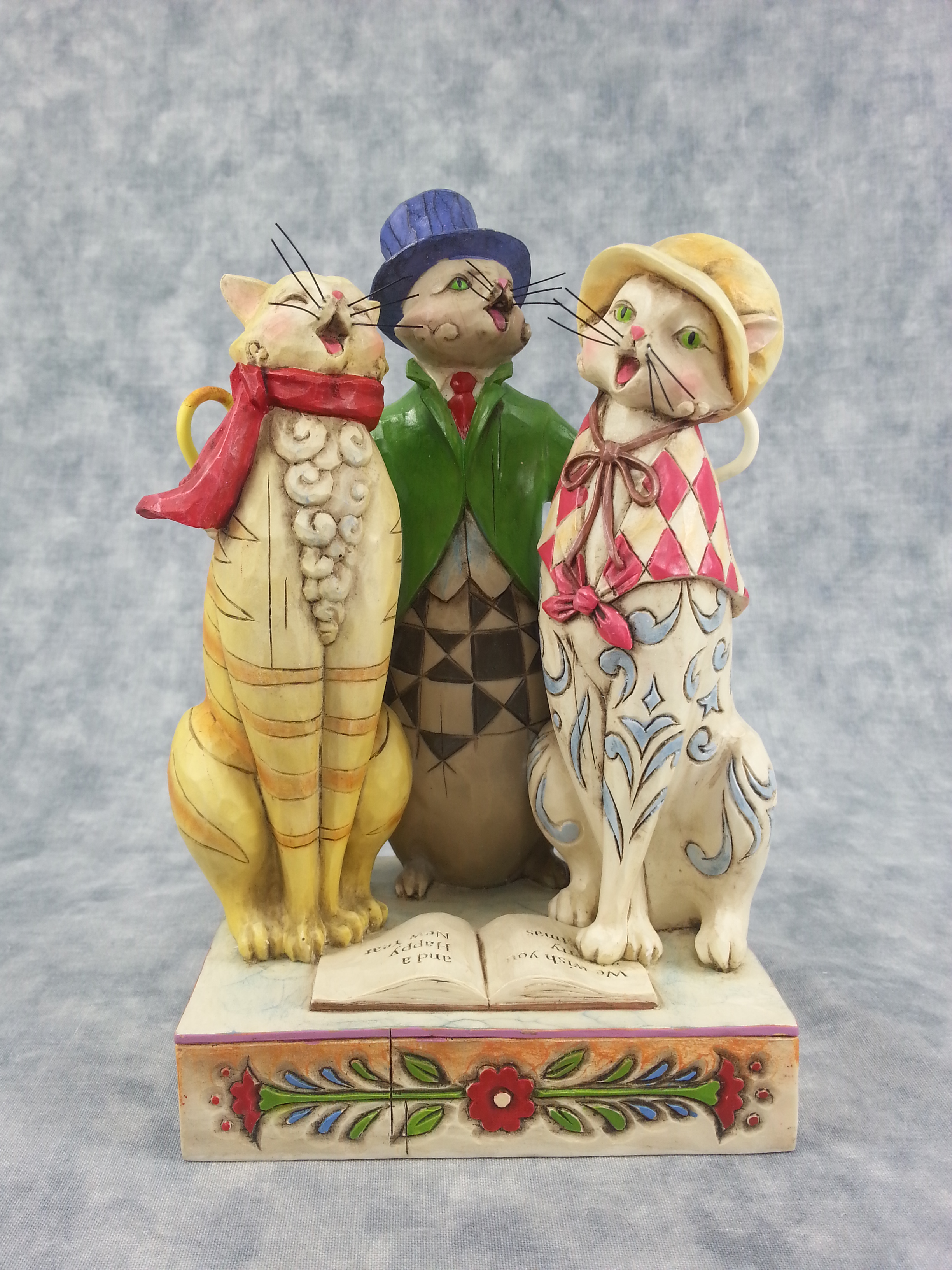 December 04, 2025 - Heartwood Creek Collection. Three Caroling Cats Figurine. Sculpted in stone resin. Designed by Jim Shore. Produced by Enesco. 6-3/4 inches tall. 4-3/4 inches wide. 4 inches long.
