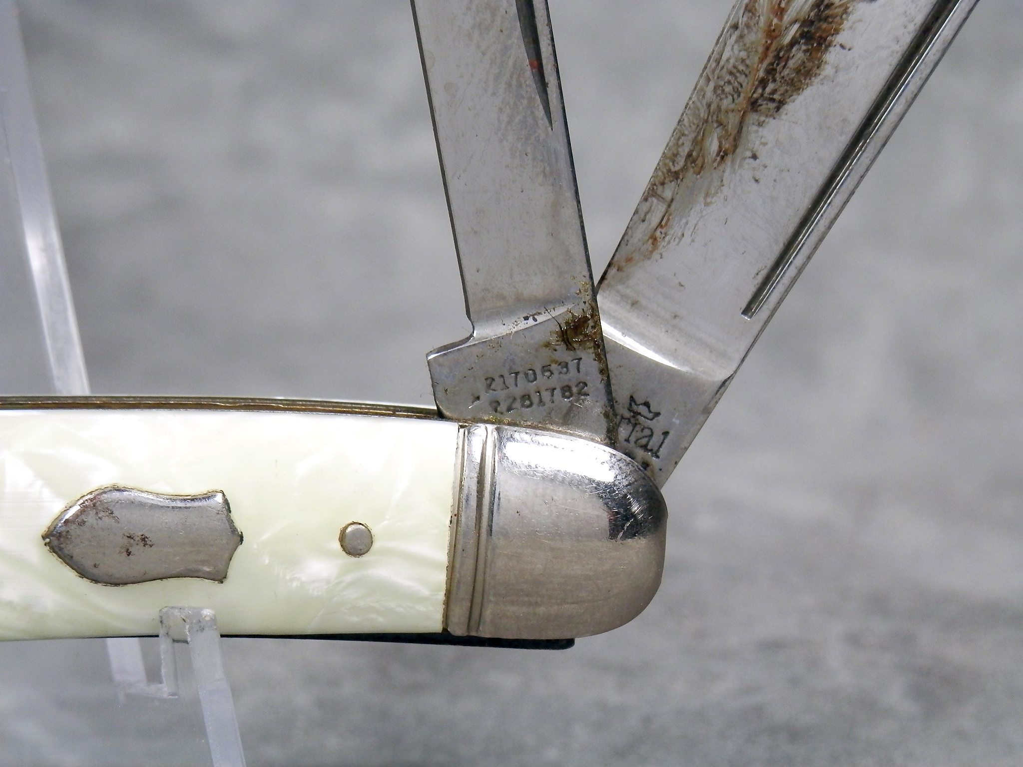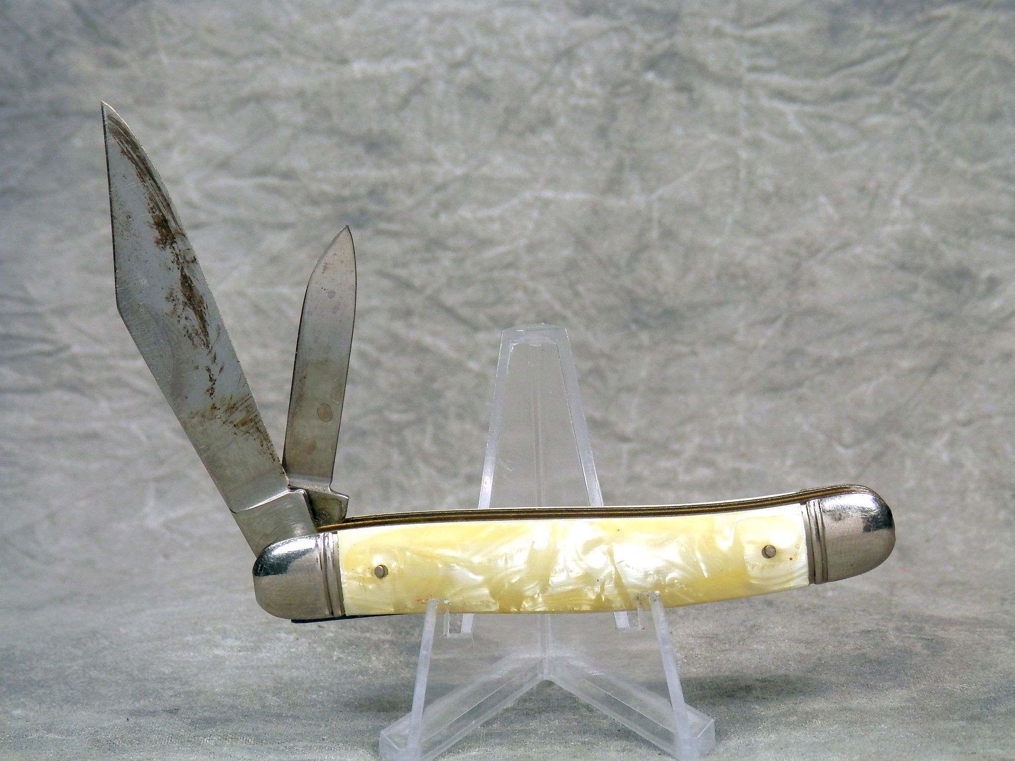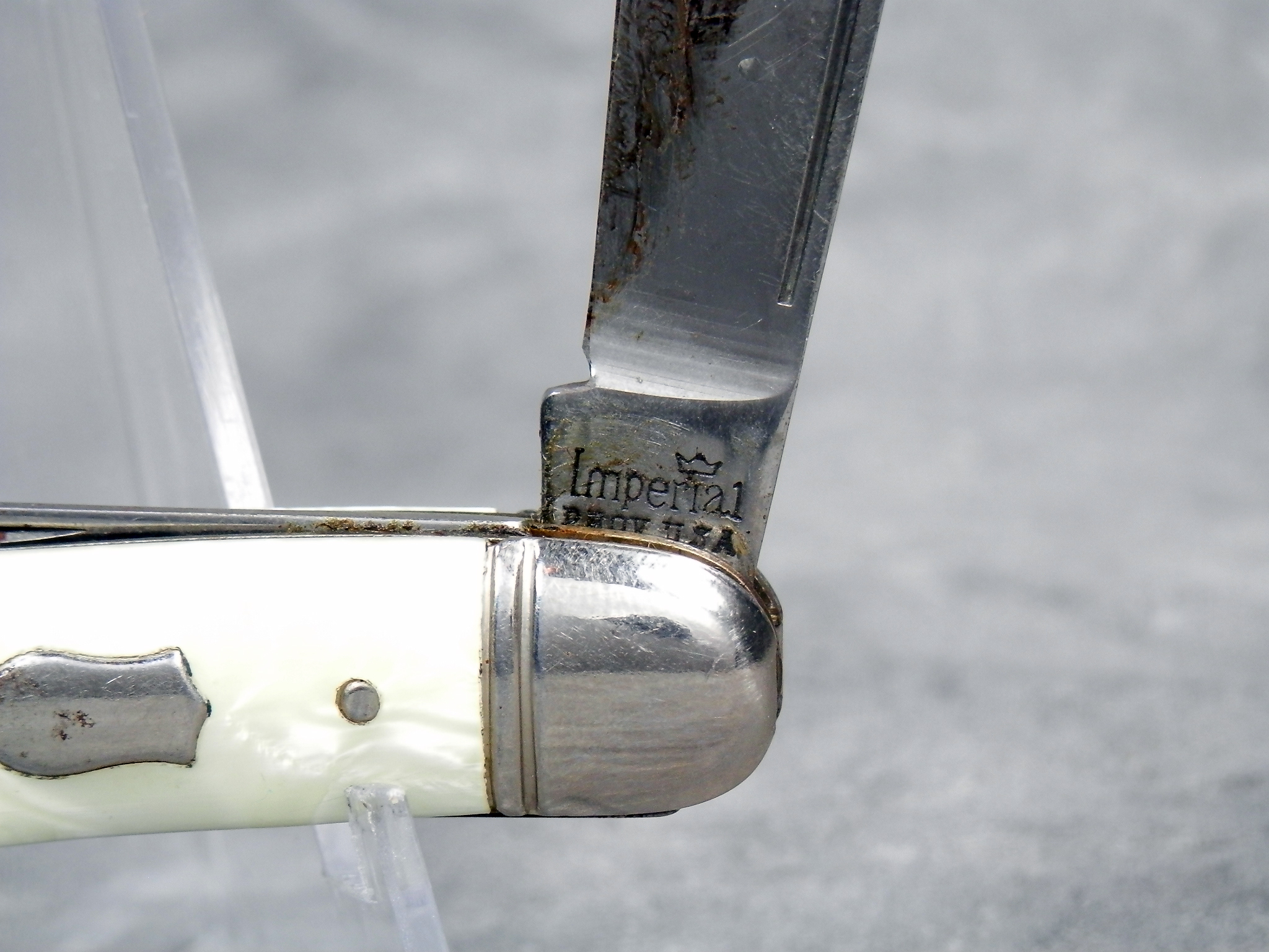 December 04, 2025 - 2-Blade Jack Knife. 3-1/4 inches closed. 5-5/8 inches open. "Imperial PROV. USA" with crown and "2170637 2231182" tang stamps. Federal shield. Pearl Swirl / Cracked Ice Celluloid handle. Brass liner.