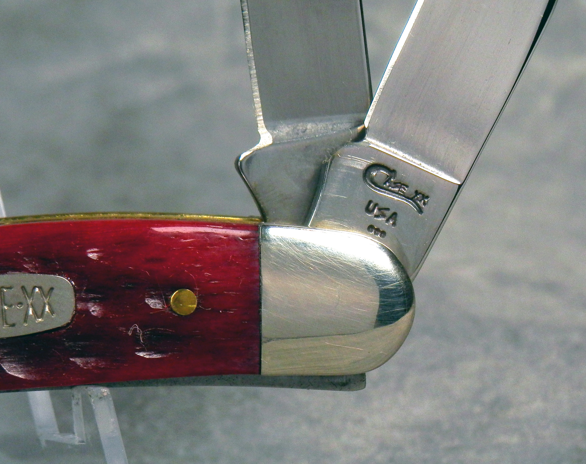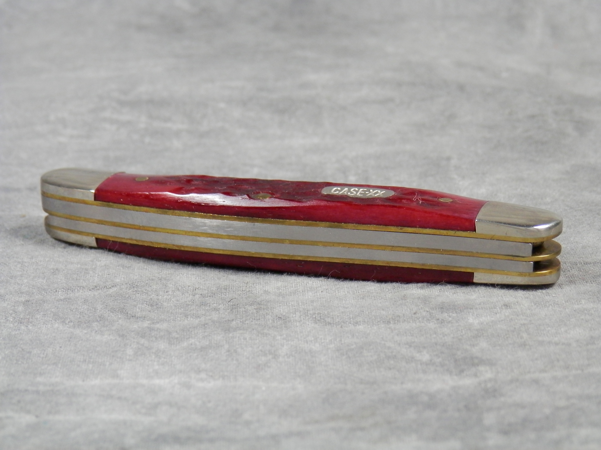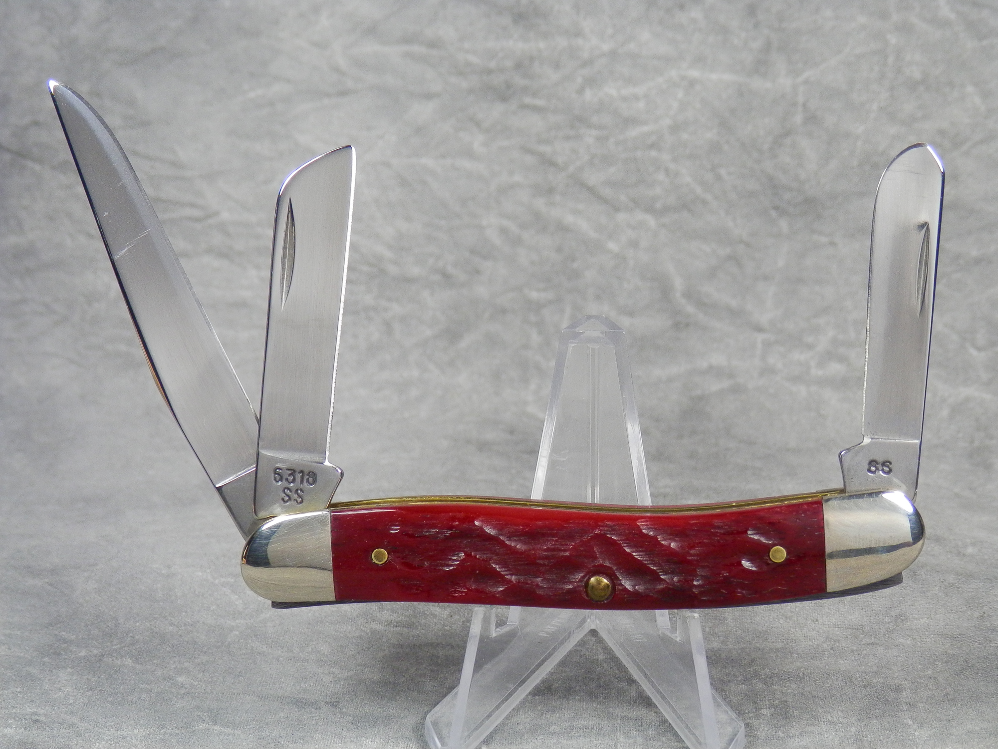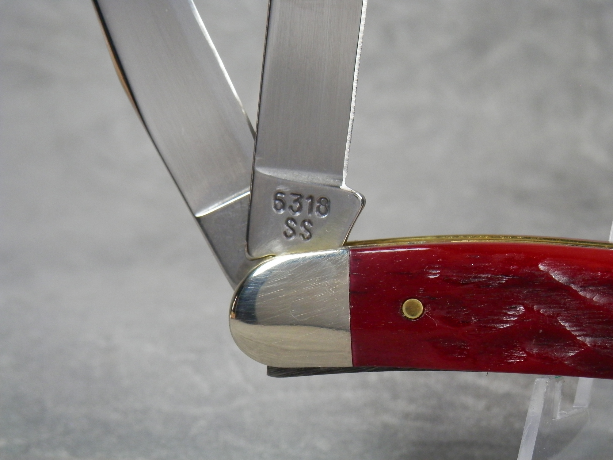 October 26, 2025 - 3-5/8 inches closed. 6-1/8 inches open. Made in USA. "CASE XX USA ***  " (3 dot with lightning bolt S), "SS", and "6318 SS" tang stamps. Oval "CASE-XX" shield. Stainless steel blades. Jigged Red Bone handle. Nickel Silver bolsters. Brass liner.