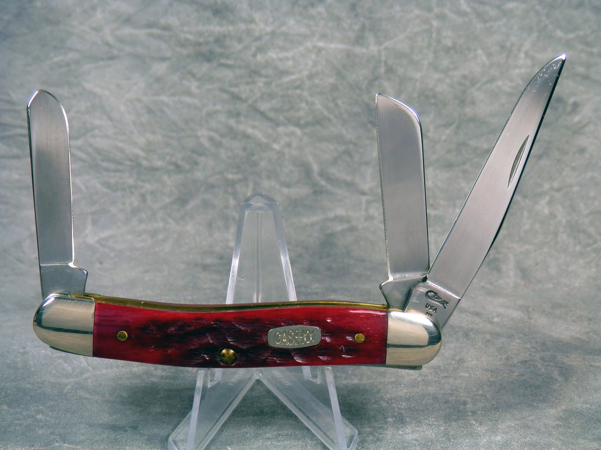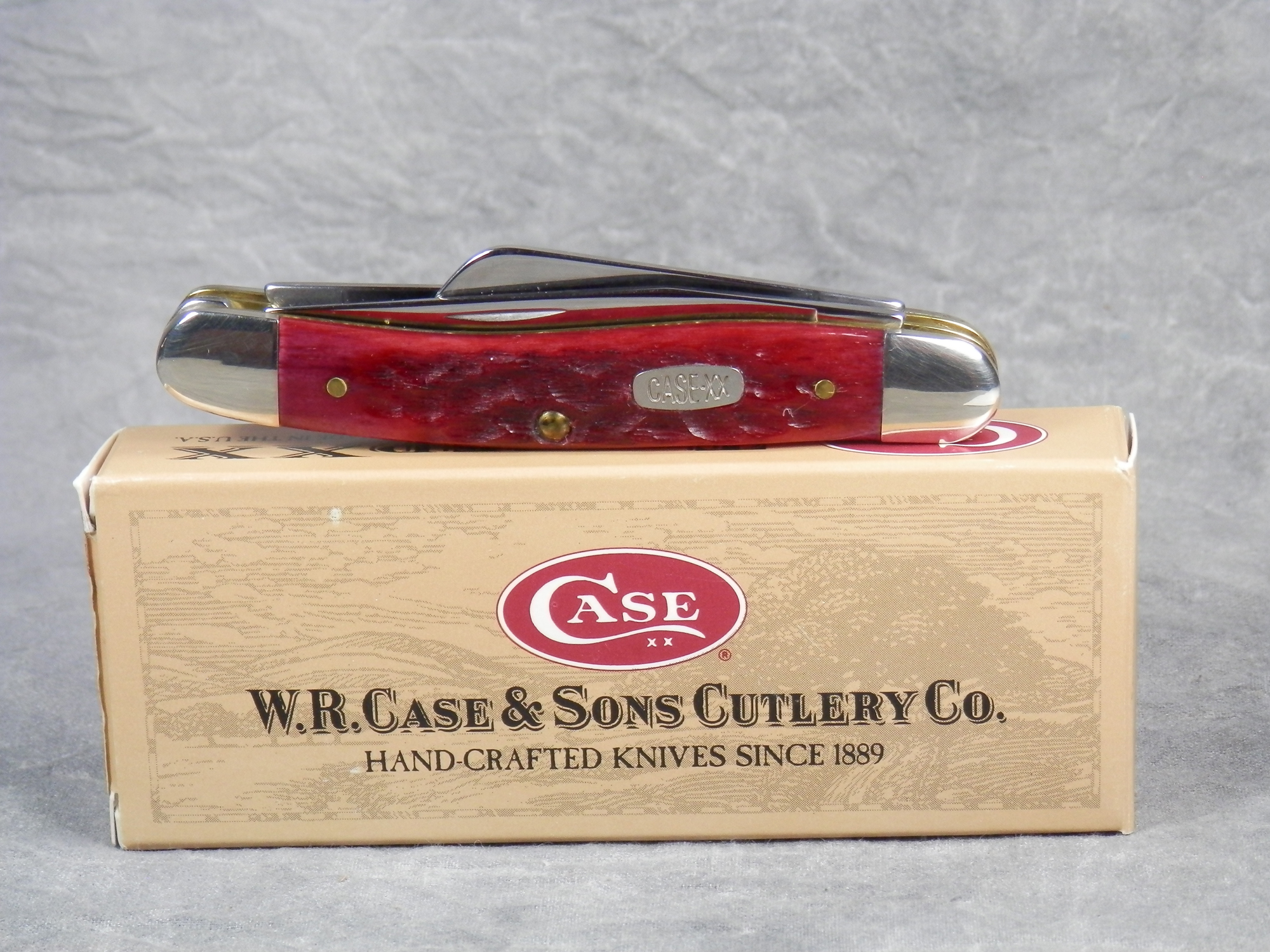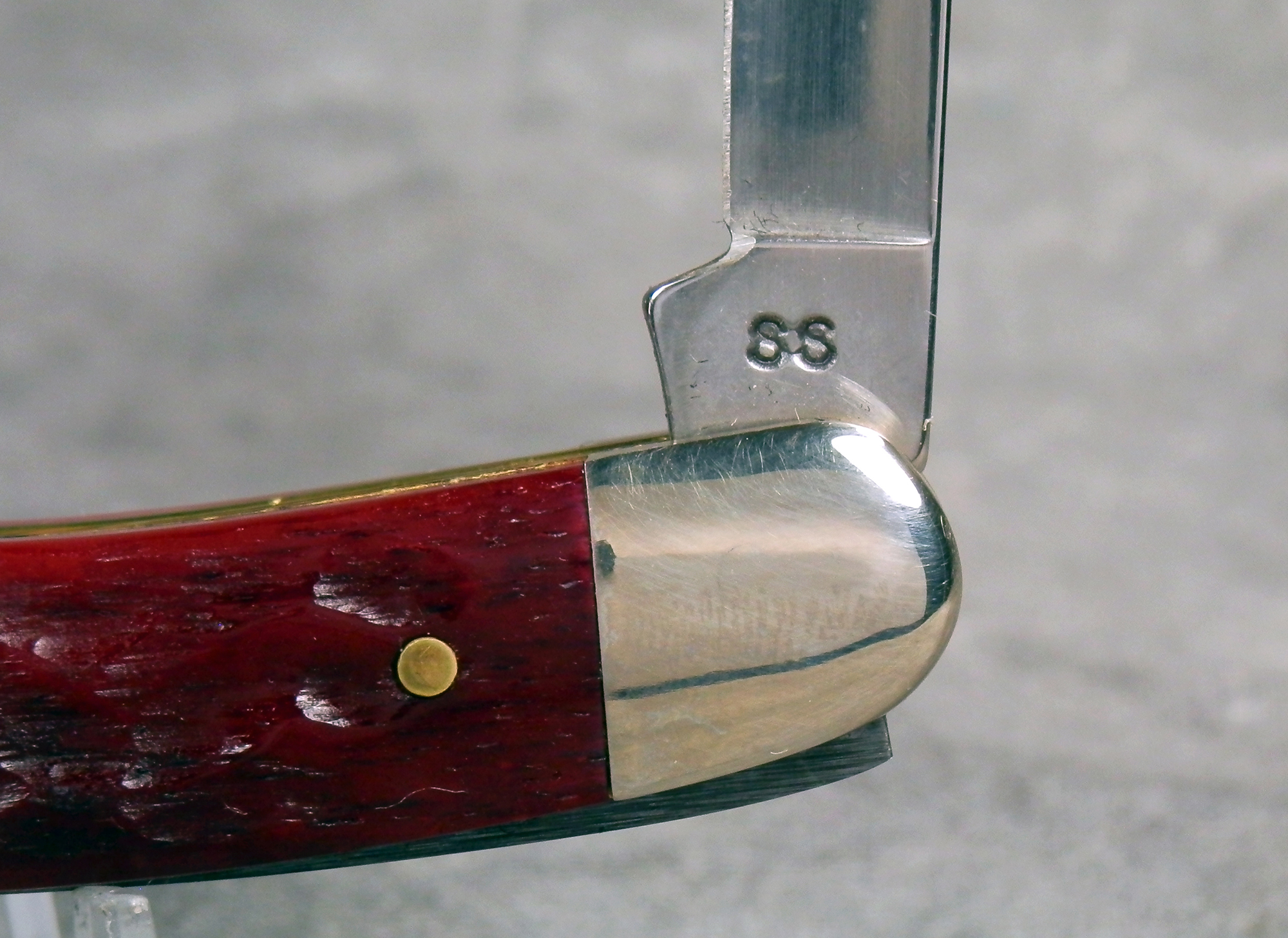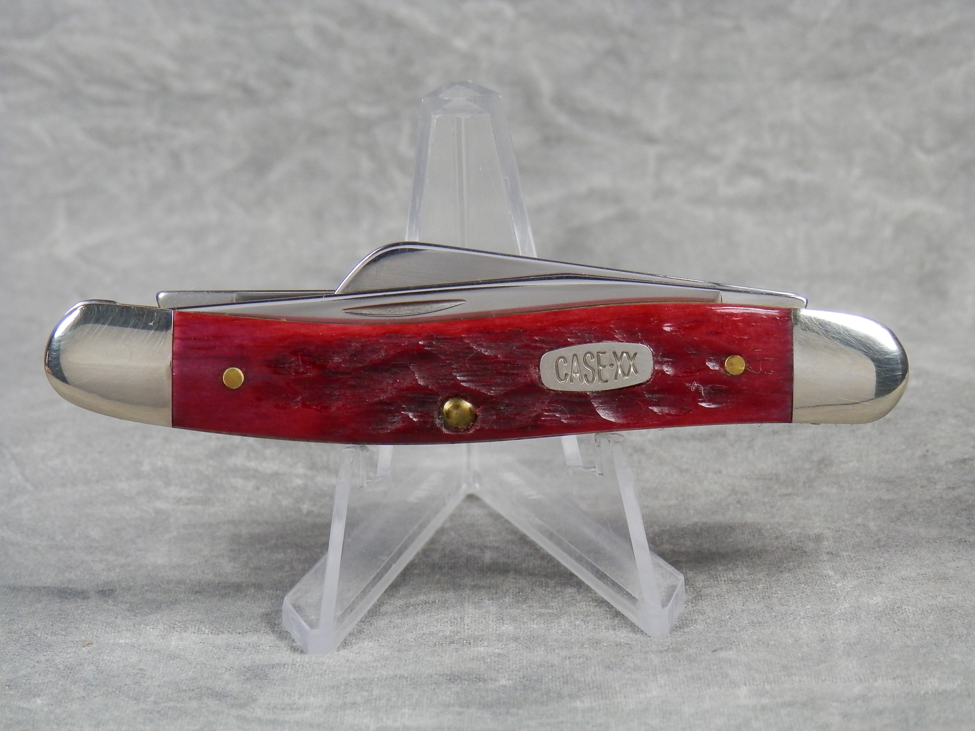 October 26, 2025 - 3-5/8 inches closed. 6-1/8 inches open. Made in USA. "CASE XX USA ***  " (3 dot with lightning bolt S), "SS", and "6318 SS" tang stamps. Oval "CASE-XX" shield. Stainless steel blades. Jigged Red Bone handle. Nickel Silver bolsters. Brass liner.