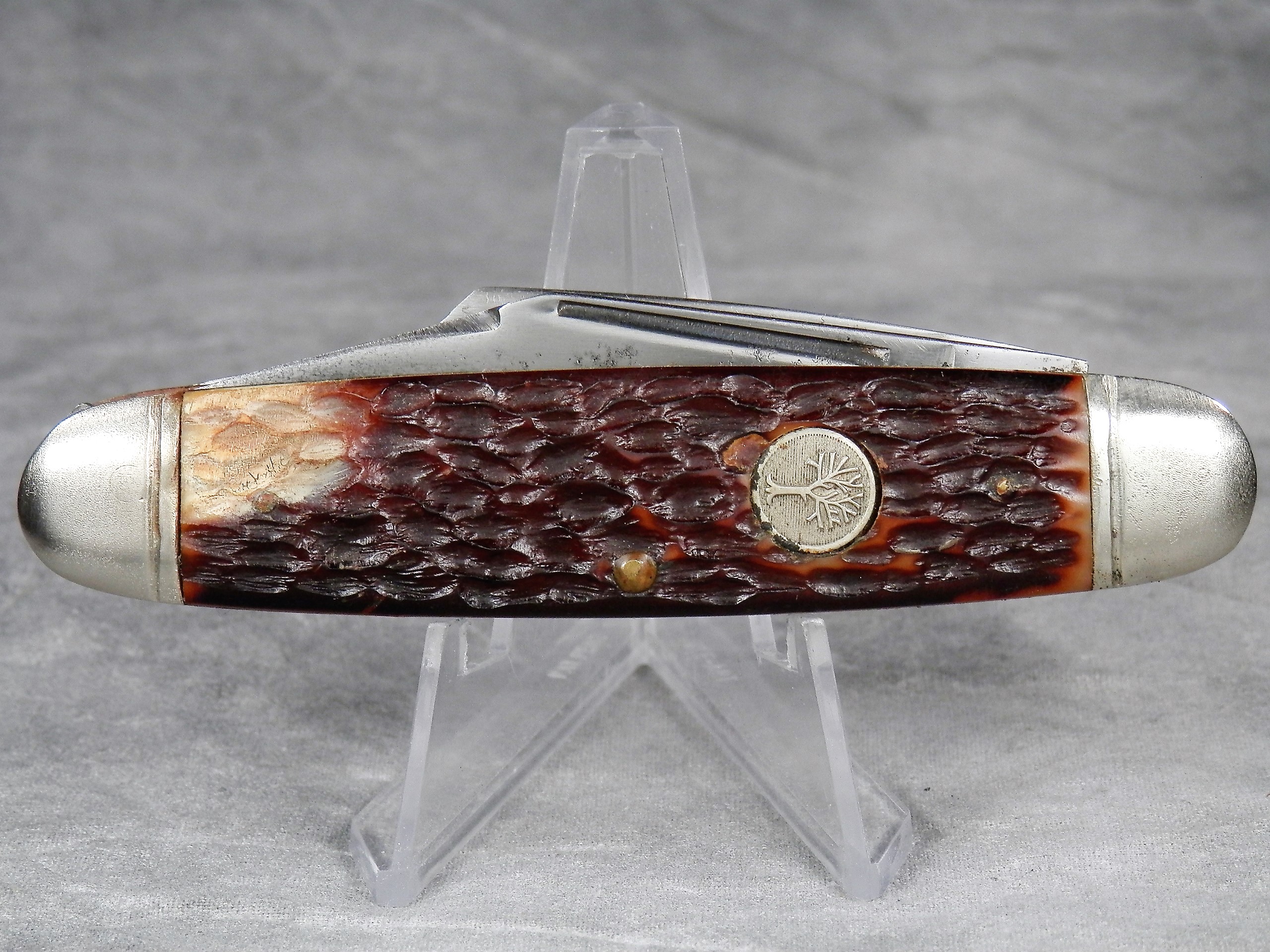 April 05, 2026 - 3-5/8 inches closed. 6-1/4 inches open. "BOKER U.S.A." tang stamp. Round tree shield. Jigged delrin handle. Nickel Silver bolsters. Brass liner.