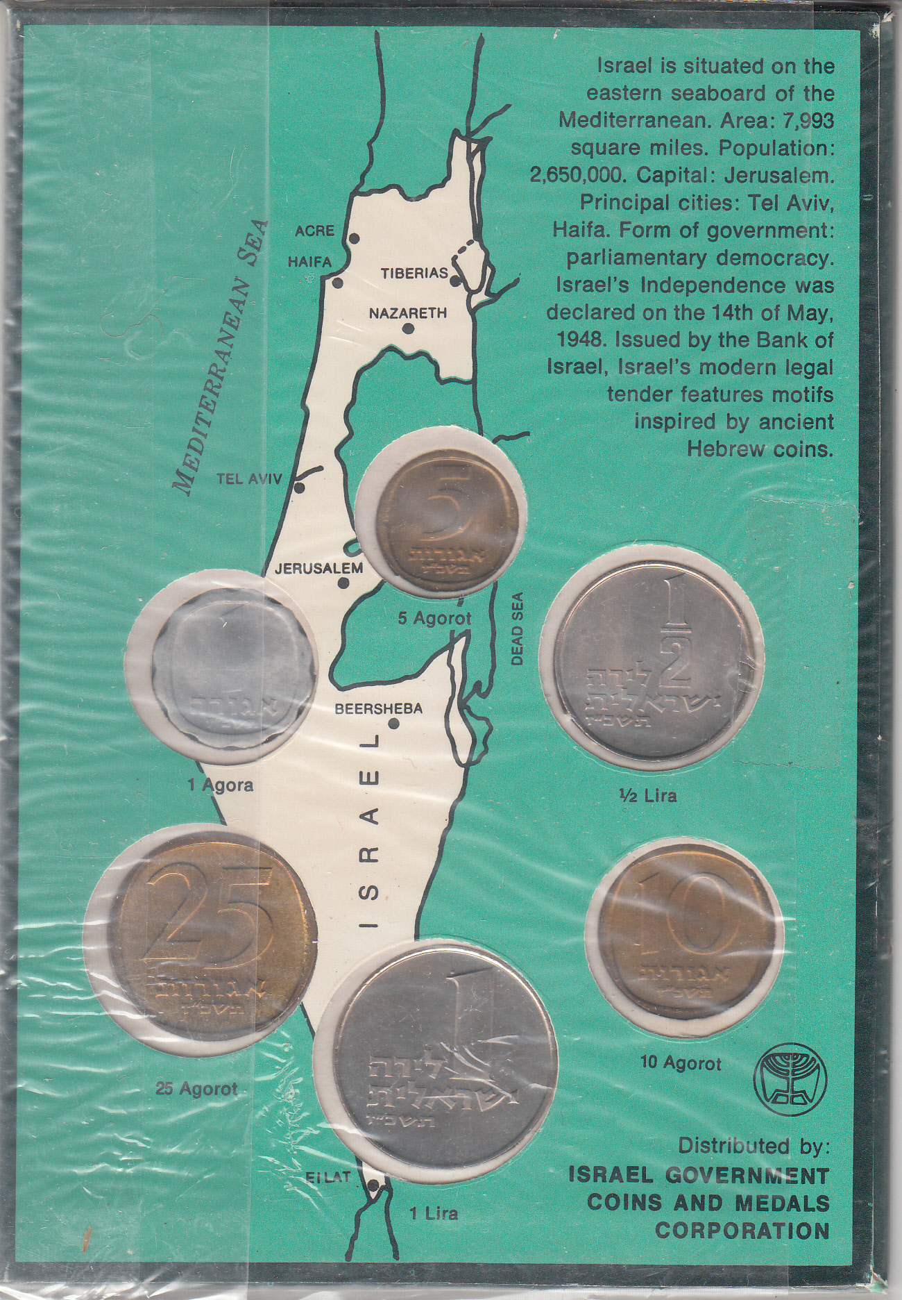 December 04, 2025 - The 6 coin set includes the 1 Agora, 5 Agorot, 1/2 Lira, 10 Agorot, 1 Lira and 25 Agorot coins, plastic-sealed into a card-display. Official issue of the Government of Israel.