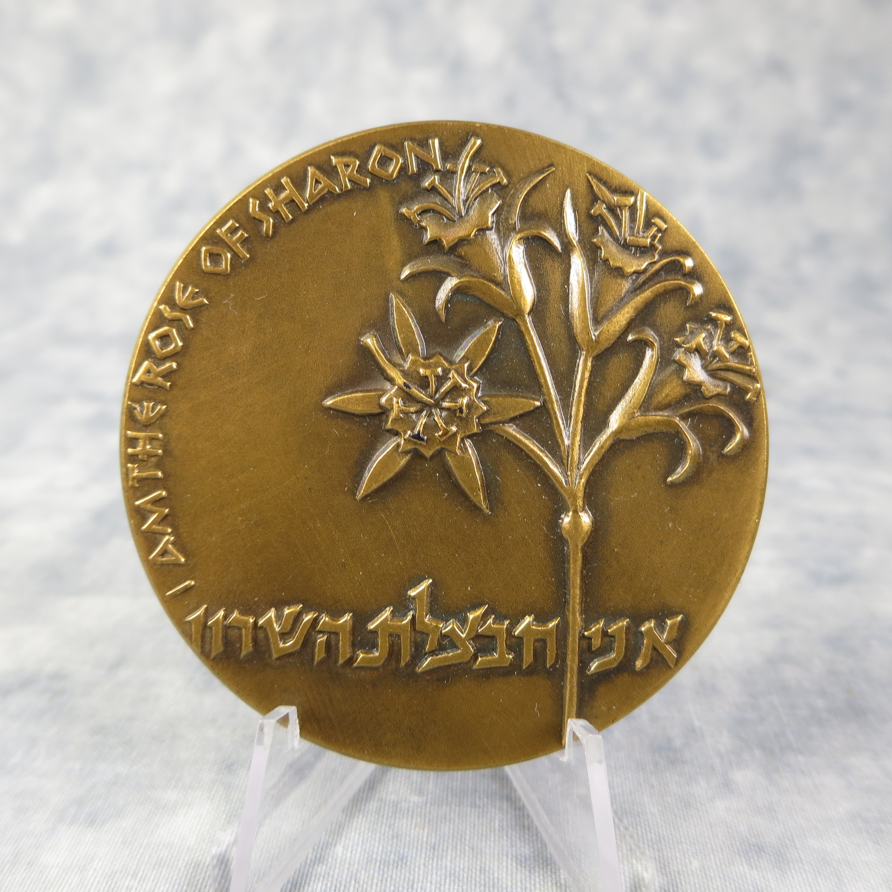 Reverse: In the centre, to the right, a stem with four flowers. Below the Hebrew inscription: "I am the Rose of Sharon" (Song of Songs). On the rim to the left, the English translation.
