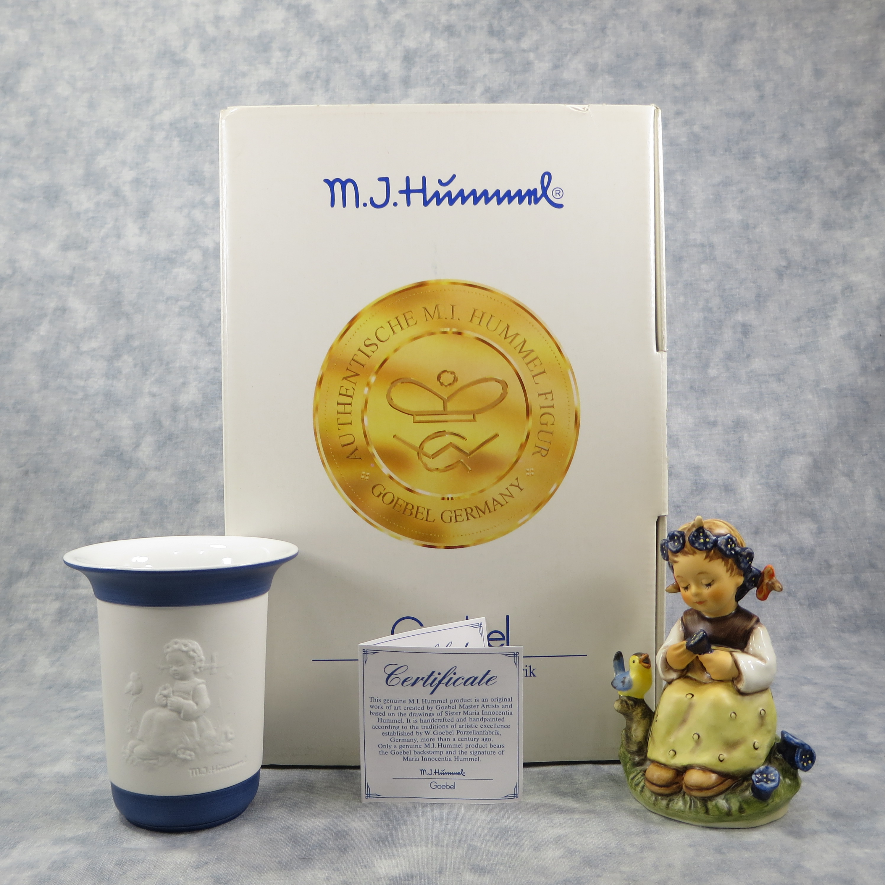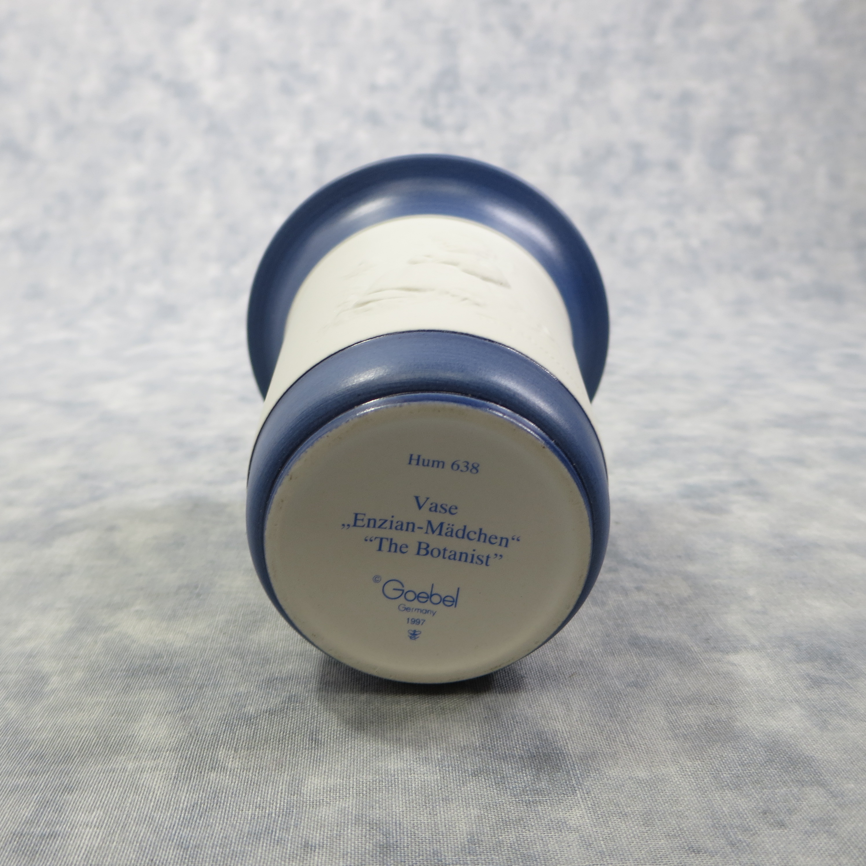 February 03, 2026 - This special combination "sampler" offer was released in 1998. It includes HUM 351 'The Botanist' figurine and HUM 638 Bisque porcelain vase with bas-relief figurine 'The Botanist' on the front. The figurine is 4-1/2 inches tall. It's base is incised 351 and 1972. Goebel TMK 7 trademark is imprinted in blue on bottom of base. Painter hand-initialed and dated in black ink on bottom of base. The vase is 4 inches tall. 'HUM 638, Vase, "The Botanist", and Goebel TMK 7 trademark imprinted in blue on the bottom.