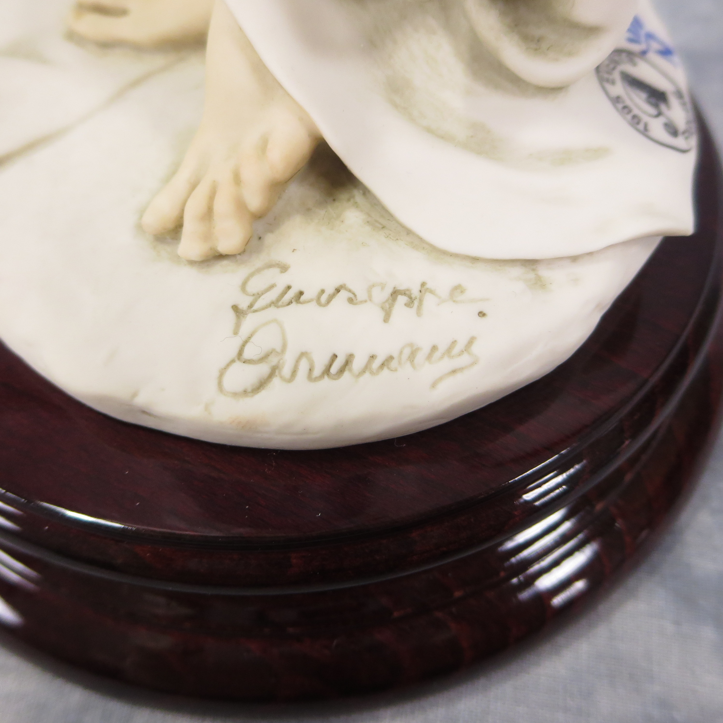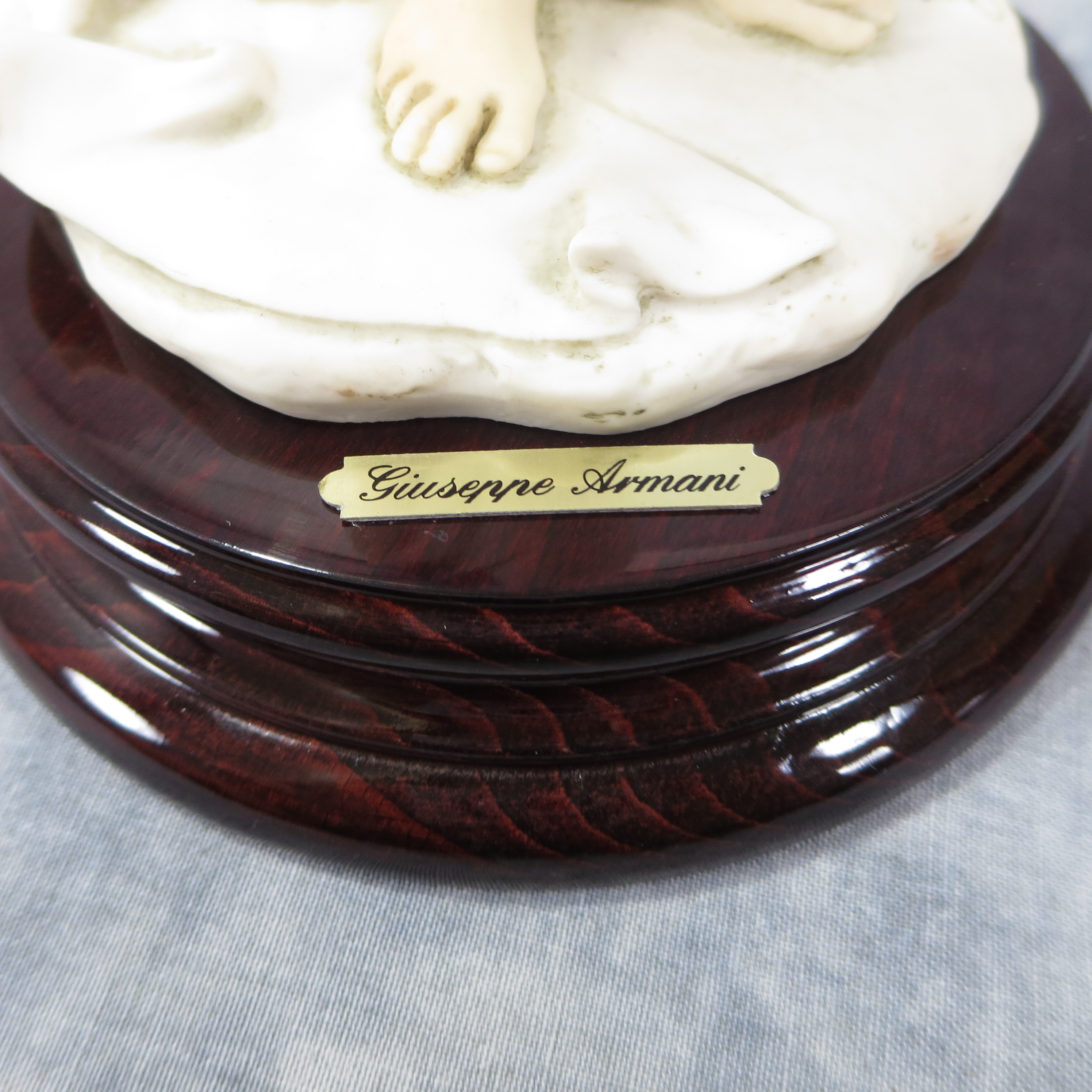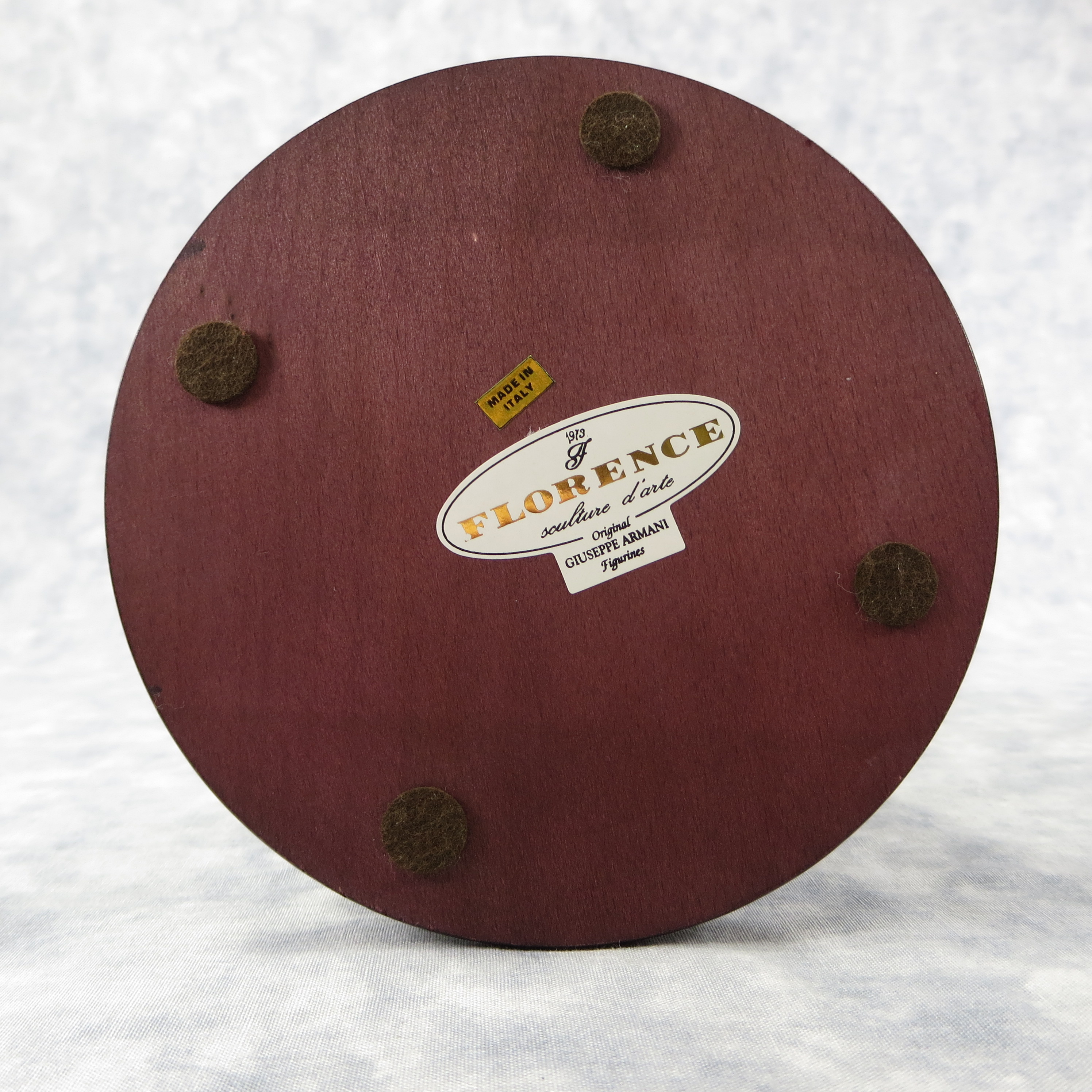 13 inches tall. 5-1/4 inch diameter base. Brass nameplate reads: Giuseppe Armani. Base is incised '(c) 1994 Florence' and with Armani's signature. Statue stamped with the Capodimonte "N" Crown and '1995 Events Figure'. Includes original box/inserts.
