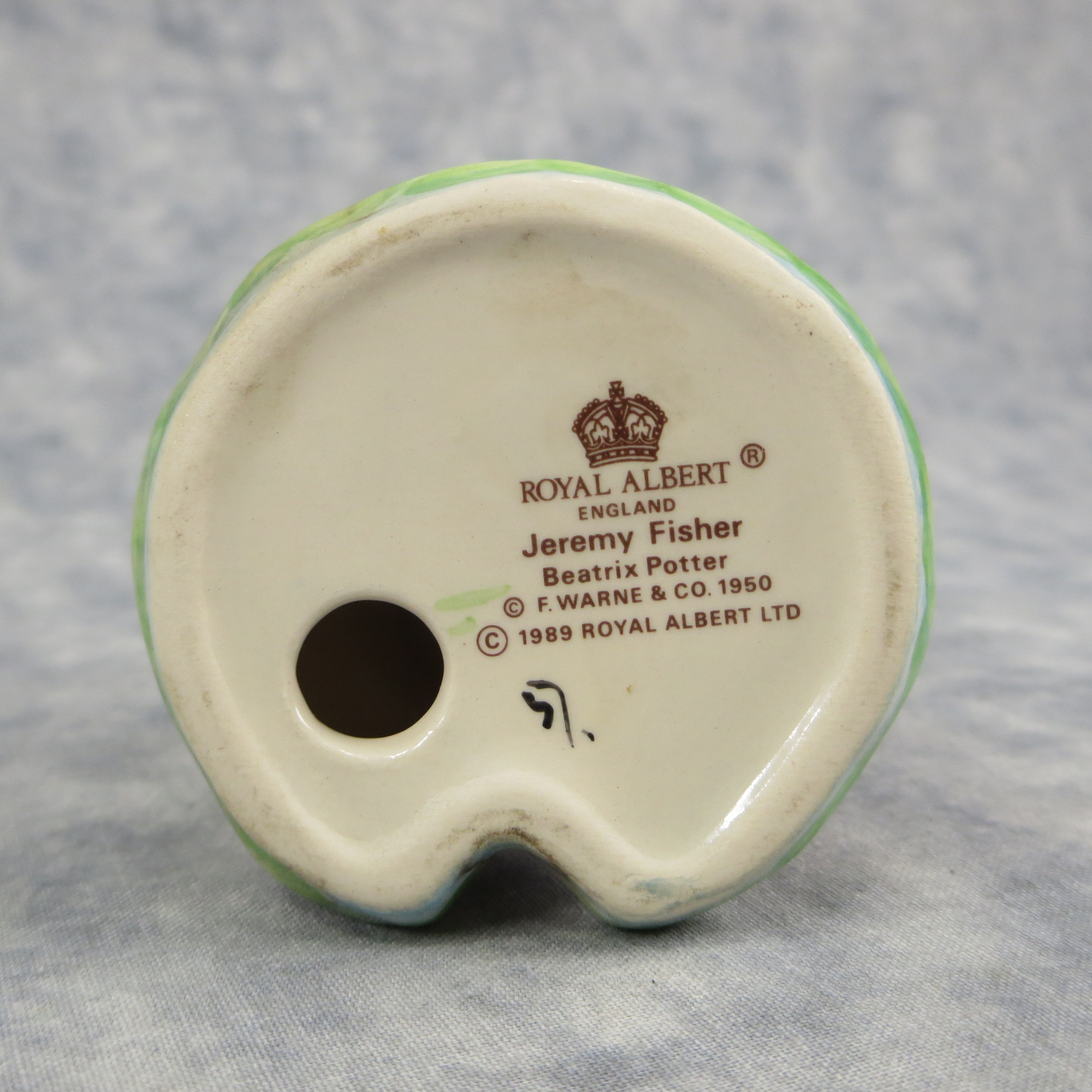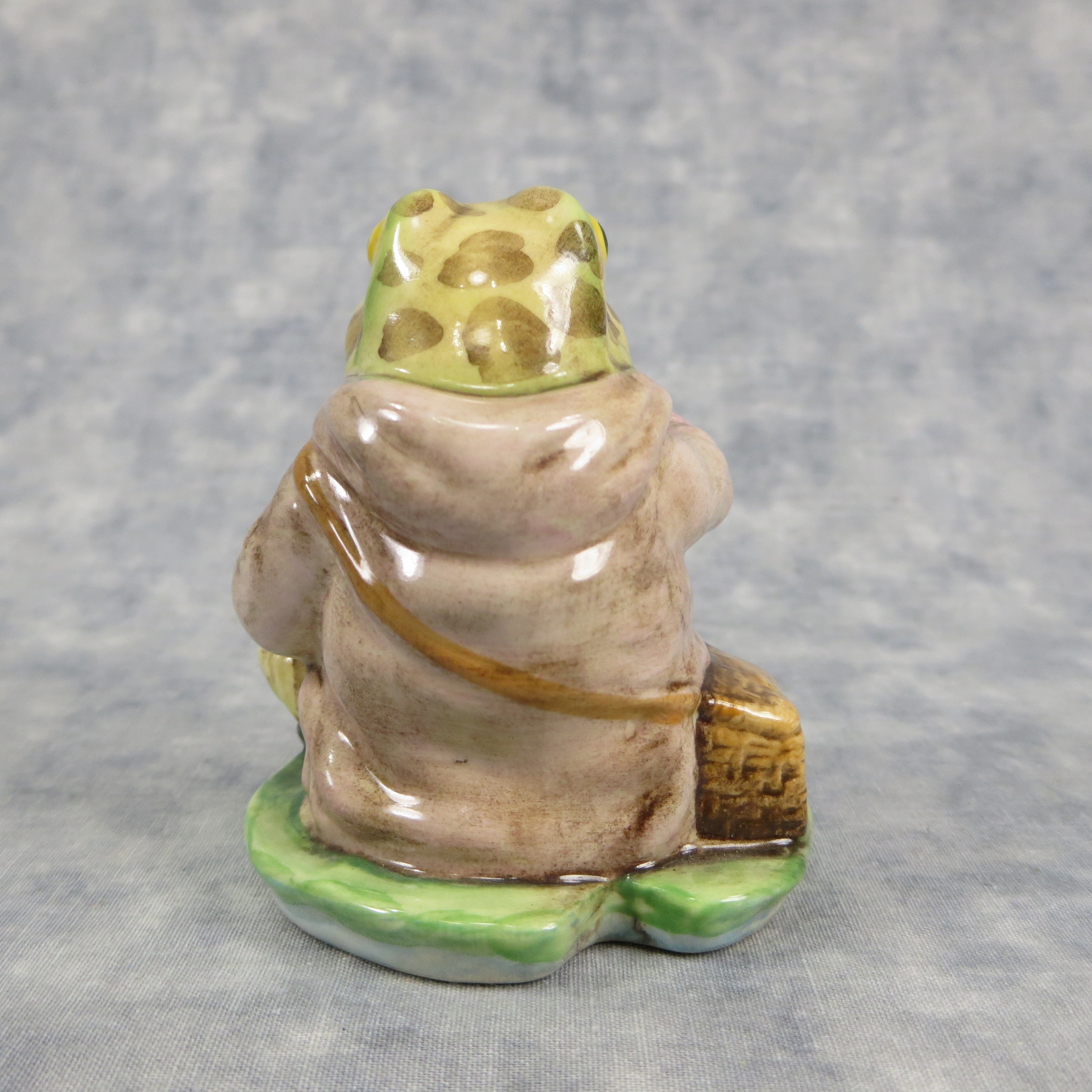 April 05, 2026 - 3" tall by 2 1/2" wide by 2-1/2 inches long. Shape Number: 1157. Modelled by Arthur Gredington. 2nd version with large spots on the head and stripes on the legs. Issued in 1950 and never withdrawn from production. Frederick Warne & Co, Royal Albert (Beswick, England) with the BP-6a backstamp used from 1989-1998.