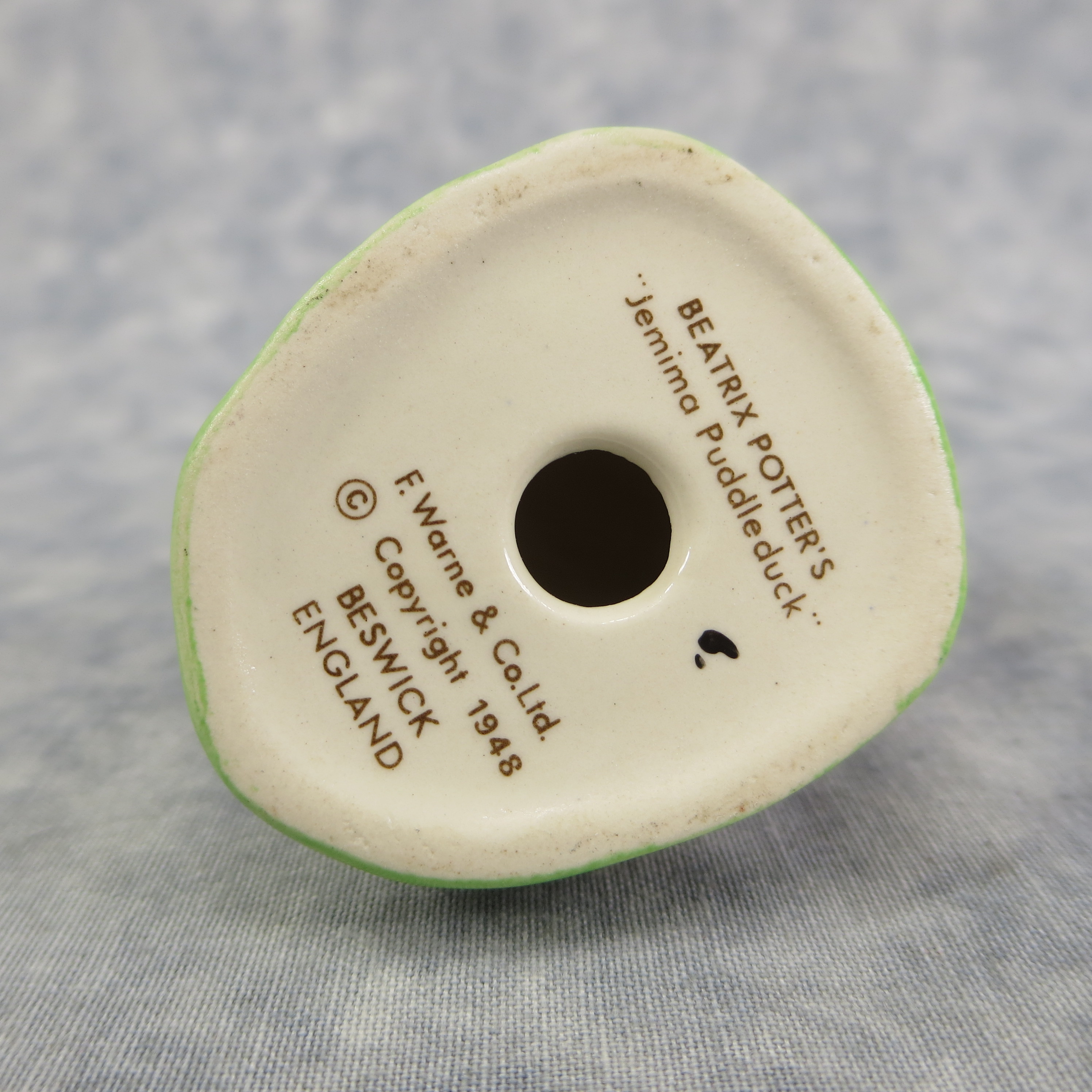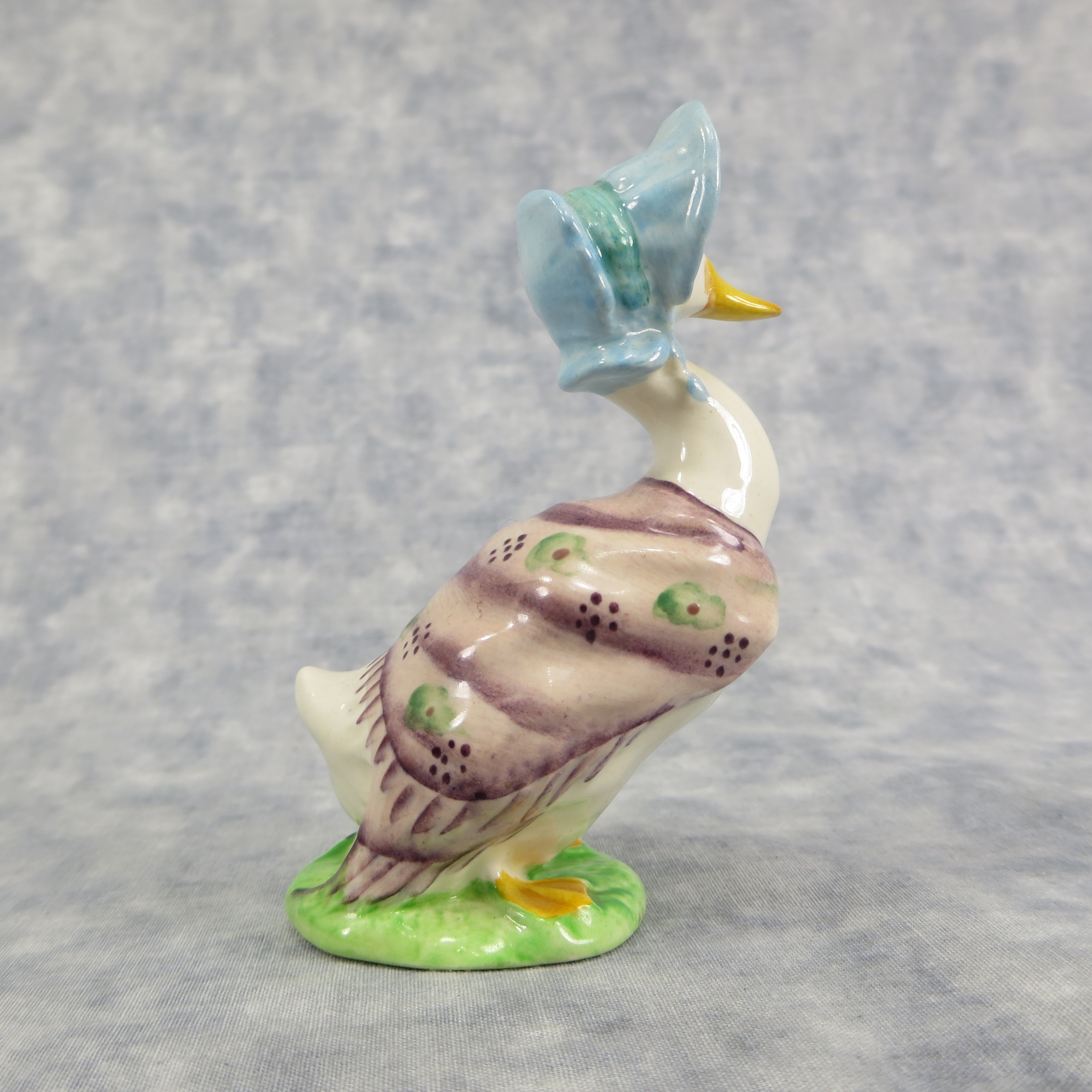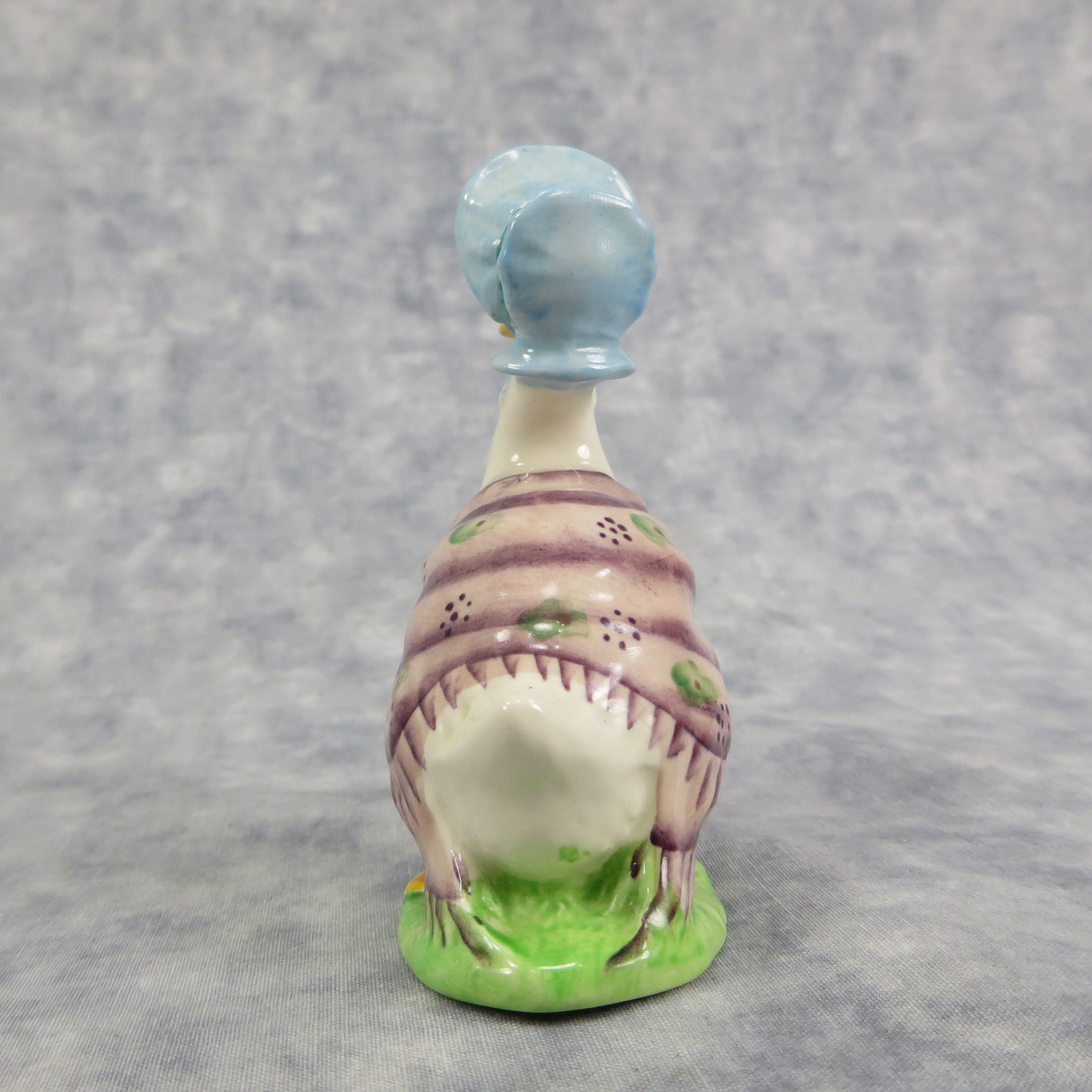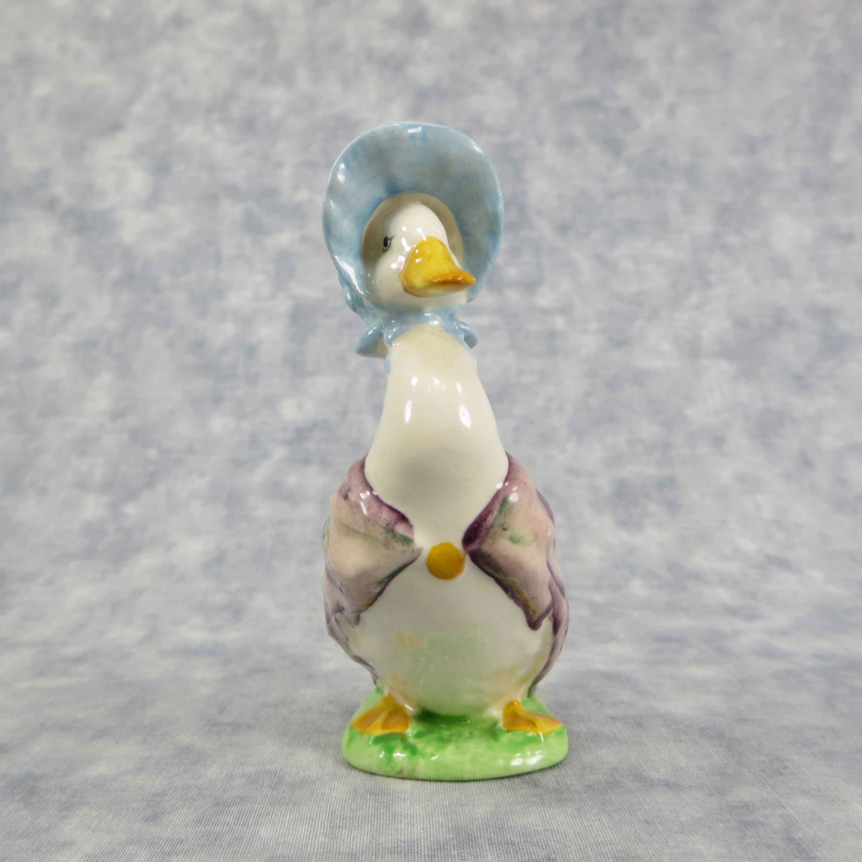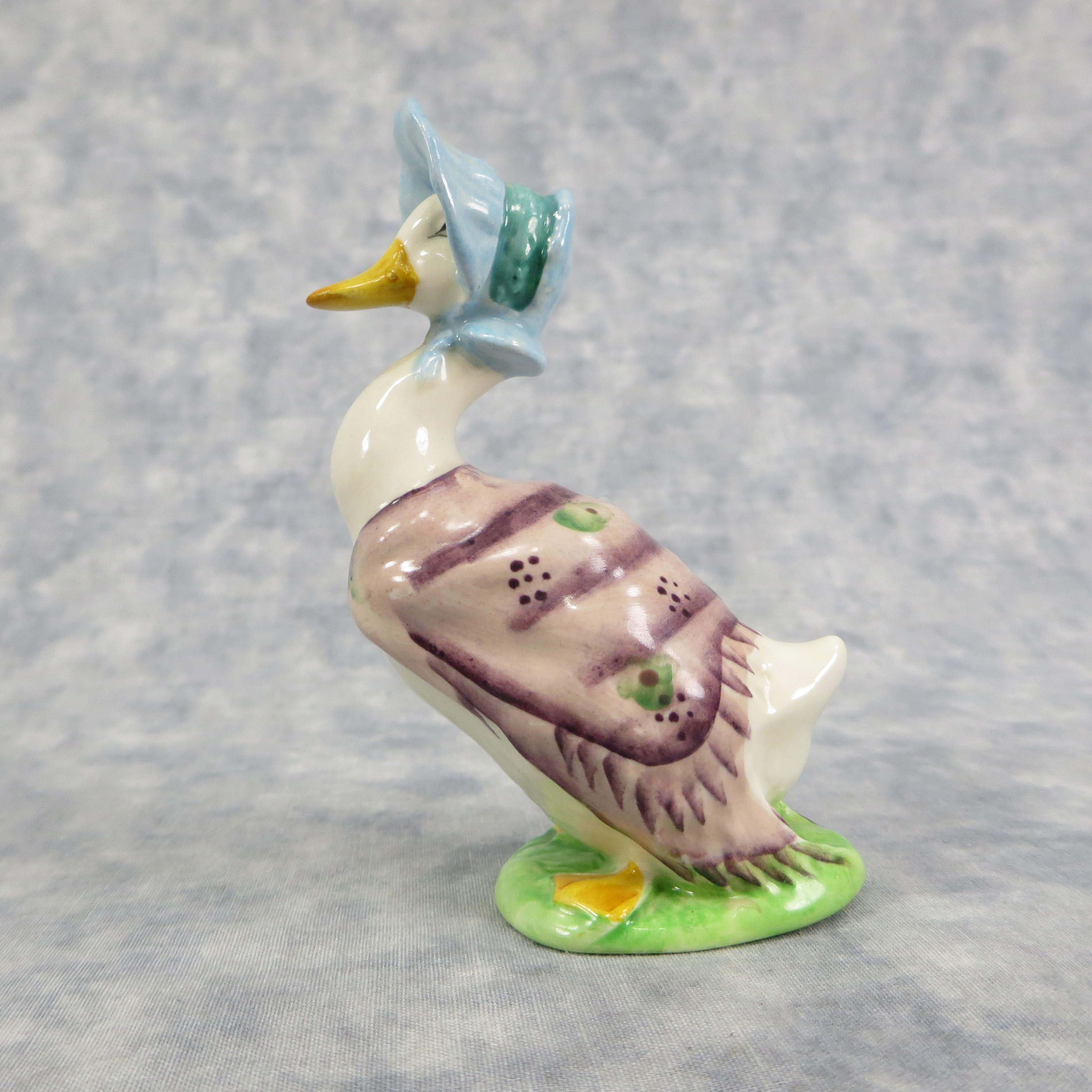 April 05, 2026 - 4 inches tall by 1-5/8 inches wide by 2-3/4 inches long. Shape Number: 1092. Modelled by Arthur Gredington. 1st version with purple shawl and dark blue bonnet. Issued in 1947 and never withdrawn from production. Manufactured by Frederick Warne & Co, Beswick, England with the BP-3b backstamp used from 1974-1985.