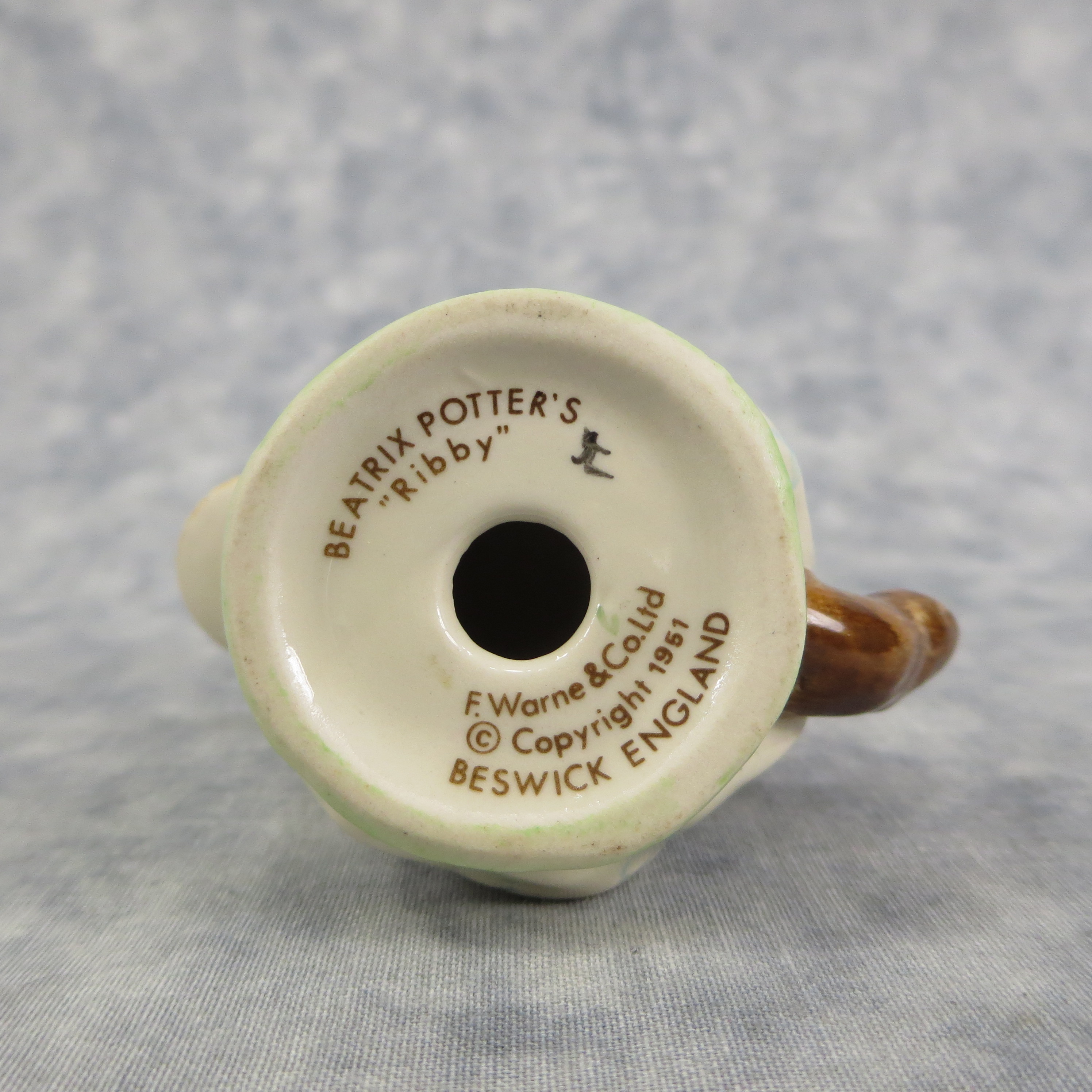 April 25, 2026 - 3-1/2 inches tall by 3-1/8 inches wide by 1-7/8 inches long. Shape Number: 1199. Modelled by Arthur Gredington. Issued in 1951 and never withdrawn from production. Manufactured by Frederick Warne & Co, Beswick, England with the BP-3b backstamp used from 1974-1985.