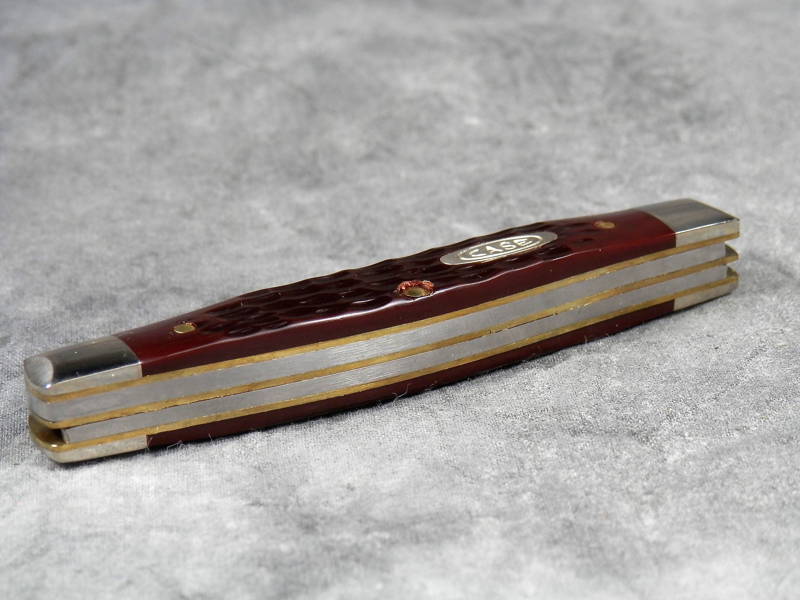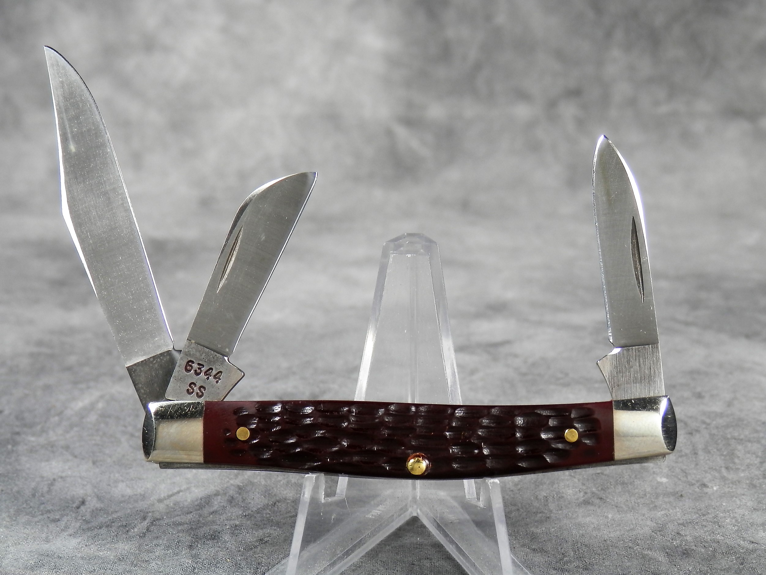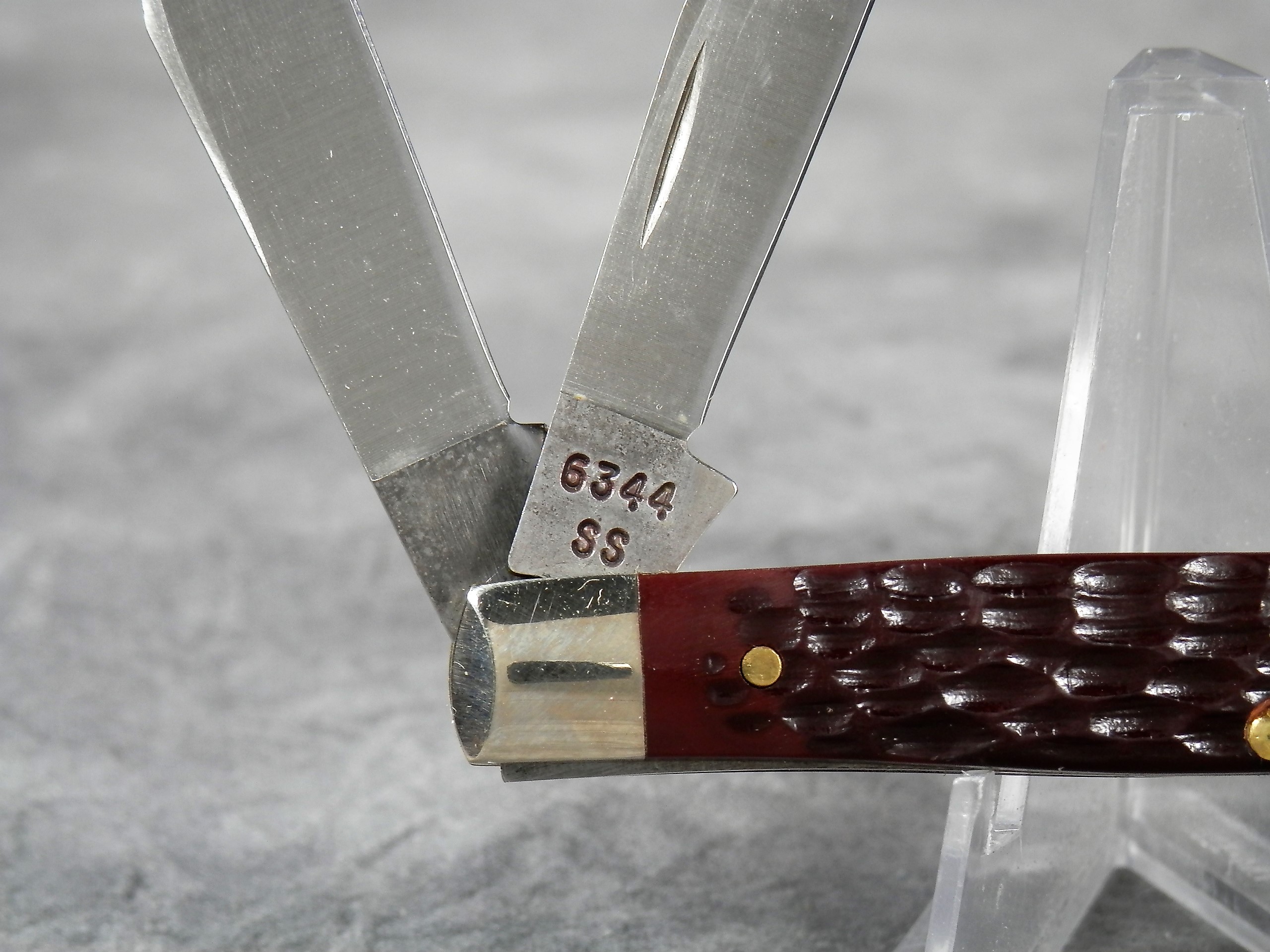 March 15, 2026 - 3-1/4 inches closed. 5-3/4 inches open. Made in USA. "CASE XX USA ** " (2 dot with lightning bolt S) and "6344 SS" tang stamps. Double oval 'open C' CASE shield. Stainless Steel blades. Jigged delrin handle. Nickel Silver bolsters. Brass liner.