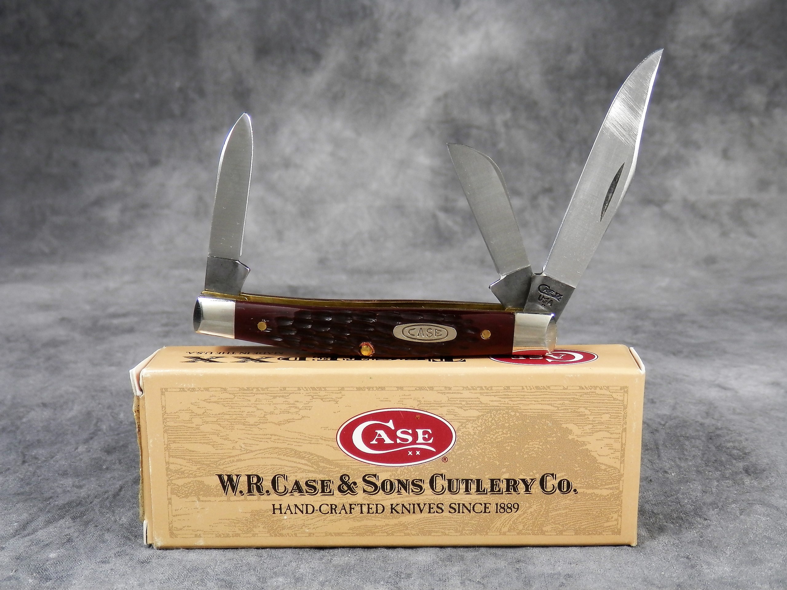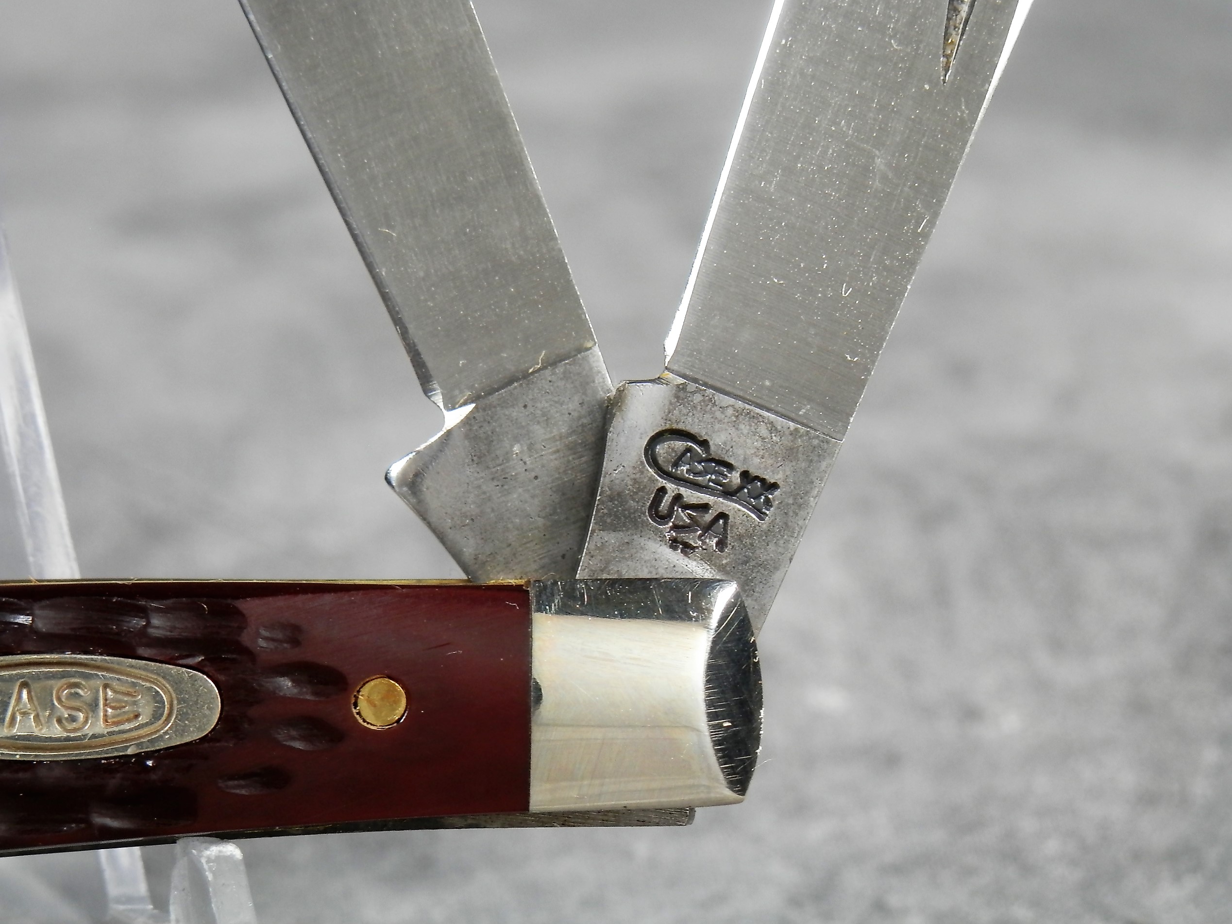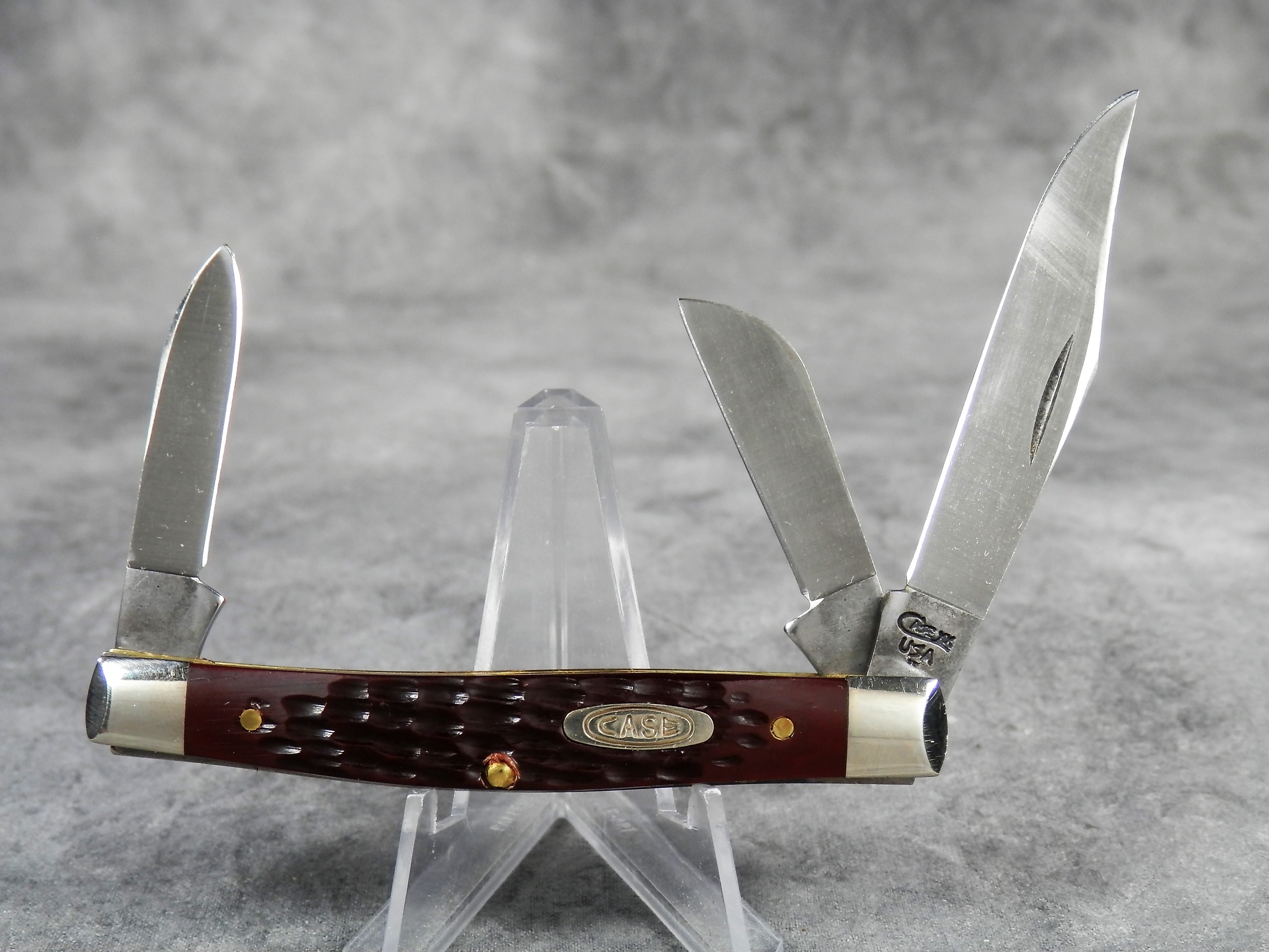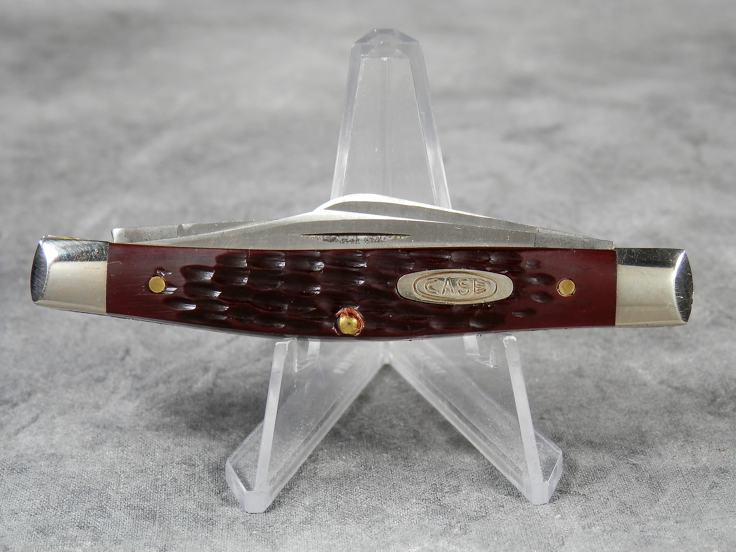 March 15, 2026 - 3-1/4 inches closed. 5-3/4 inches open. Made in USA. "CASE XX USA ** " (2 dot with lightning bolt S) and "6344 SS" tang stamps. Double oval 'open C' CASE shield. Stainless Steel blades. Jigged delrin handle. Nickel Silver bolsters. Brass liner.