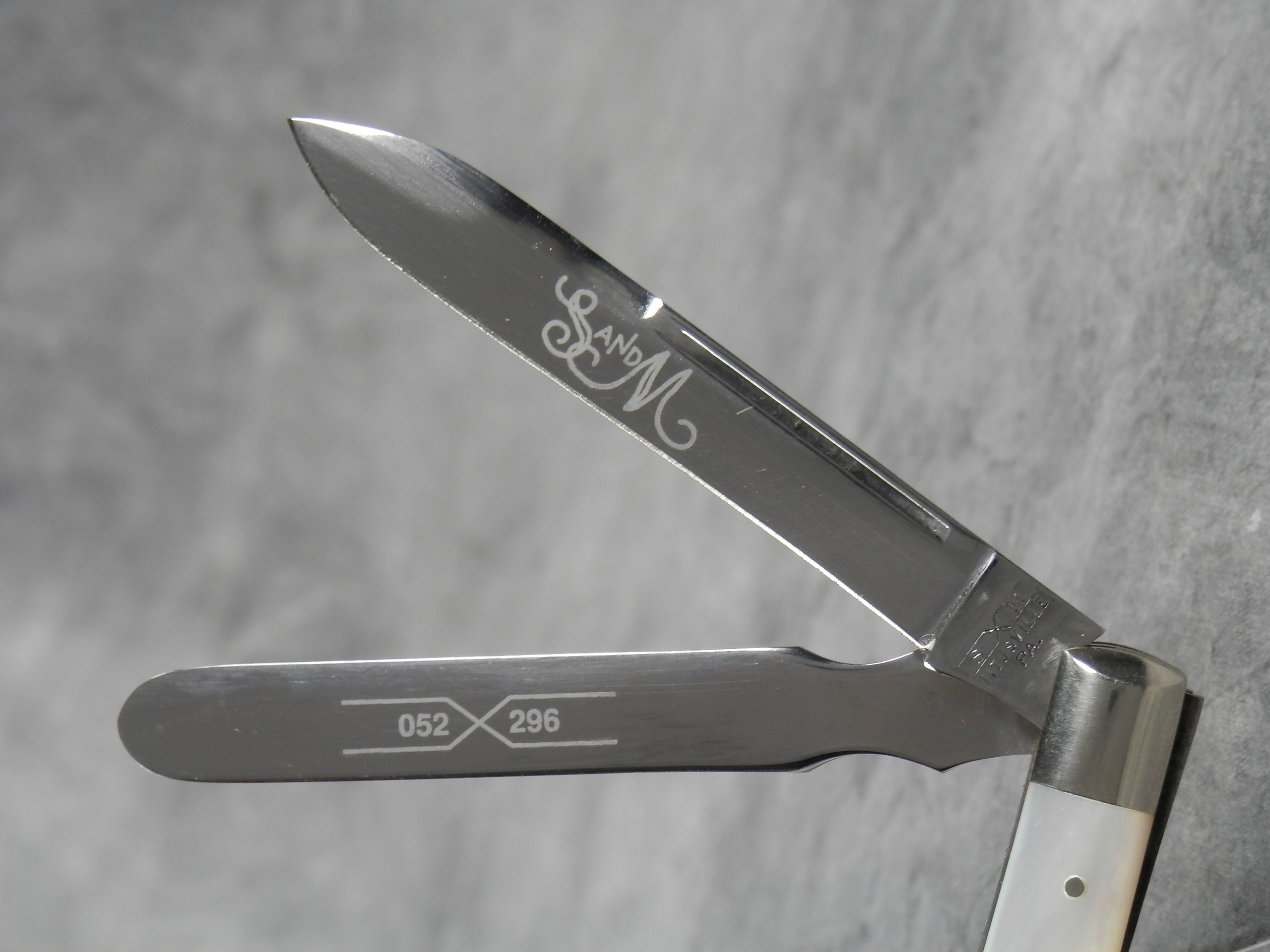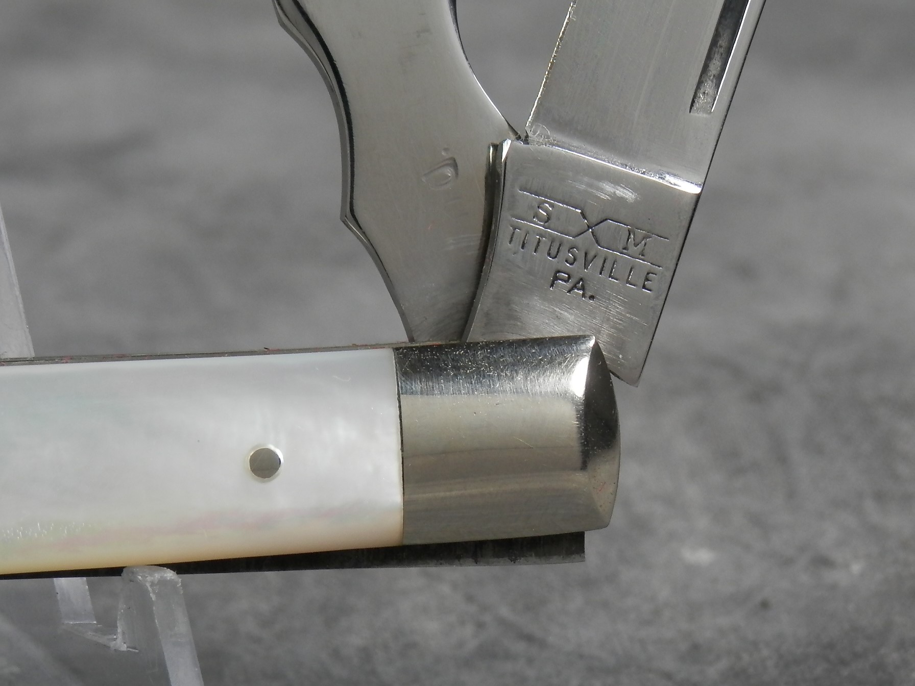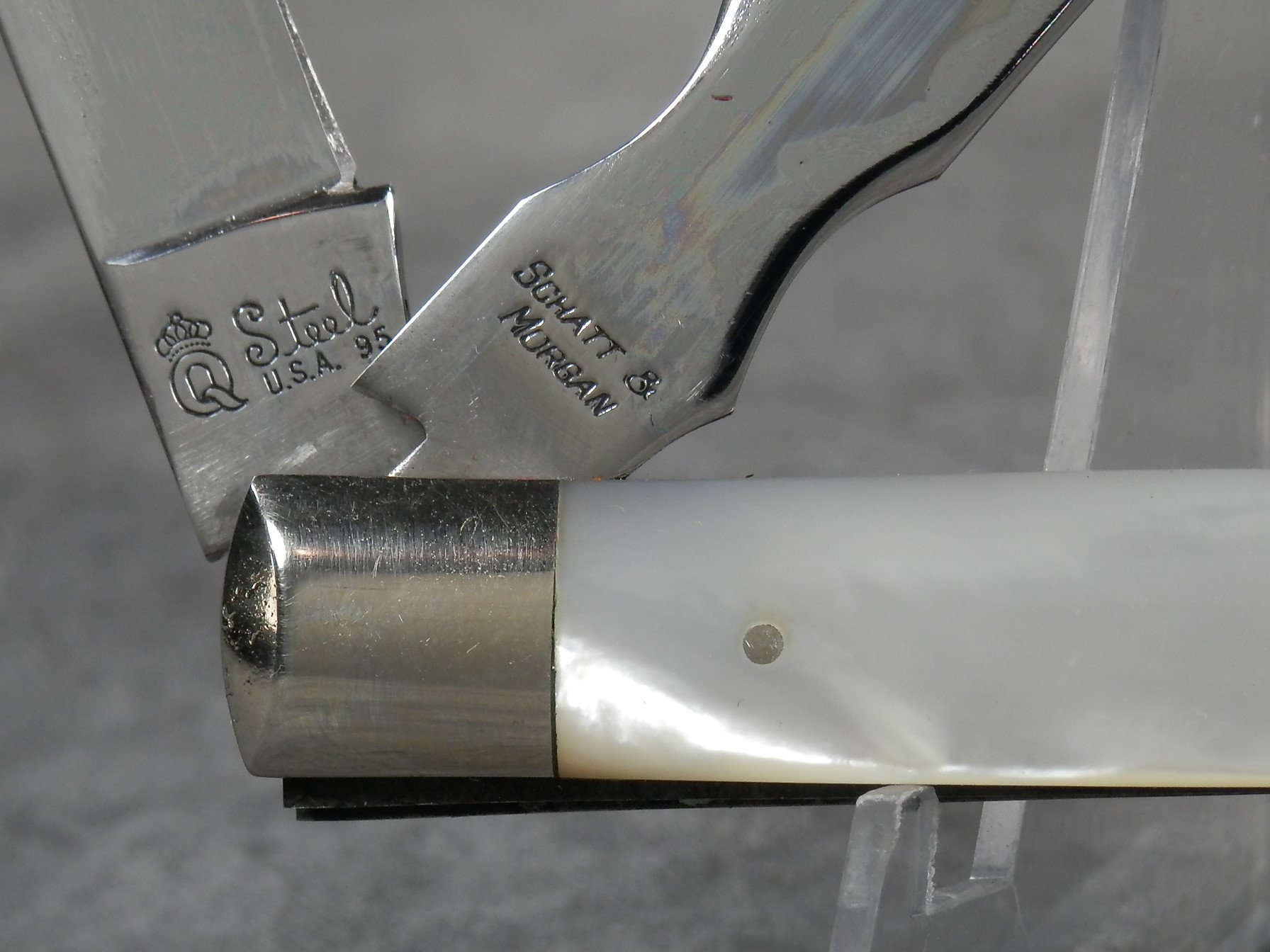 December 04, 2025 - 2-Blade Physician's Knife. Made in USA. 3-3/4 inches closed. 6-5/8 inches open. "Q Steel USA 95", "SCHATT & MORGAN", and "S X M TITUSVILLE, PA" tang stamps. Blades etched "S and M" and "052 X 296". Mother of Pearl handle. Nickel silver bolsters and liner.