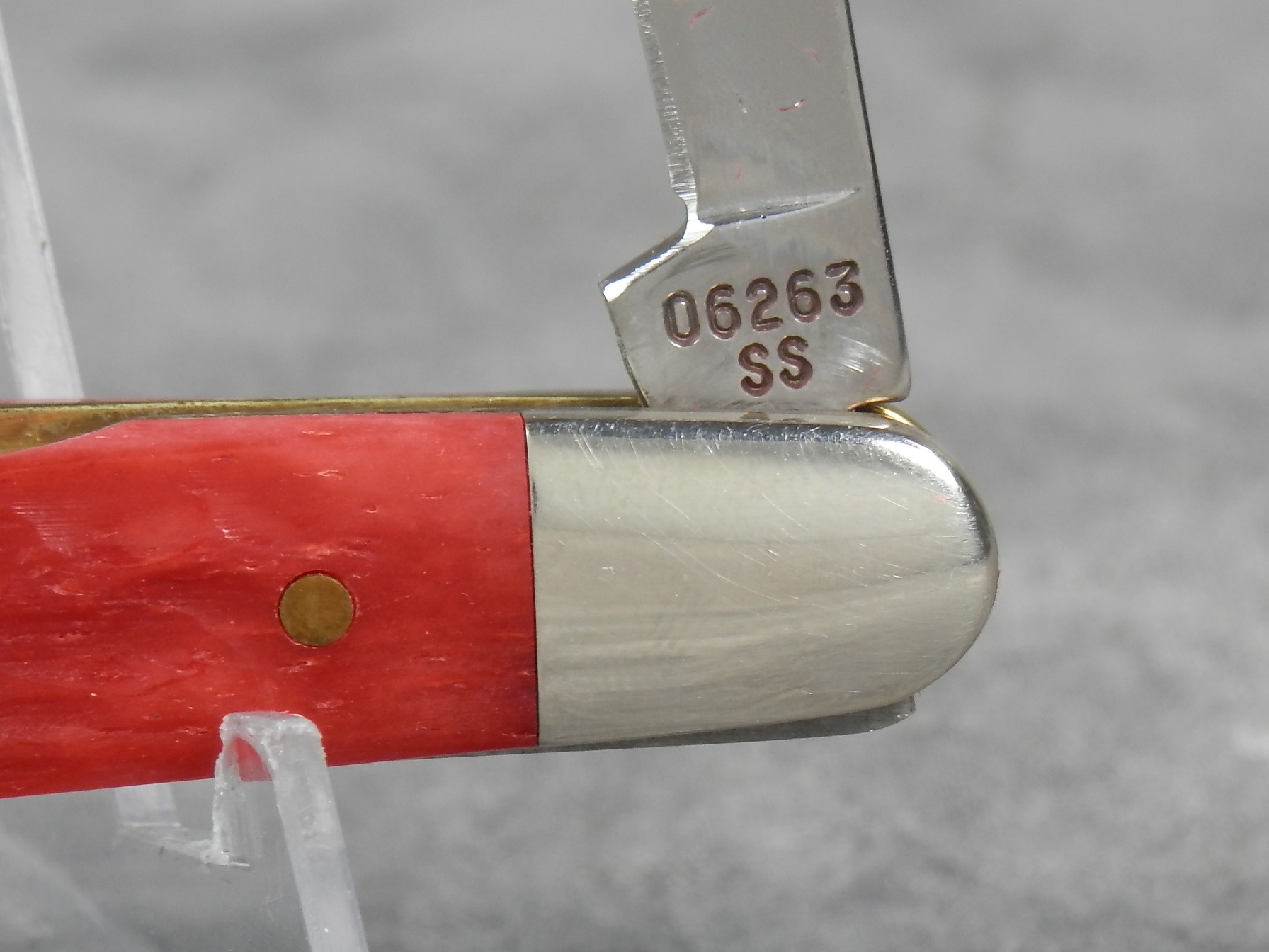 February 23, 2026 - 3-1/8 inches closed. 4-7/8 inches open. Made in USA. "CASE XX USA **** " (4 dot with lightning bolt S) and "06263 SS" tang stamps. Oval "CASE-XX" shield. Stainless Steel blades. Master blade etched with Dwight Eisenhower's signature. Red Jigged Bone handle. Nickel Silver bolsters. Brass liner.