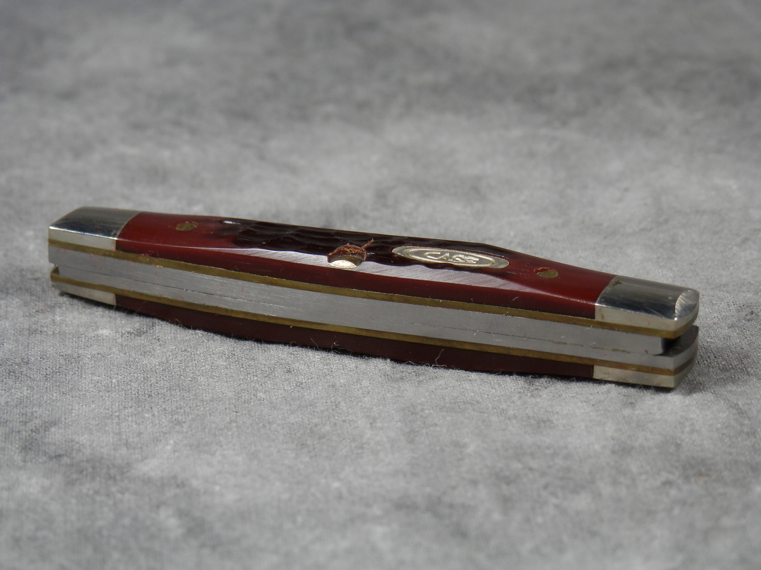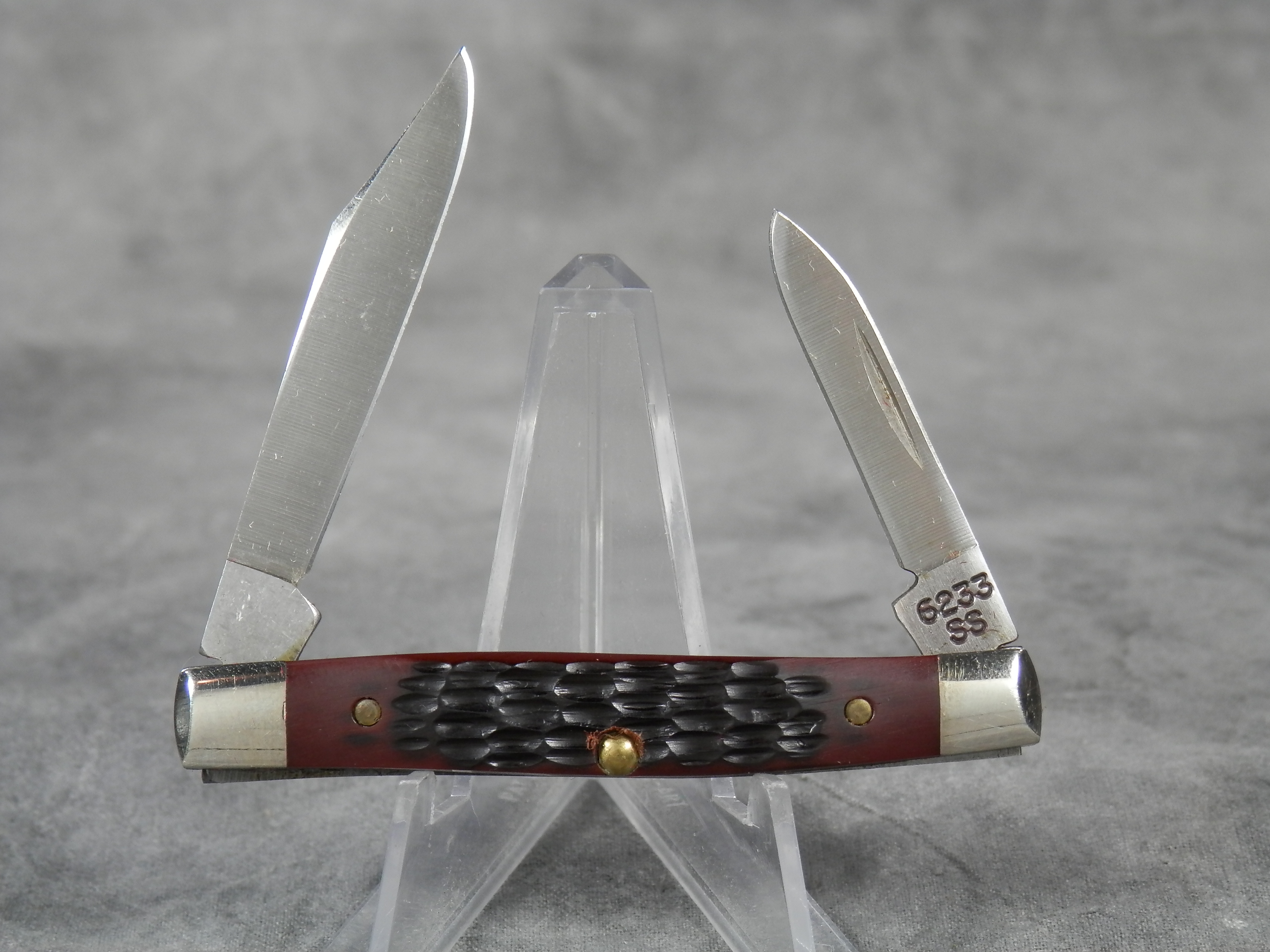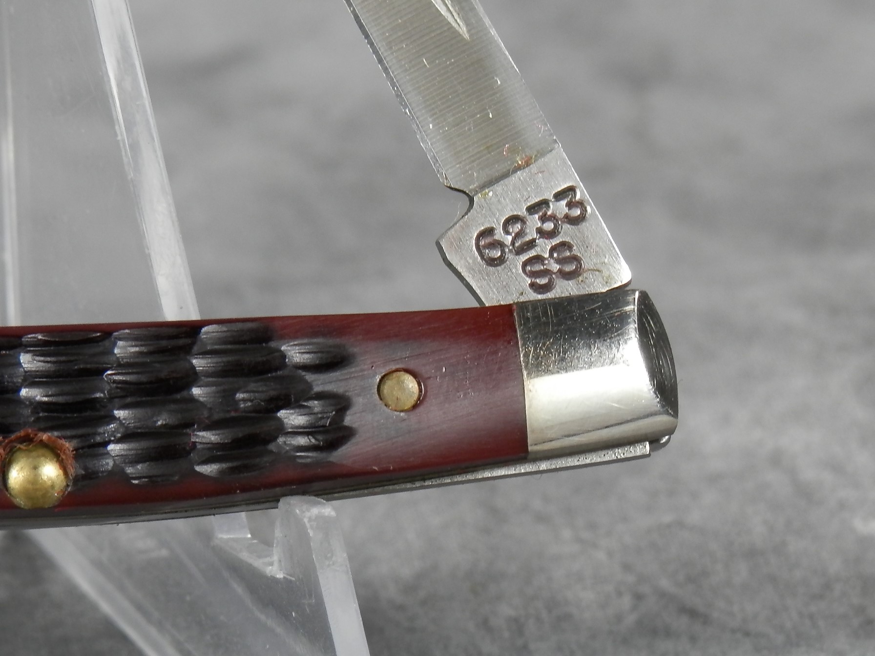 January 14, 2026 - 2-5/8 inches closed. 4-5/8 inches open. Made in USA. "CASE XX USA ****** " (6 dot with lightning bolt S) and "6233 SS" tang stamps. Double Oval 'Open C' CASE shield. Stainless Steel blades. Jigged Delrin handle. Nickel Silver bolsters. Brass liner.
