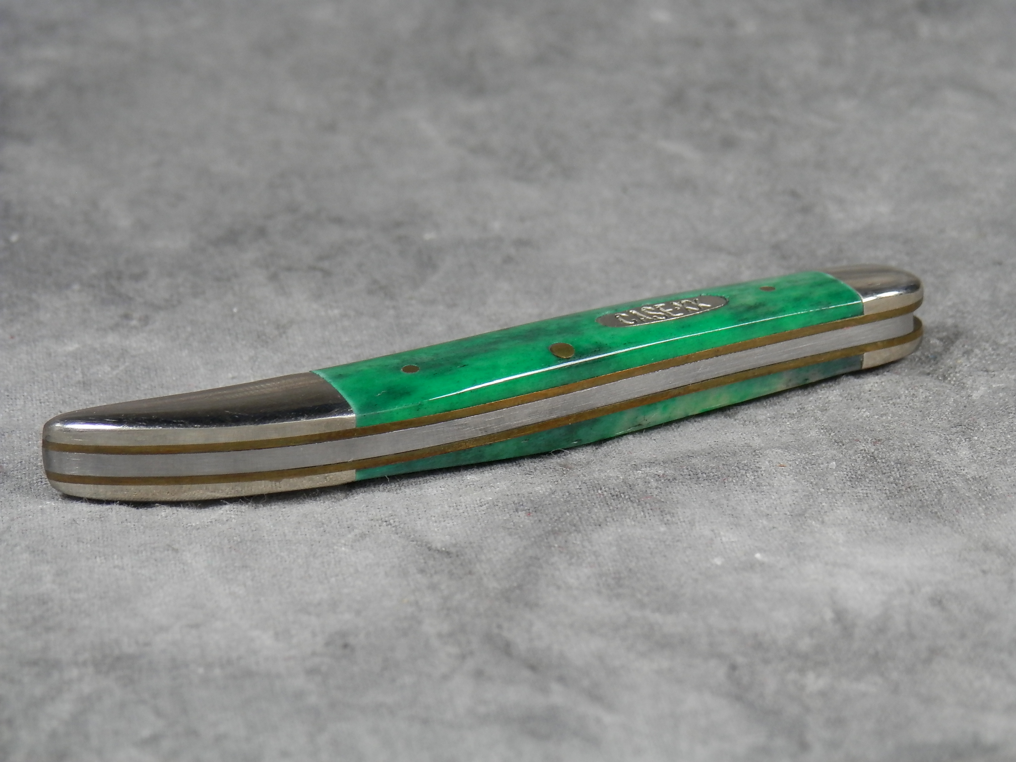 February 03, 2026 - 3 inches closed. 5-1/4 inches open. Made in USA. "Case XX USA *** " (3 dot with lightning bolt S) and "610096 SS" tang stamps. Oval 'Closed C' CASE-XX shield. Stainless Steel blade. Beautiful smooth Green Bone handle. Nickel Silver bolsters and brass liner.