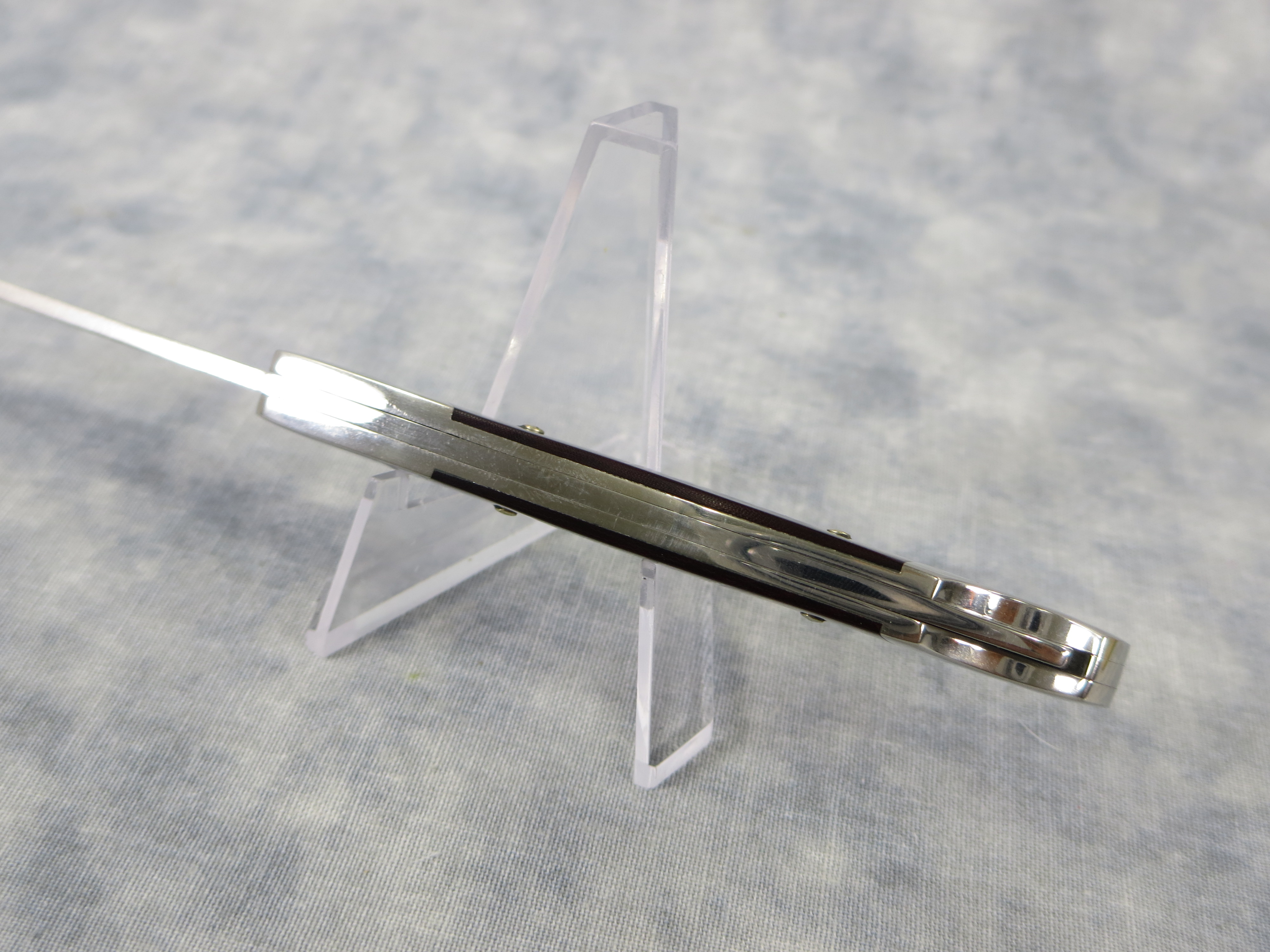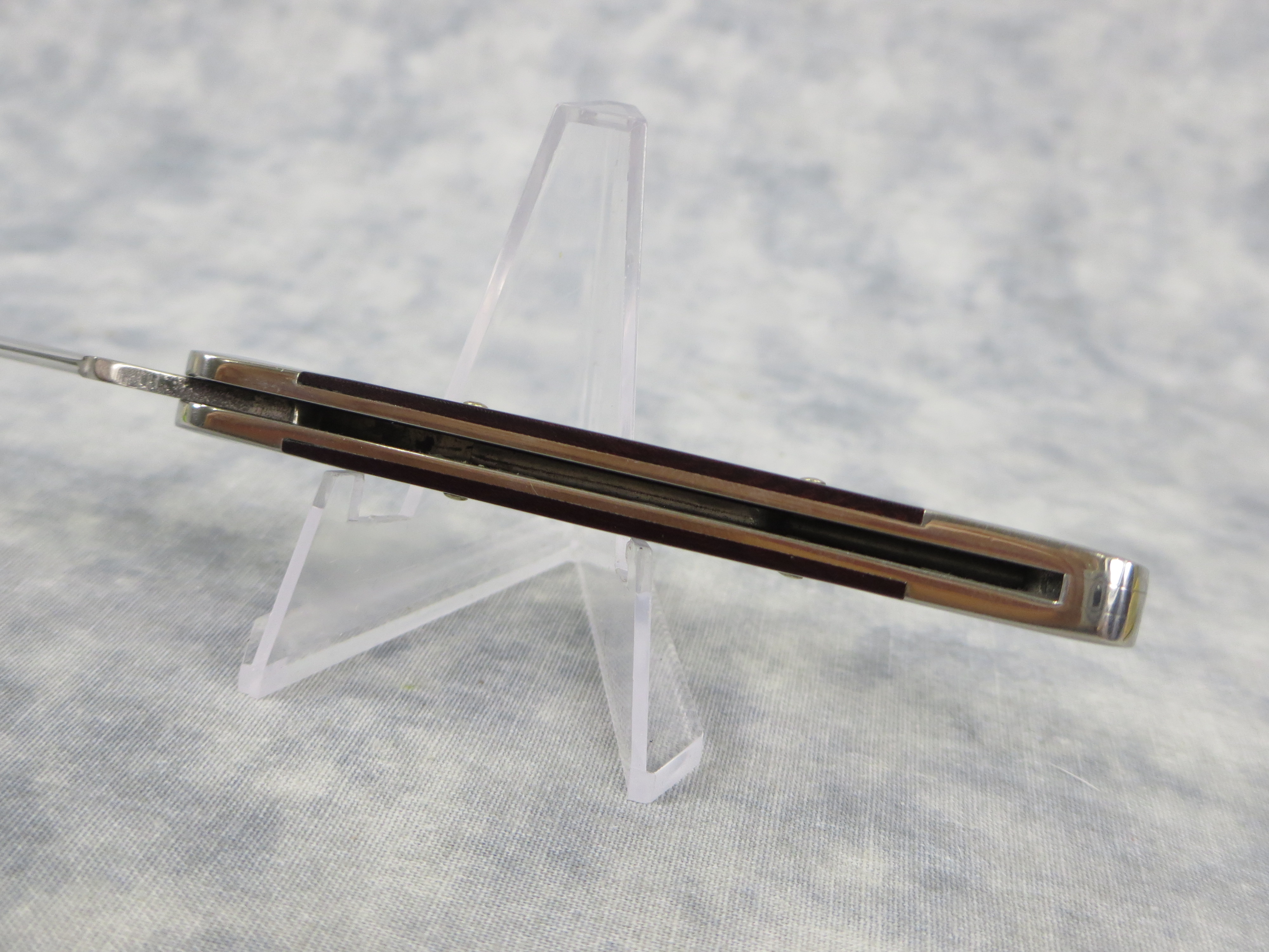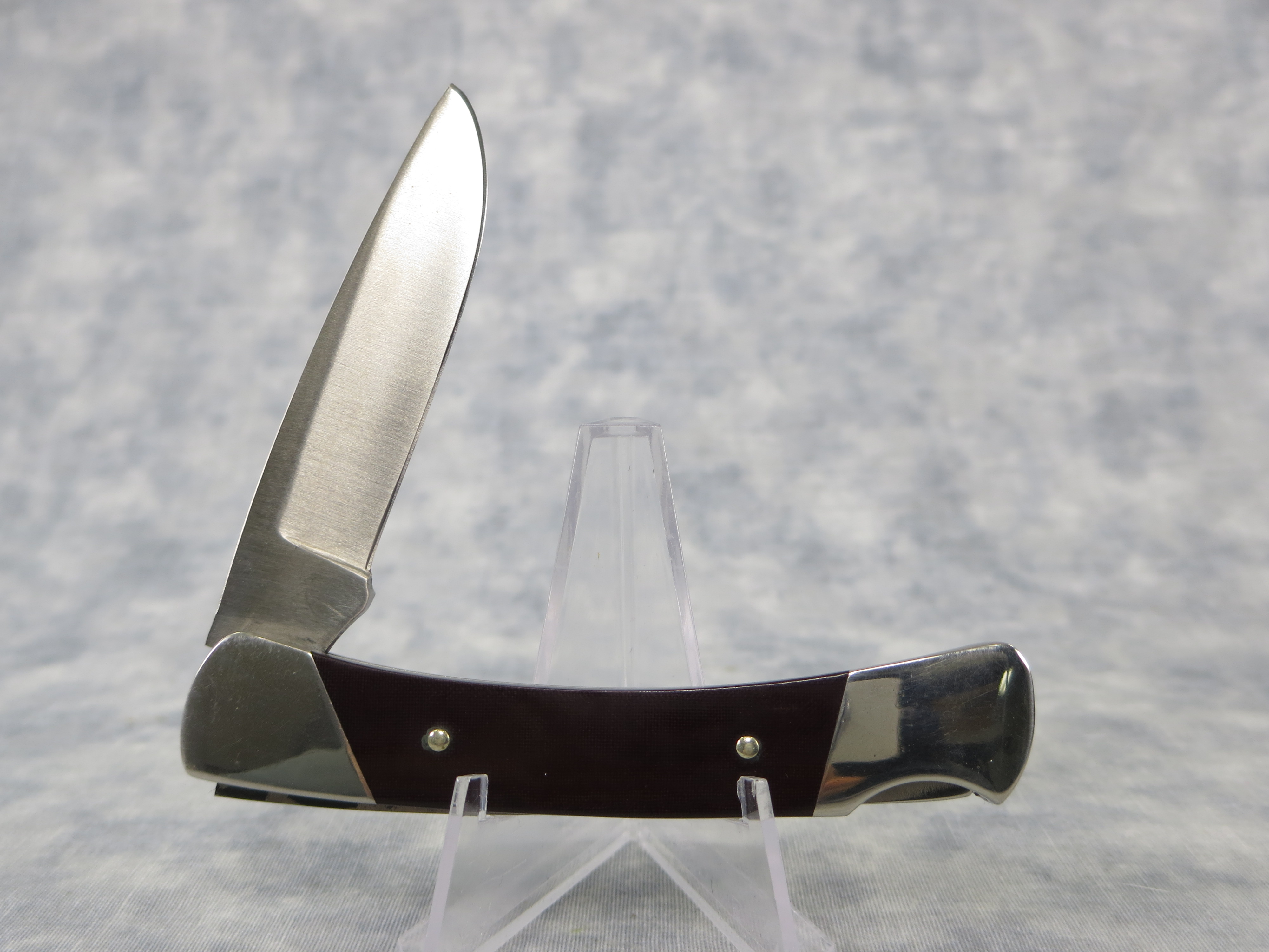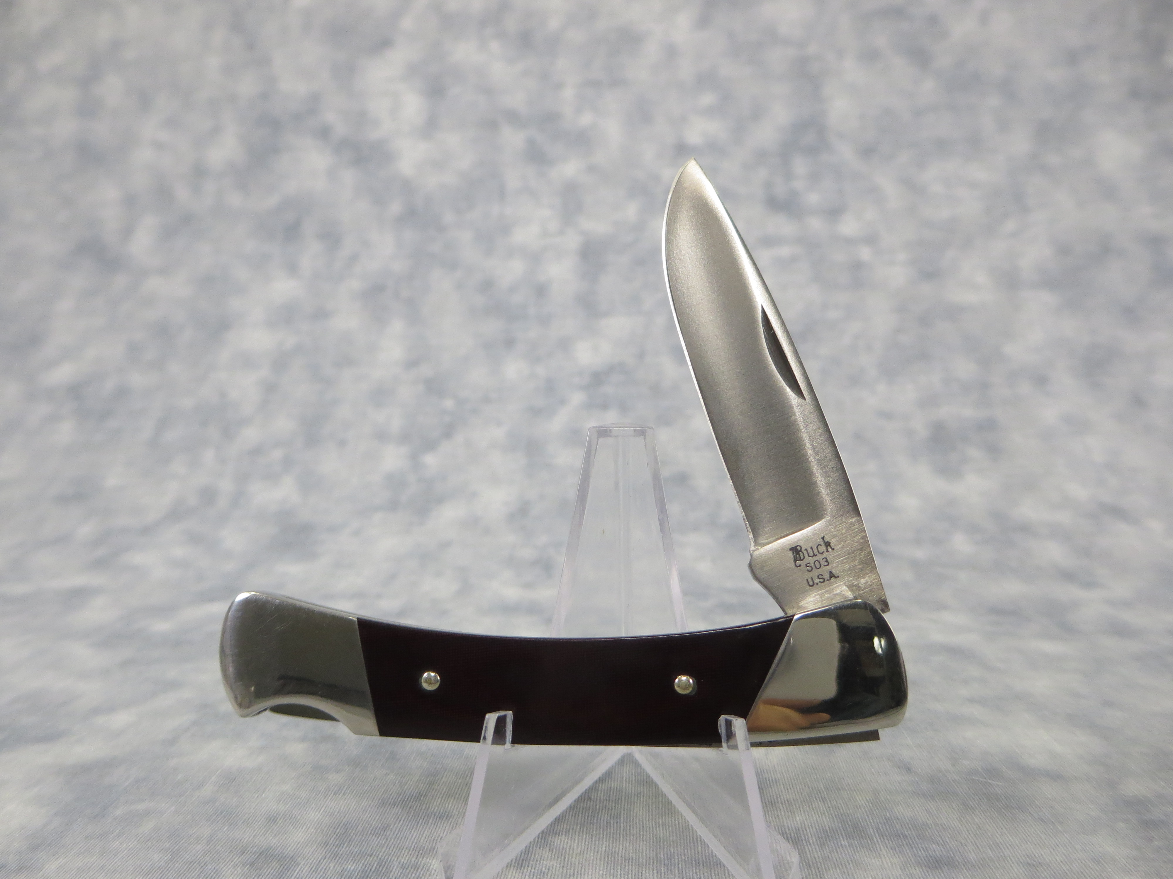 December 04, 2025 - 3-3/8 inches closed. 5-3/4 inches open. Made in USA. 'Buck / 503 / U.S.A.' tang stamp. 420 HC Steel blade. Rosewood Dymondwood handle.