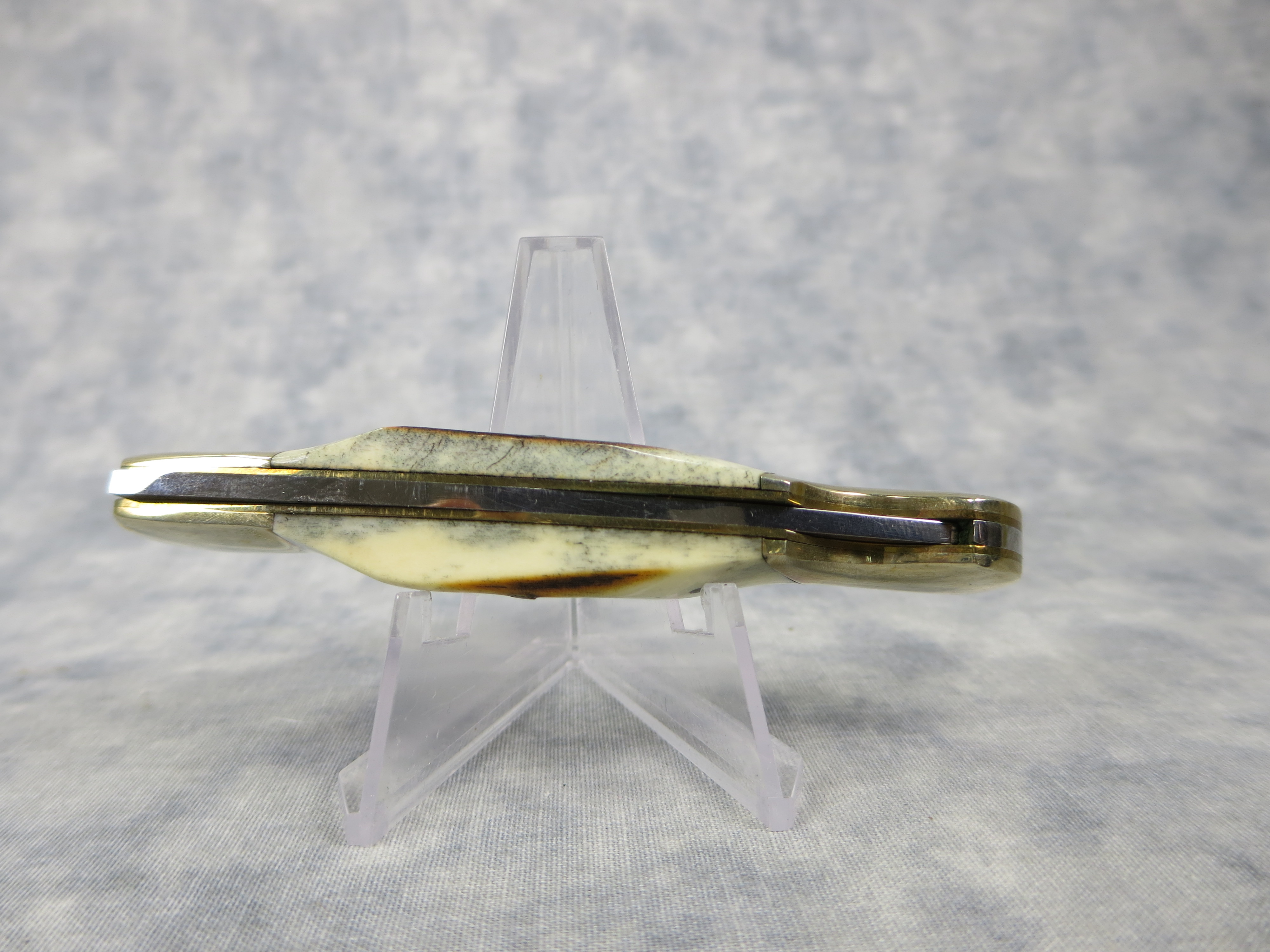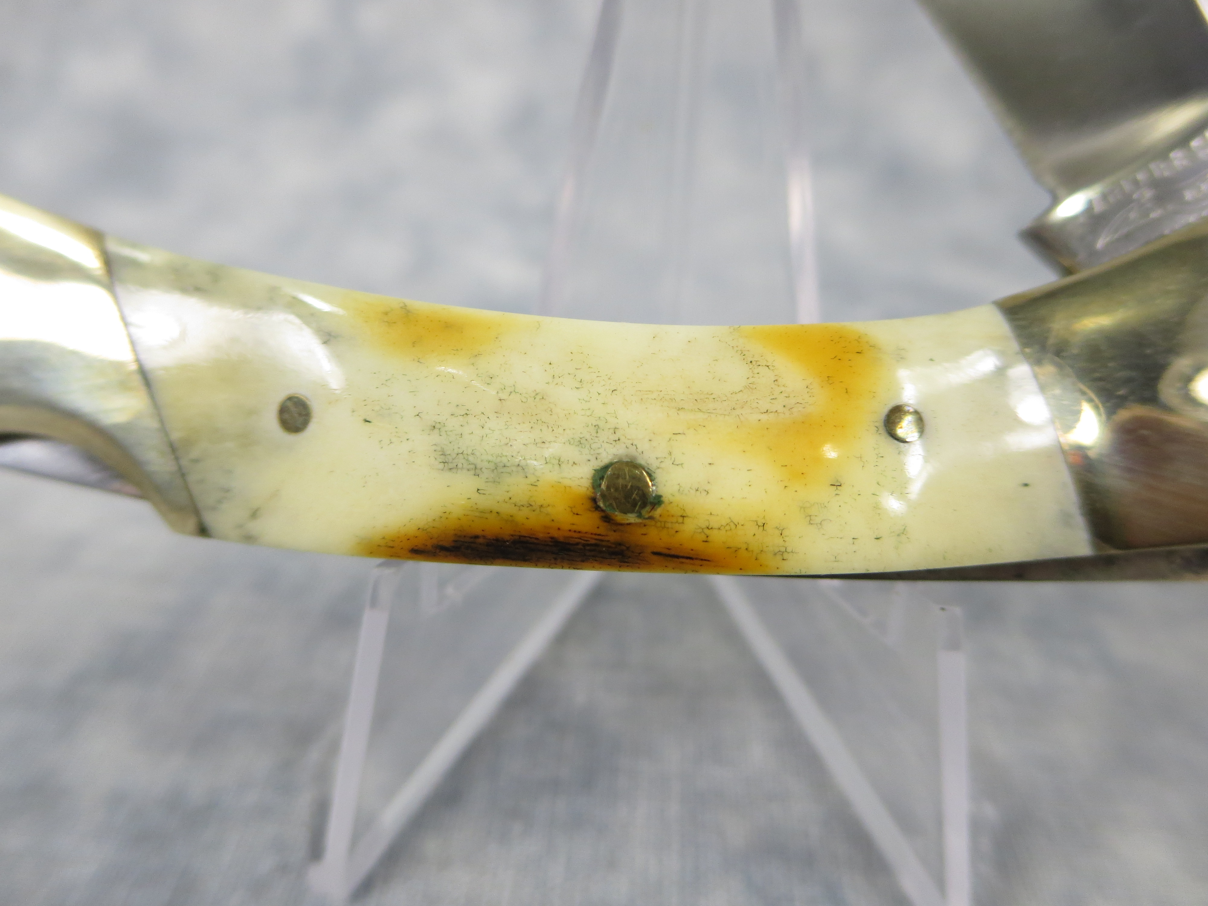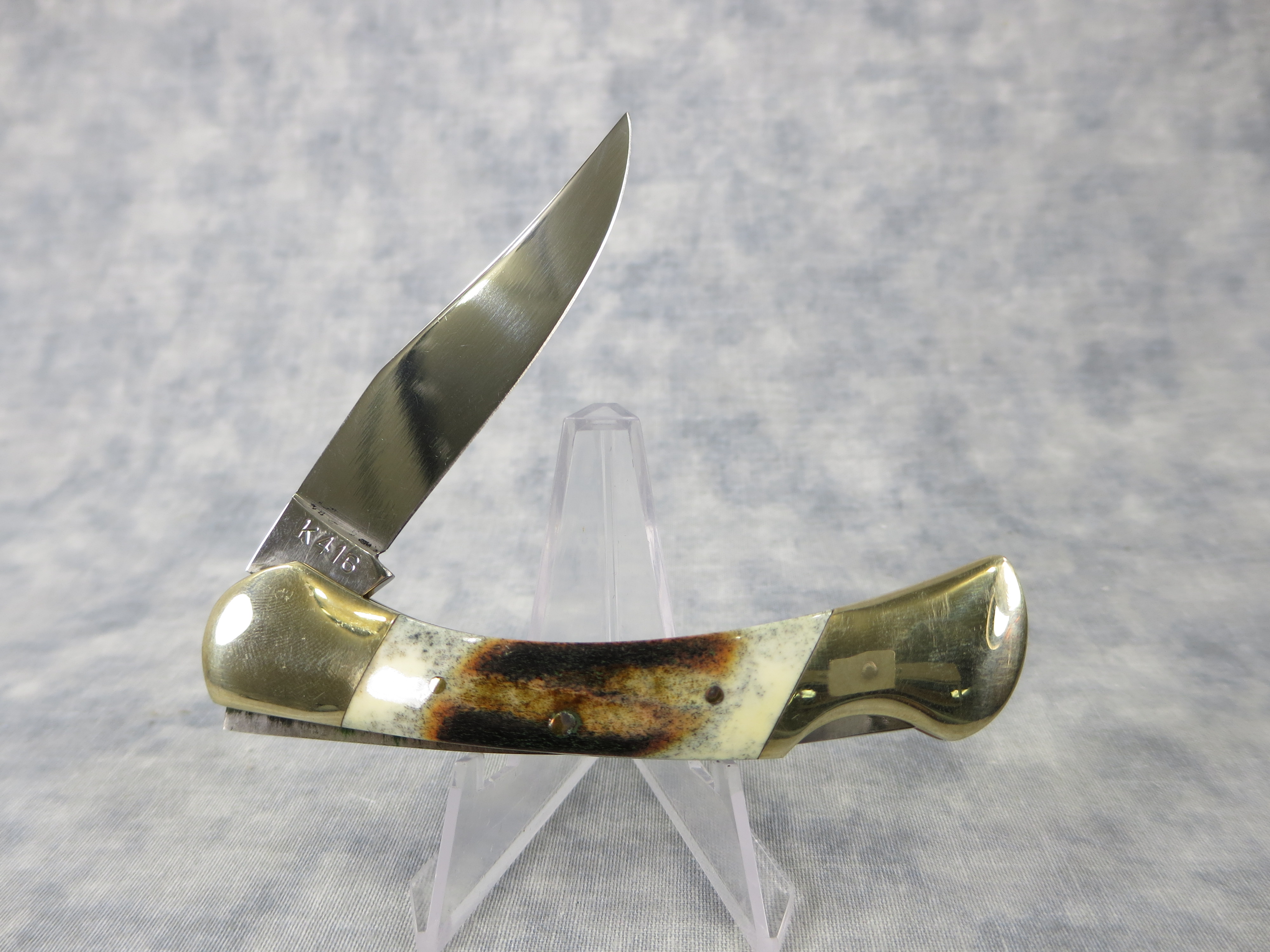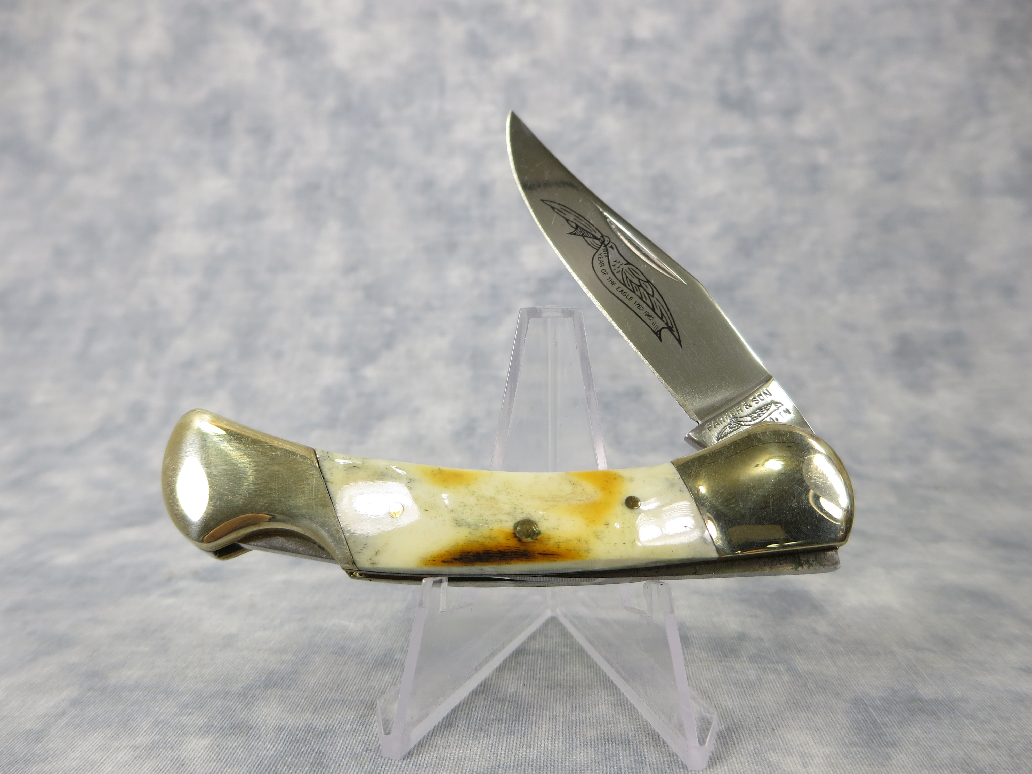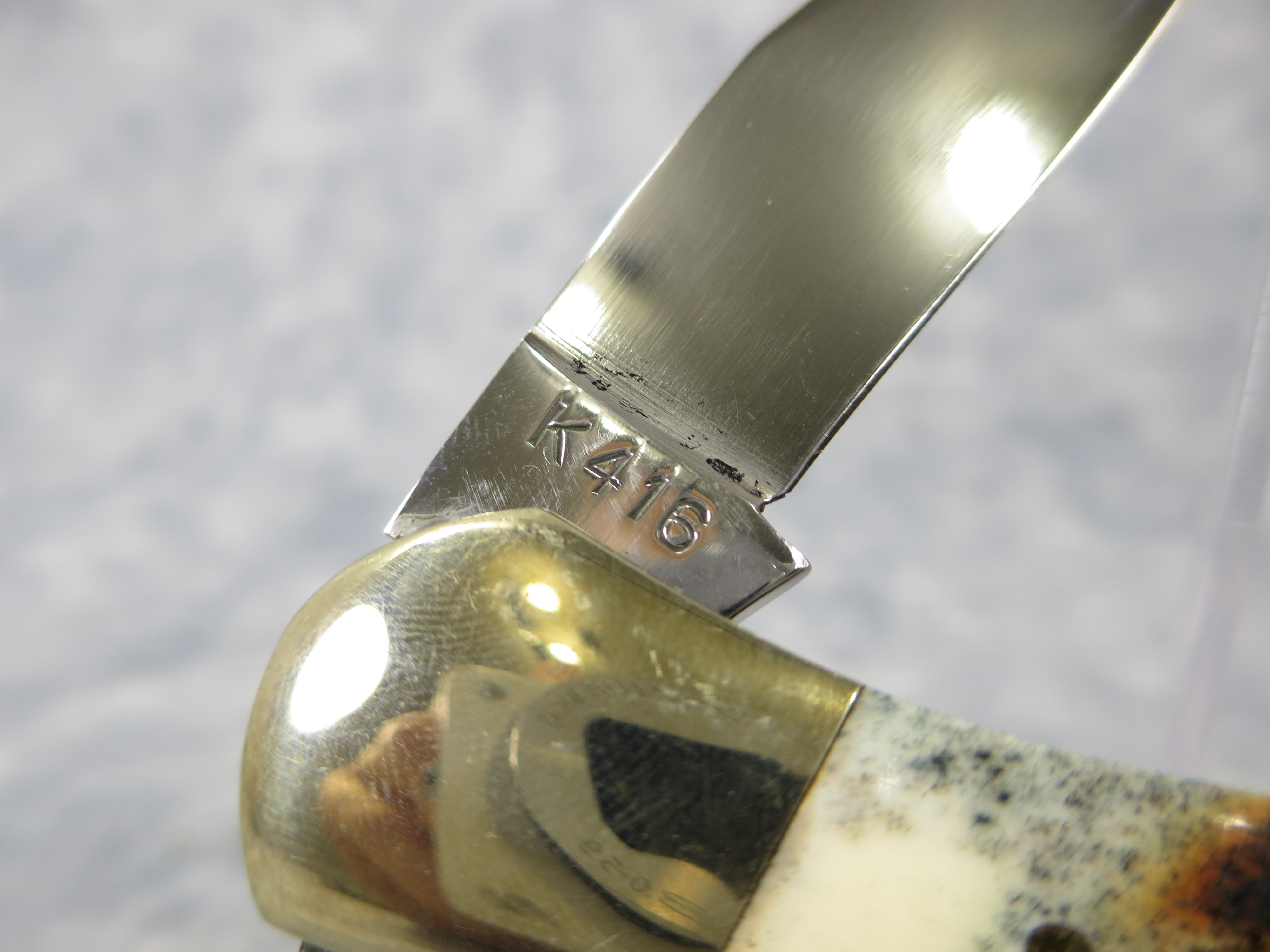 December 04, 2025 - 3-1/2 inches closed. 6-1/4 inches open. Made in USA. 'Parker & Son / Chattanooga, TN / K416' tang stamp. Imprinted eagle logo on blade, with 'Year of the Eagle 1782-1962' inside ribbon in the eagle's mouth. Stag handle. Nickel Silver bolsters. Brass liner.