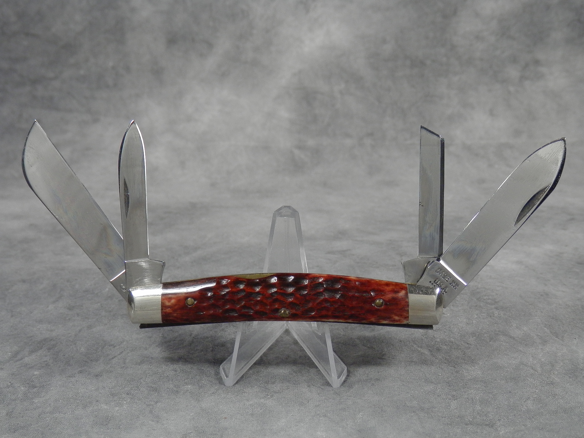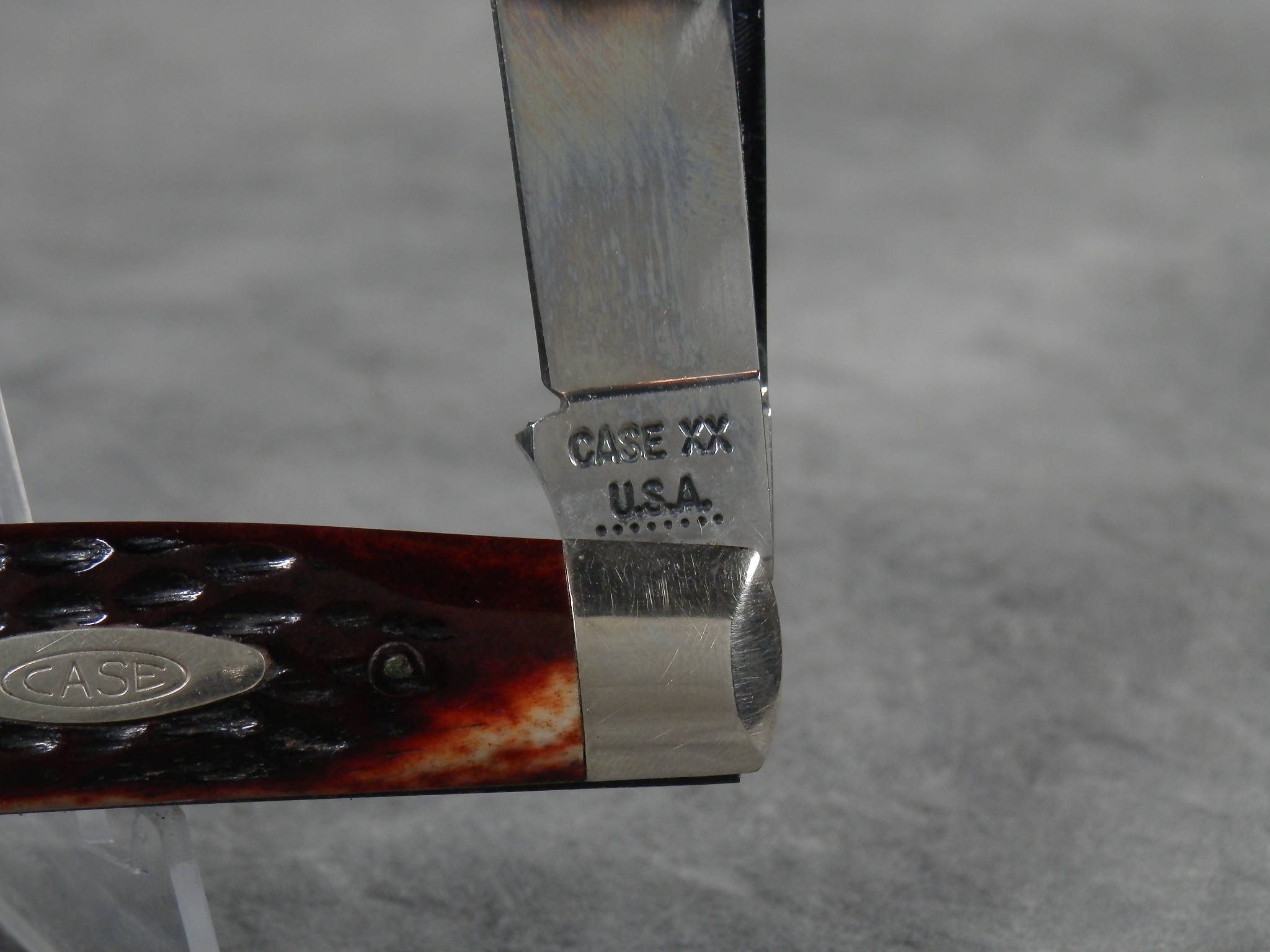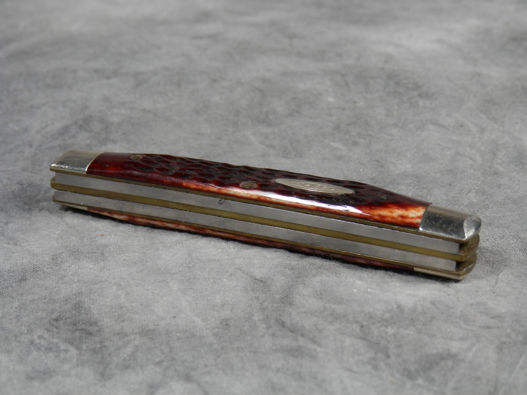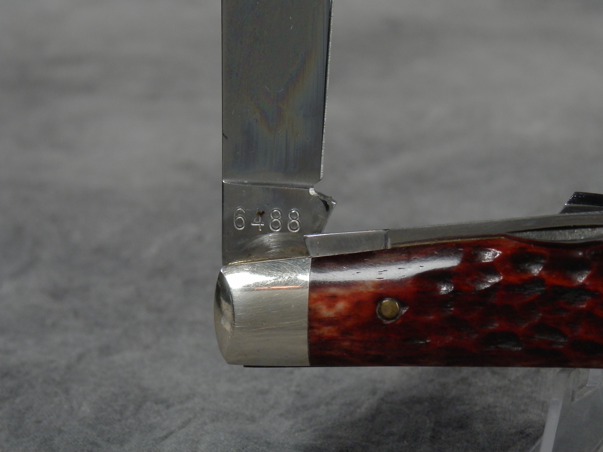 February 03, 2026 - 4-1/8 inches closed. 6-3/4 inches open. Made in USA. "CASE XX U.S.A. ******** " (8 dot), "CASE XX U.S.A. ******* " (7 dot) and "6488" tang stamps. This is a transition knife:  sheepfoot blade has an 8 dot tang stamp, while the spear blade has a 7 dot tang. Double Oval 'Open C' CASE shield. Chrome Vanadium blades. Red/Brown Jigged Bone handle. Nickel Silver bolsters. Brass liner. Center liner is double thickness.