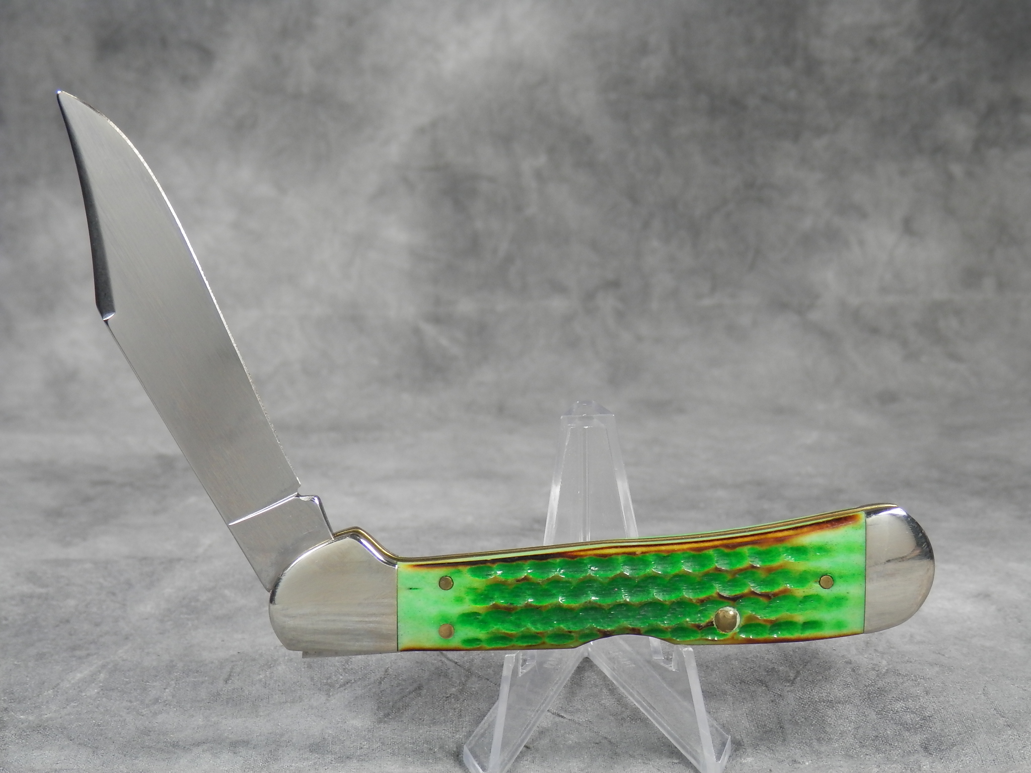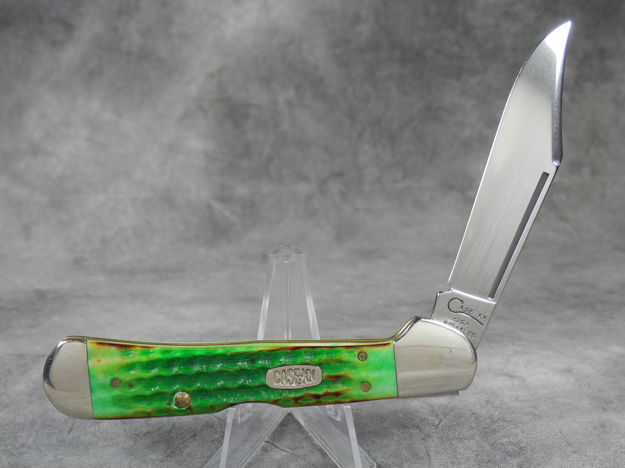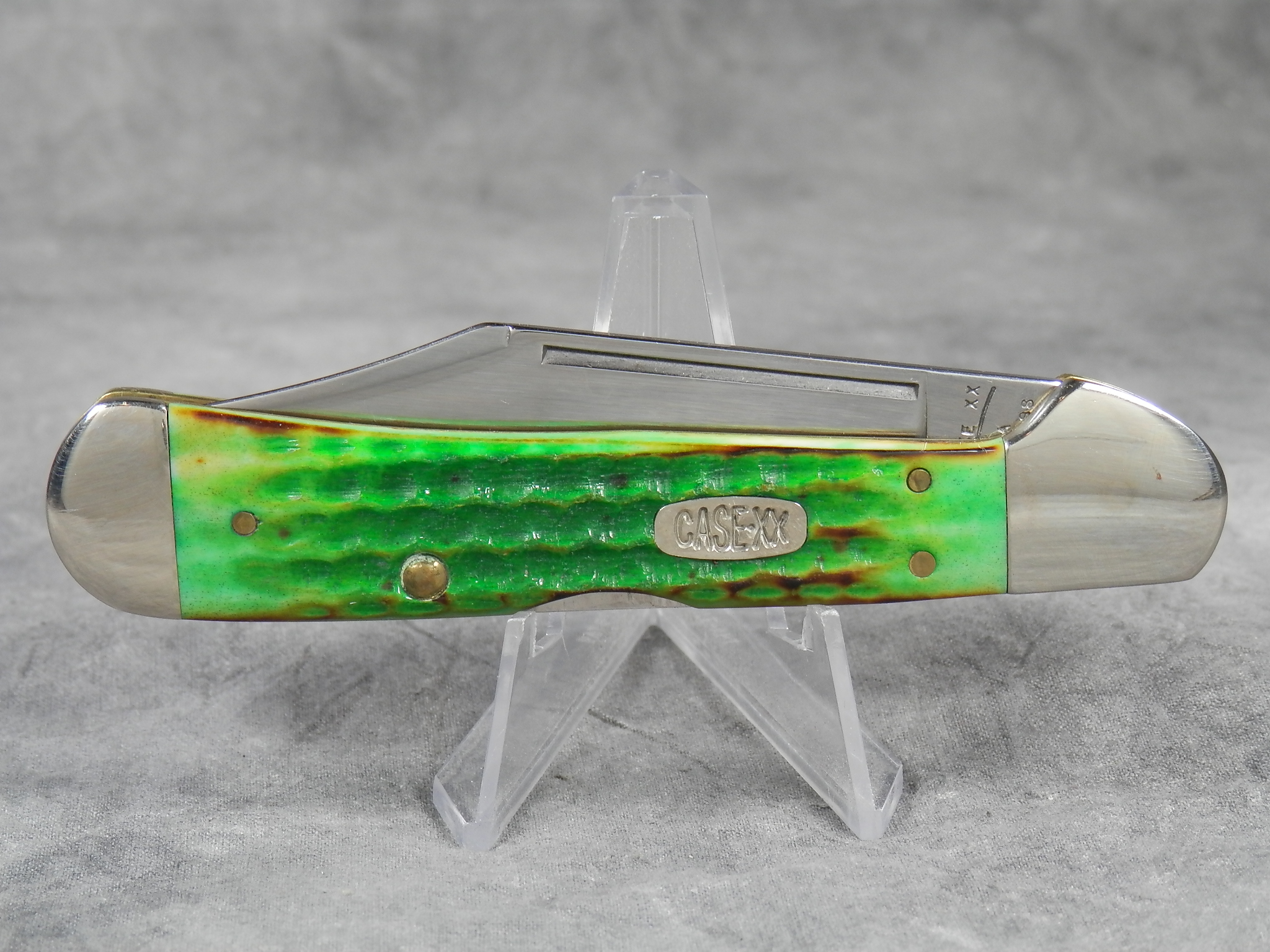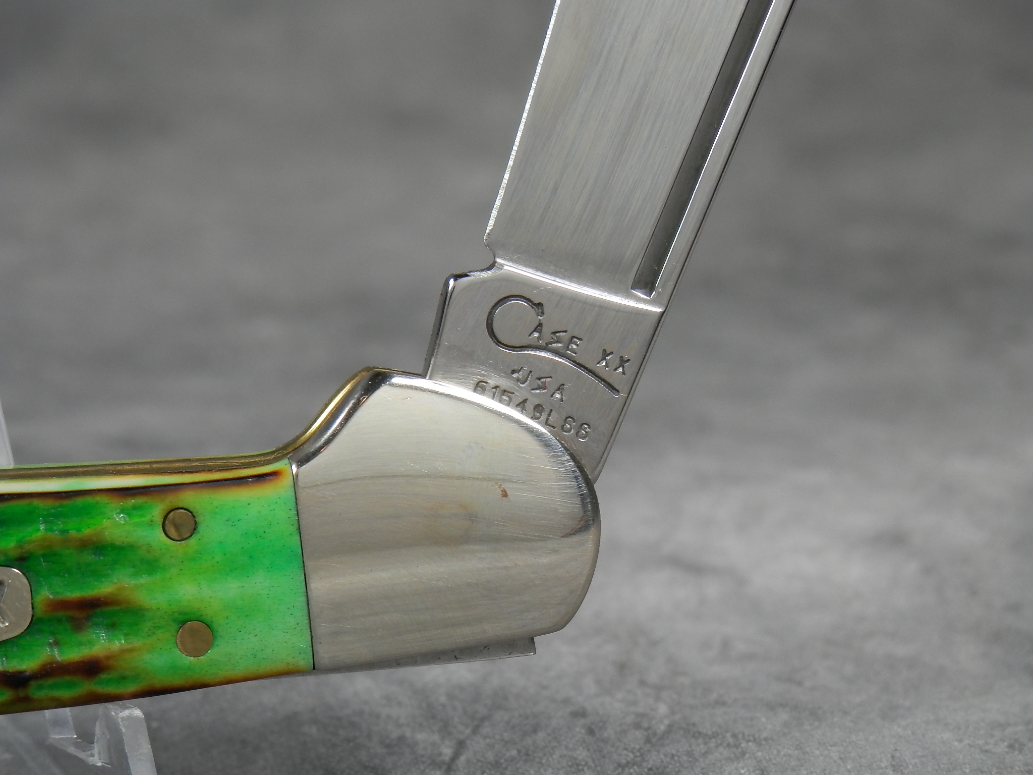 February 23, 2026 - 4-1/4 inches closed. 7-1/4 inches open. Made in USA. "Case XX *USA 61549 L SS" tang stamp. Oval 'Closed C' CASE-XX shield. Stainless steel blade. Burnt Green jigged bone handle. Nickel Silver bolsters. Brass liner.