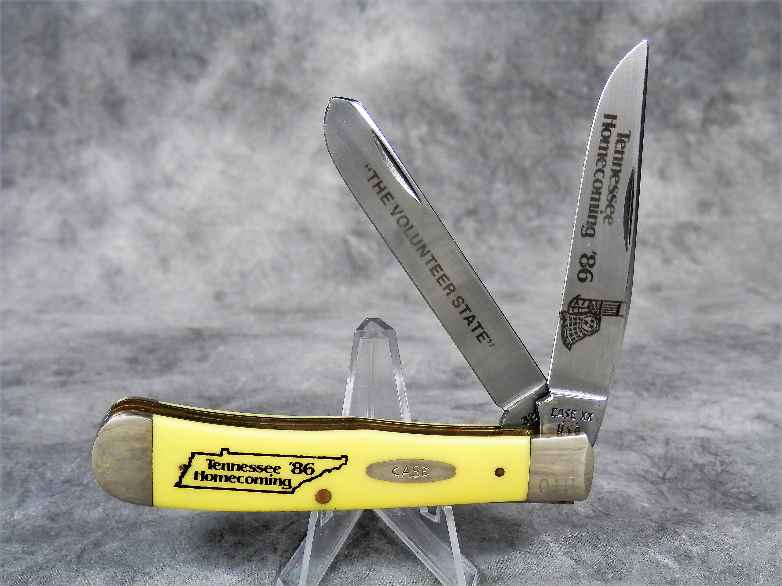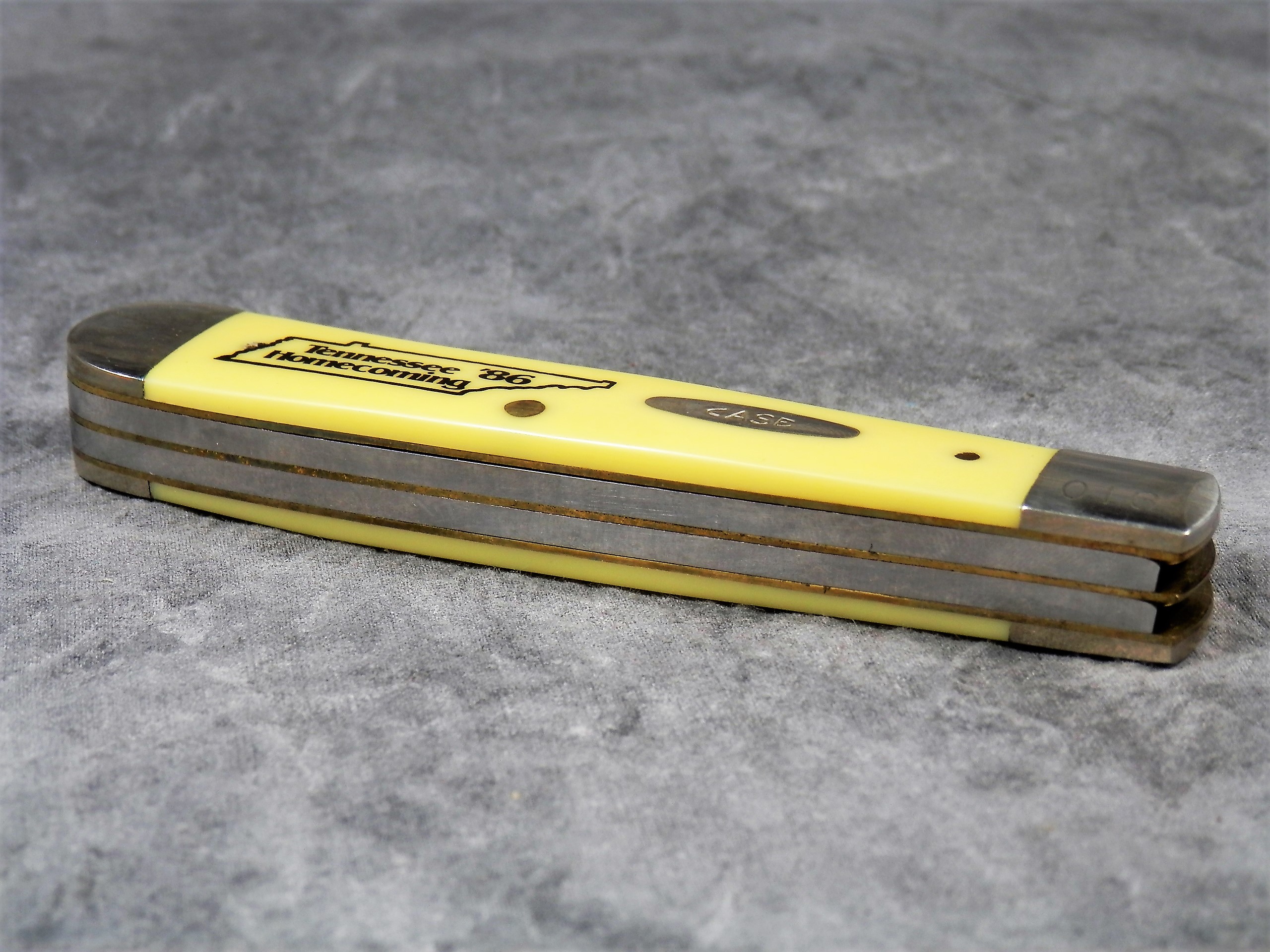February 03, 2026 - 4-1/8 inches closed. 7-3/8 inches open. Made in USA. "CASE XX **** USA" (4 dot with lightning bolt S) and "3254" tang stamps. Single oval 'Open C' CASE  shield. Chrome vanadium blades etched "Tennessee Homecoming '86" and "THE VOLUNTEER STATE". Nickel silver bolsters. . Brass liner.