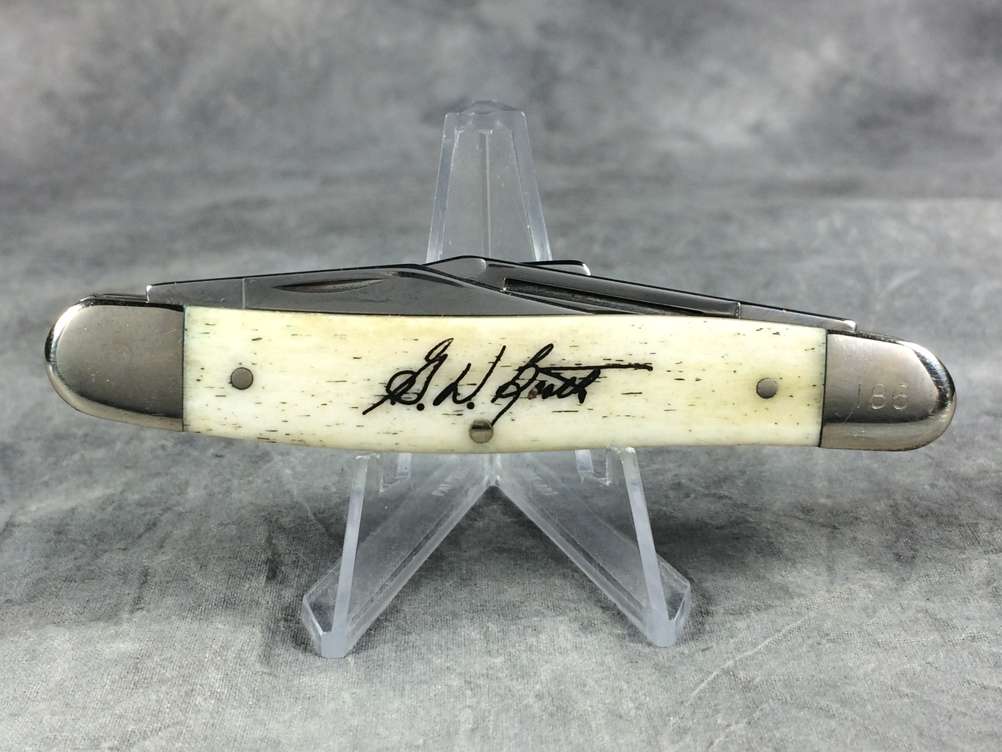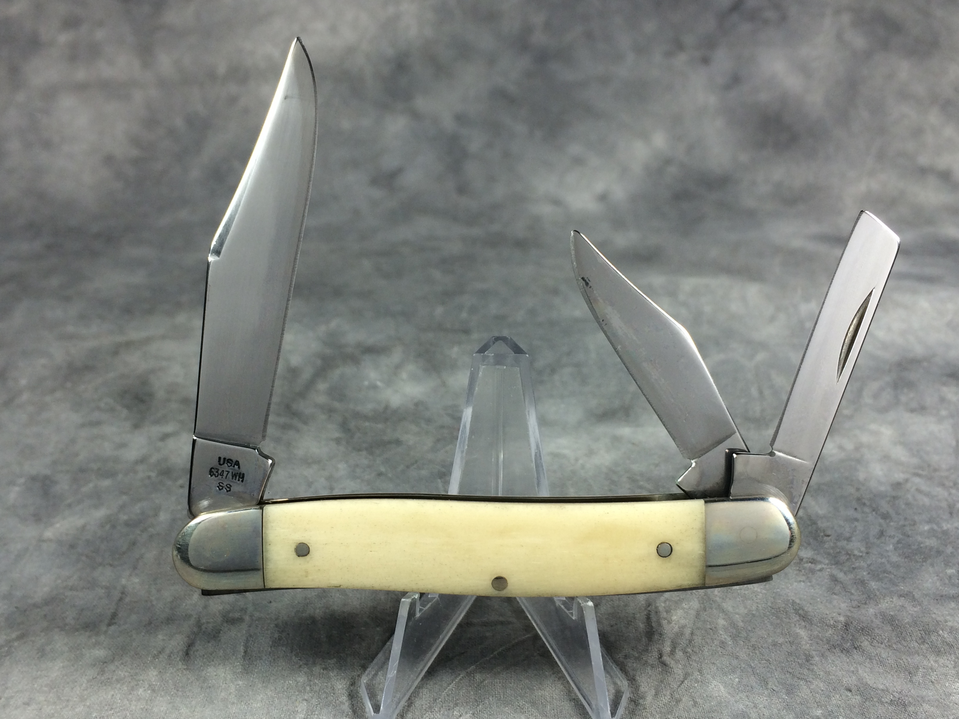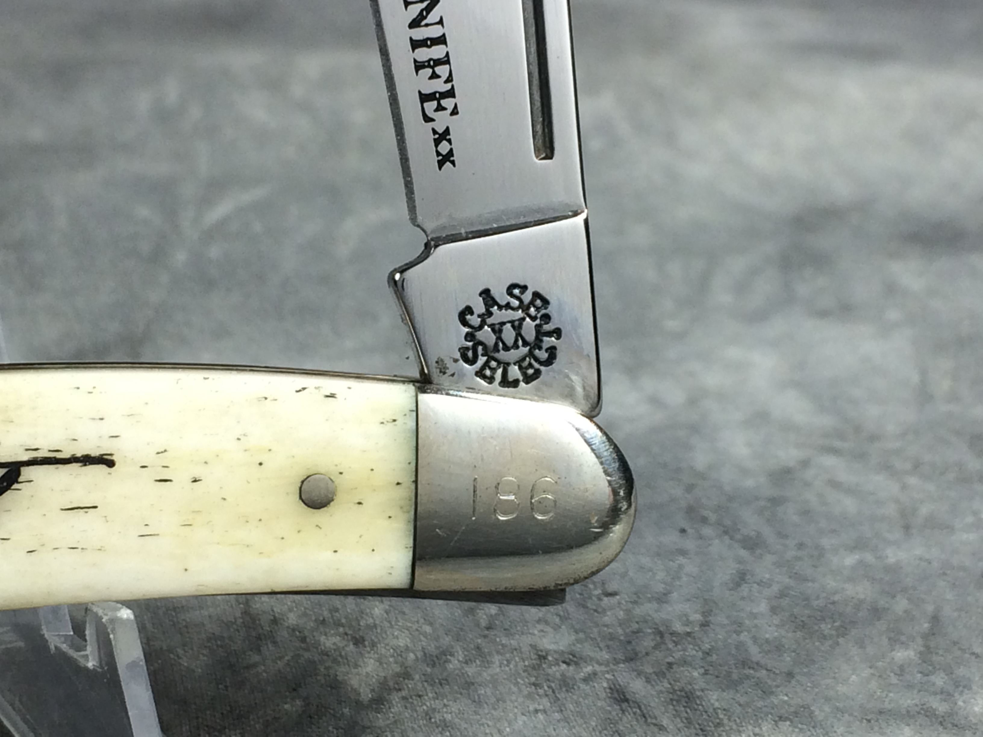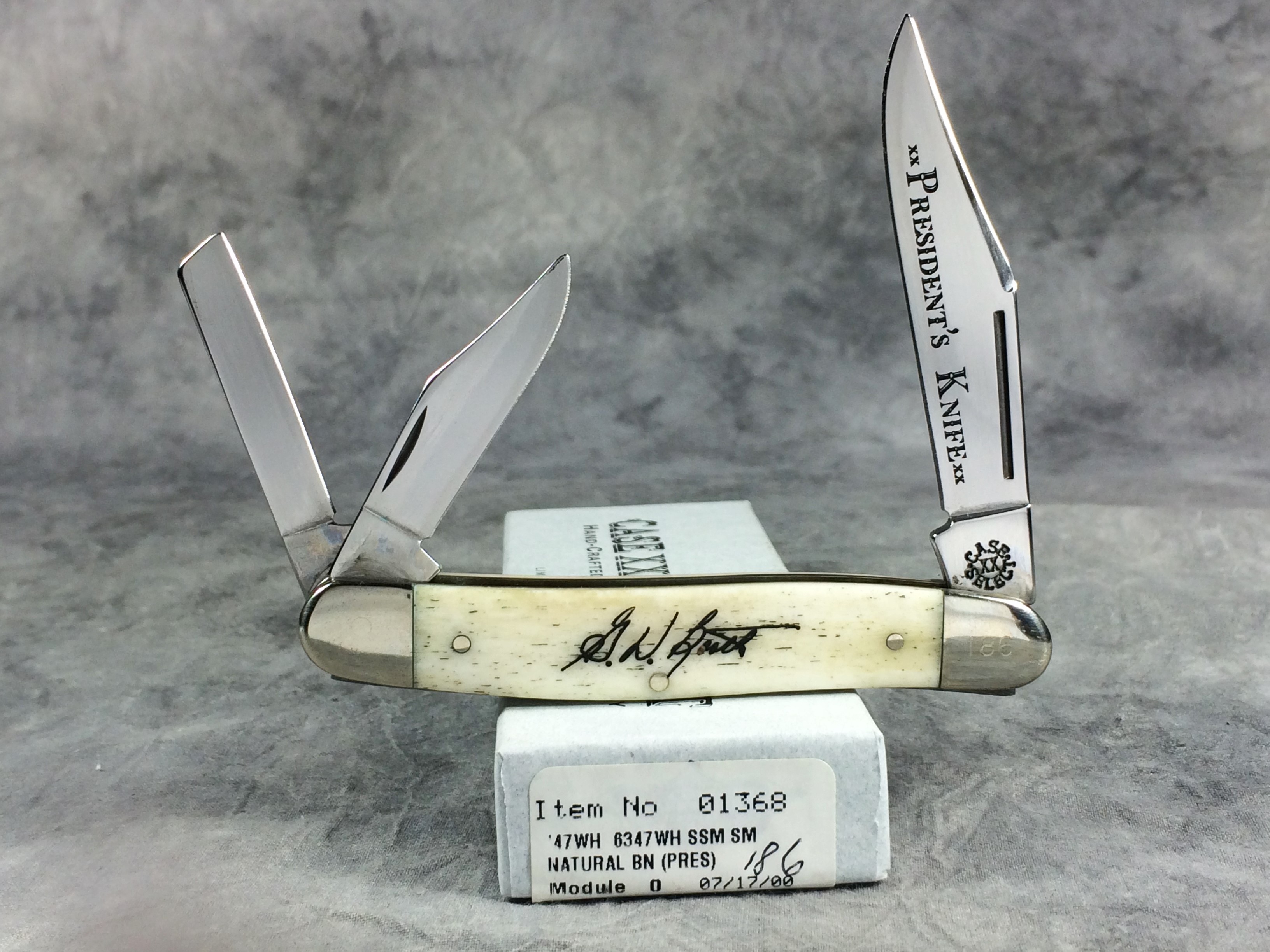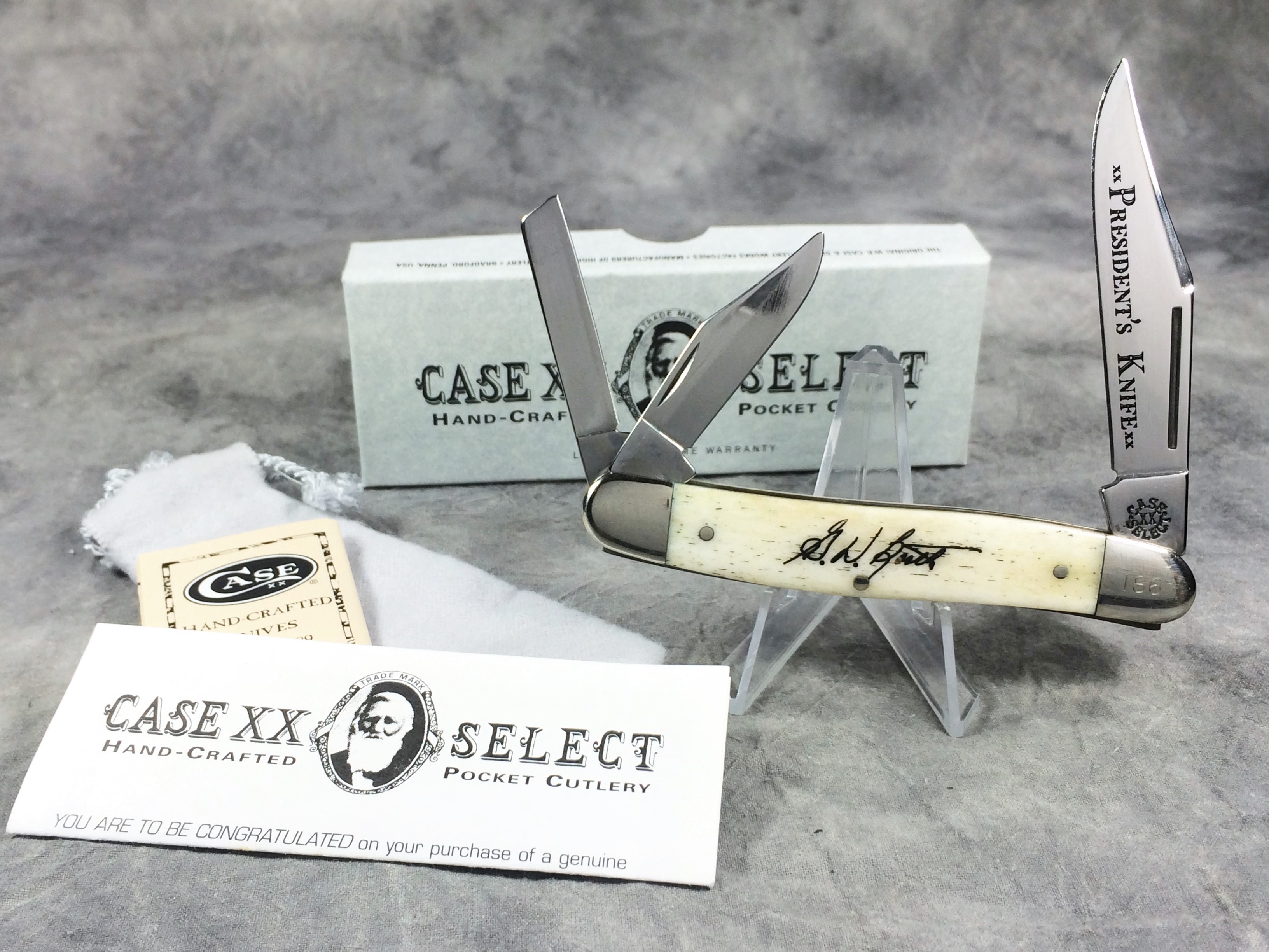 December 04, 2025 - Limited Edition. 3-7/8 inches closed. 6-3/4 inches open. Made in USA. "CASE XX SELECT" in a circle pattern and "USA 6347WH SS" tang stamps. TruSharp Steel blades. Master blade etched "xx President's Knife xx". Smooth Natural Bone handle etched with the signature of Greg Booth (President of Case) handle. Nickel Silver bolsters. Front right bolster etched with serial. Nickel Silver liner.