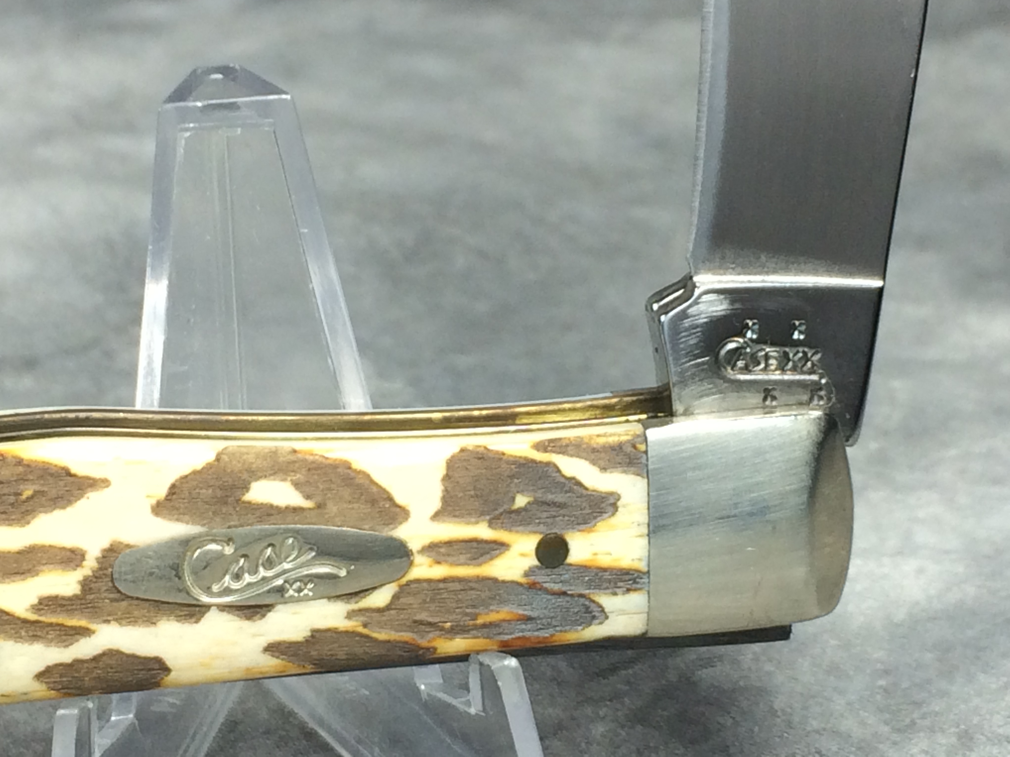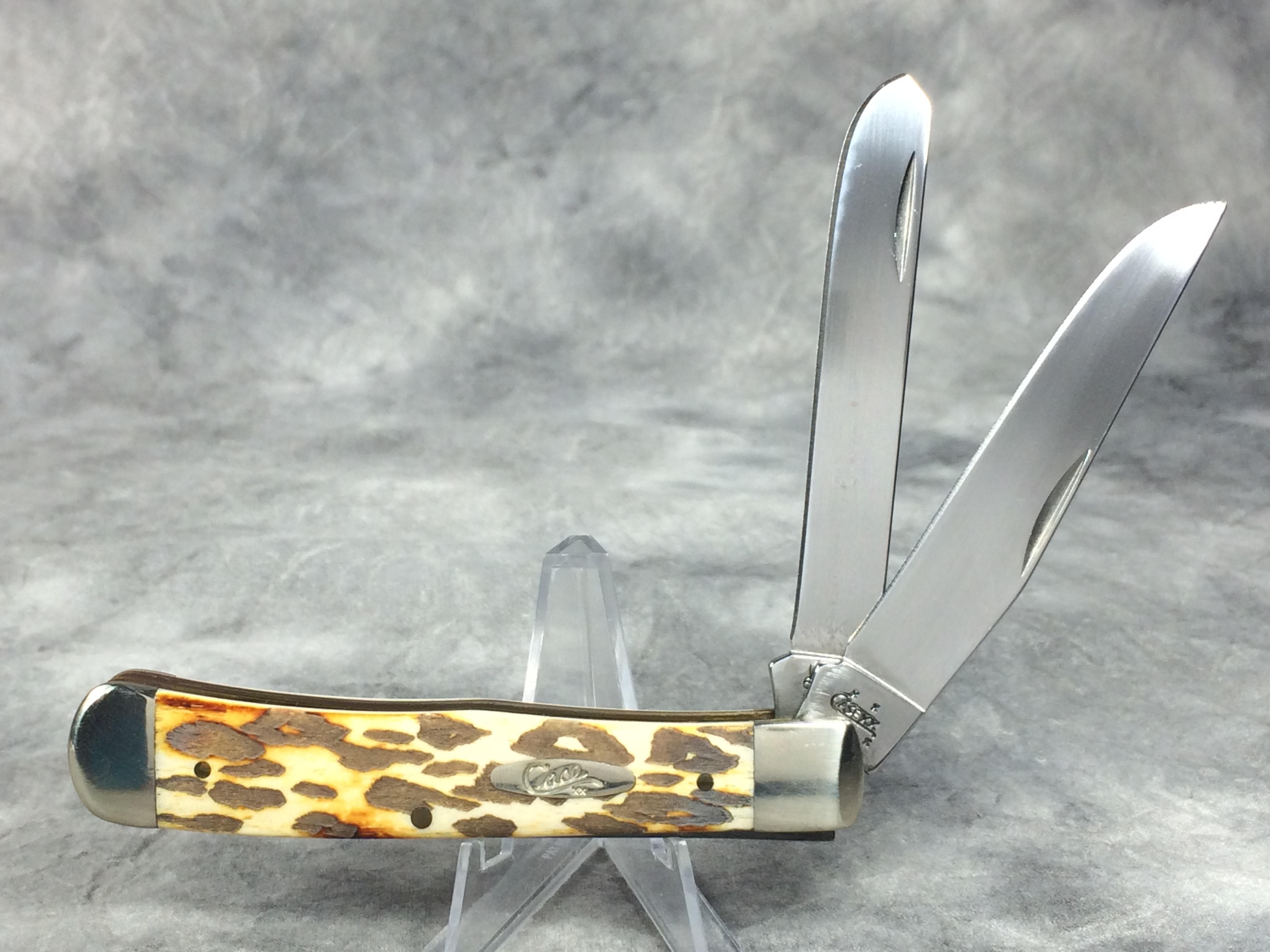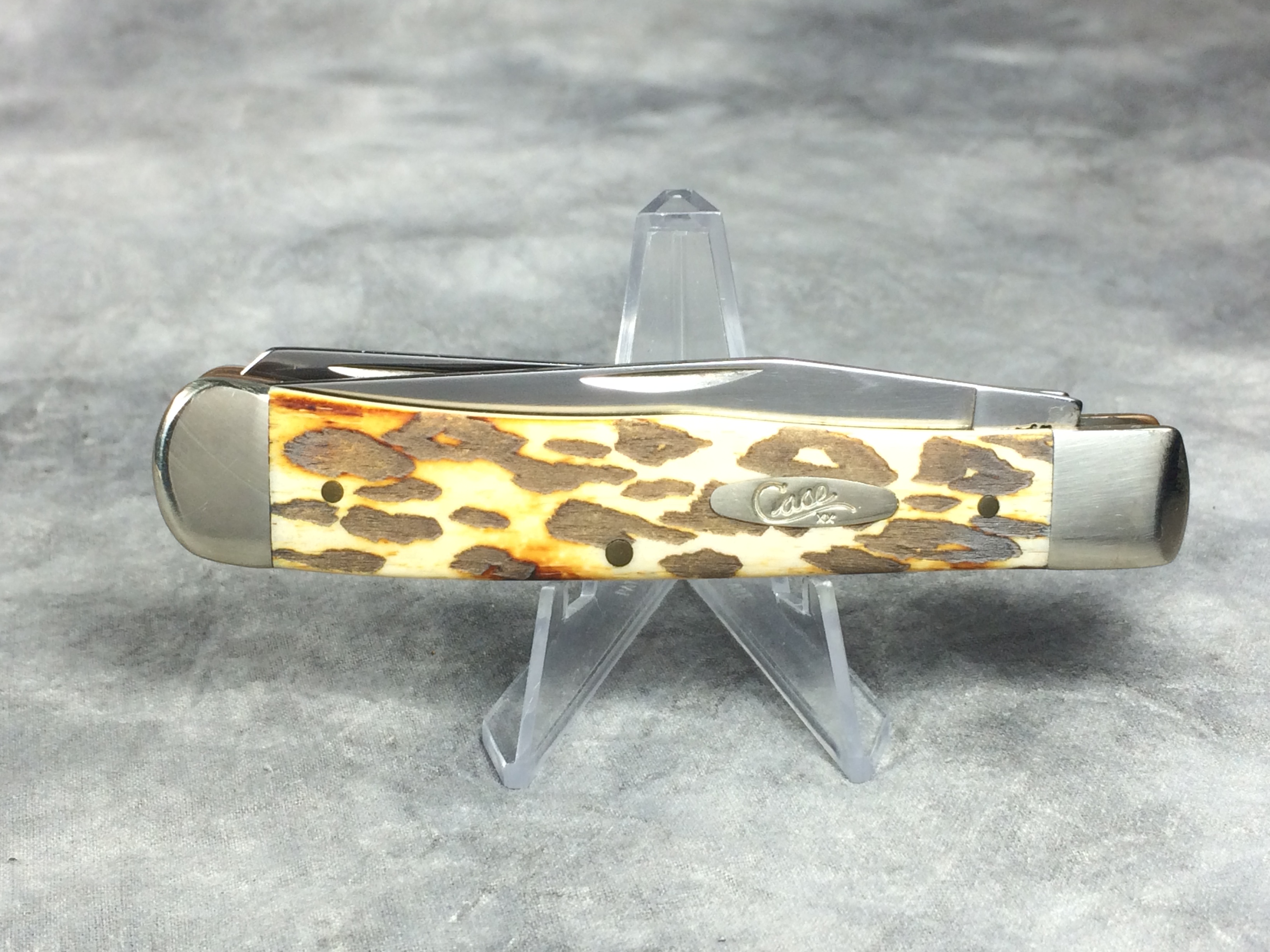 October 26, 2025 - 4-1/8 inches closed. 7-3/8 inches open. Made in USA. "  x x  Case XX    x x  " (with lightning bolt S) and "USA 6254 SS" tang stamps. Oval 'Long C' Script Case XX shield. Stainless Steel blades. Burnt White Smooth Bone handle with laser leopard pattern. Nickel Silver bolsters. Brass liner.