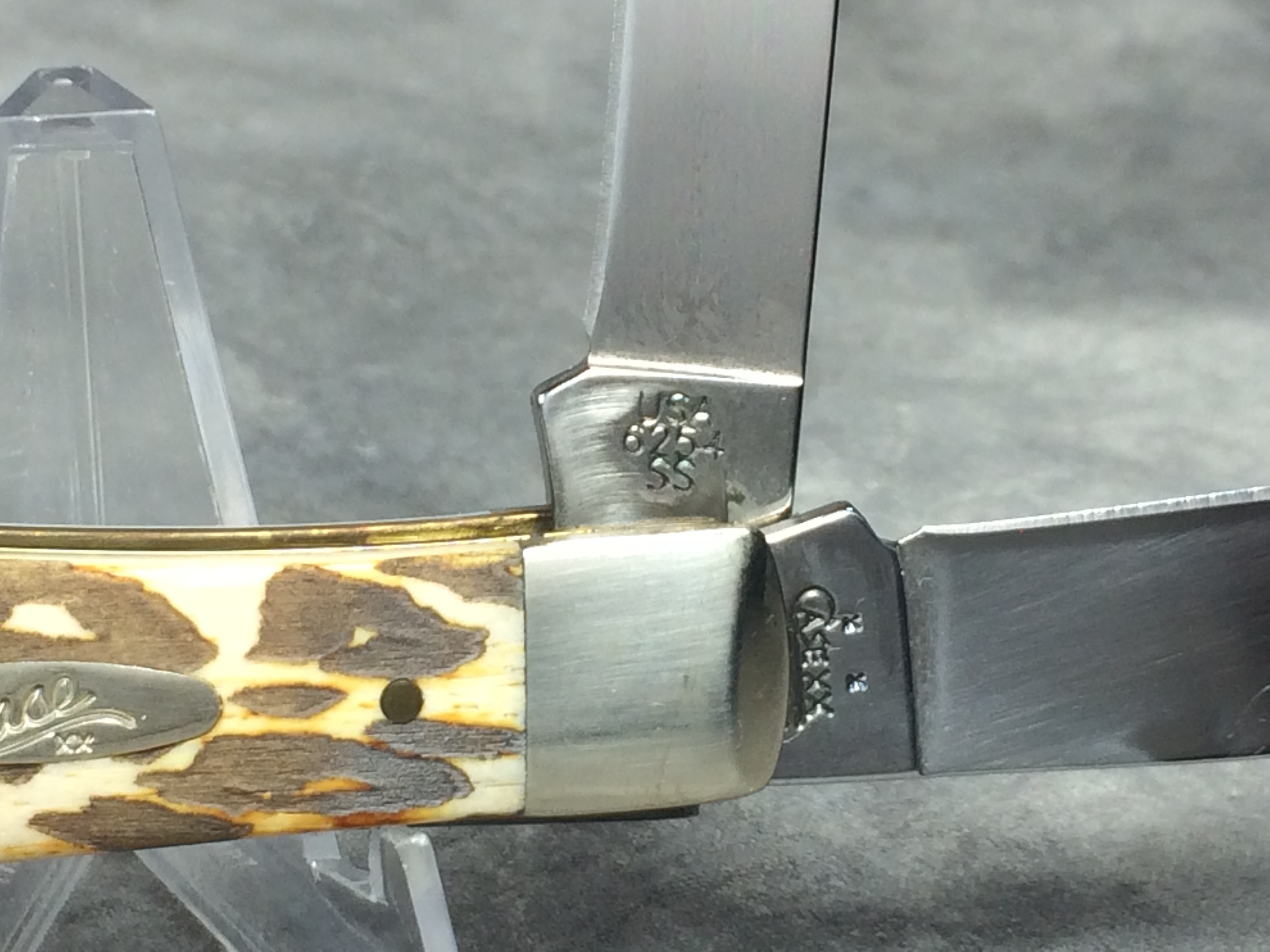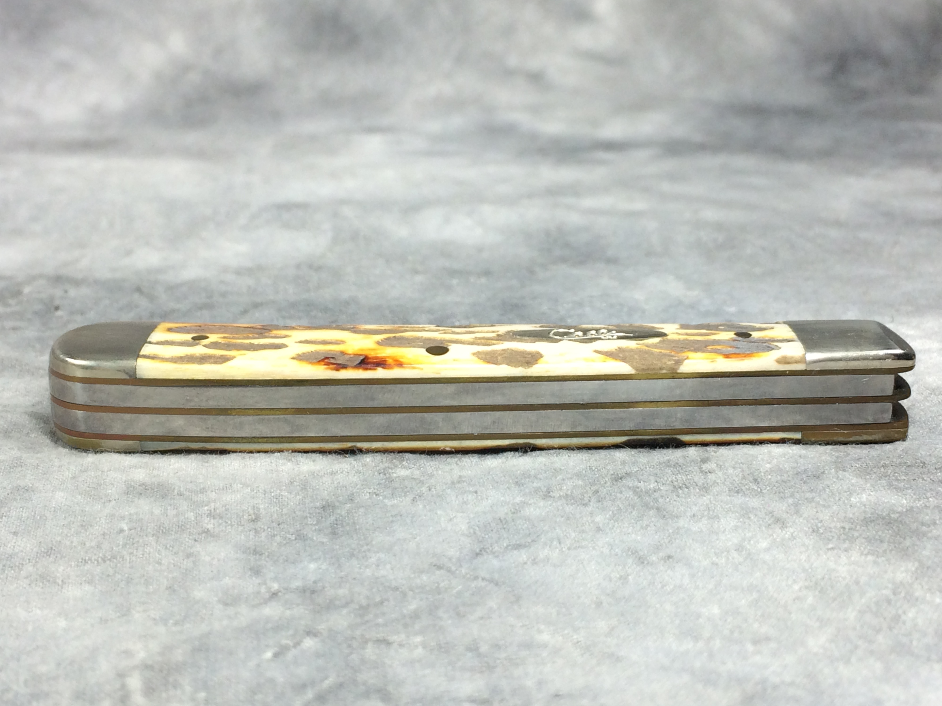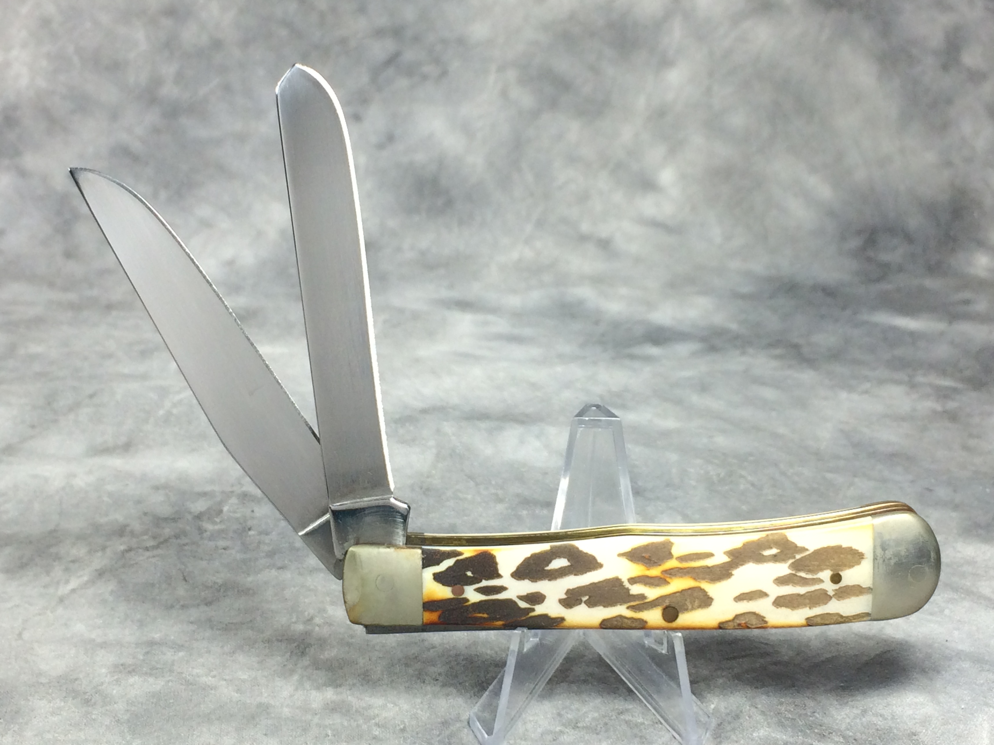 October 26, 2025 - 4-1/8 inches closed. 7-3/8 inches open. Made in USA. "  x x  Case XX    x x  " (with lightning bolt S) and "USA 6254 SS" tang stamps. Oval 'Long C' Script Case XX shield. Stainless Steel blades. Burnt White Smooth Bone handle with laser leopard pattern. Nickel Silver bolsters. Brass liner.