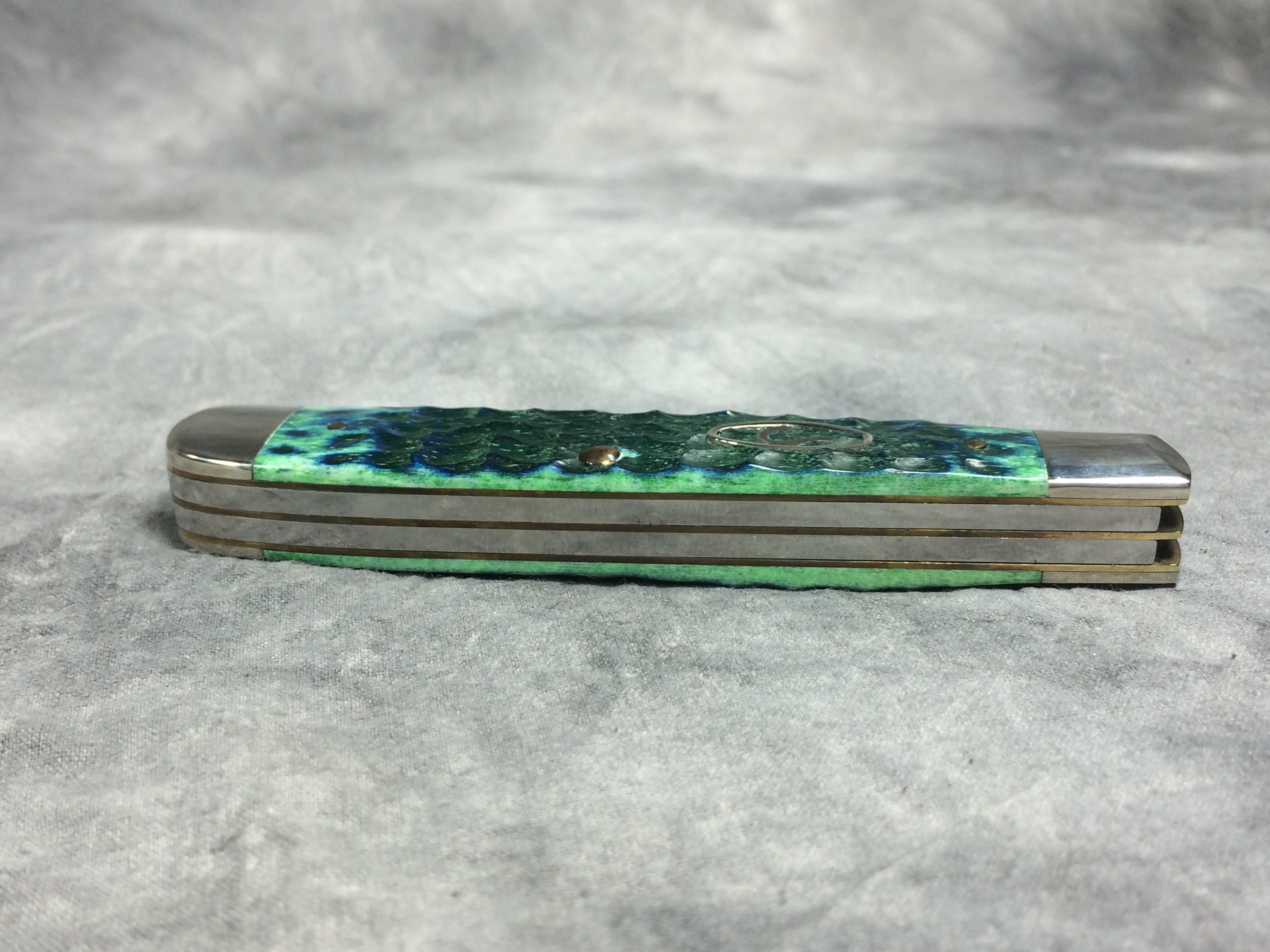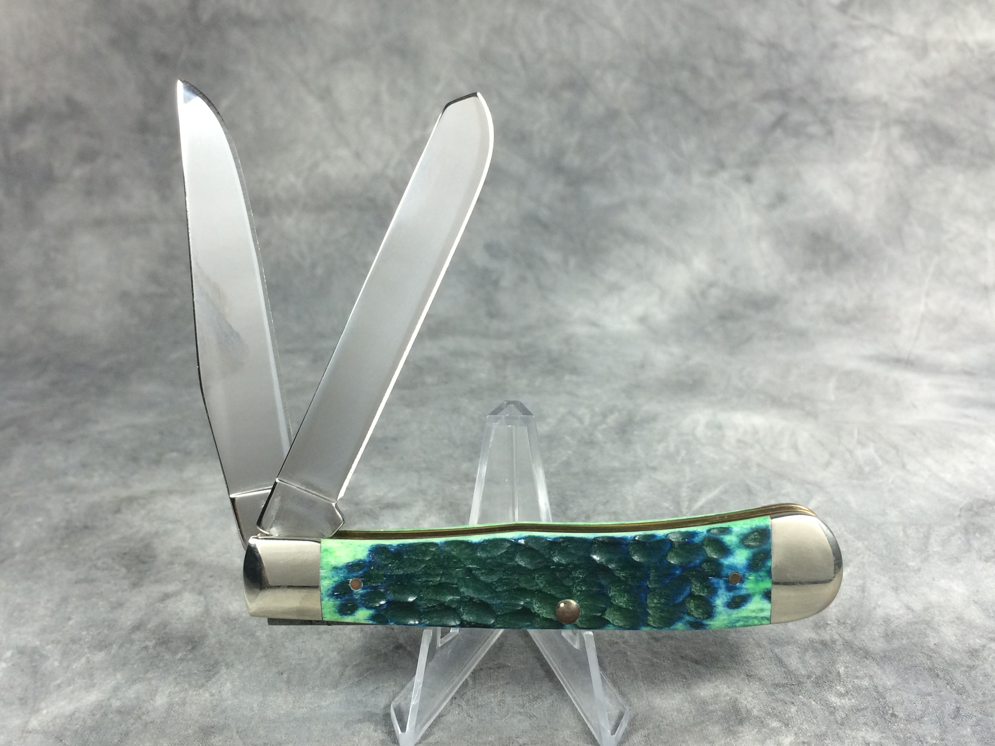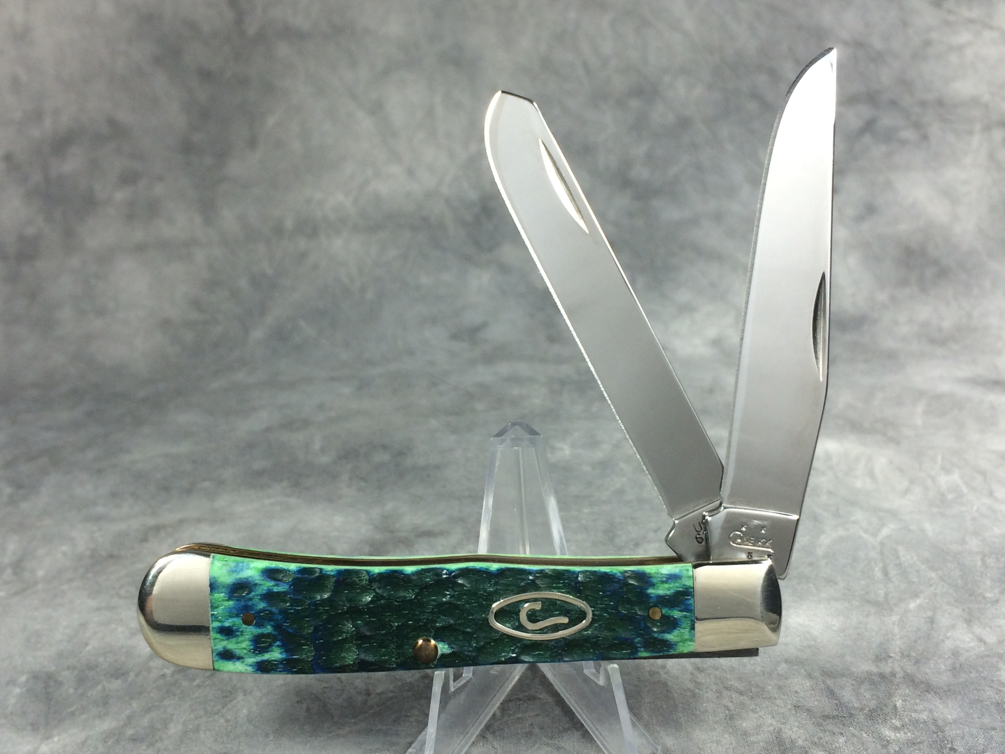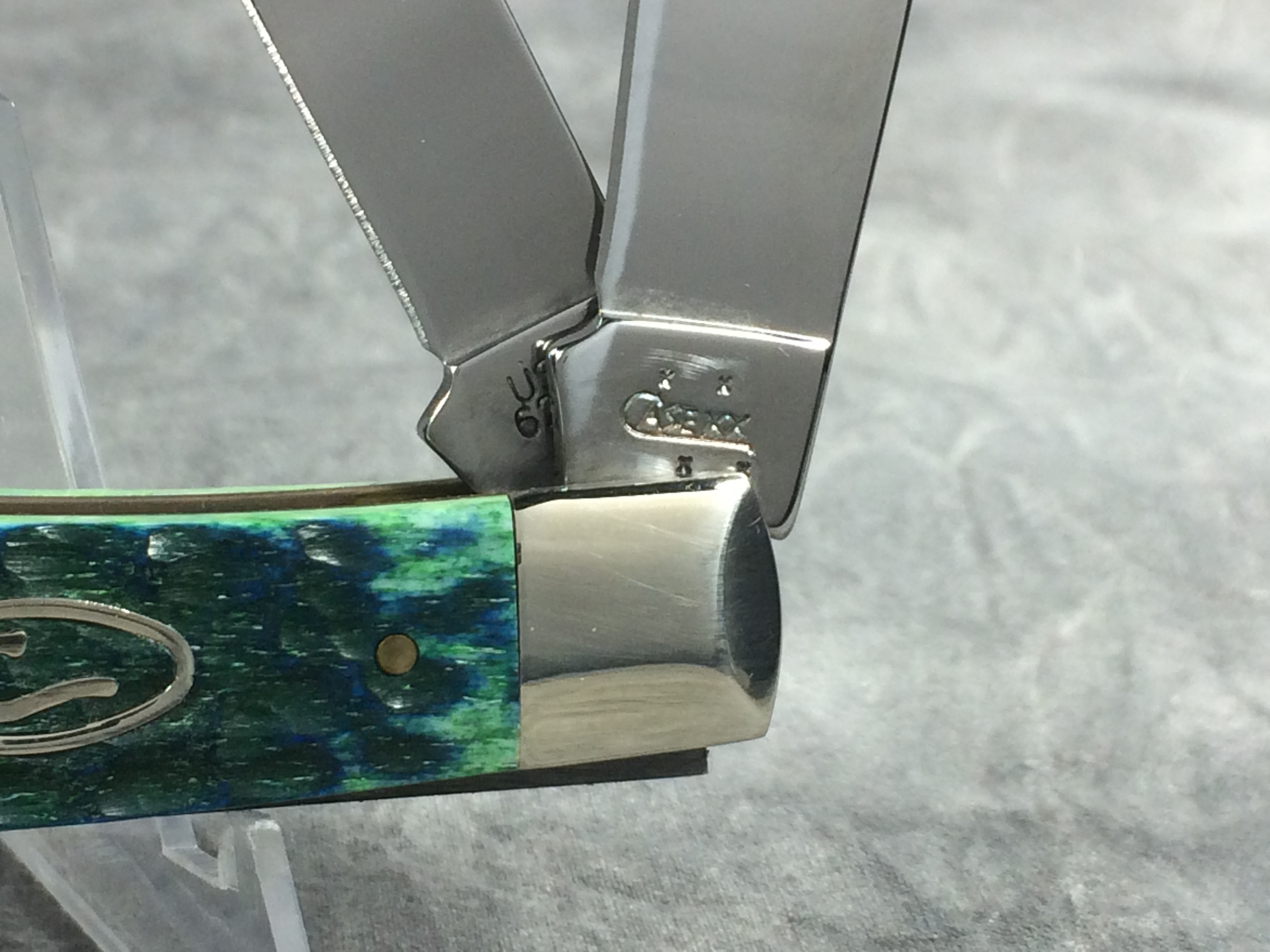 February 03, 2026 - 4-1/8 inches closed. 7-3/8 inches open. Made in USA. "  x x  Case XX    x x  " (with lightning bolt S) and "USA 6254 SS" tang stamps. Oval long tail "C" shield. Stainless Steel blades. Kentucky Bluegrass standard jigged bone handle. Nickel Silver bolsters. Brass liner.